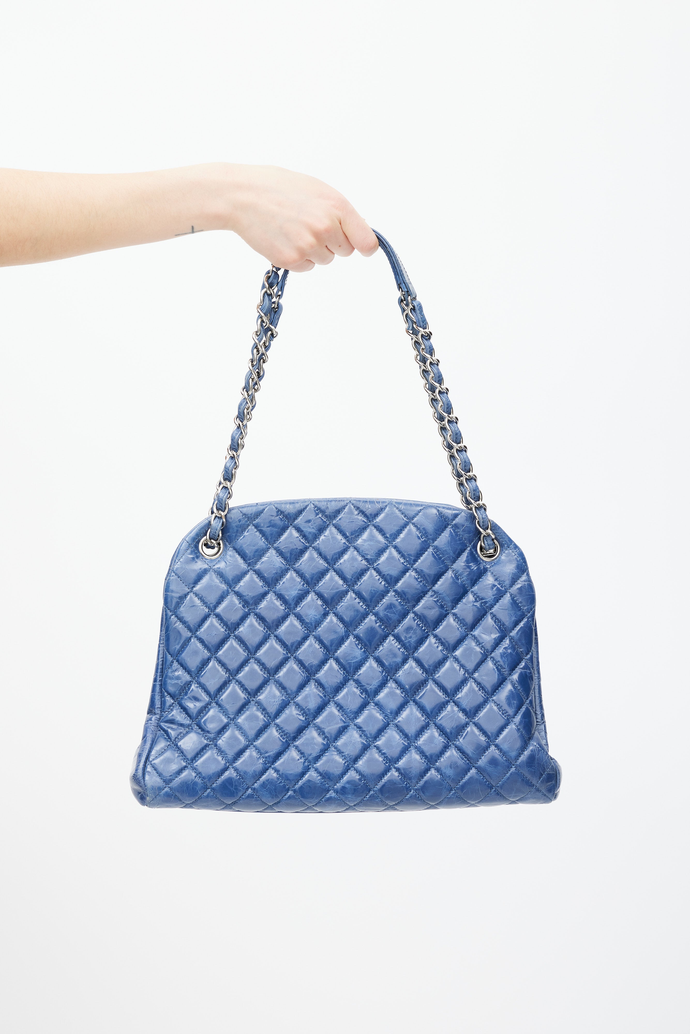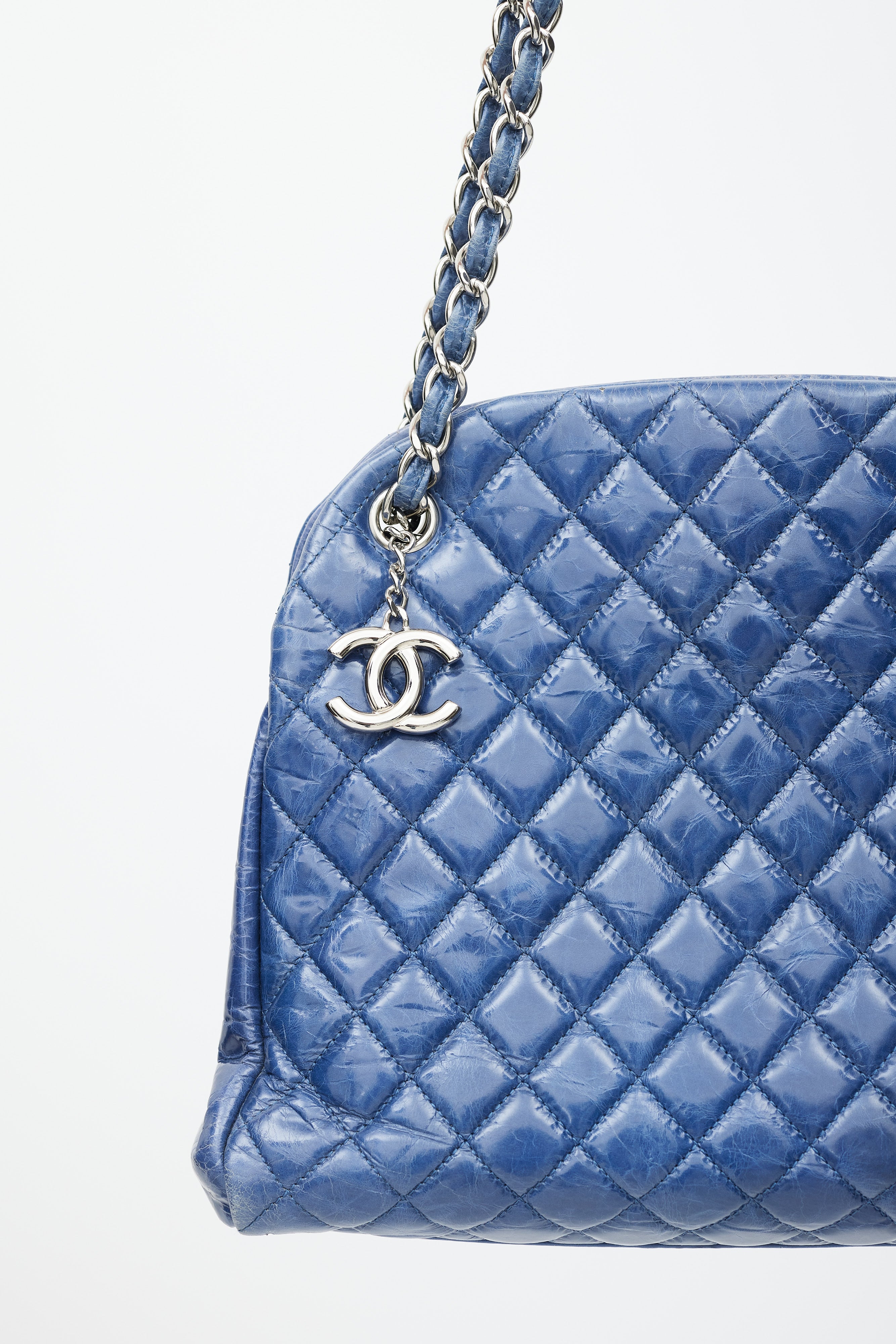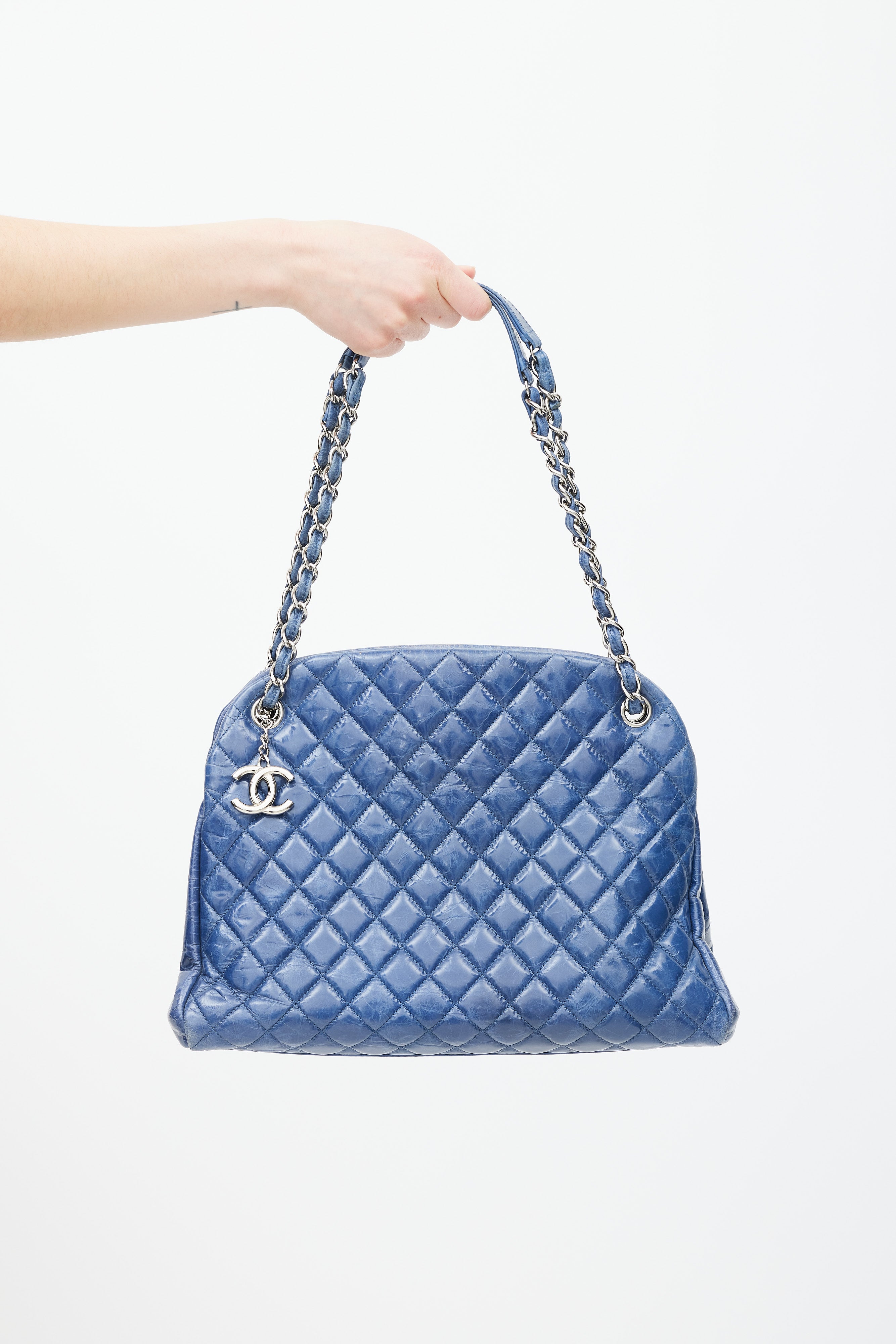 Pre-owned Chanel 2011 blue aged calfskin leather Mademoiselle Bowler bag featuring diamond quilt stitching throughout, silver tone hardware, woven leather chain strap with with a flat leather handles, silver tone CC logo charm, four protective feet at base, open top, divided main compartment with one zip pocket, two slip pockets, and silver tone logo printed on leather tab. The middle divider features a silver tone CC logo top clasp closure.