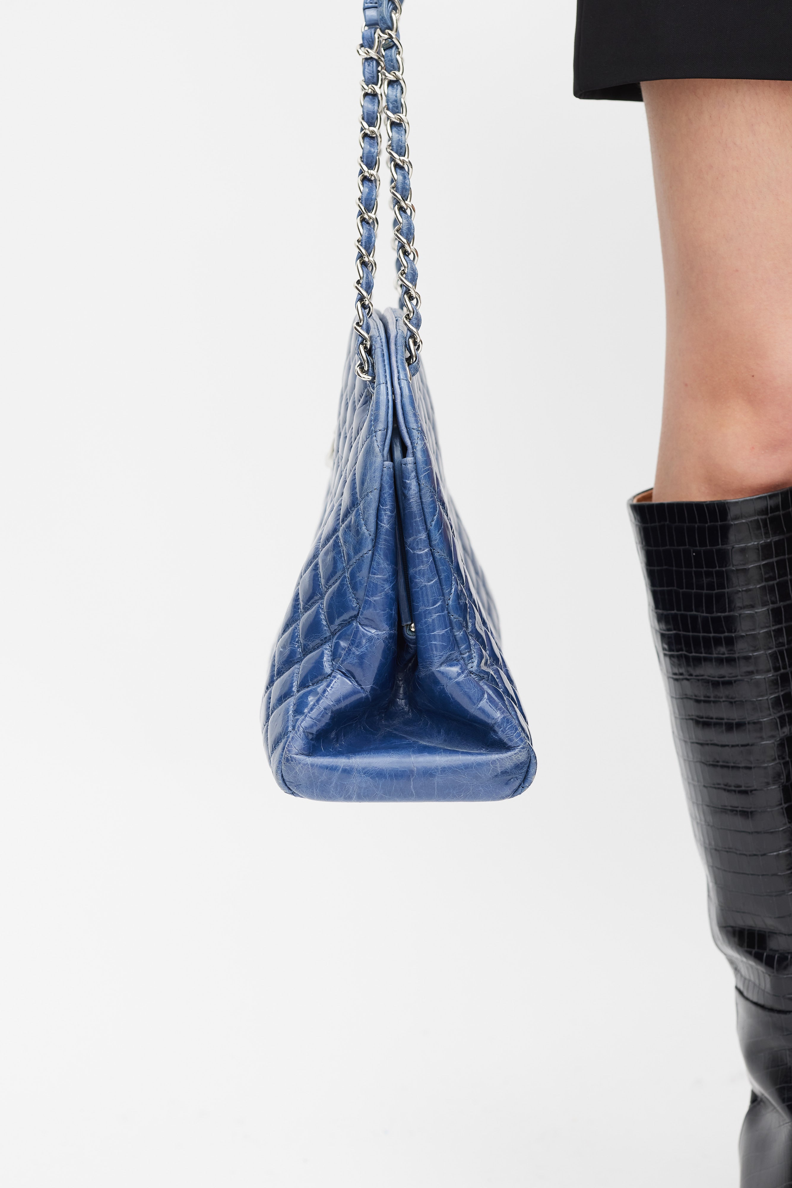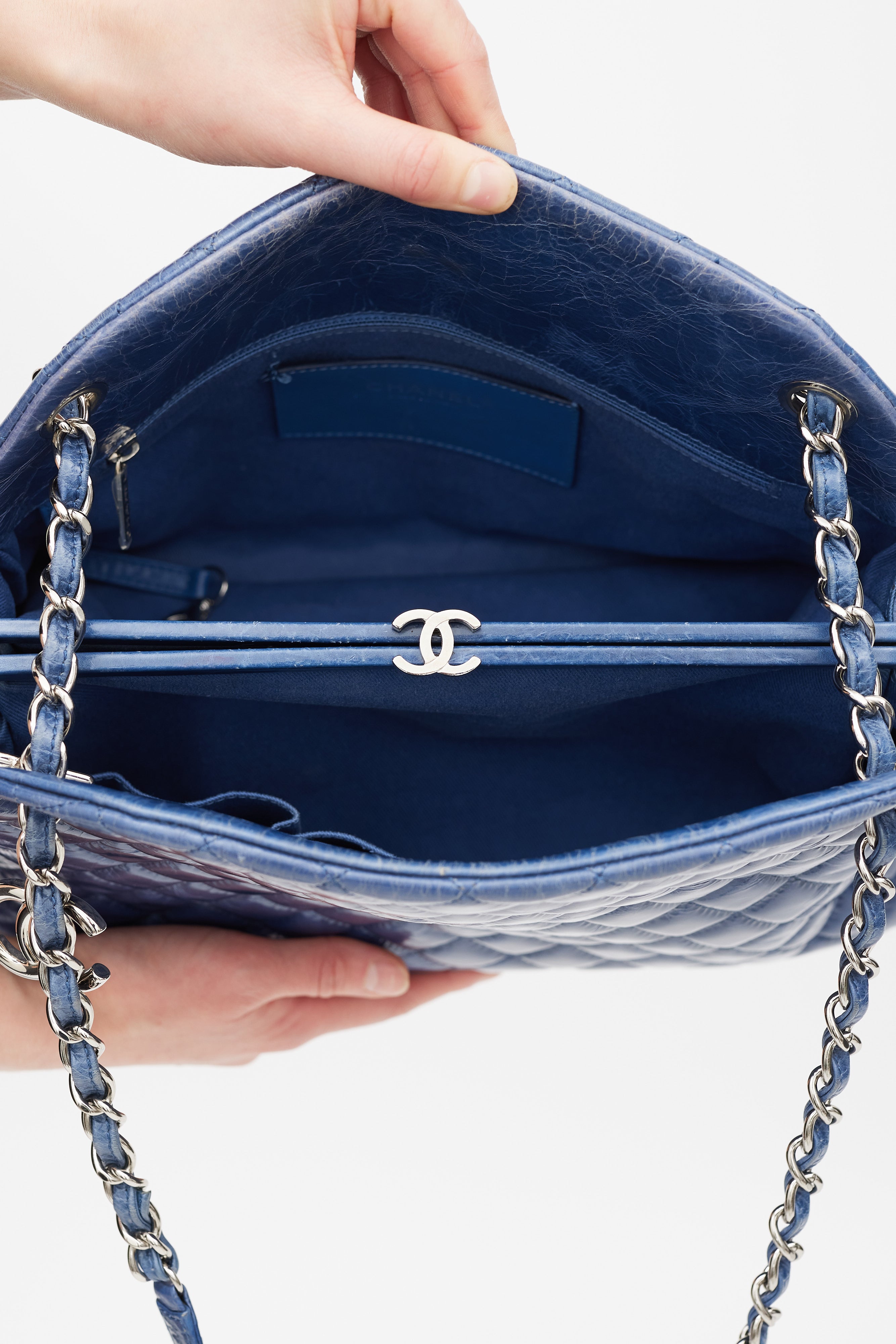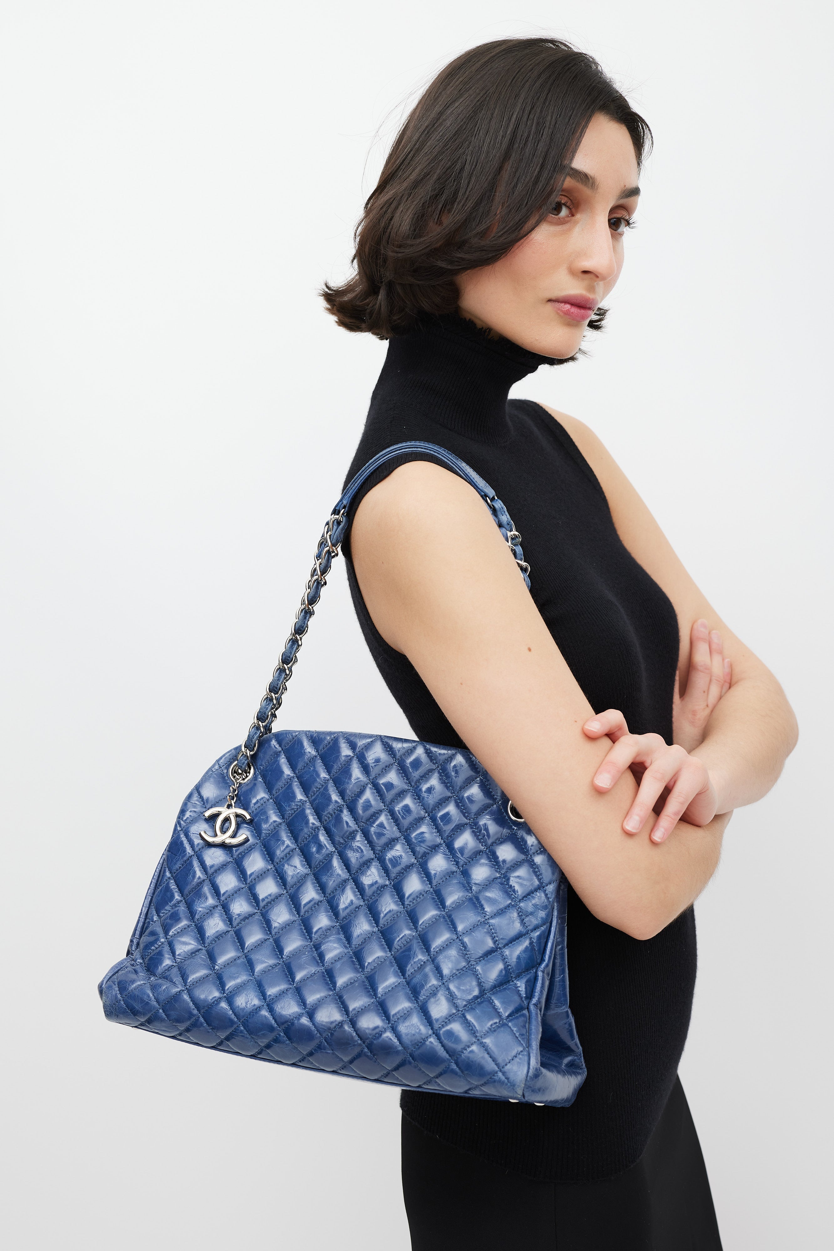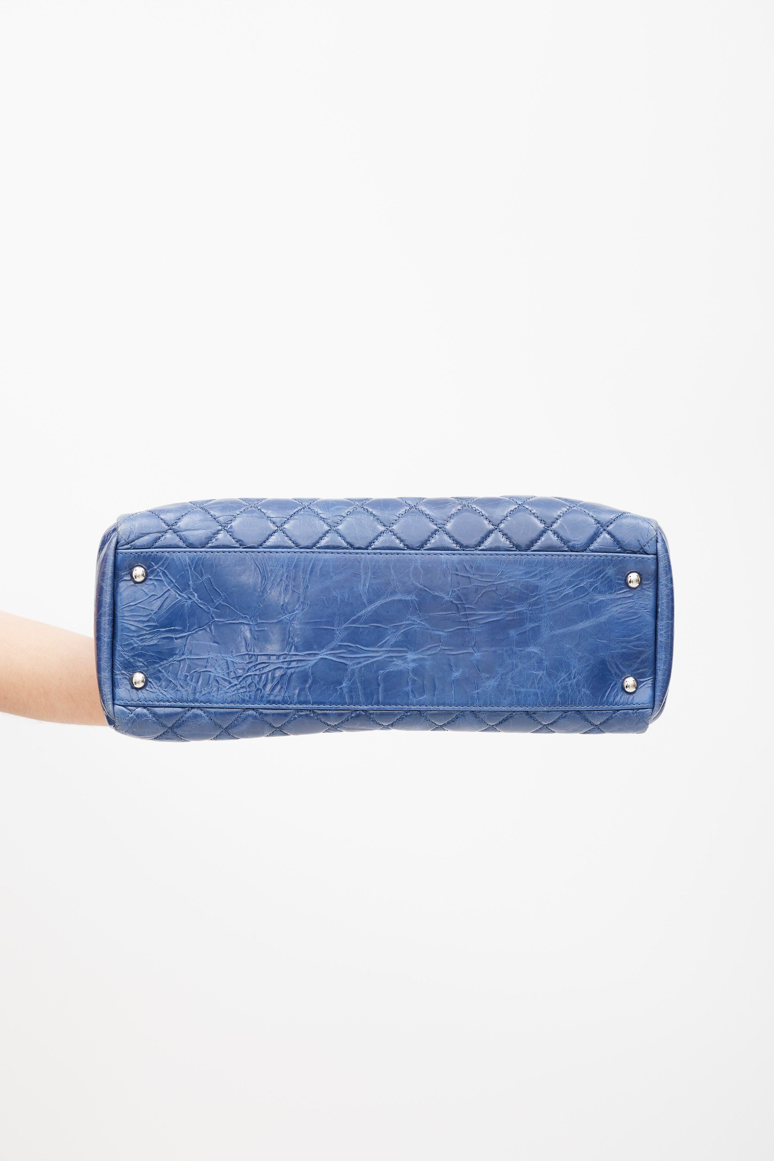 Pre-owned Chanel 2011 blue aged calfskin leather Mademoiselle Bowler bag featuring diamond quilt stitching throughout, silver tone hardware, woven leather chain strap with with a flat leather handles, silver tone CC logo charm, four protective feet at base, open top, divided main compartment with one zip pocket, two slip pockets, and silver tone logo printed on leather tab. The middle divider features a silver tone CC logo top clasp closure.