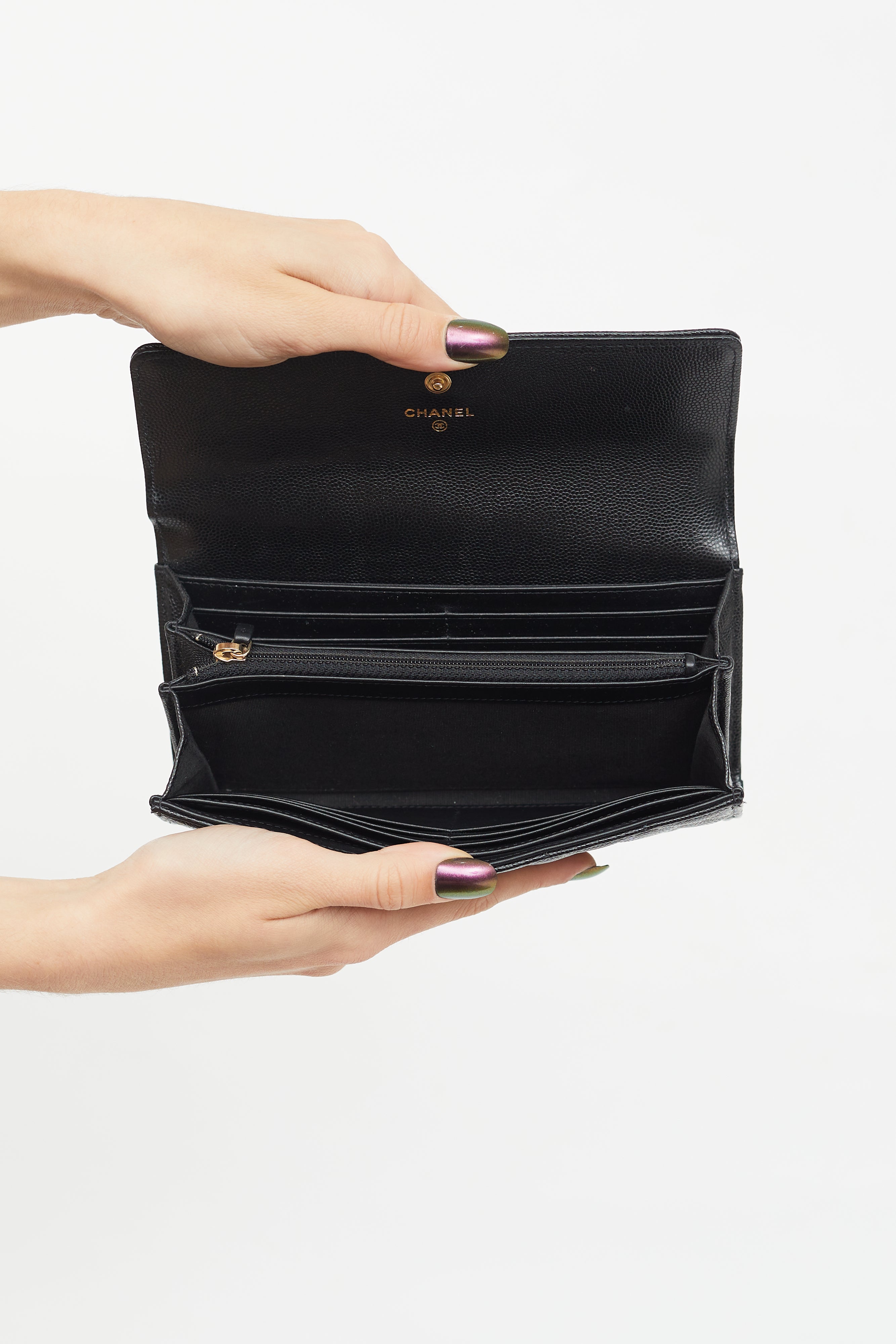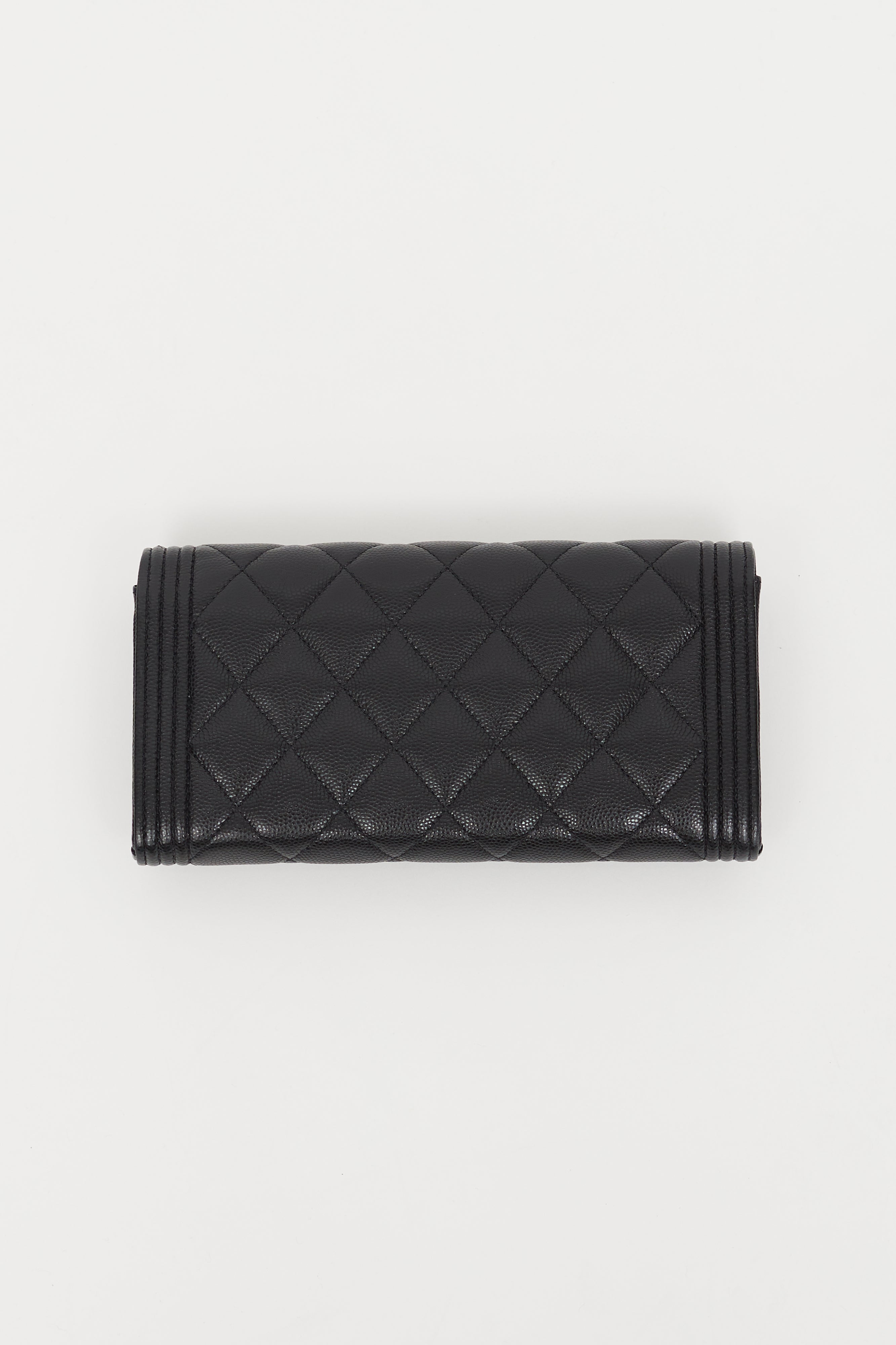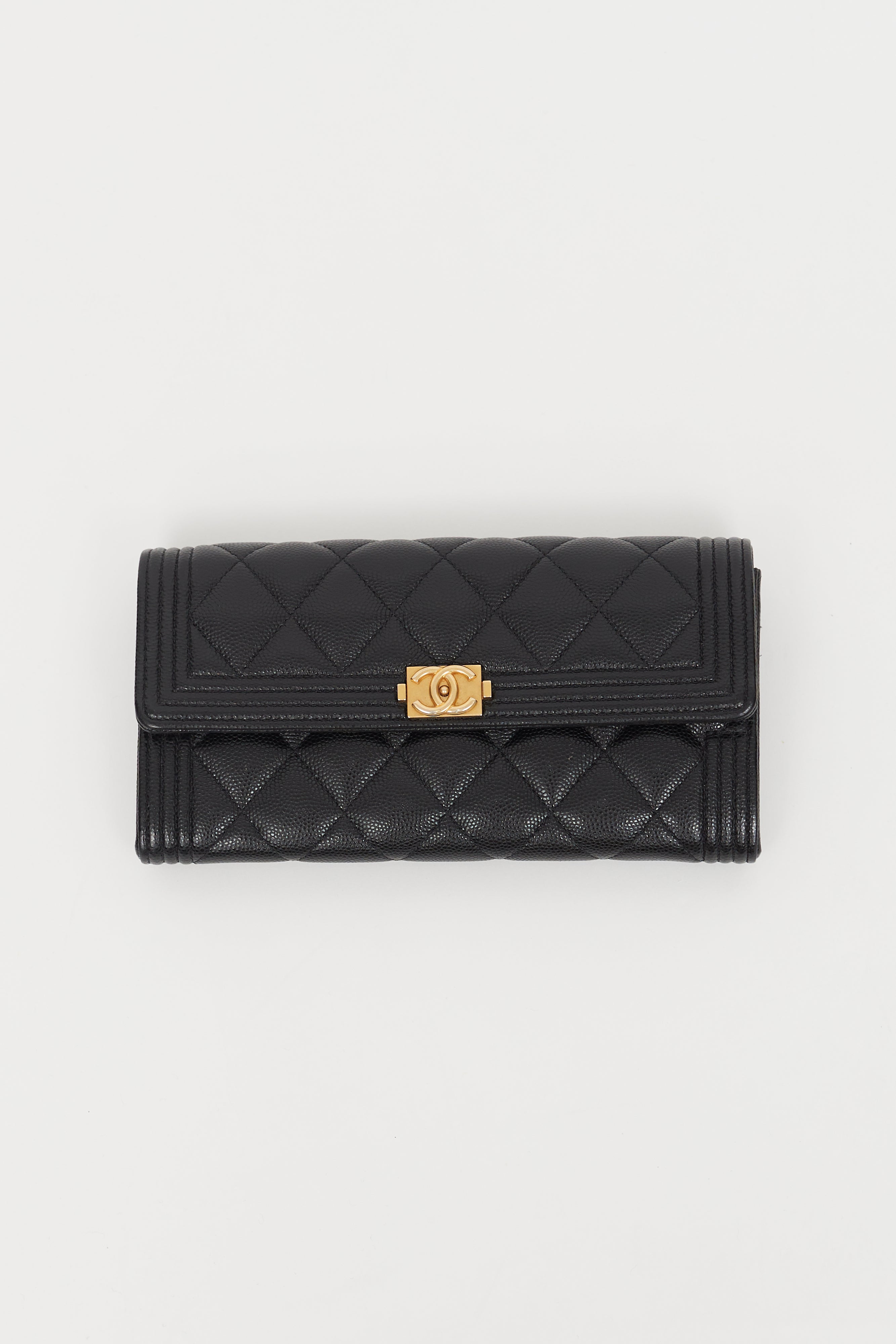 Pre-owned 2017 Chanel black Boy Flap wallet featuring quilted leather exterior, gold tone CC hardware at front, snap button closure, three main compartments, middle zip pocket, two slip pockets and multiple card slots. Comes with original box, dust bag, and brand authentication card.