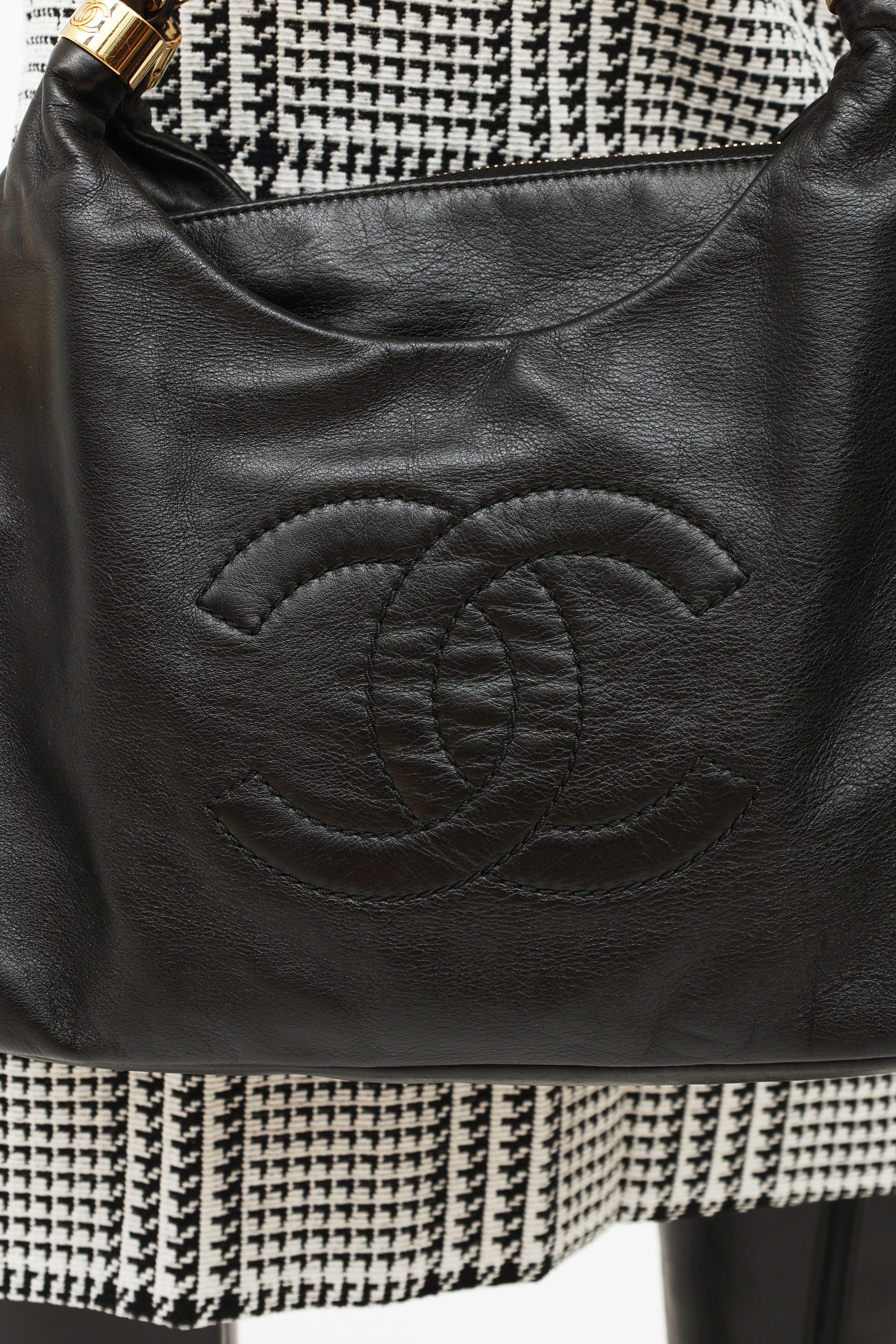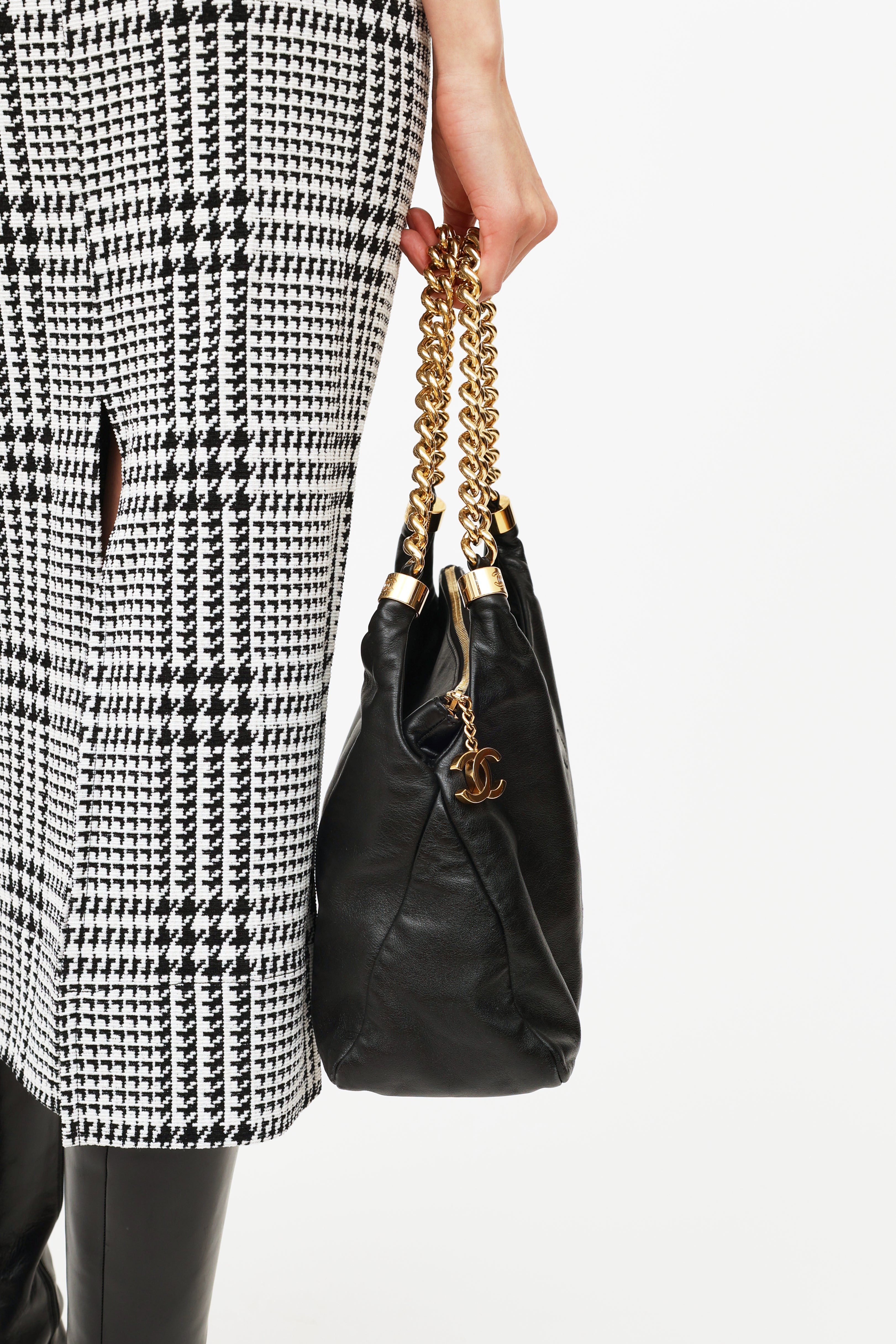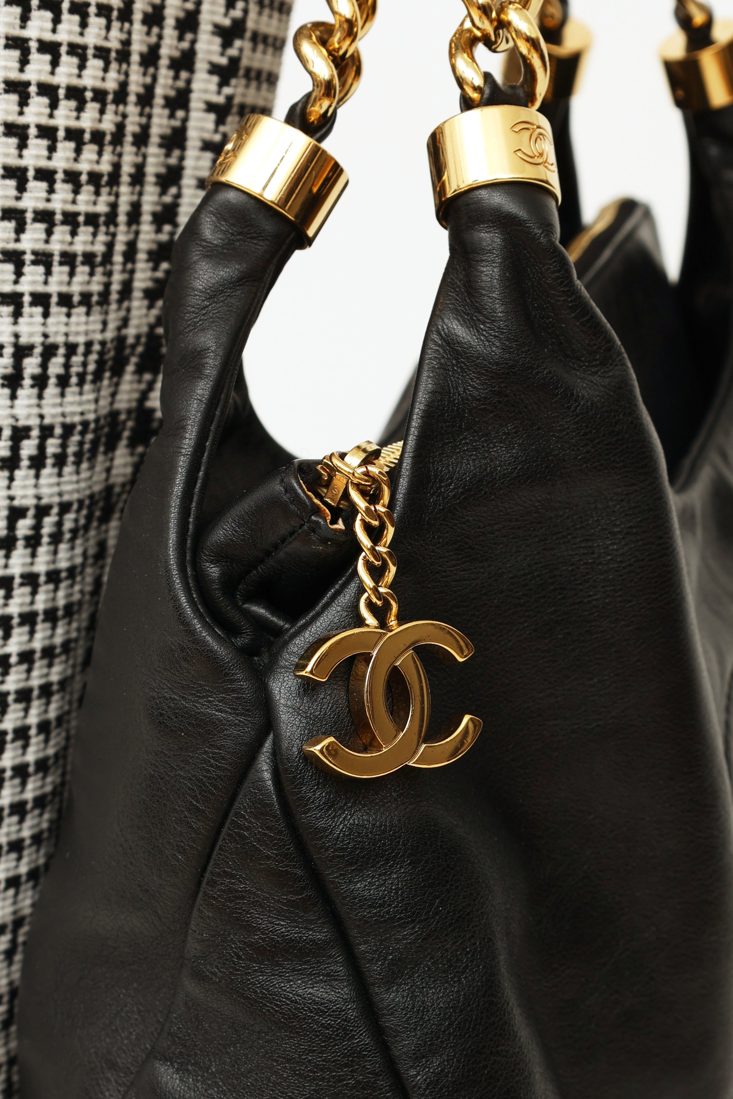 Pre-owned Chanel black lambskin Rodeo Drive bag featuring gold-tone hardware, dual chain link shoulder straps, large stitched CC logo on front, dual exterior pockets with snap closure, zip closure with CC charm pull that leads in to one main textile-lined compartment with one zip closure.
