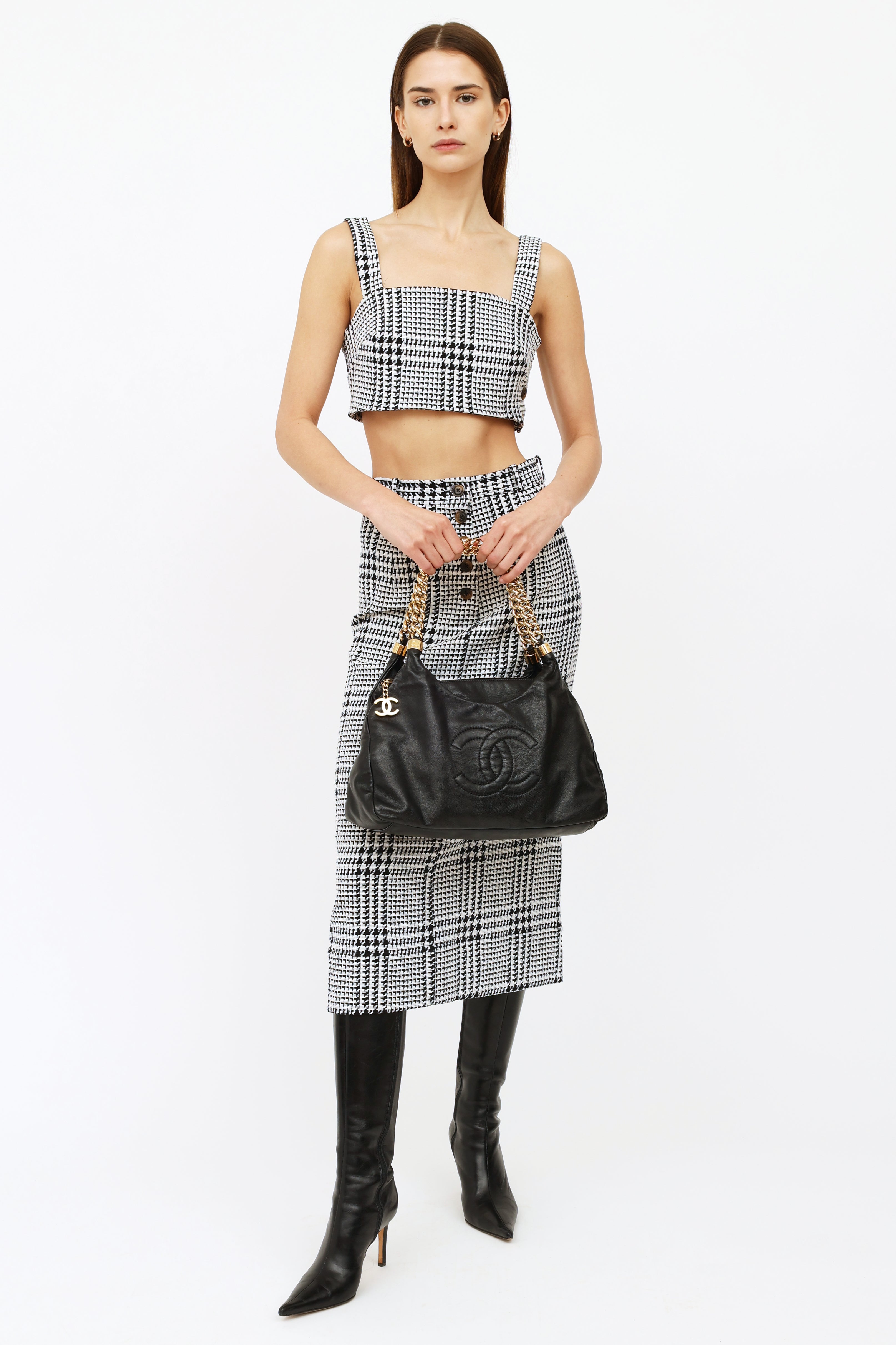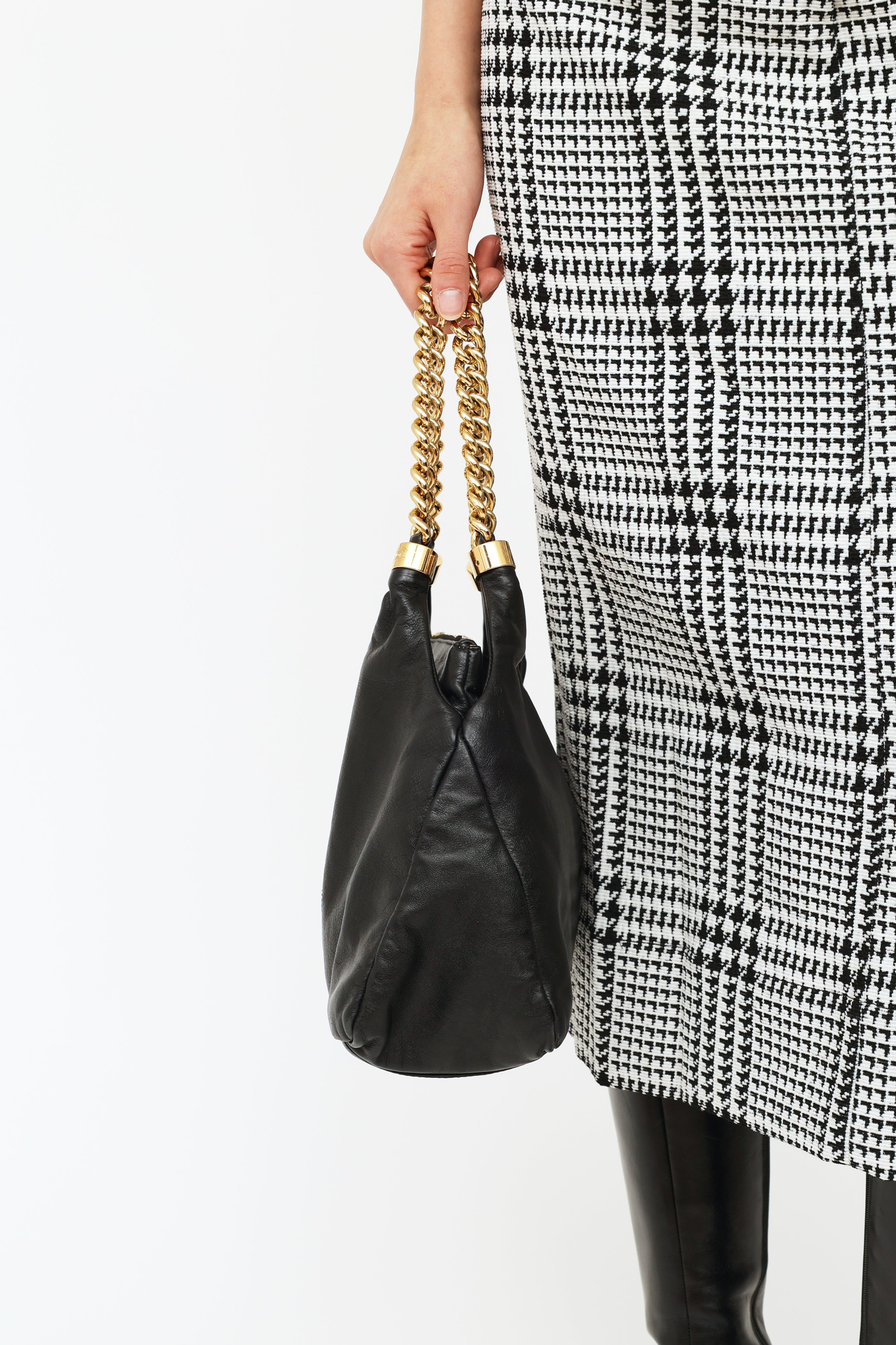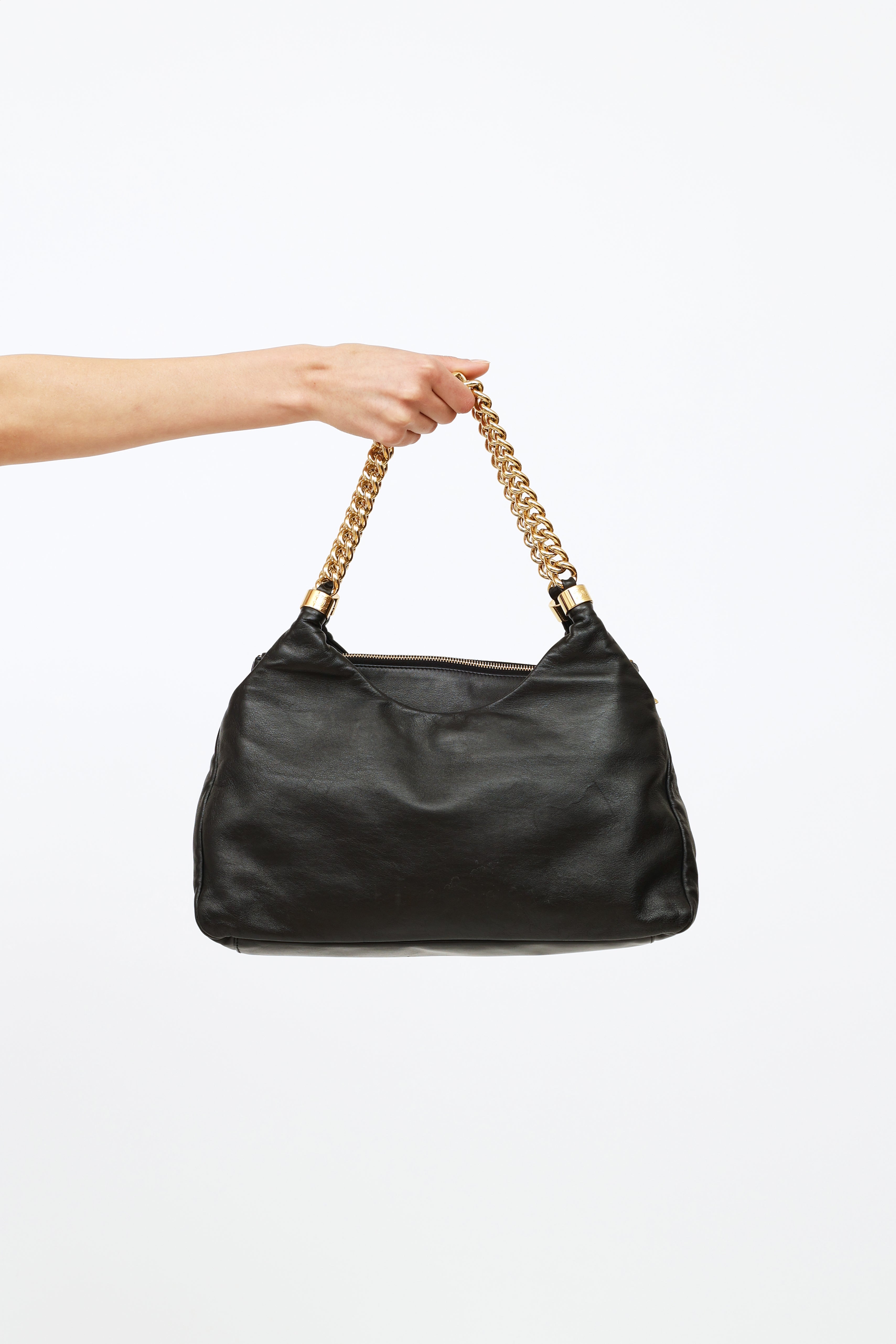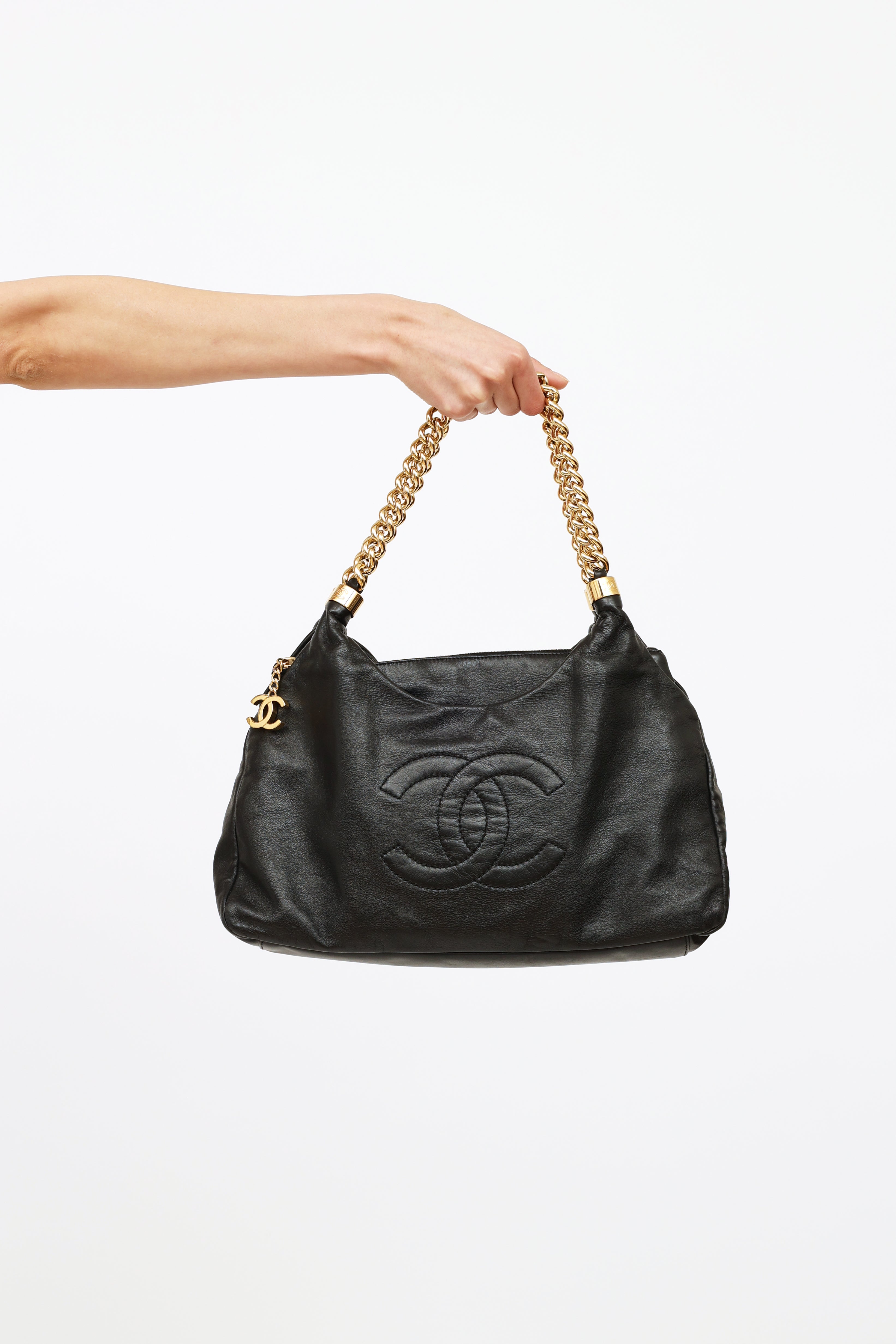Pre-owned Chanel black lambskin Rodeo Drive bag featuring gold-tone hardware, dual chain link shoulder straps, large stitched CC logo on front, dual exterior pockets with snap closure, zip closure with CC charm pull that leads in to one main textile-lined compartment with one zip closure.