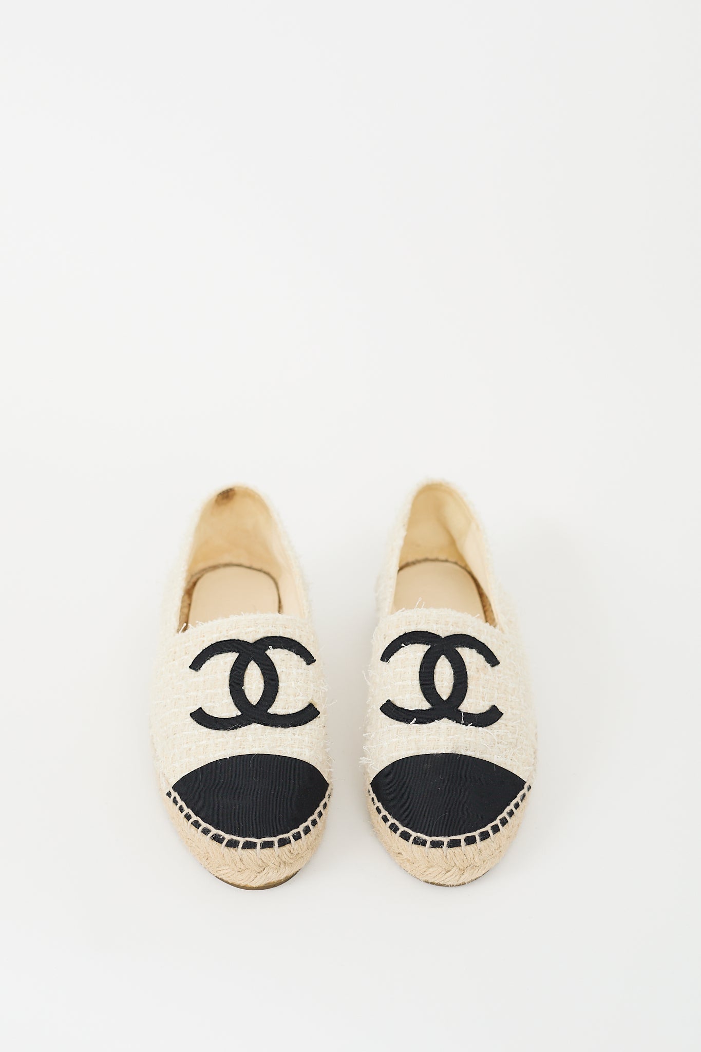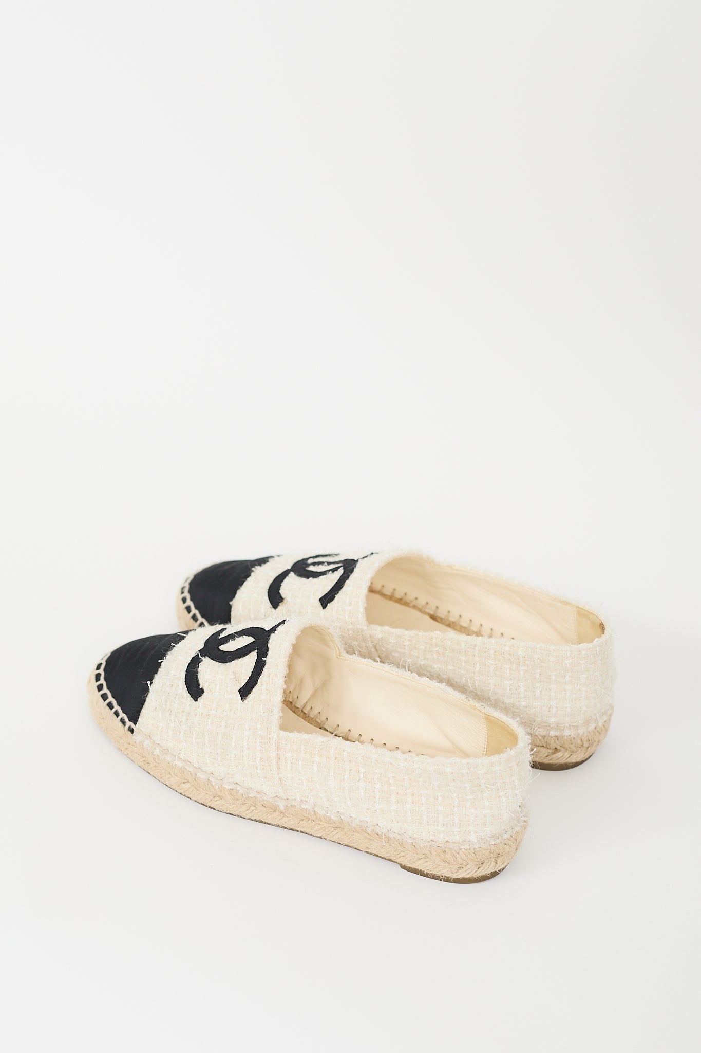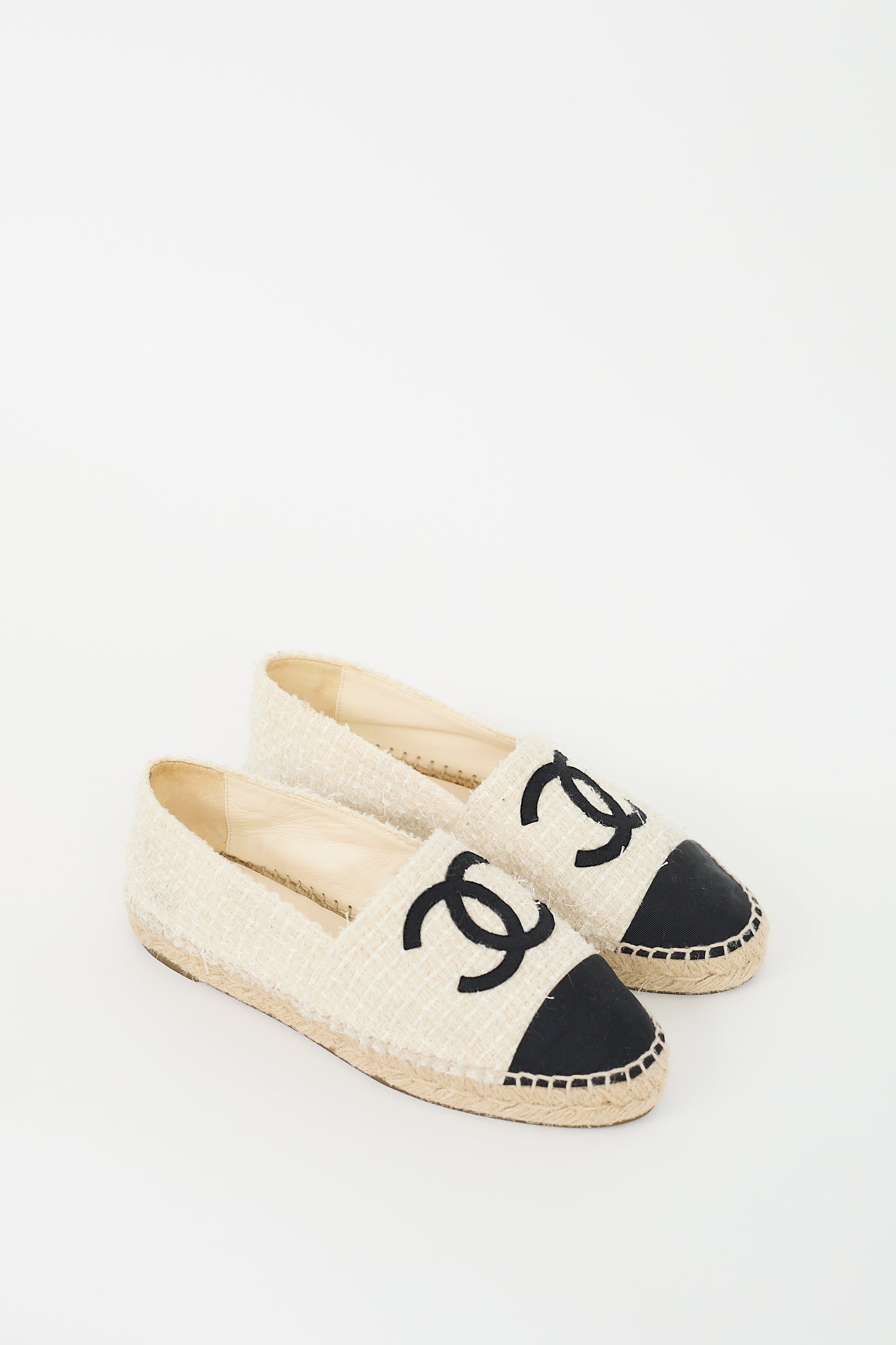 Pre-owned Chanel cream and black espadrille flats featuring a rounded toe, tweed upper, contrasting toe cap and interlocking CC motif at vamp, slip on entry, leather interior, braided midsole, and rubber outsole. Comes with original dust bags.