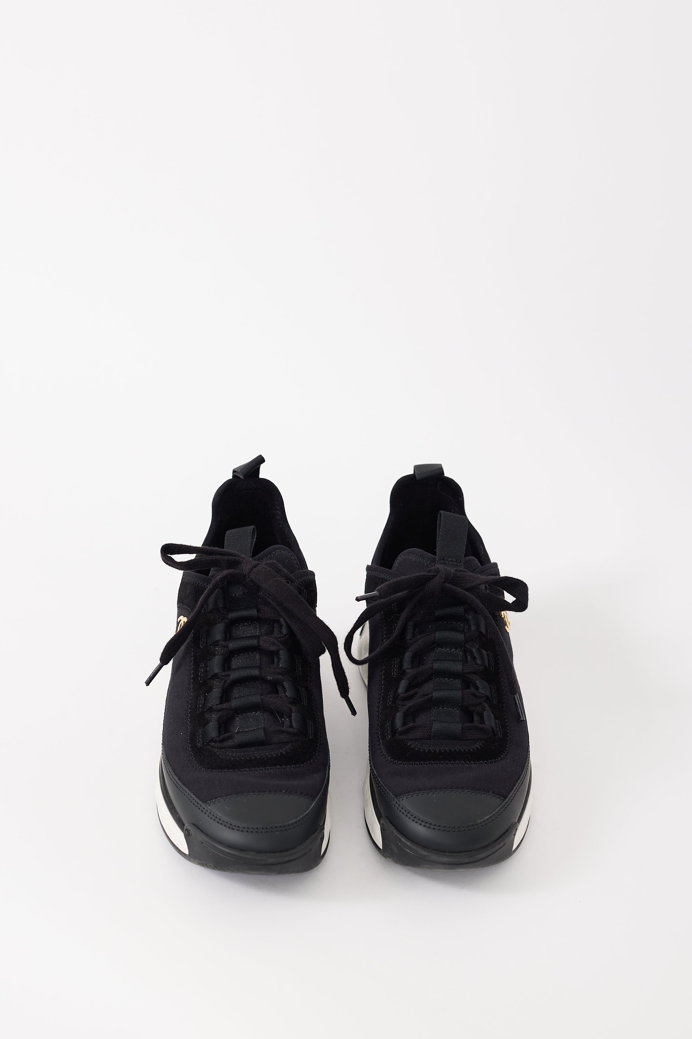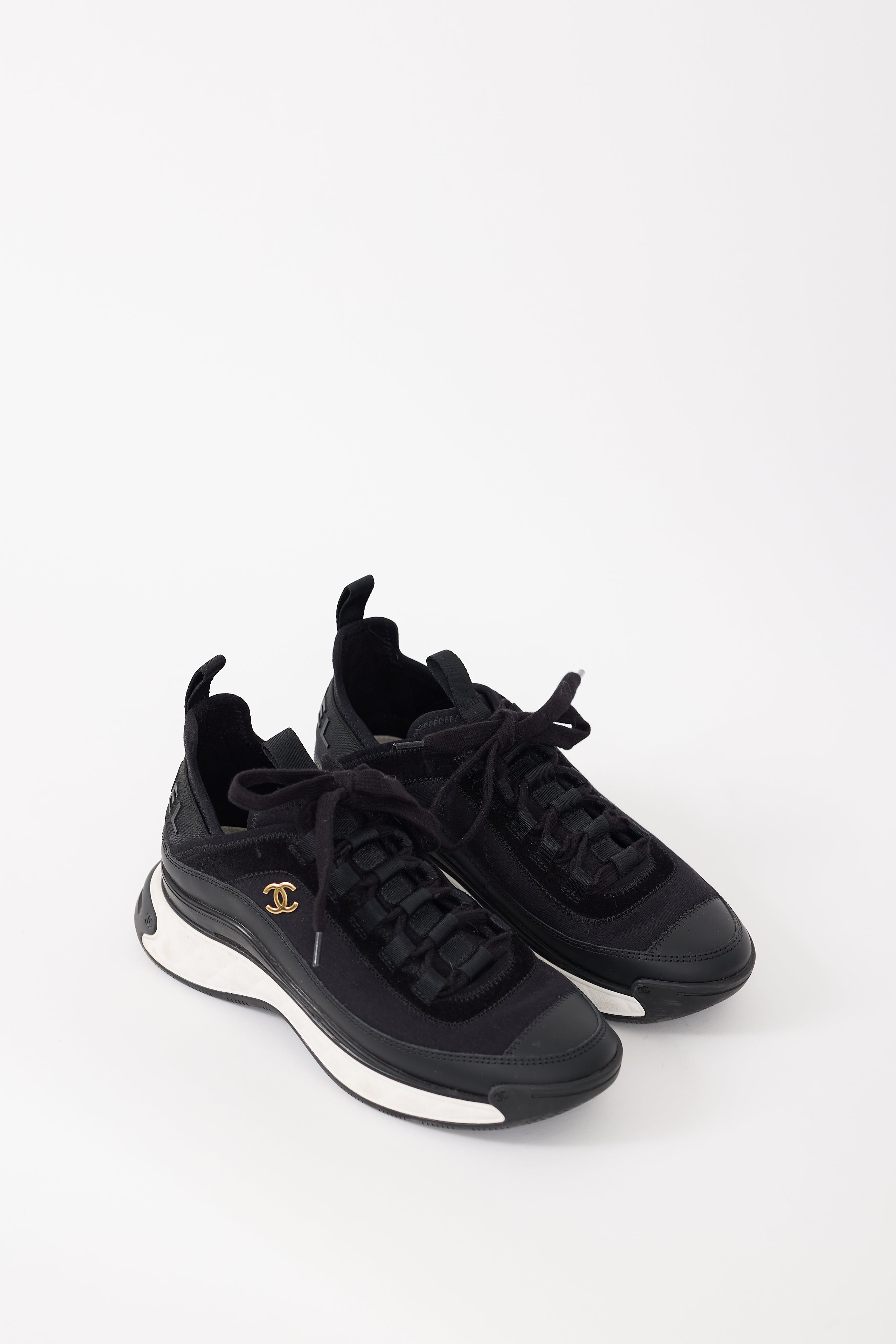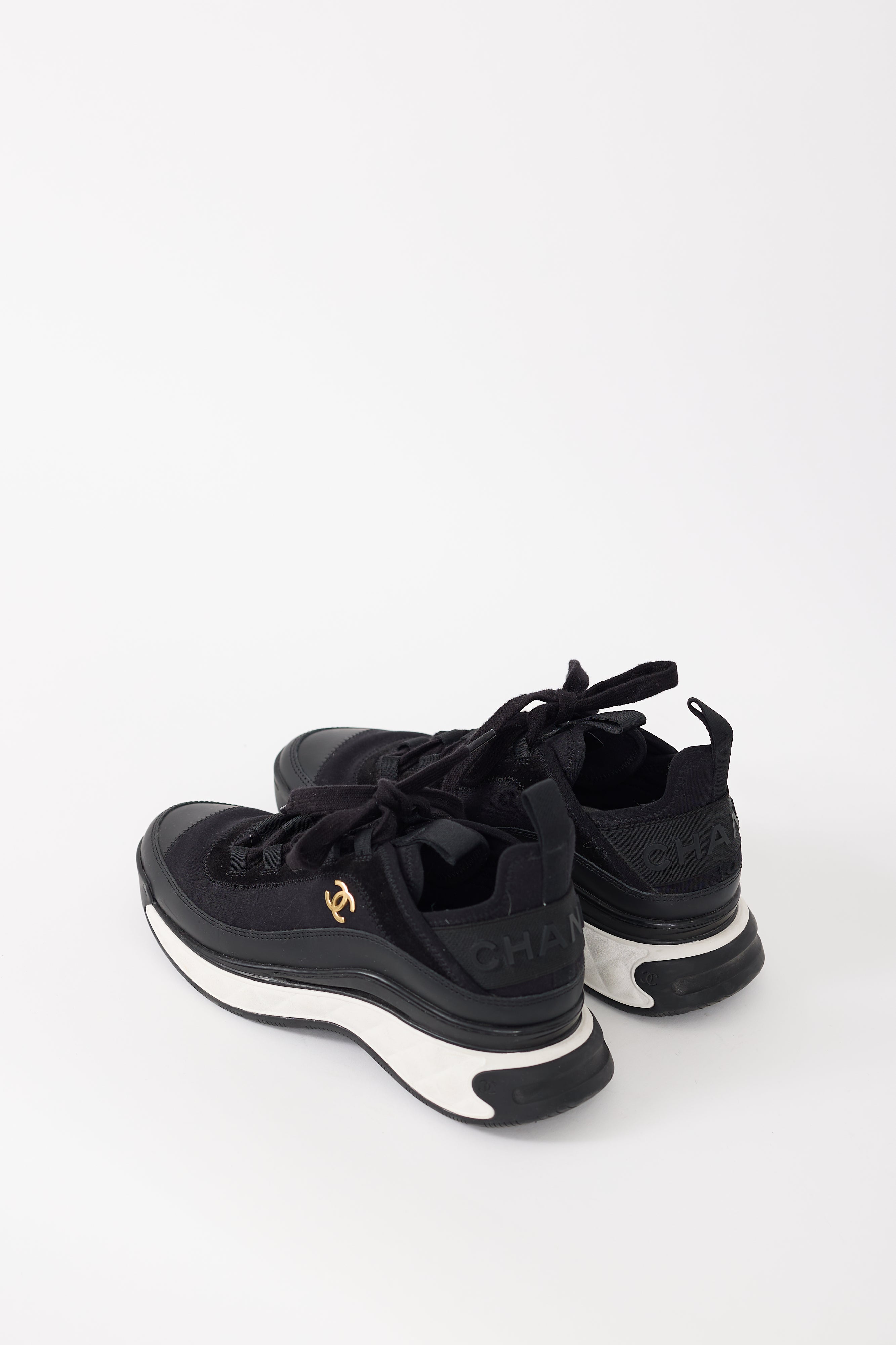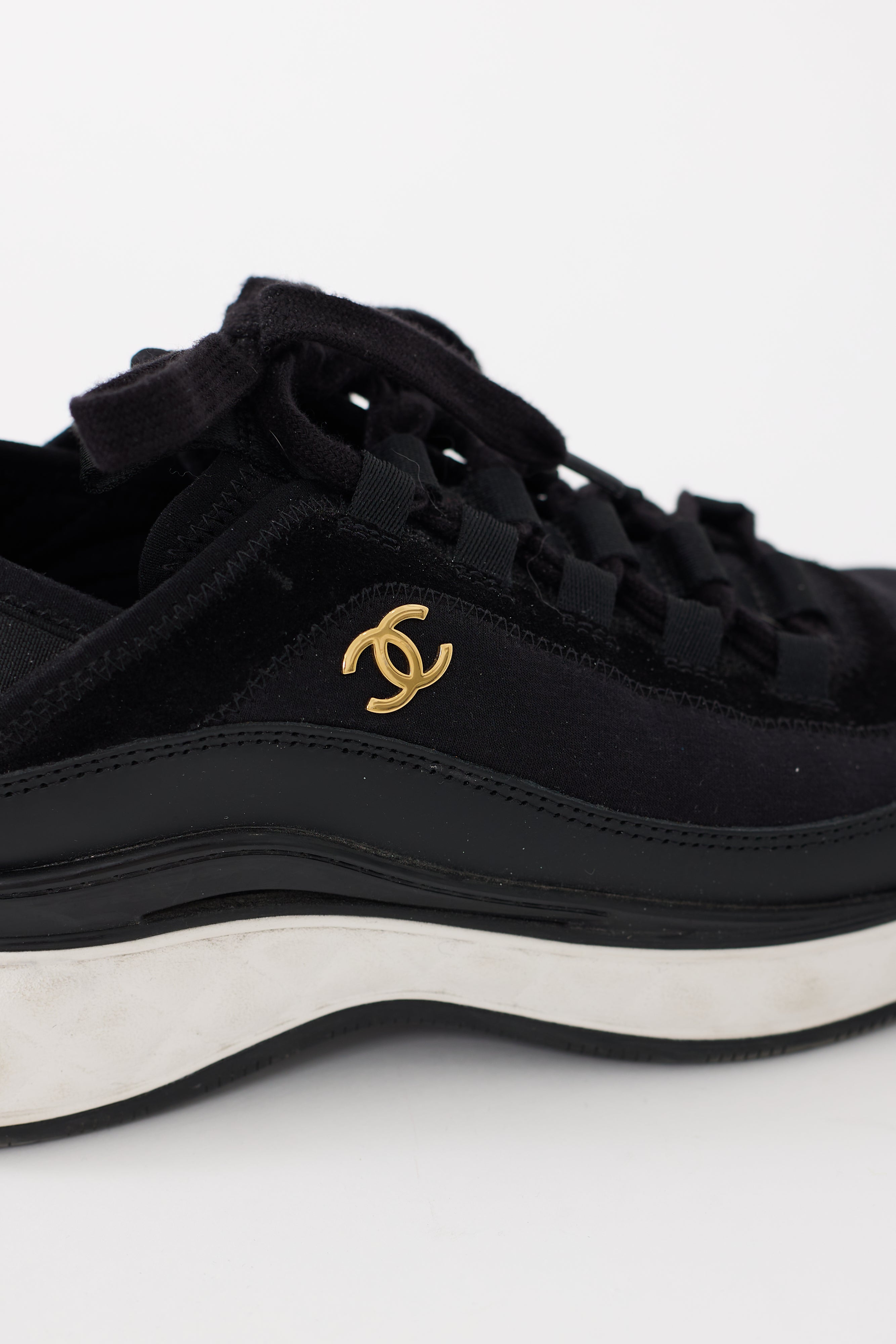 Pre-owned Chanel Cruise 2020 black sneakers featuring lace up front, rounded toe, mixed leather and neoprene upper, velvet eyestay, gold tone CC logo at outer side, white rubber midsole with quilted motif and debossed CC logo, and rubberized logo at back. Comes with original dust bag and box.
