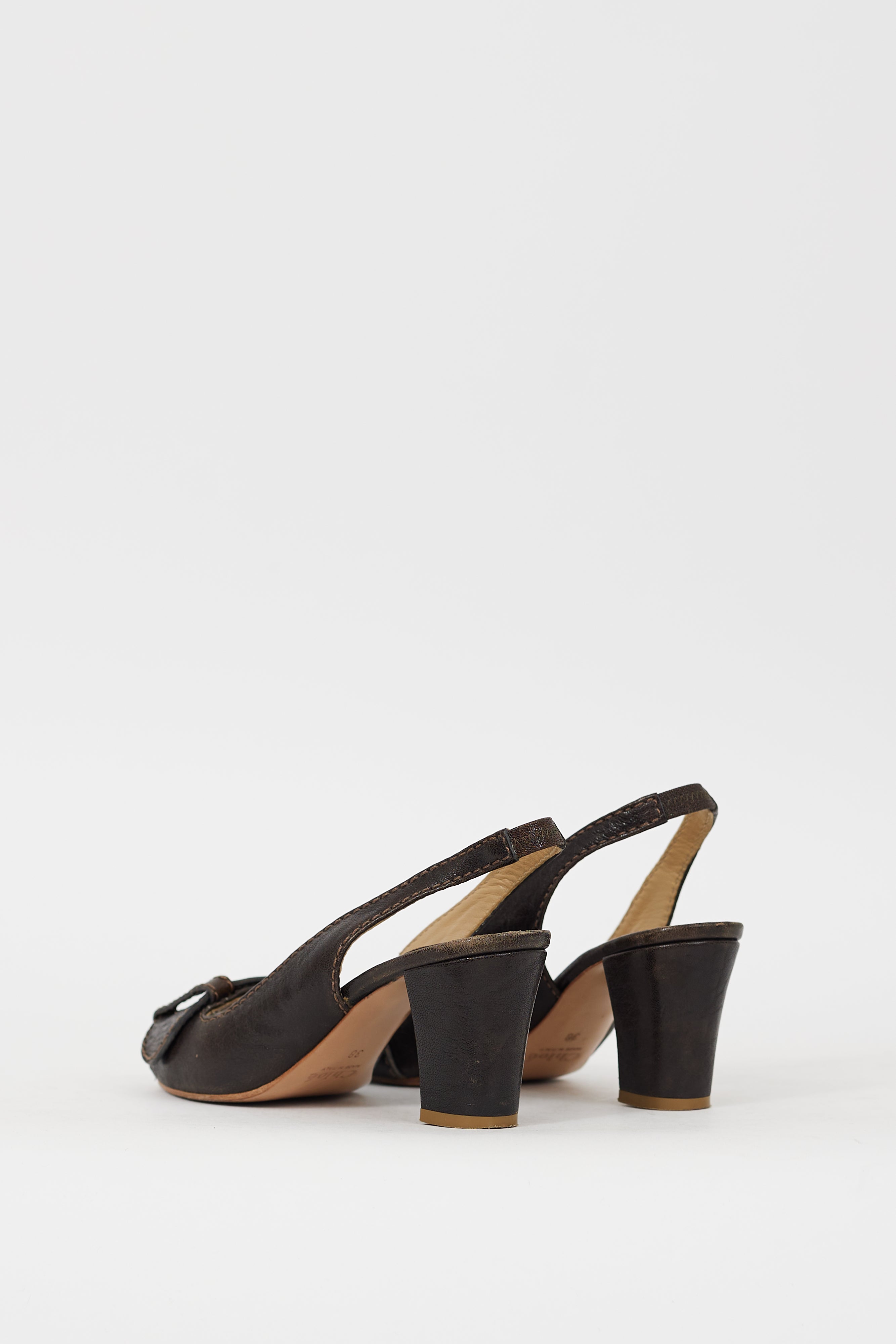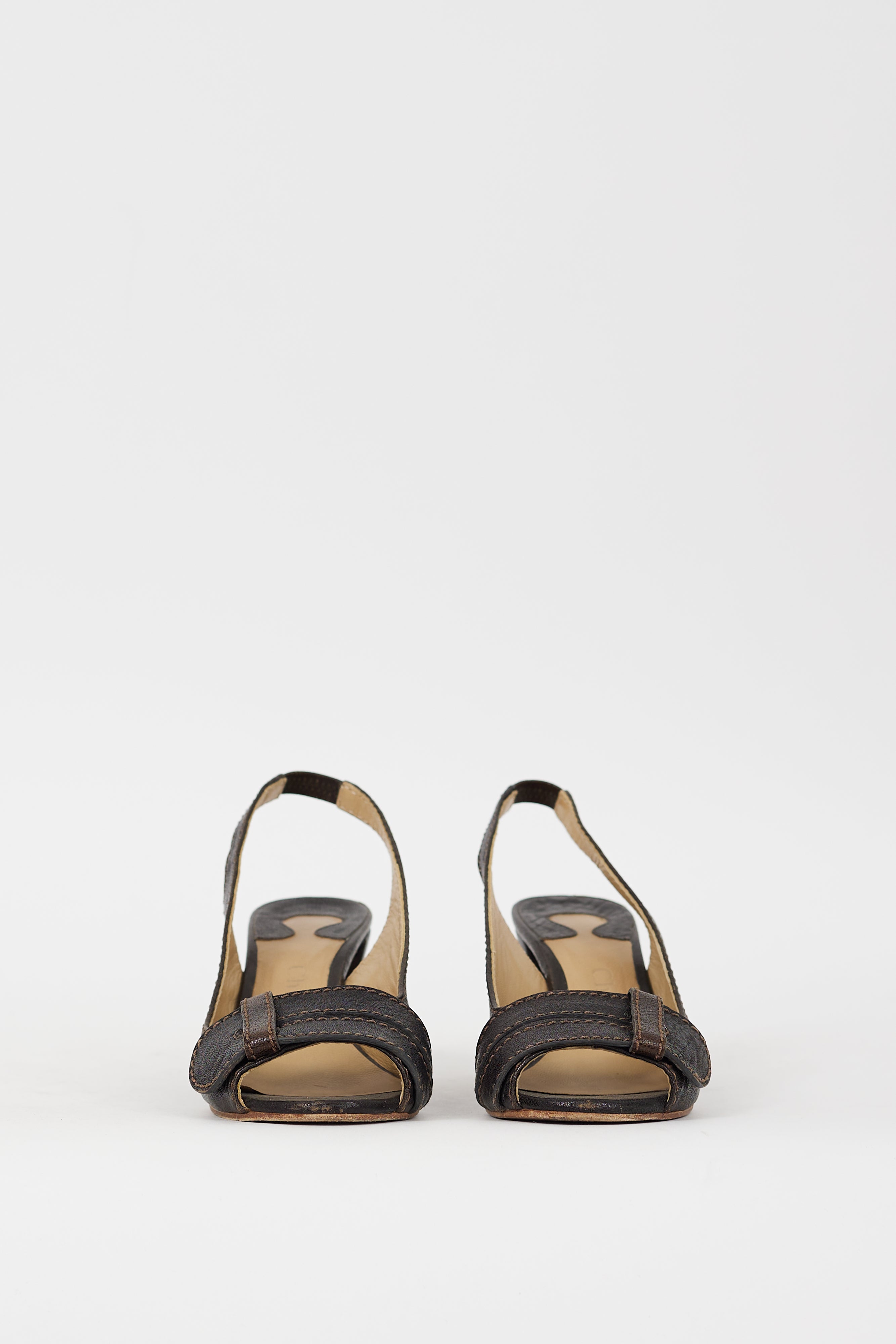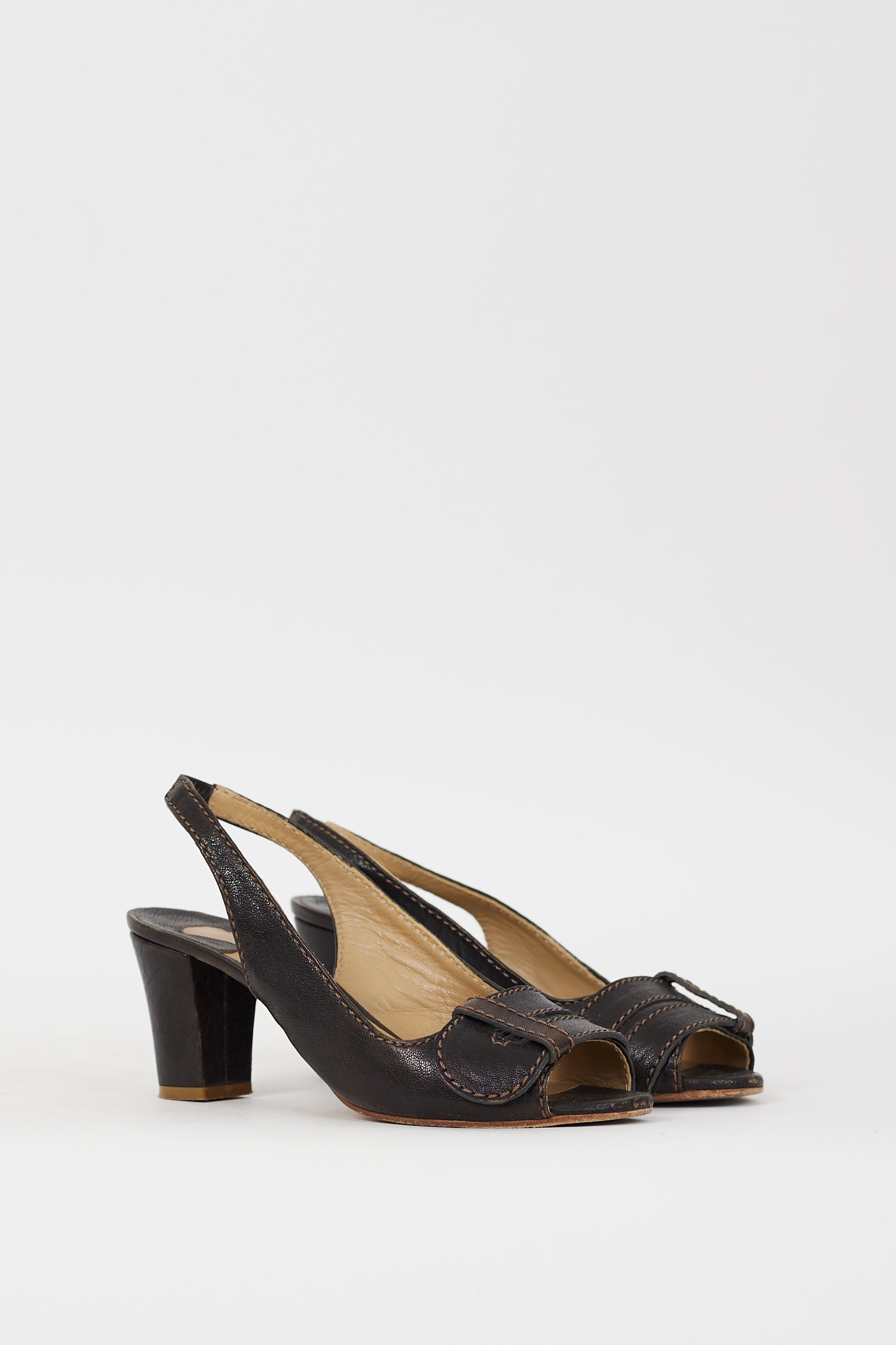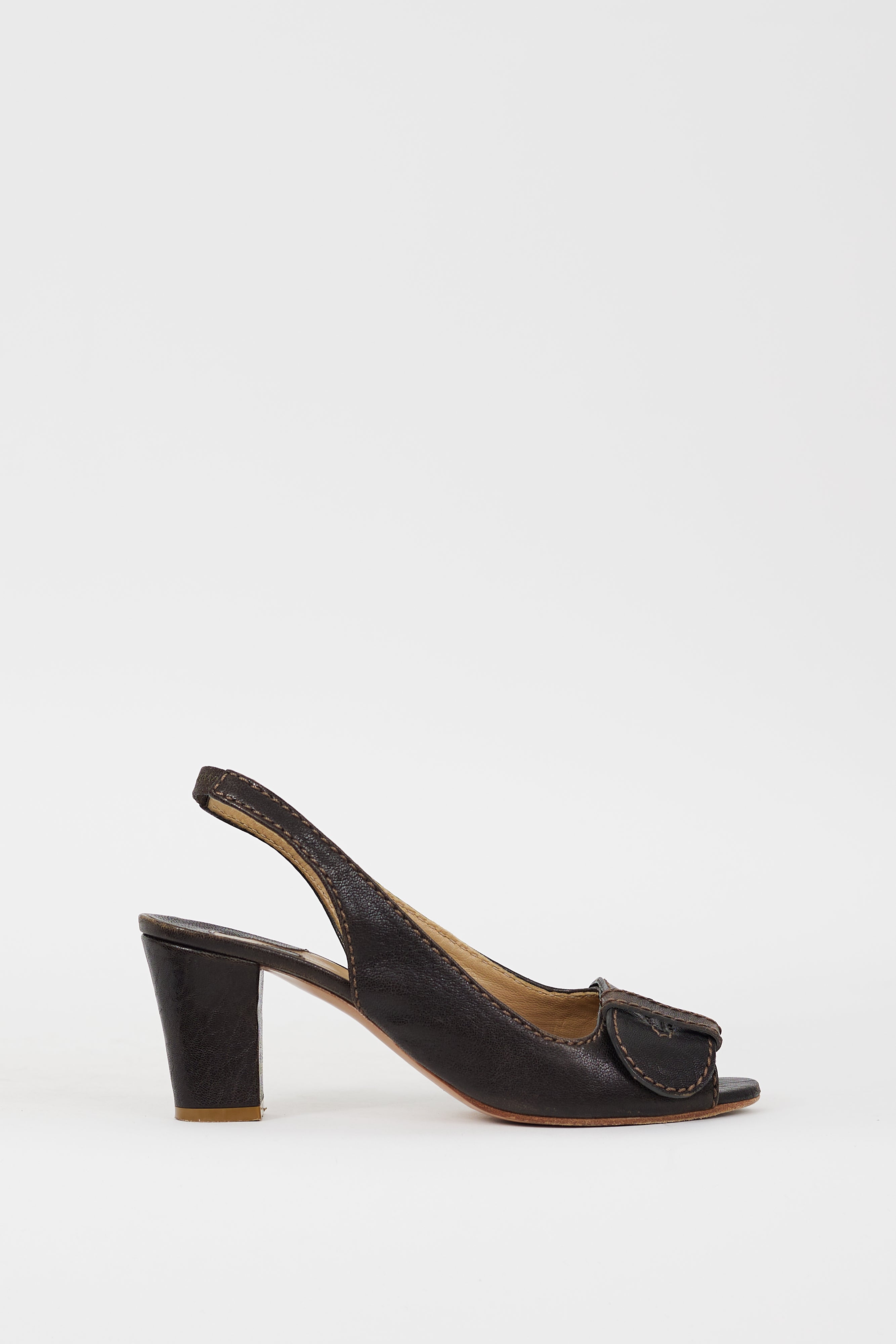 Pre-owned Chloé brown leather heels featuring peep rounded toe, contrast stitch, strap detail at vamp, elasticized slingback strap, and block heel. Comes with original dust bag.