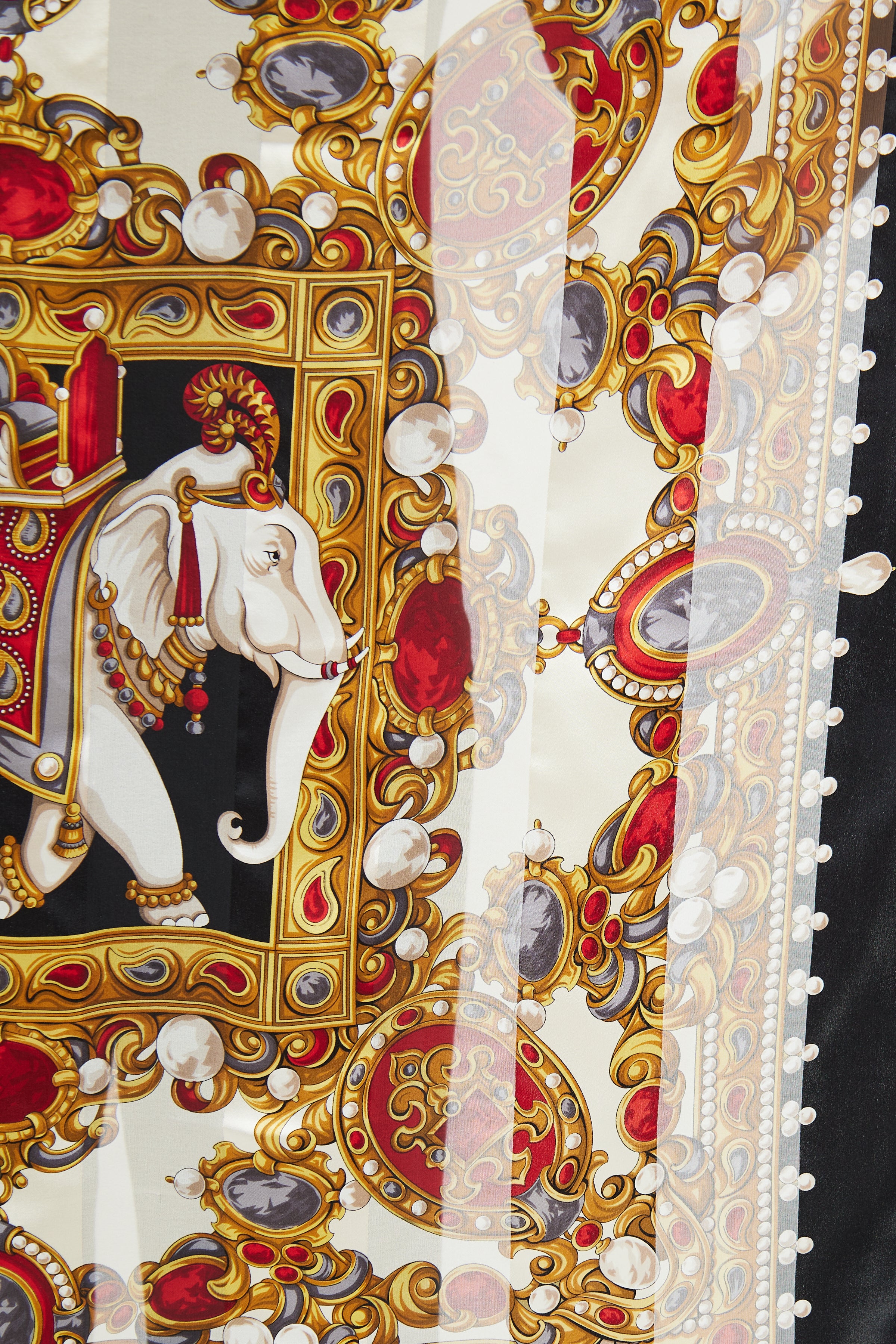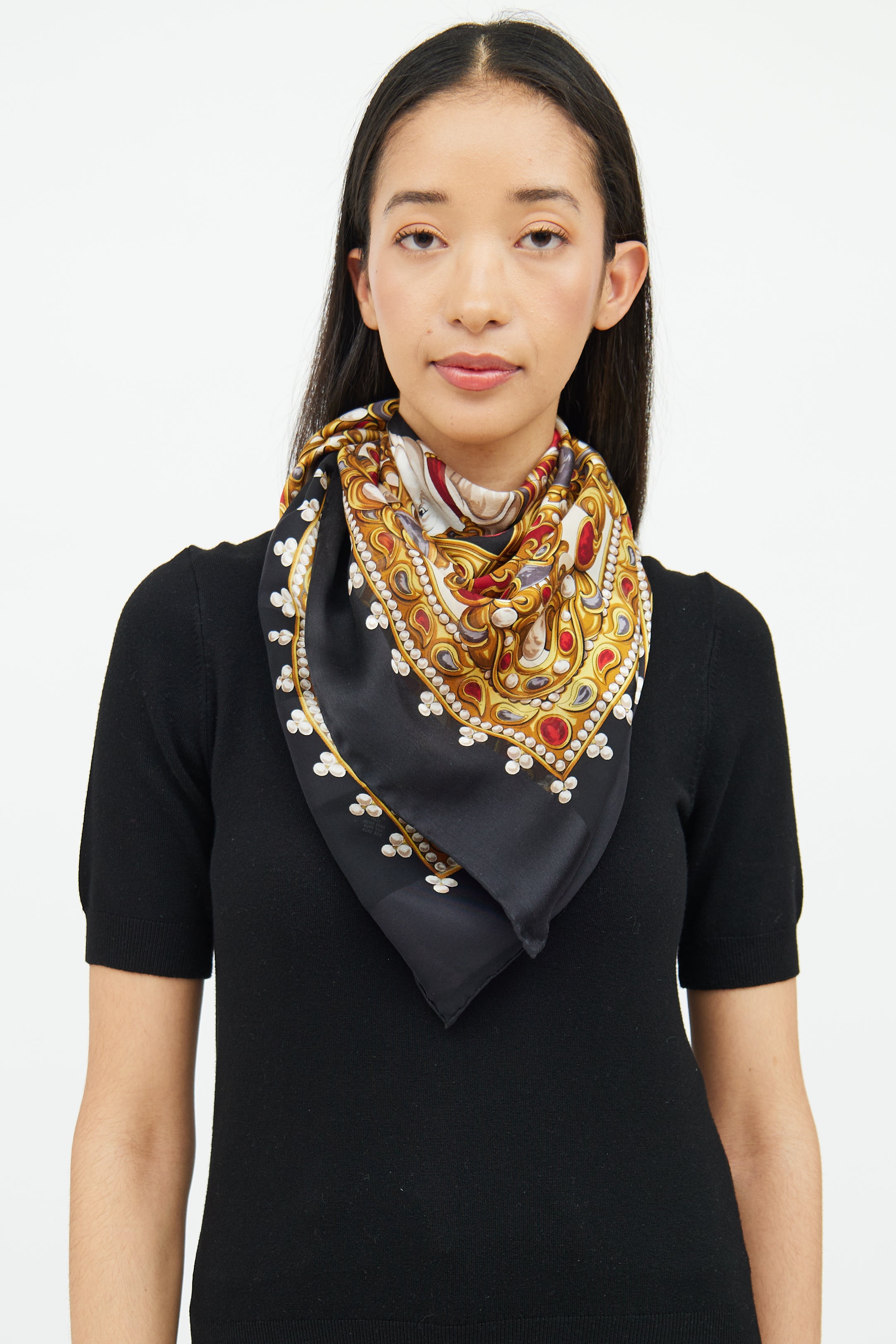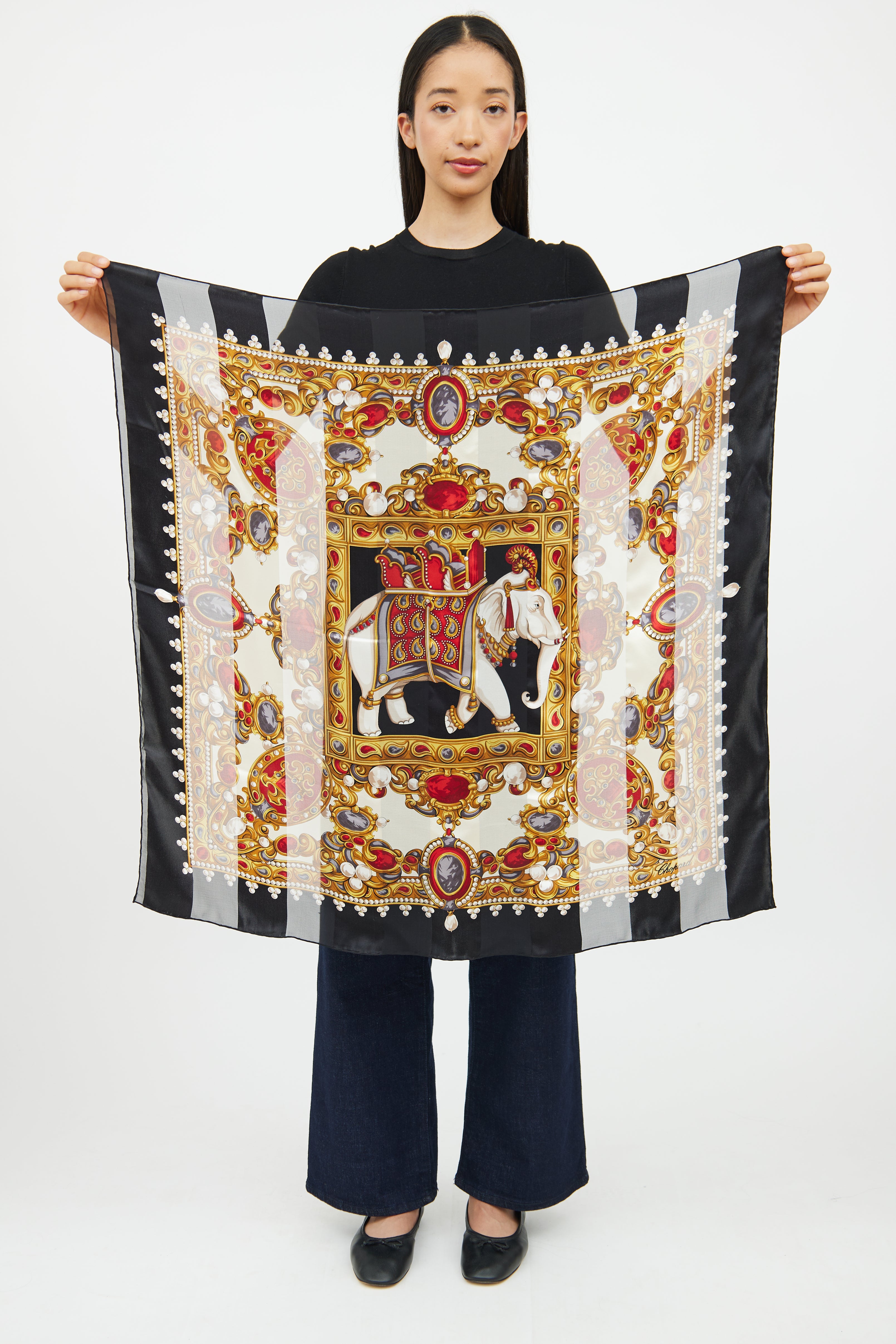 Pre-owned Chopard black, gold and red scarf featuring elephant and jewel print with ornate details, semi sheer striping and rolled edges.