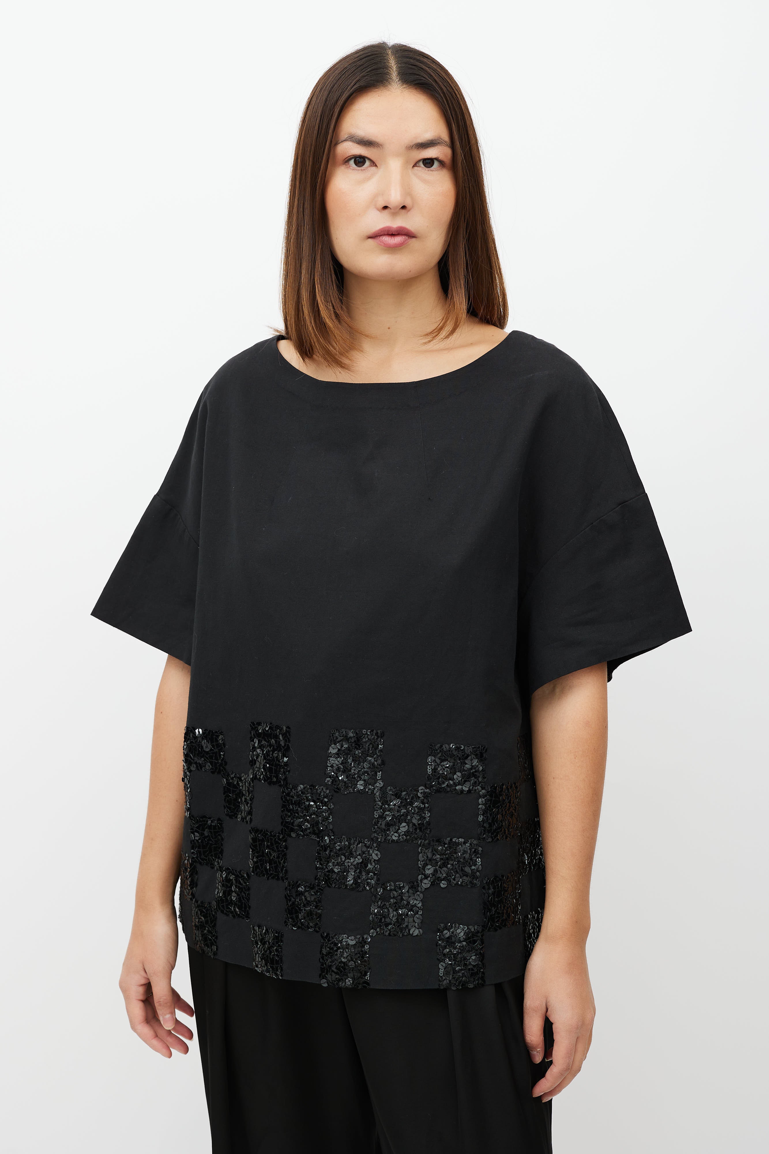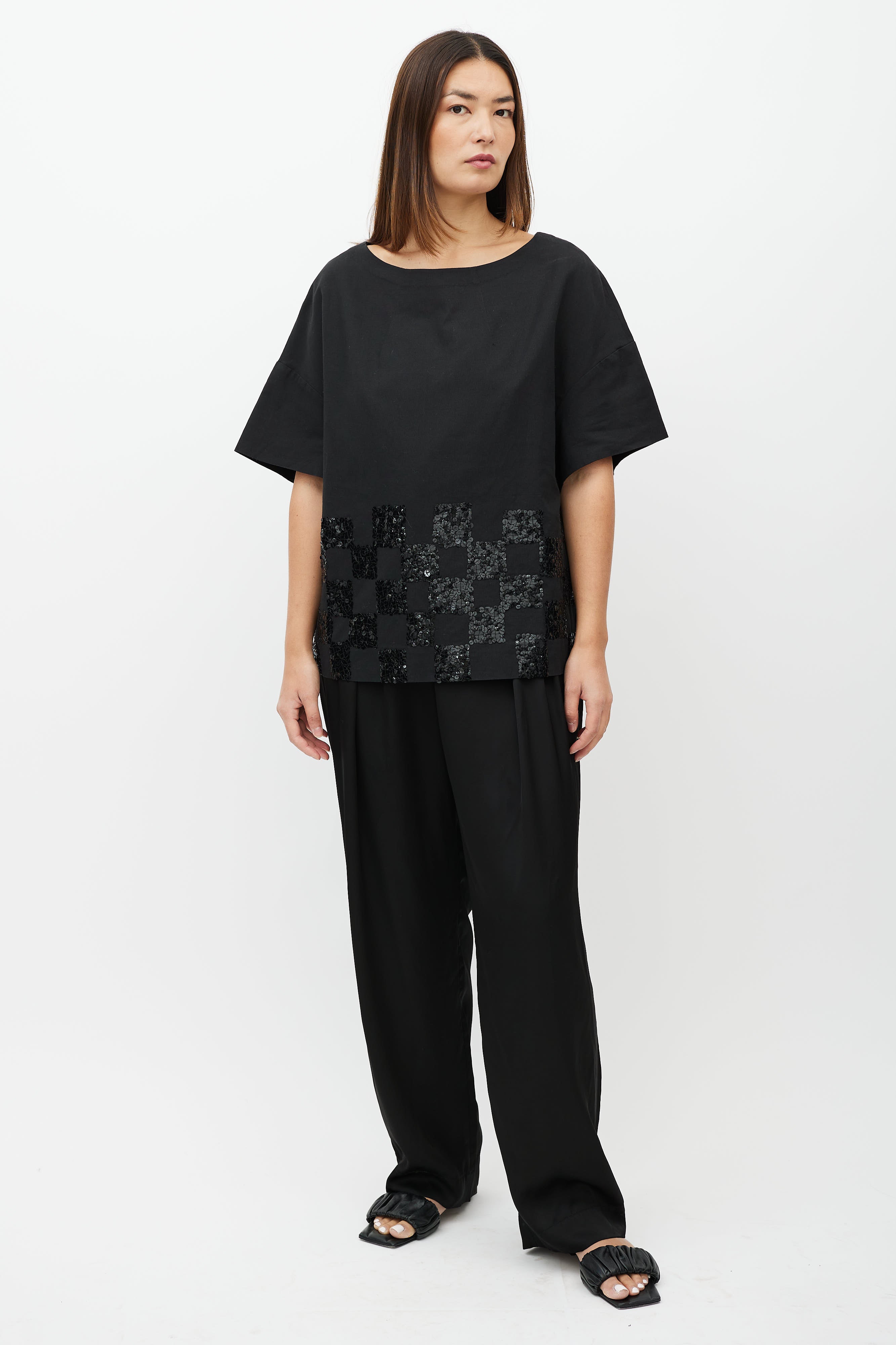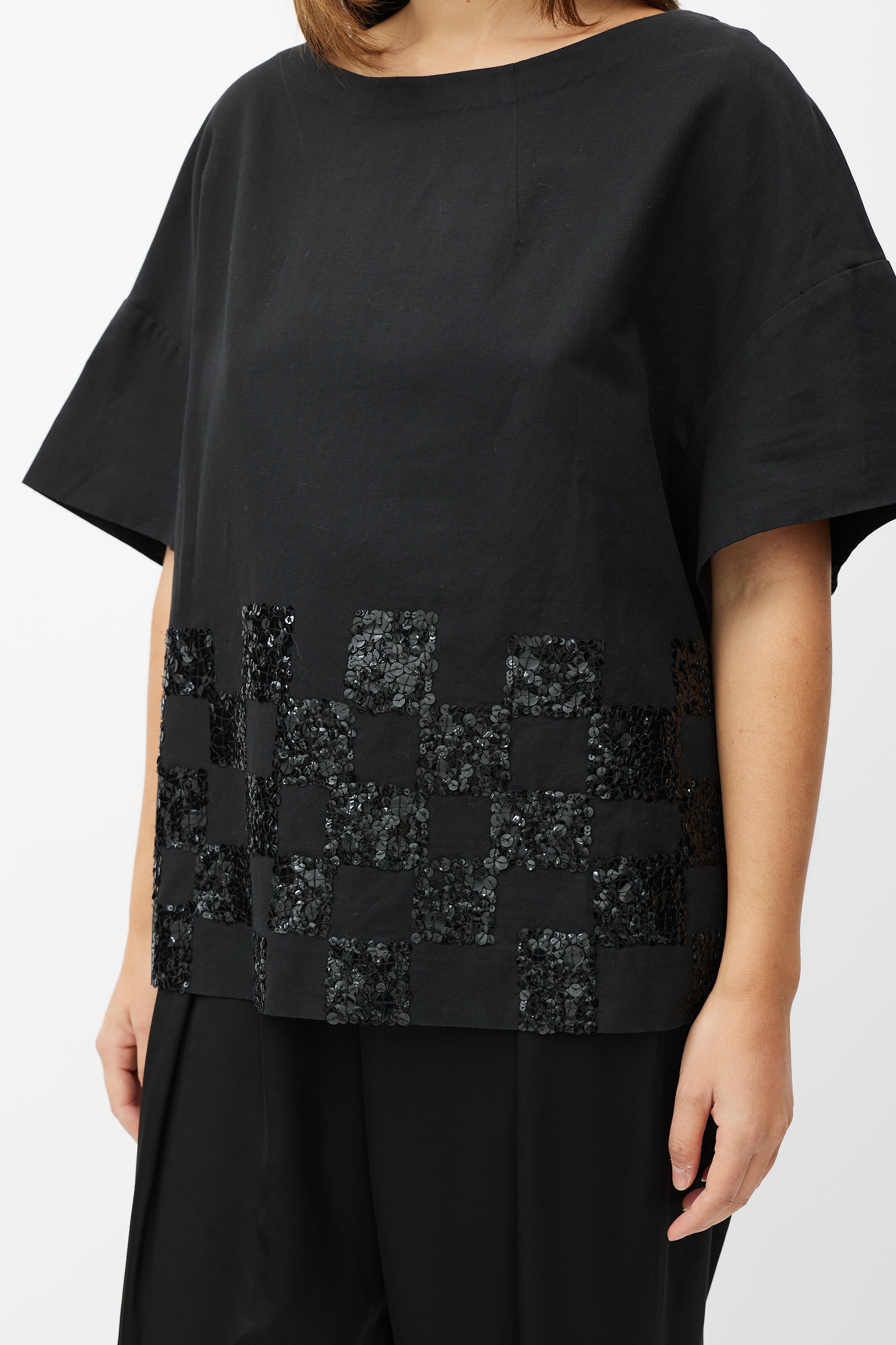 Pre-owned Dries Van Noten black top featuring a boat neckline with darting, drop shoulders, short sleeves, and sequined checker pattern on lower half.