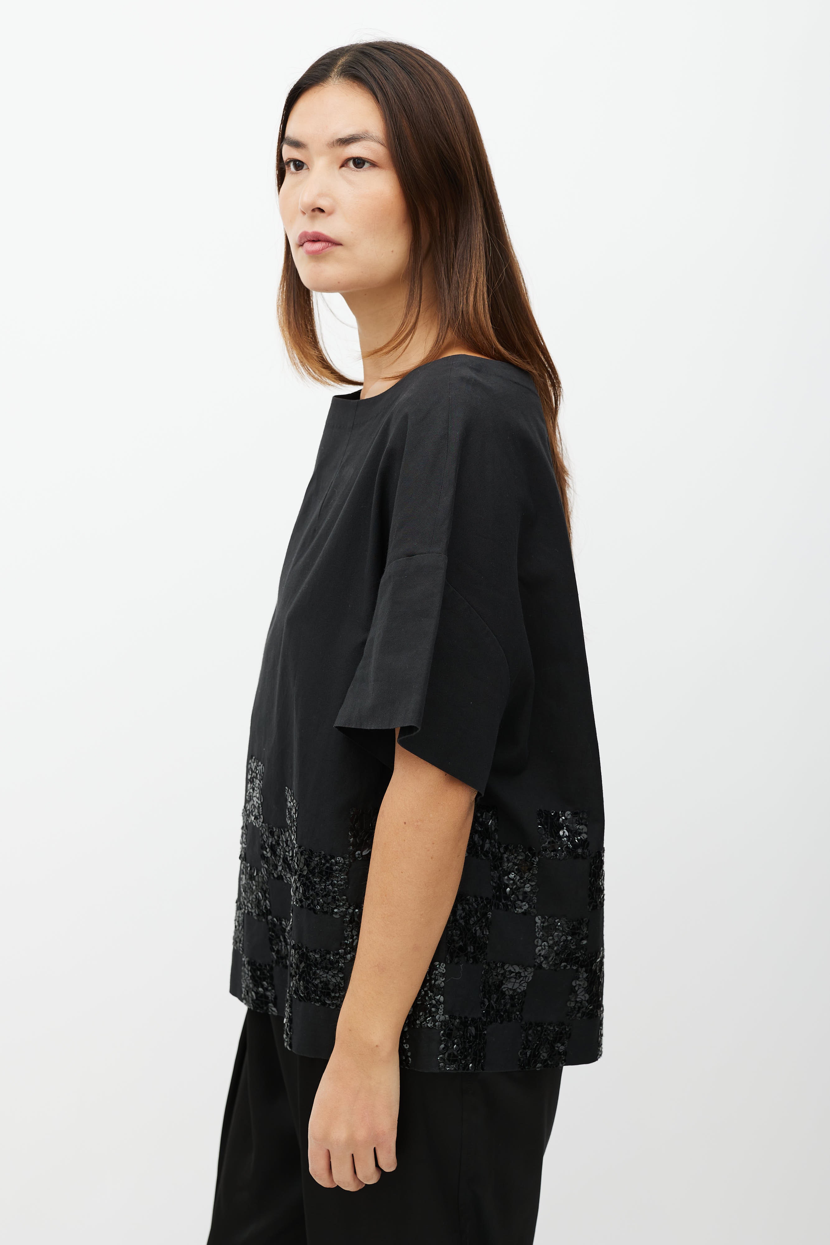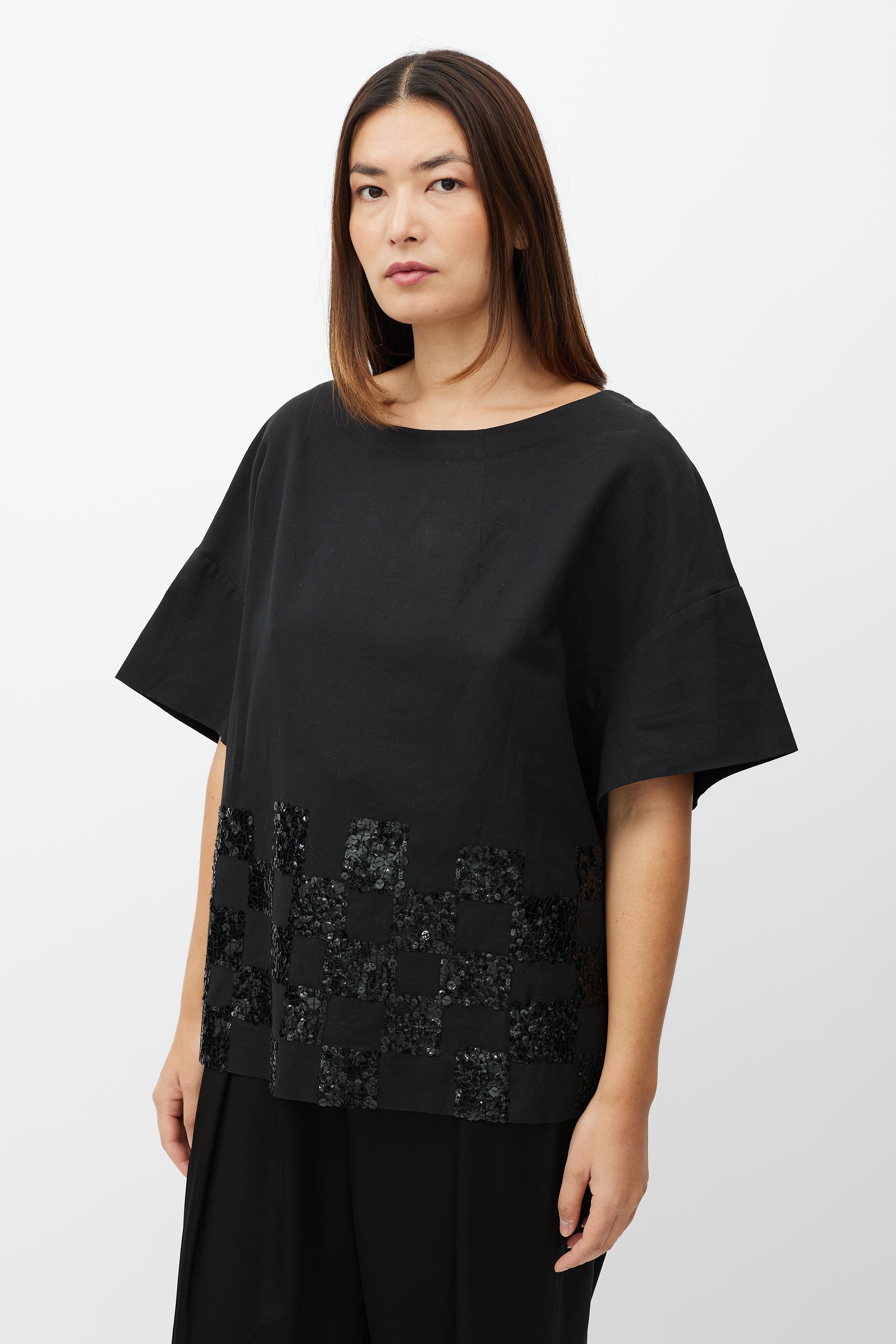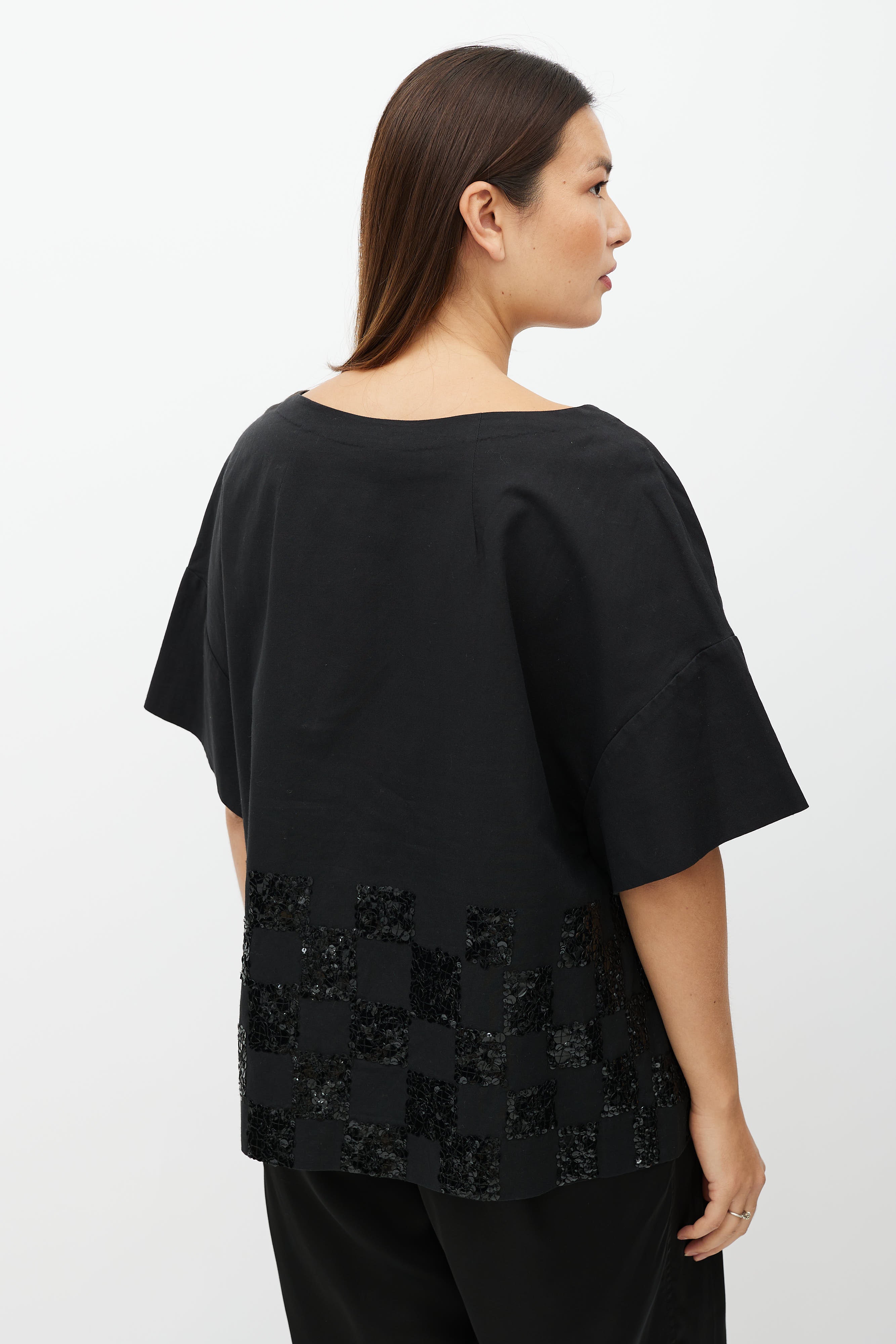 Pre-owned Dries Van Noten black top featuring a boat neckline with darting, drop shoulders, short sleeves, and sequined checker pattern on lower half.