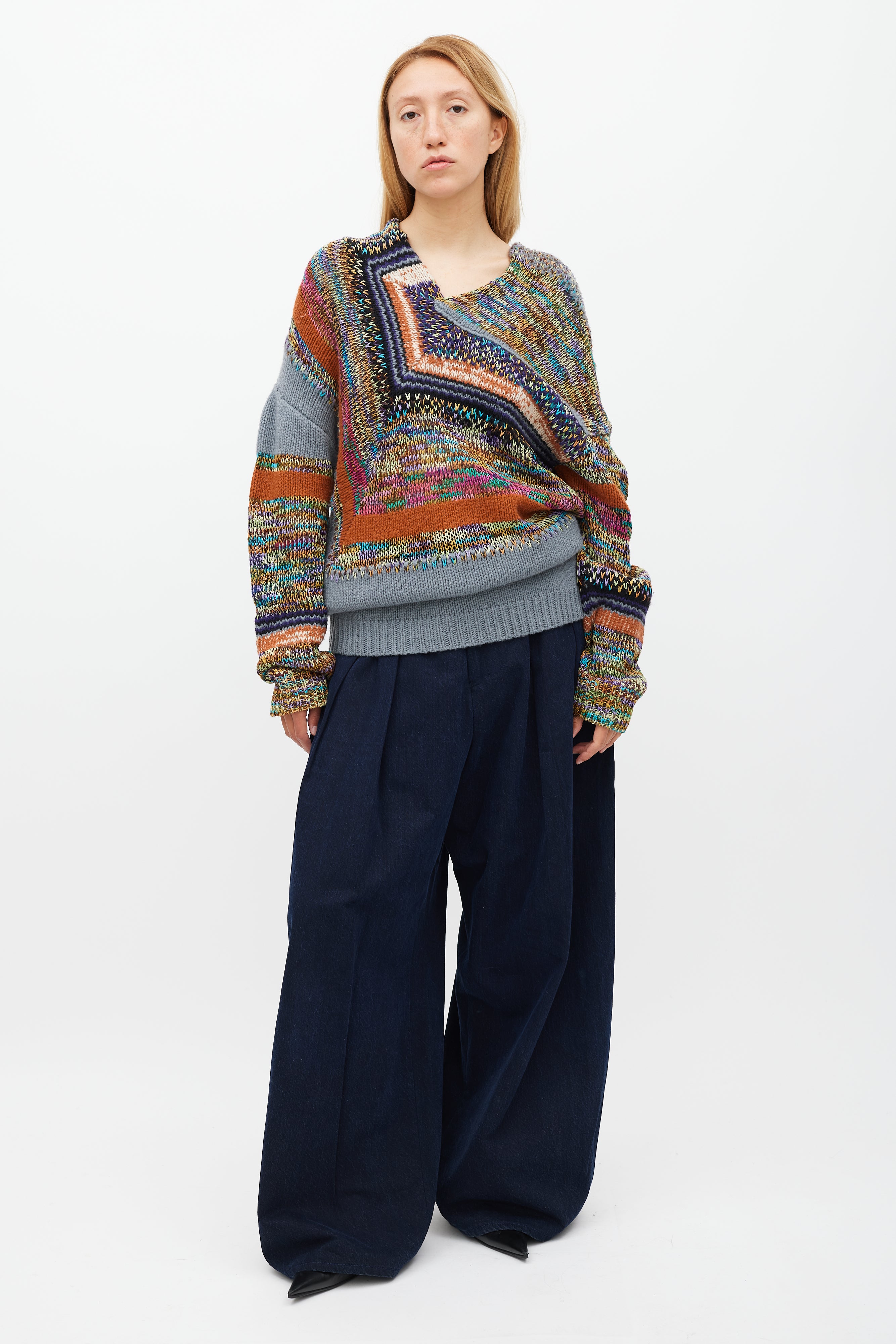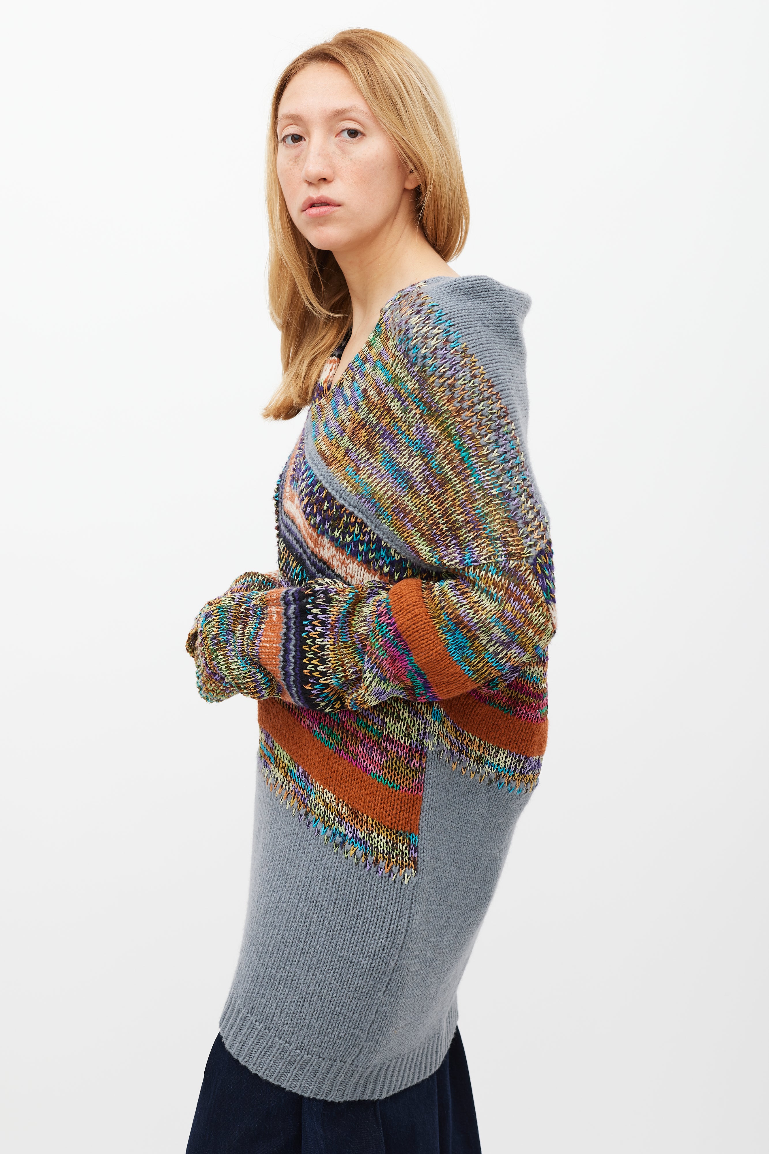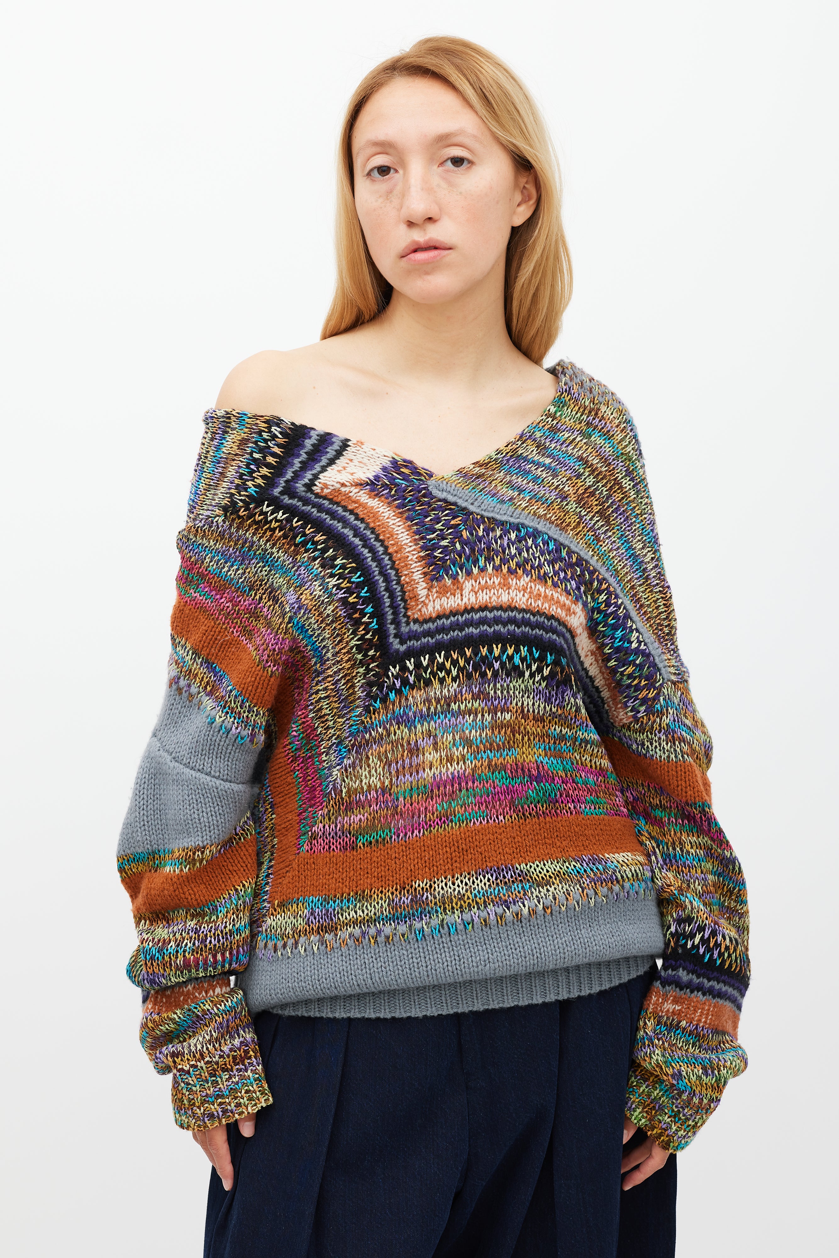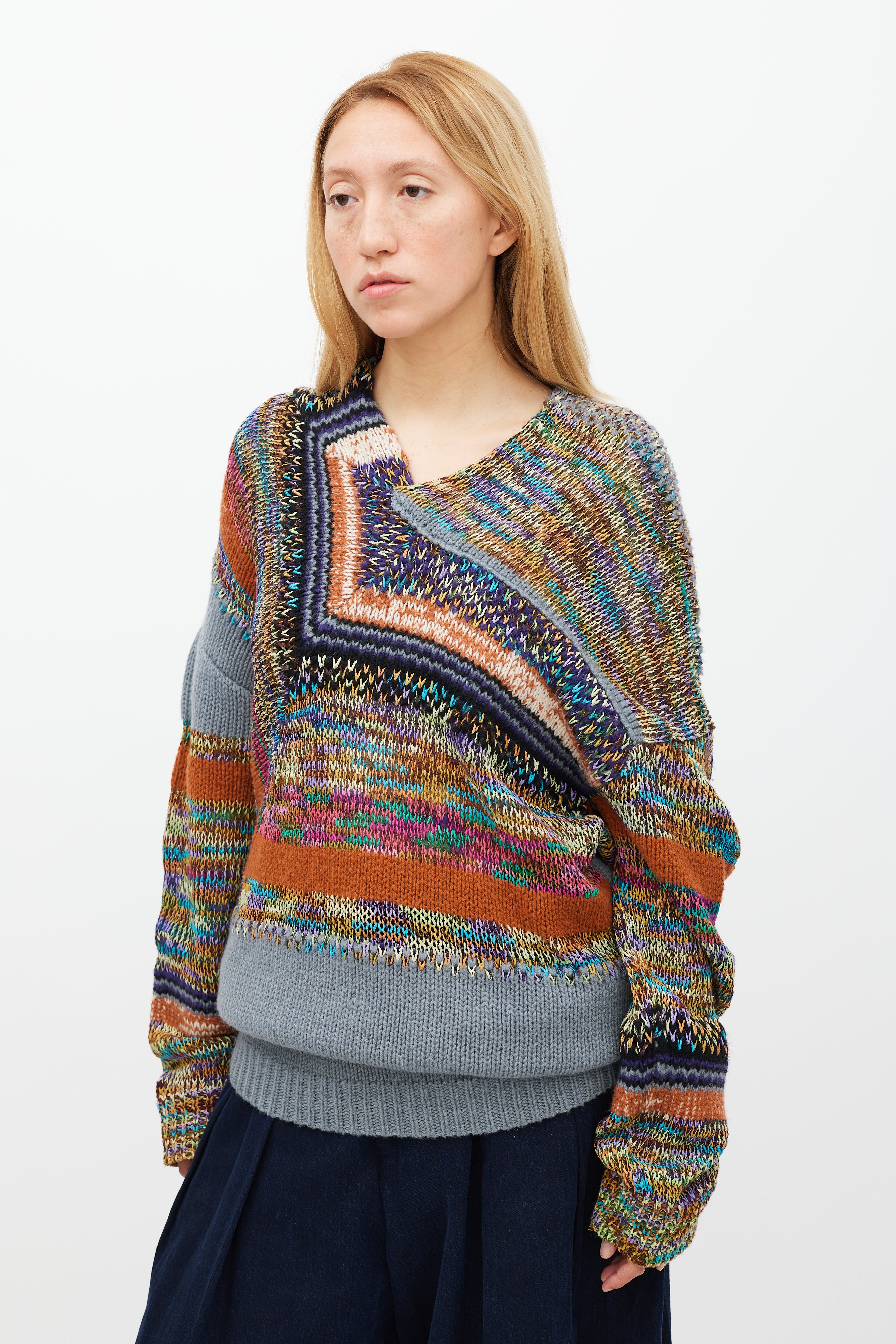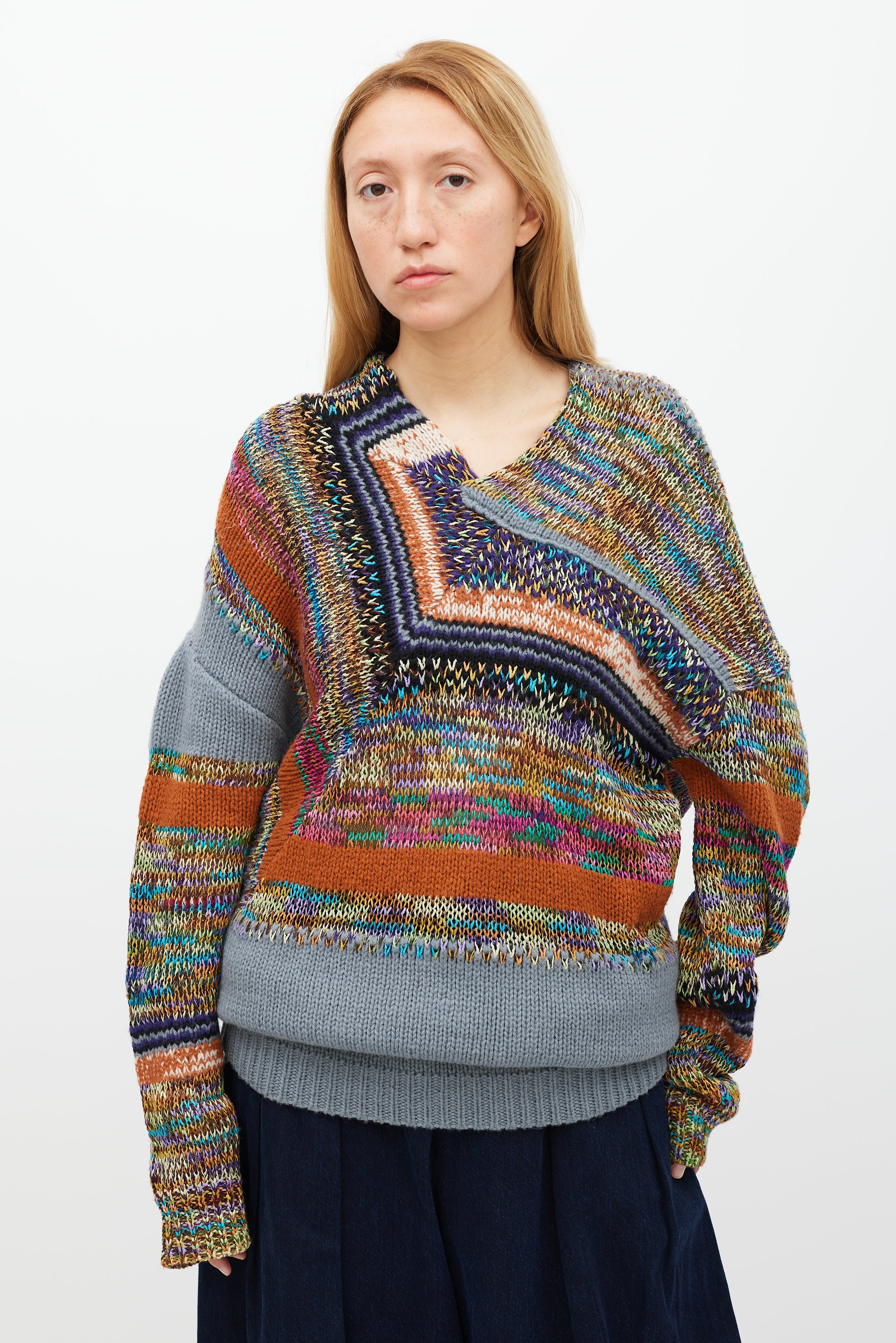 Pre-owned Dries Van Noten grey and multicolour knit sweater featuring a V-neckline, panelled construction, long sleeves, and ribbed hem and cuffs.