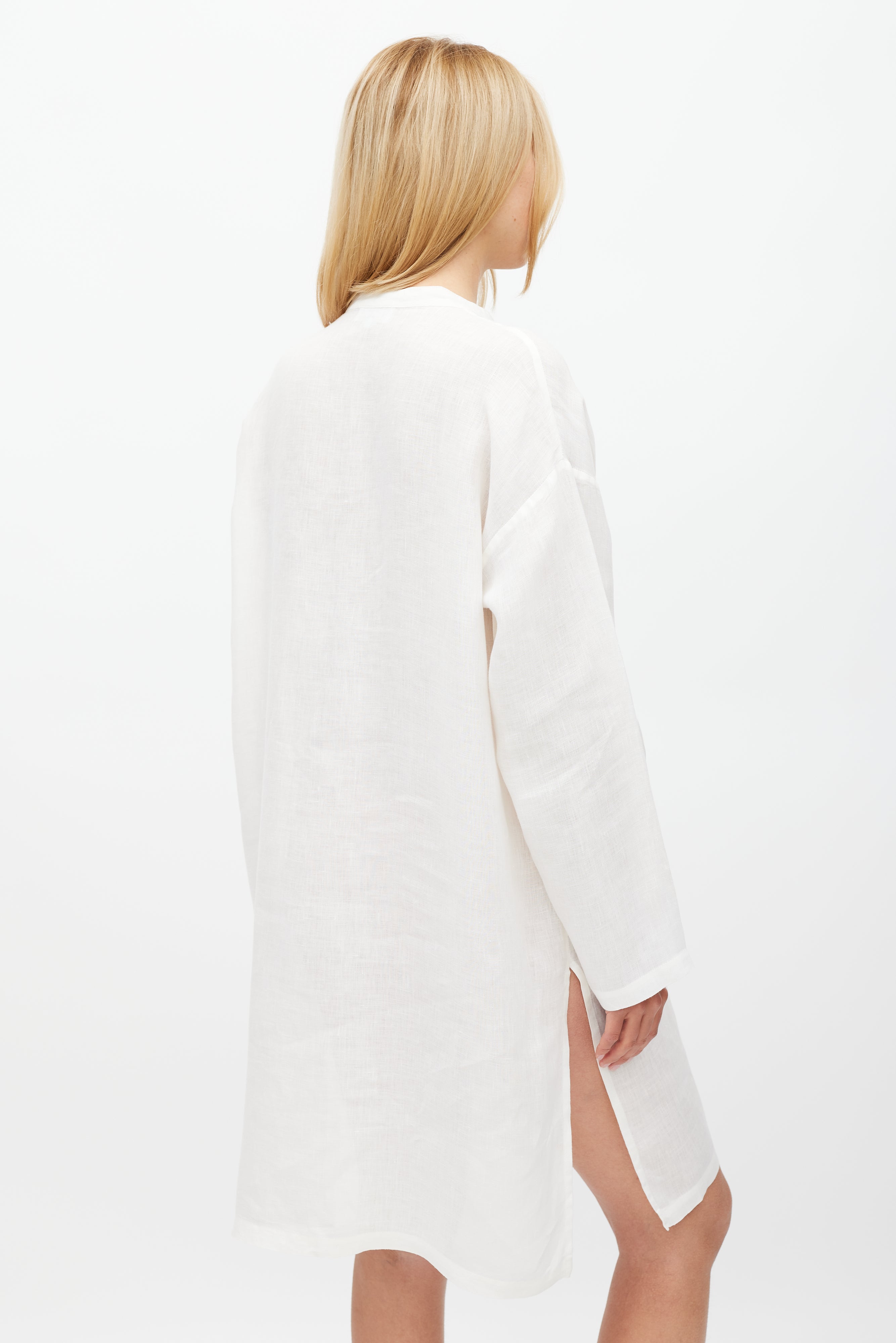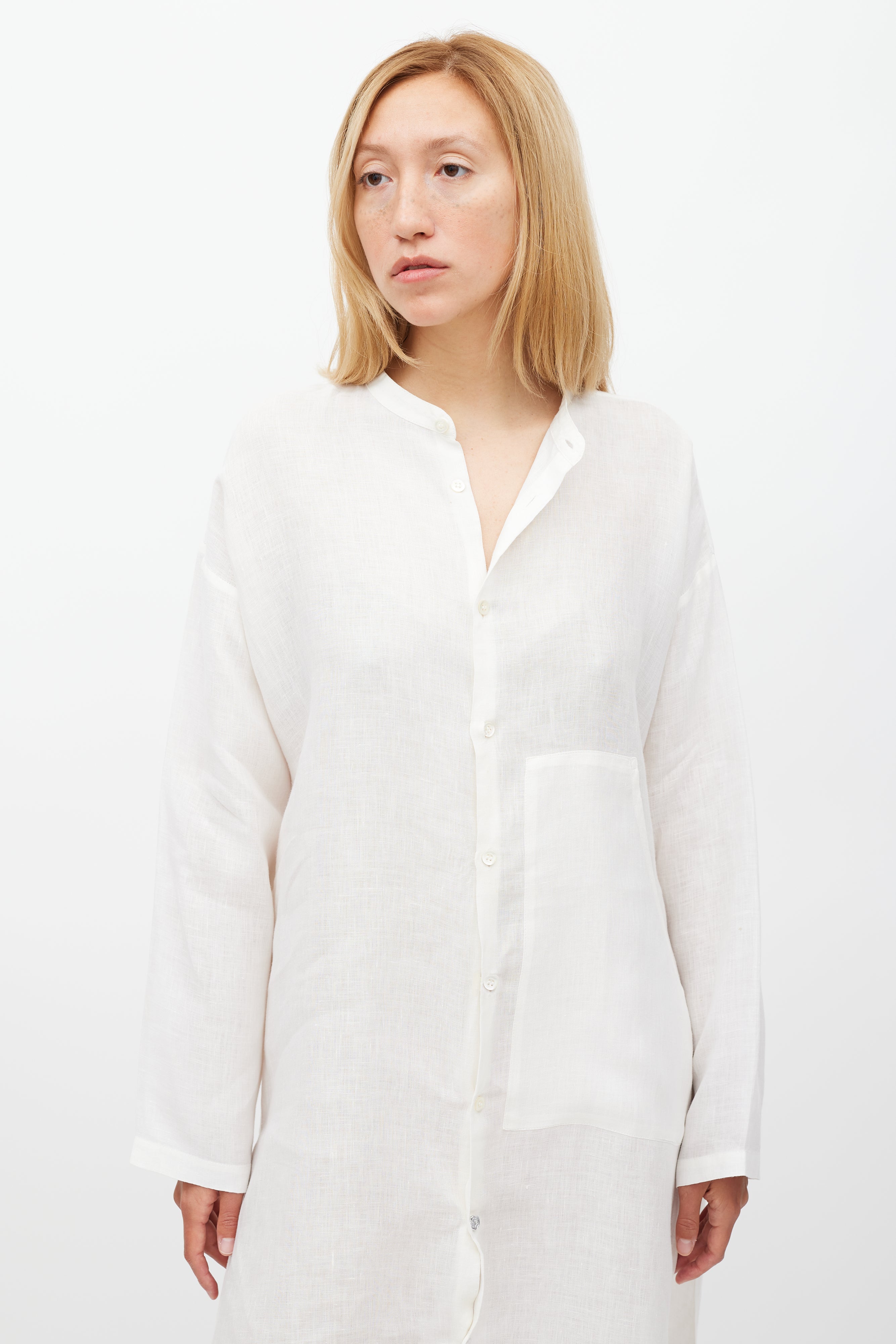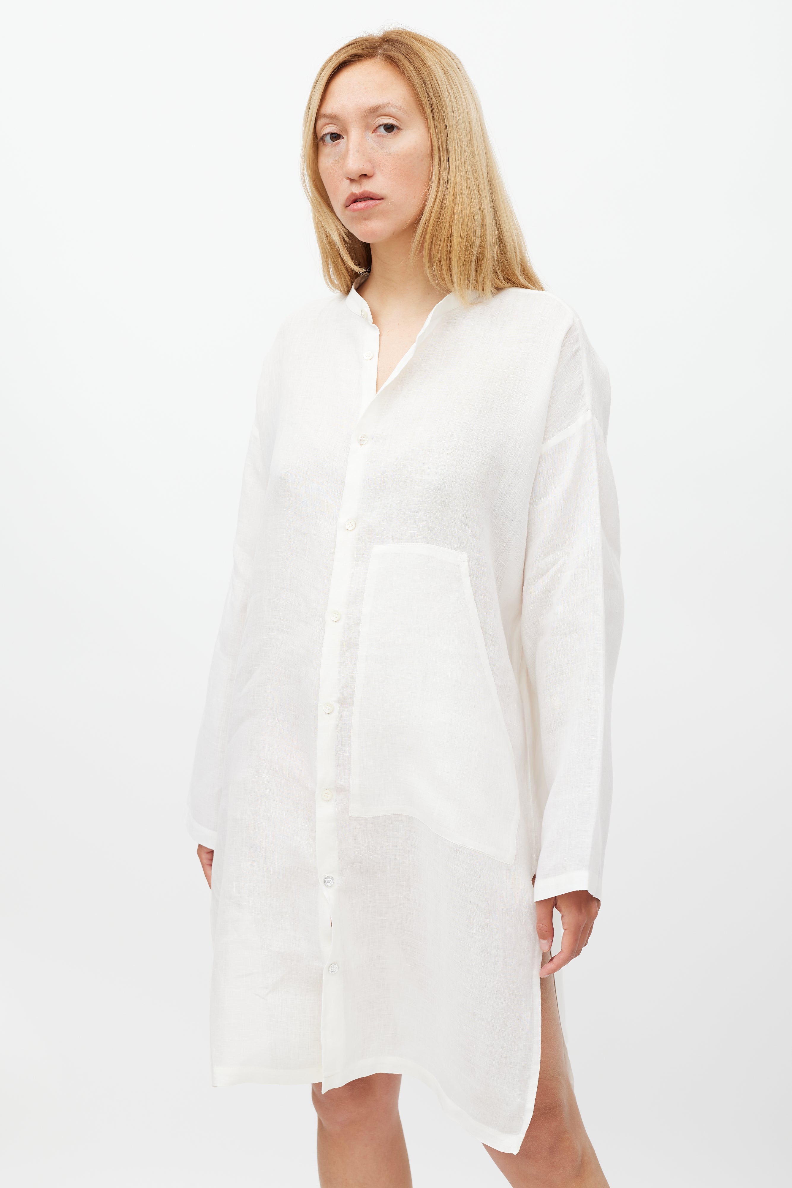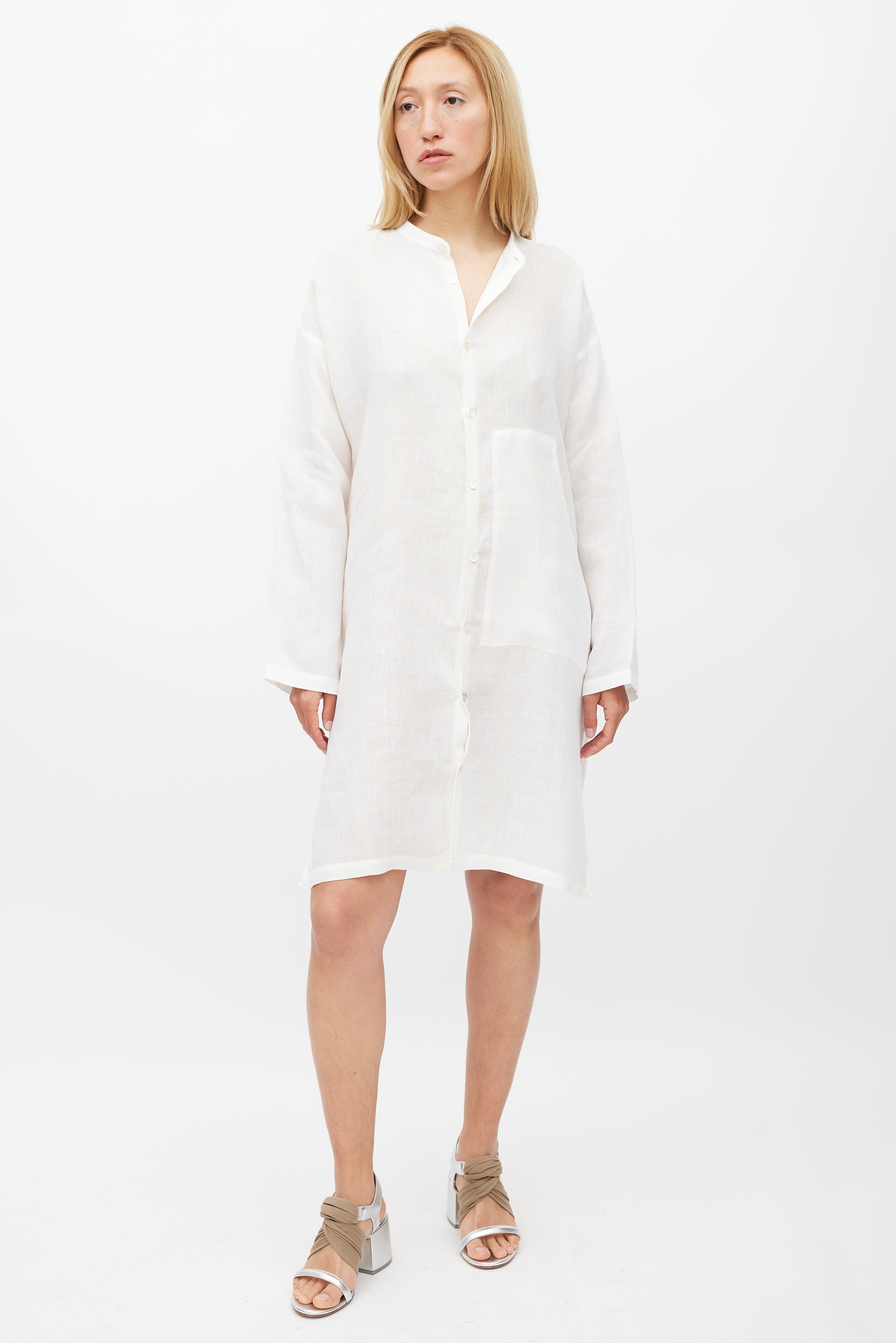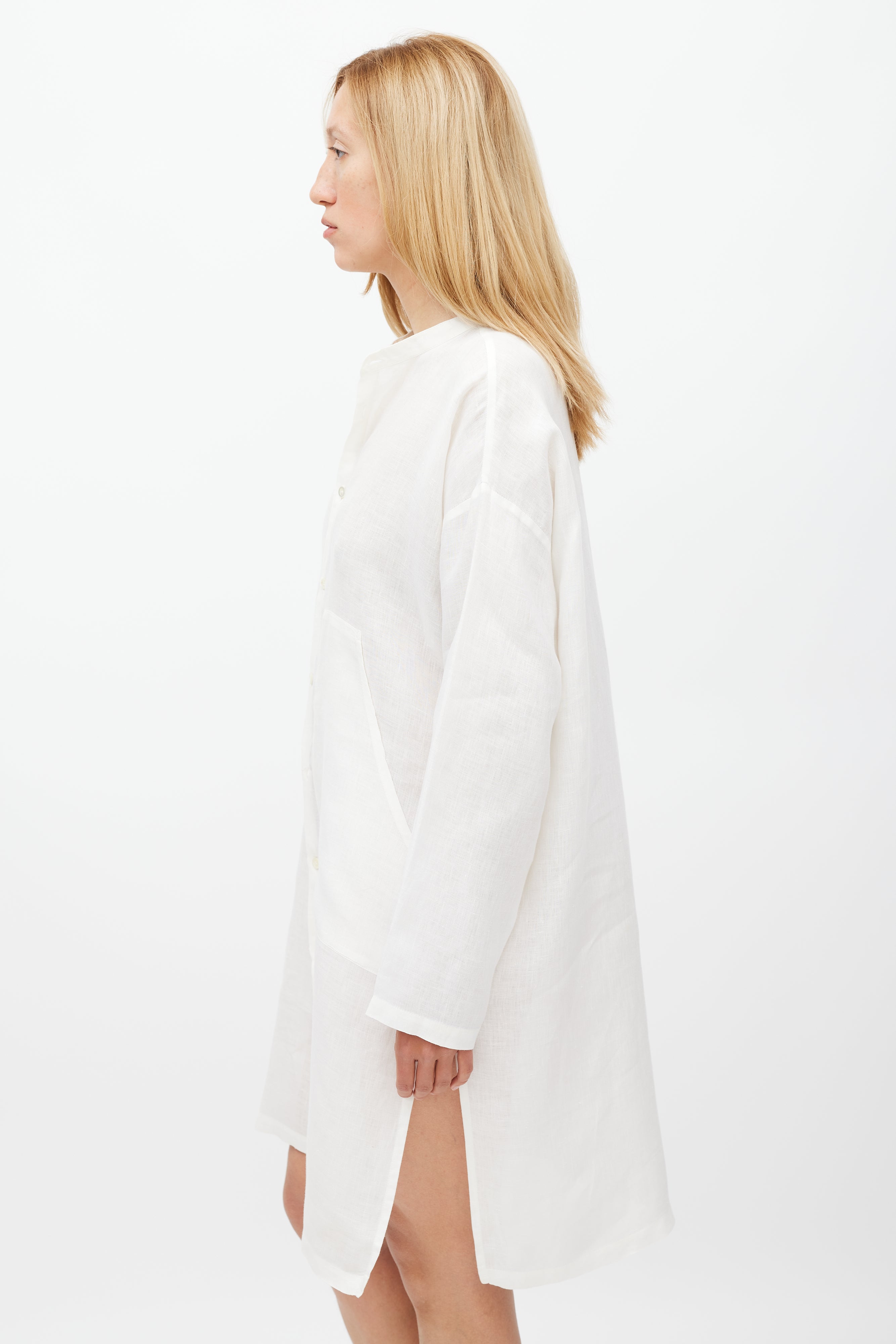 Pre-owned Eskandar white linen shirt dress featuring a round neckline, long sleeves, one patch pocket at front, and button up closure.