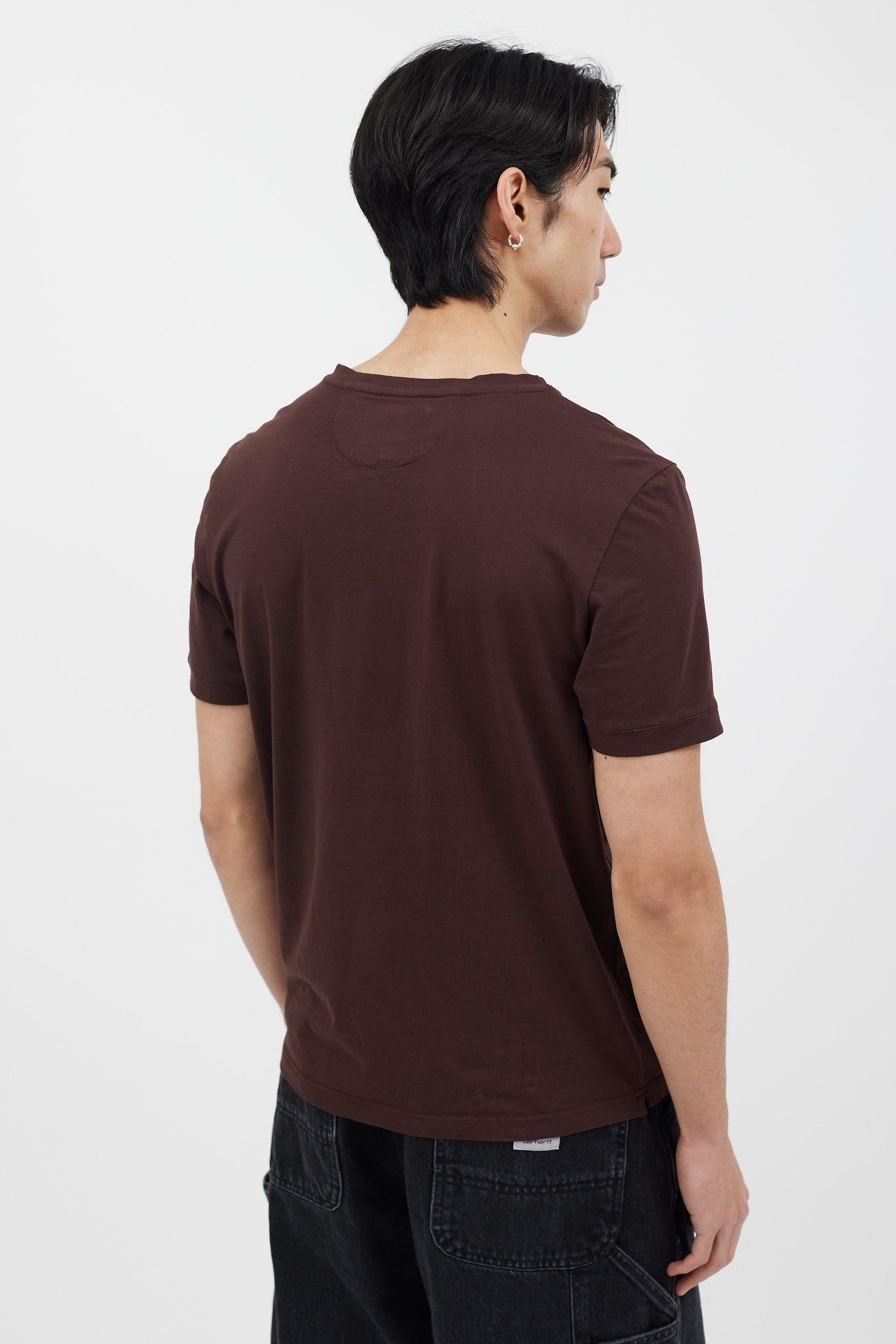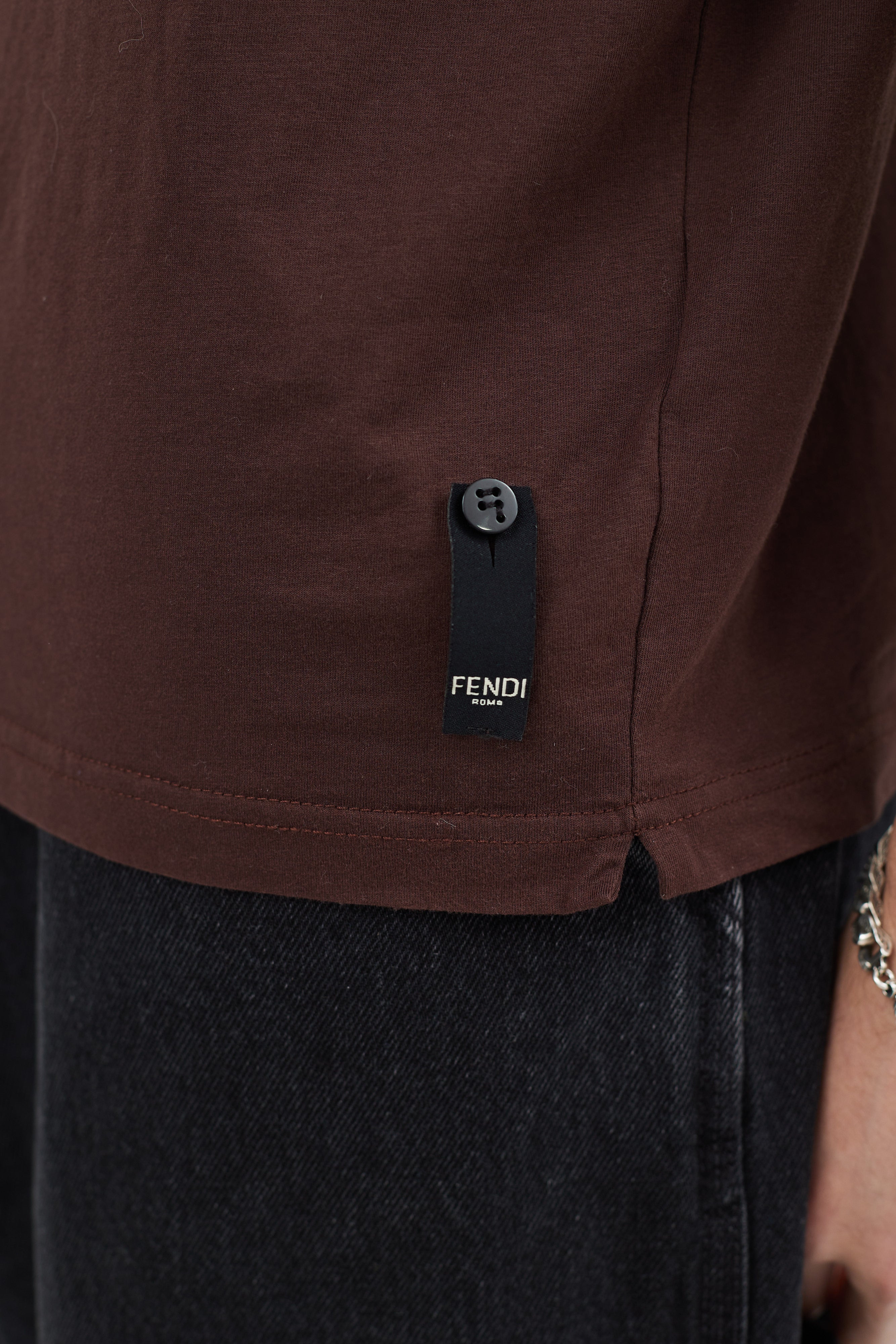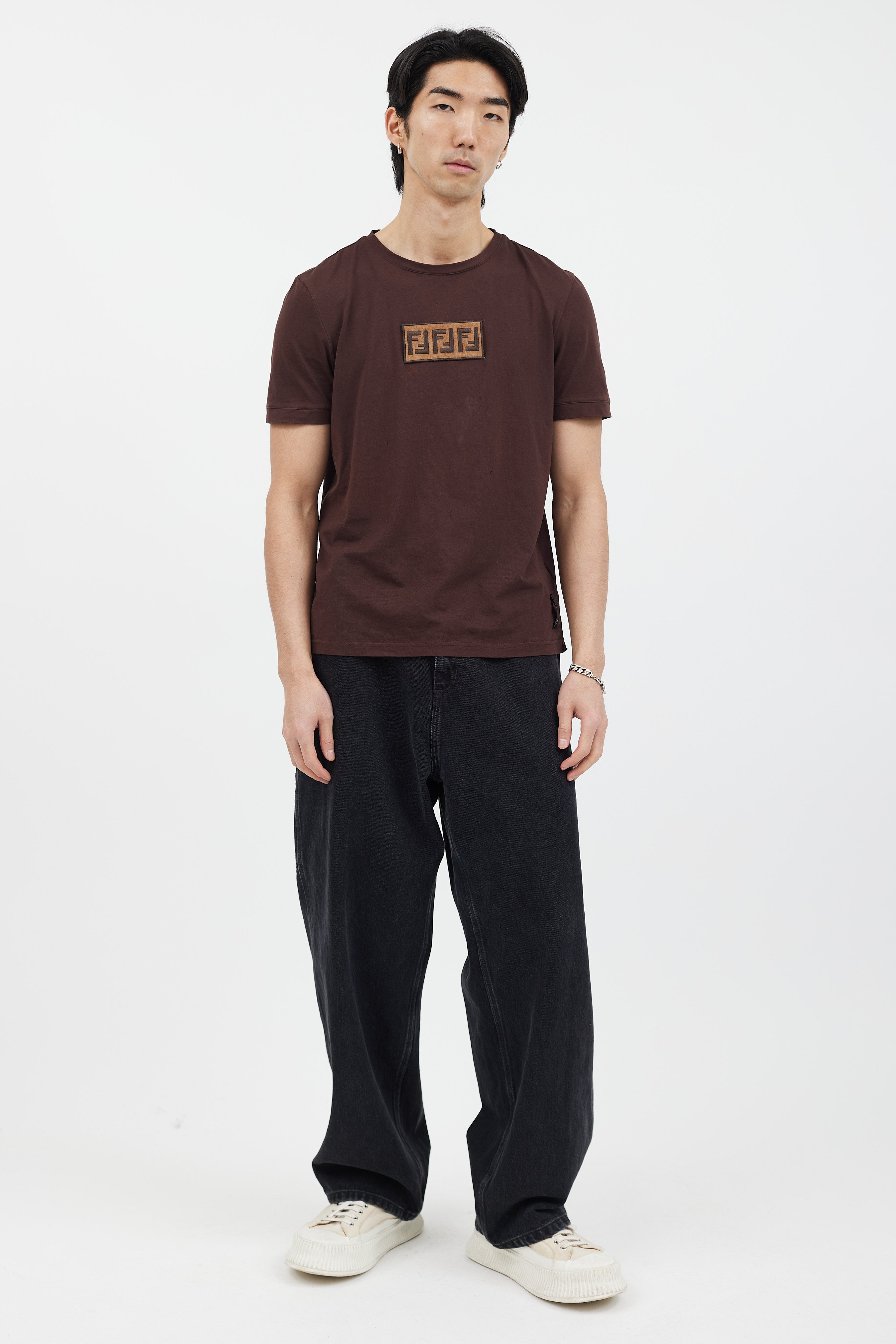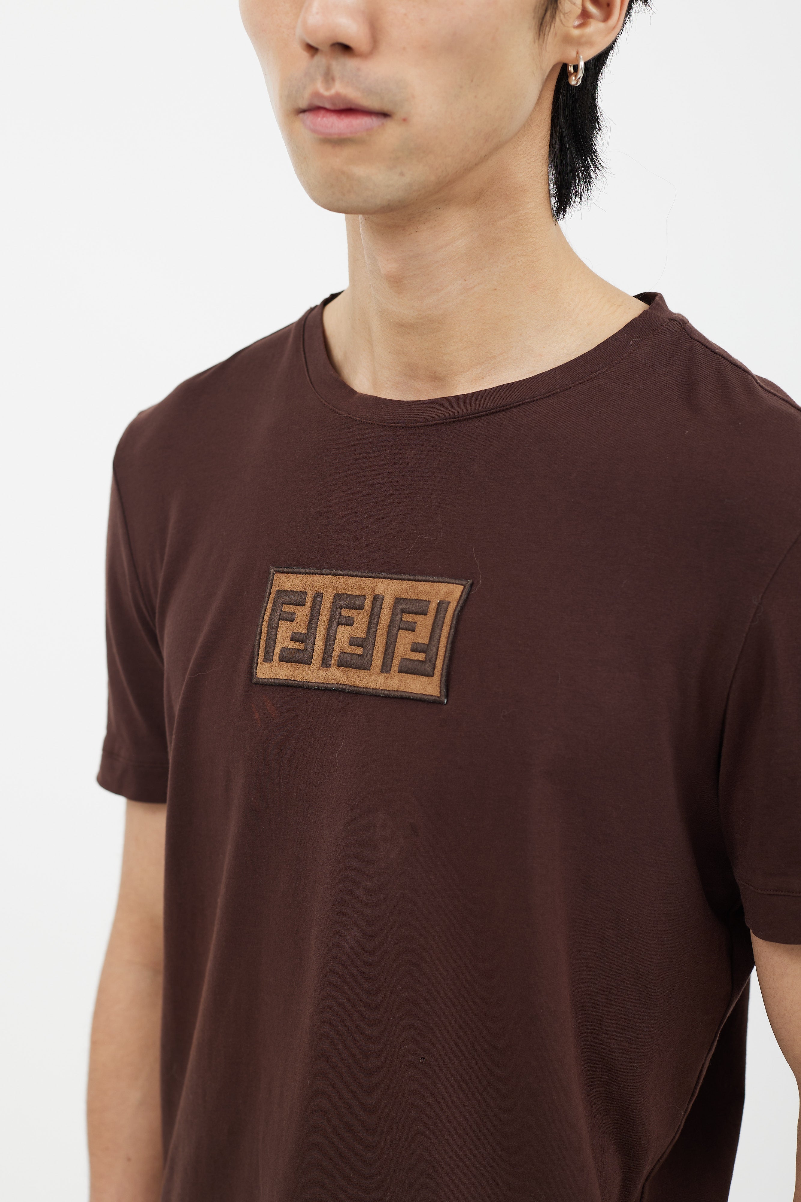 Pre-owned Fendi brown logo t-shirt featuring round collar, embroidered monogram logo at front, and short sleeves.