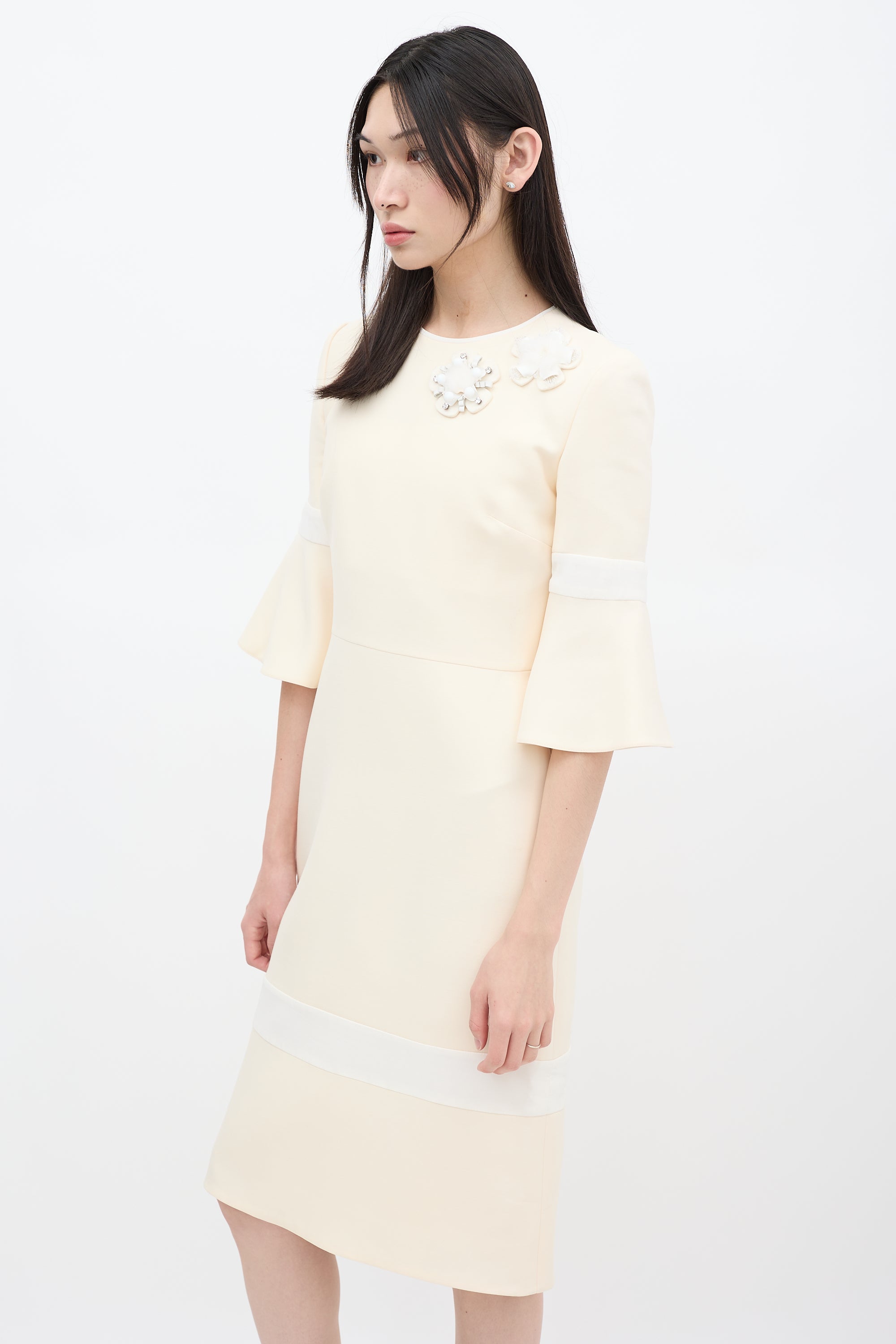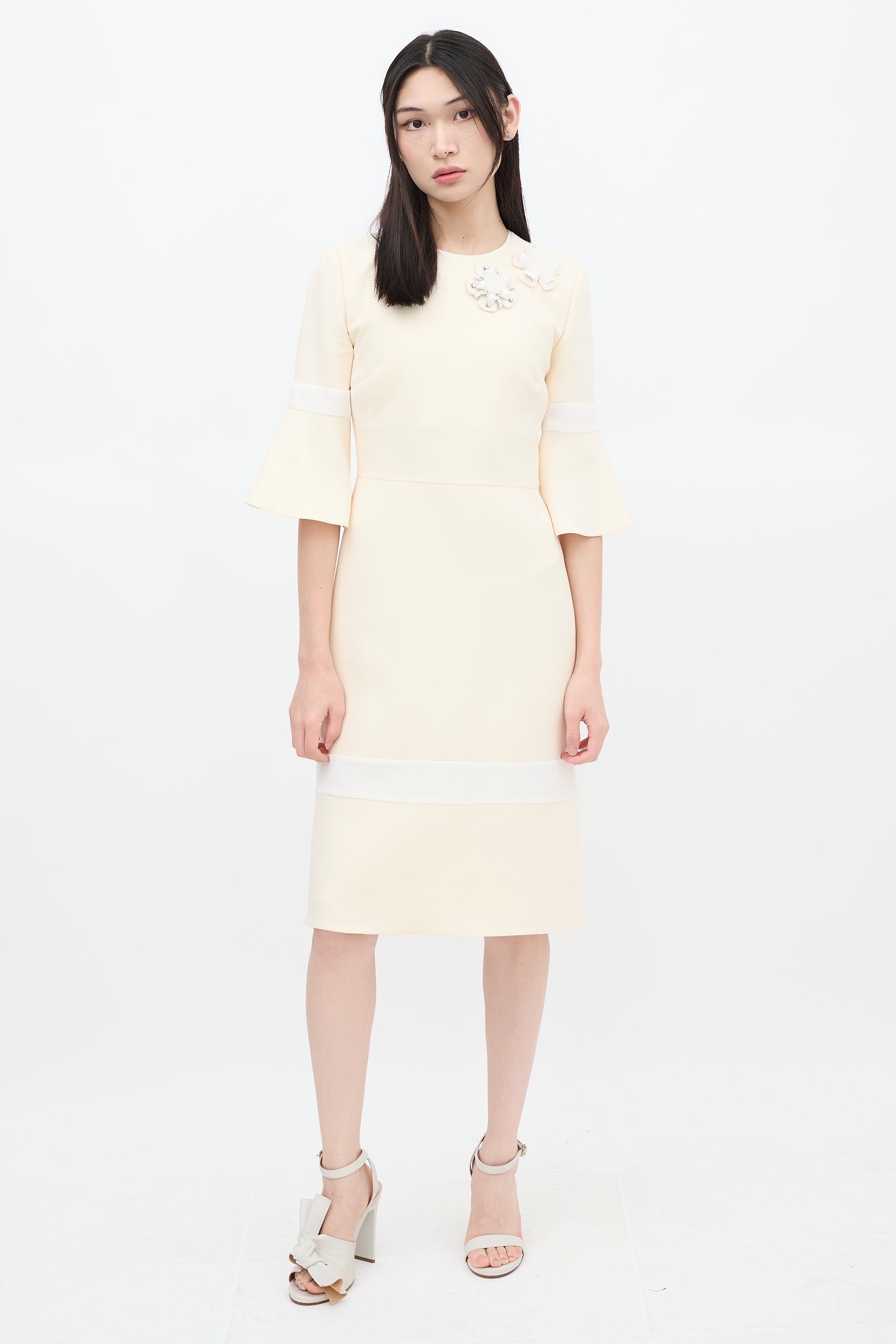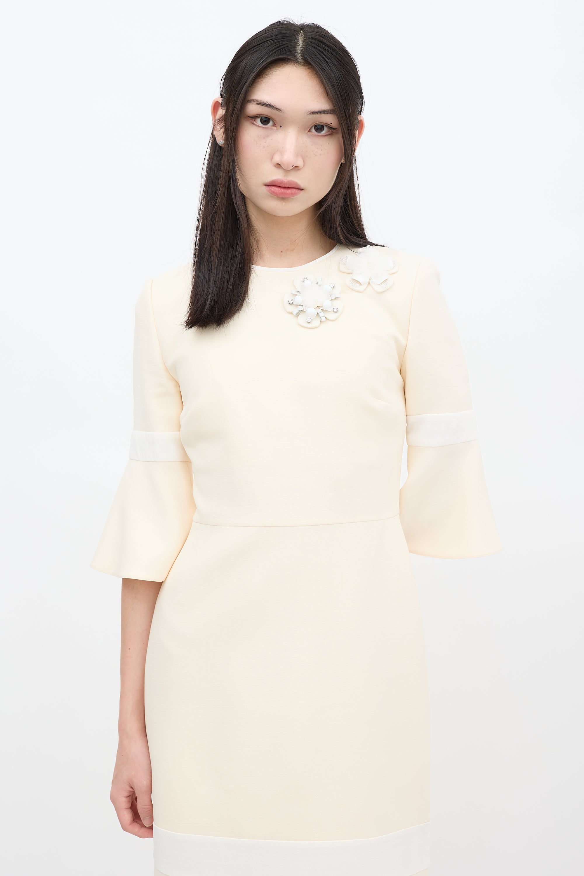 Pre-owned Fendi cream wool dress featuring a round neckline, mink faux crystal floral embellishments at chest, three quarter length flared sleeves, tonal stripe at skirt, and zip at back with hook and eye closure. Lined.