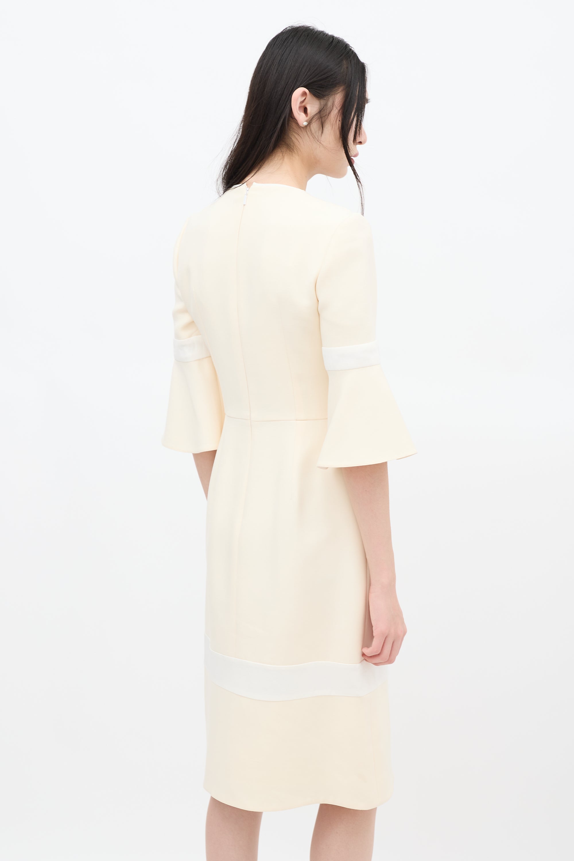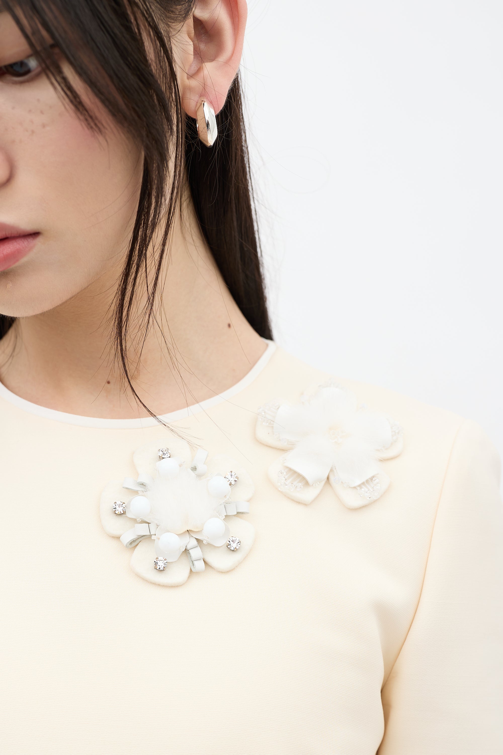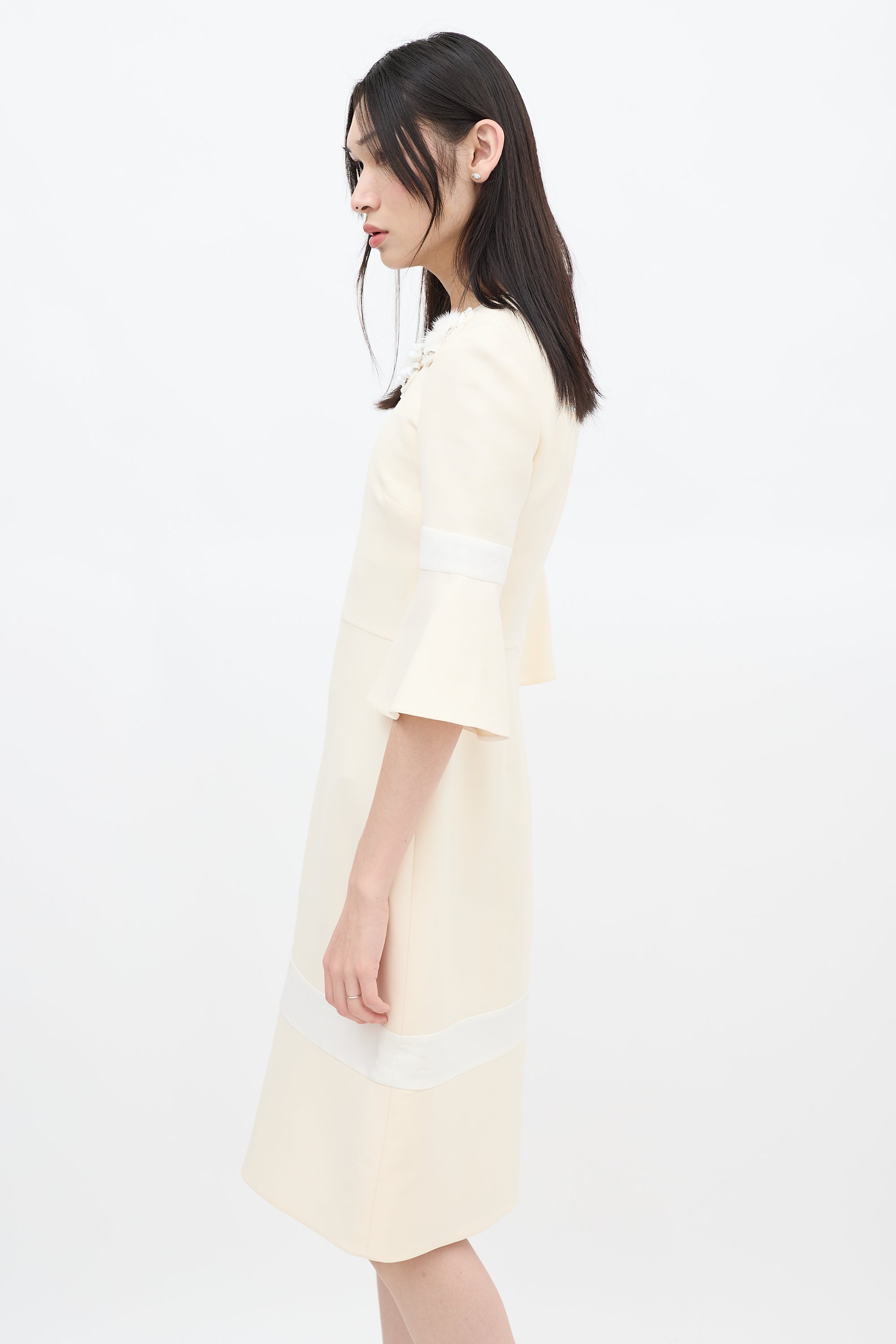 Pre-owned Fendi cream wool dress featuring a round neckline, mink faux crystal floral embellishments at chest, three quarter length flared sleeves, tonal stripe at skirt, and zip at back with hook and eye closure. Lined.