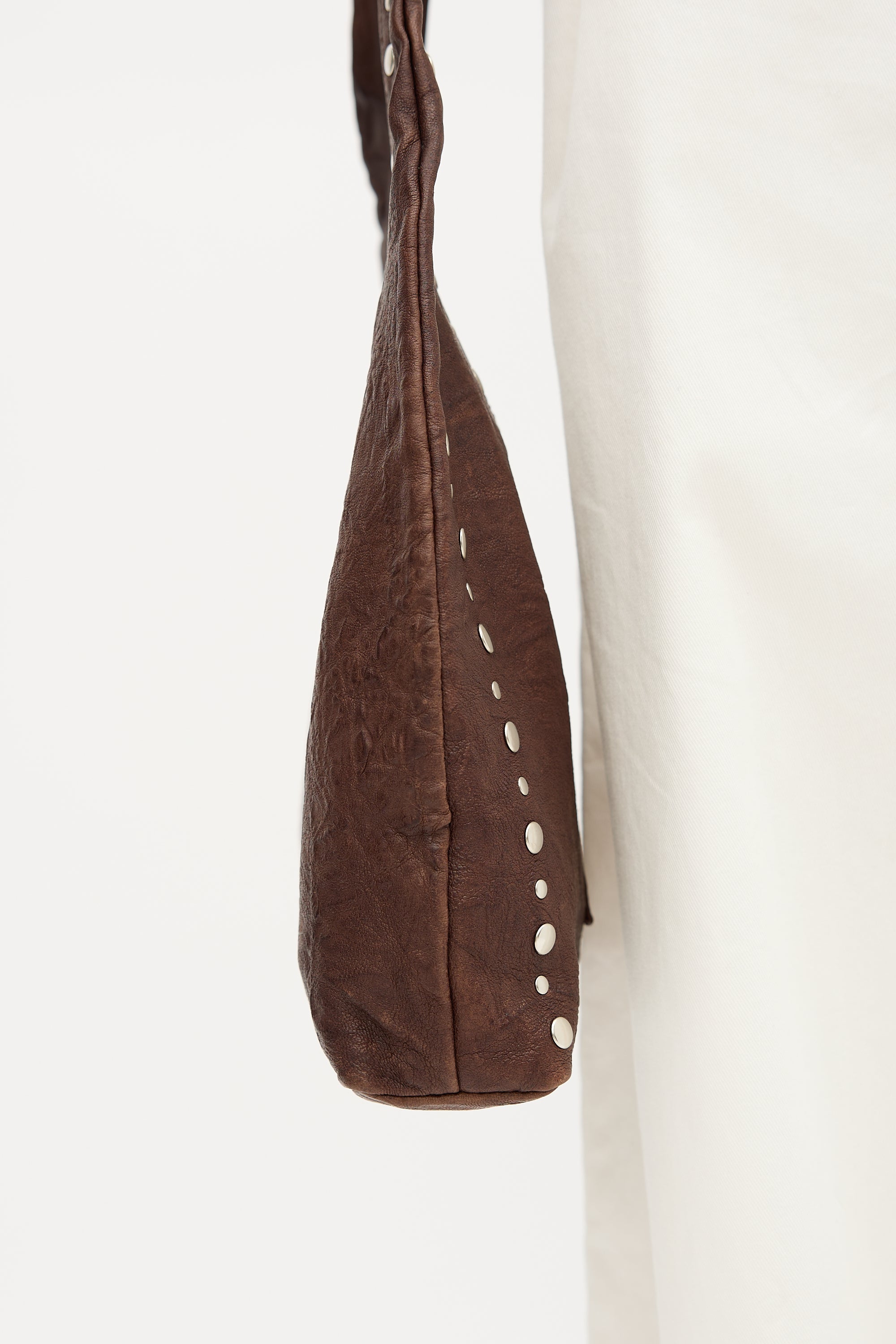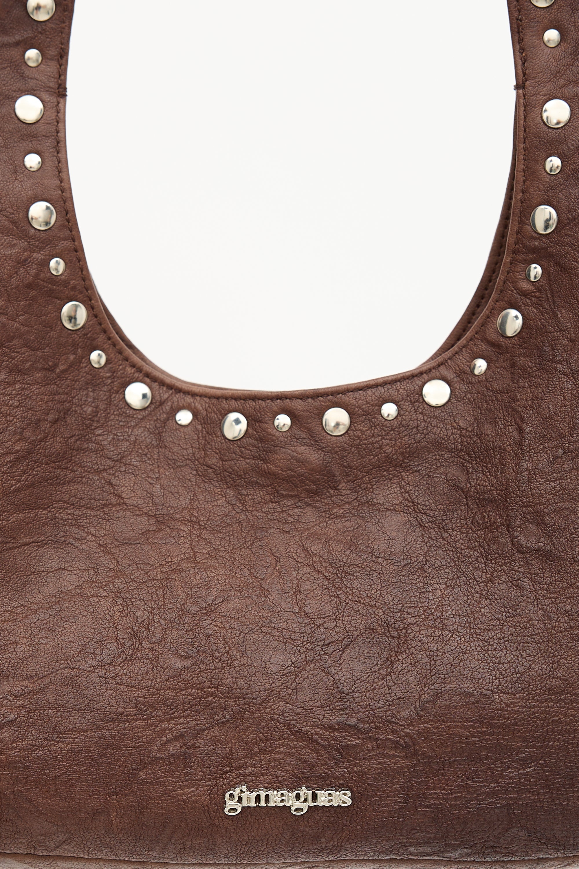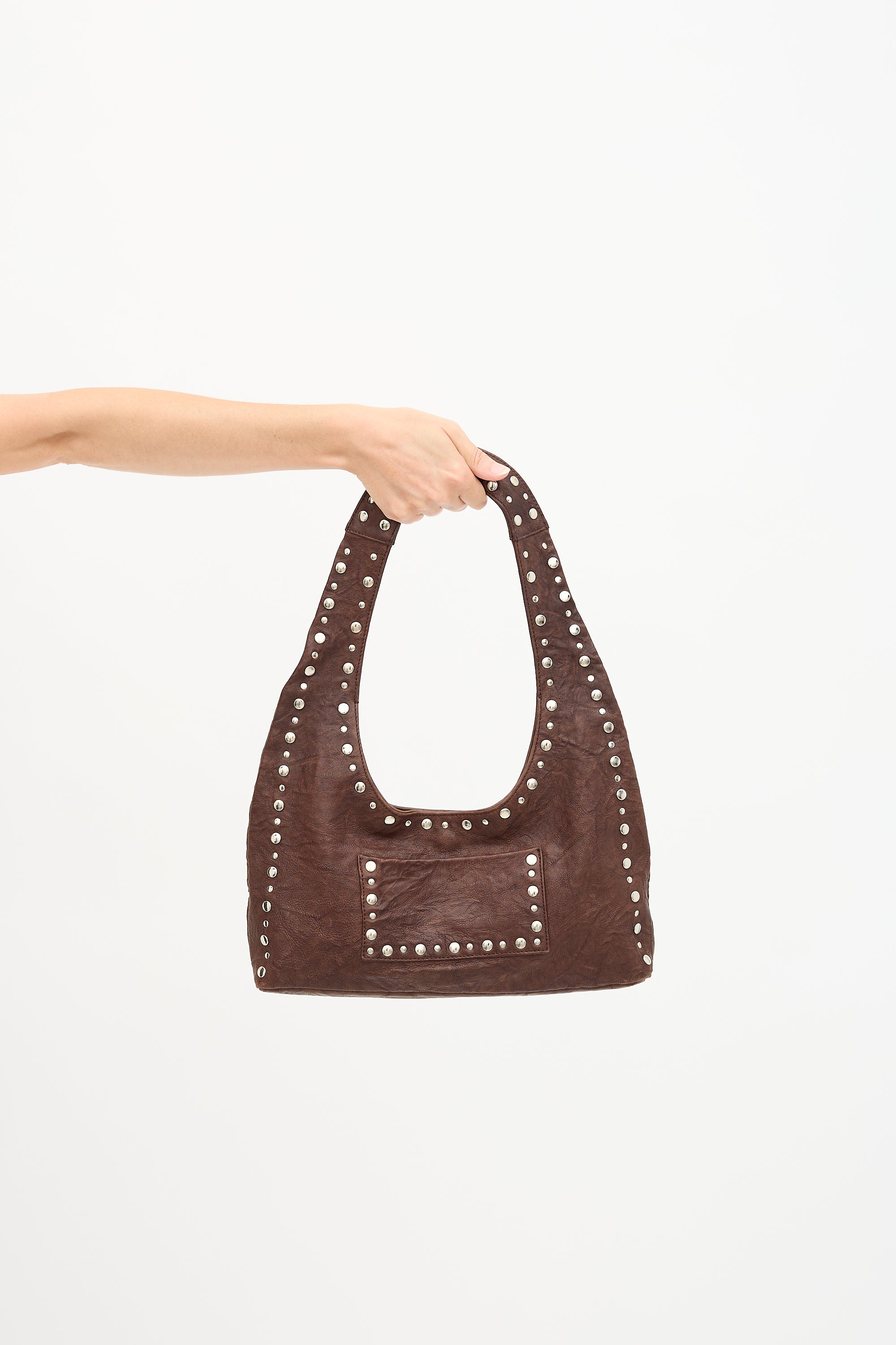 Pre-owned Gimaguas brown leather Franca shoulder bag featuring silver tone hardware, bottom centre front logo embellishment, back patch pocket, single handle, stud trim, magnetic top closure, and one lined main compartment with one slip pocket. Comes with original dust bag.