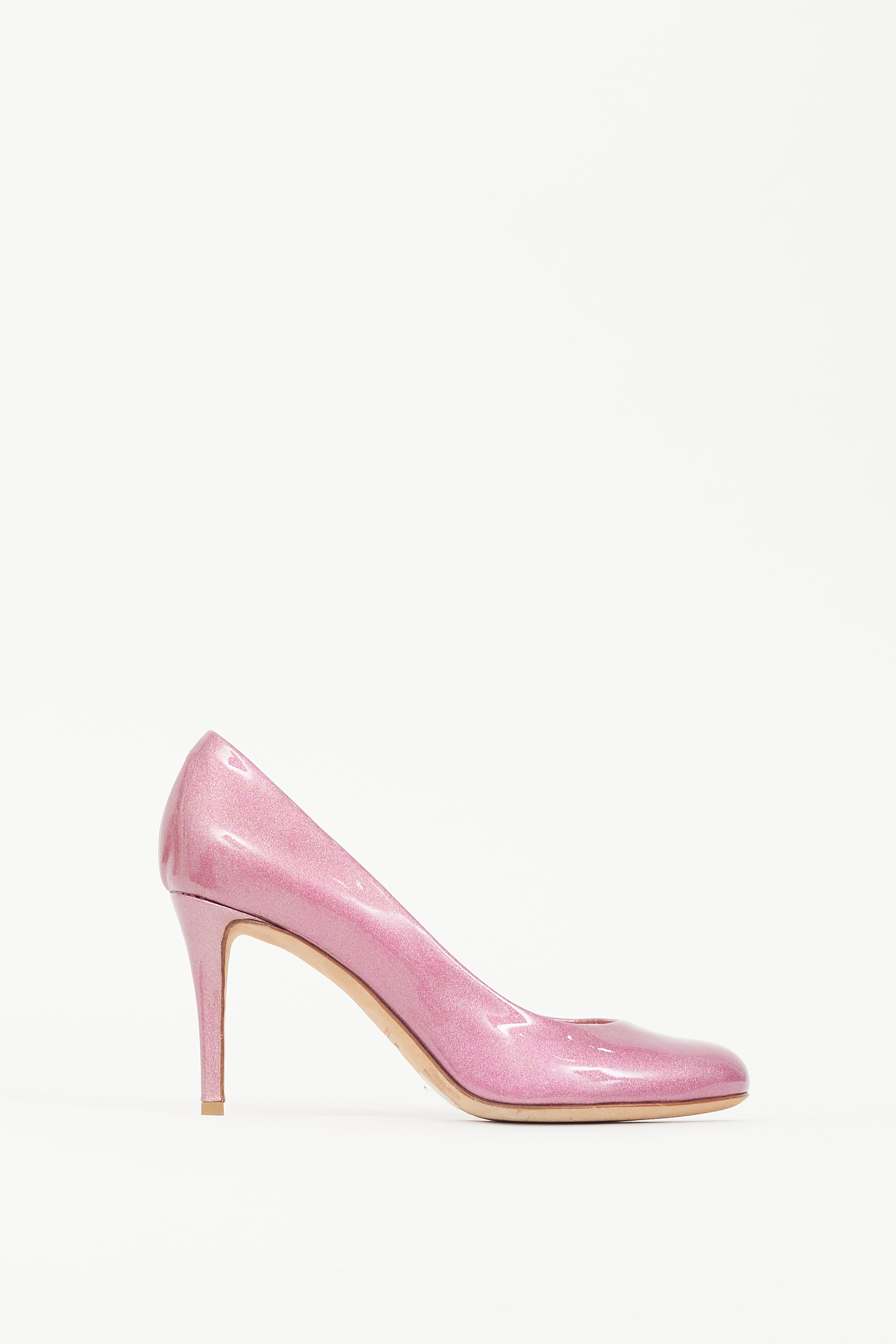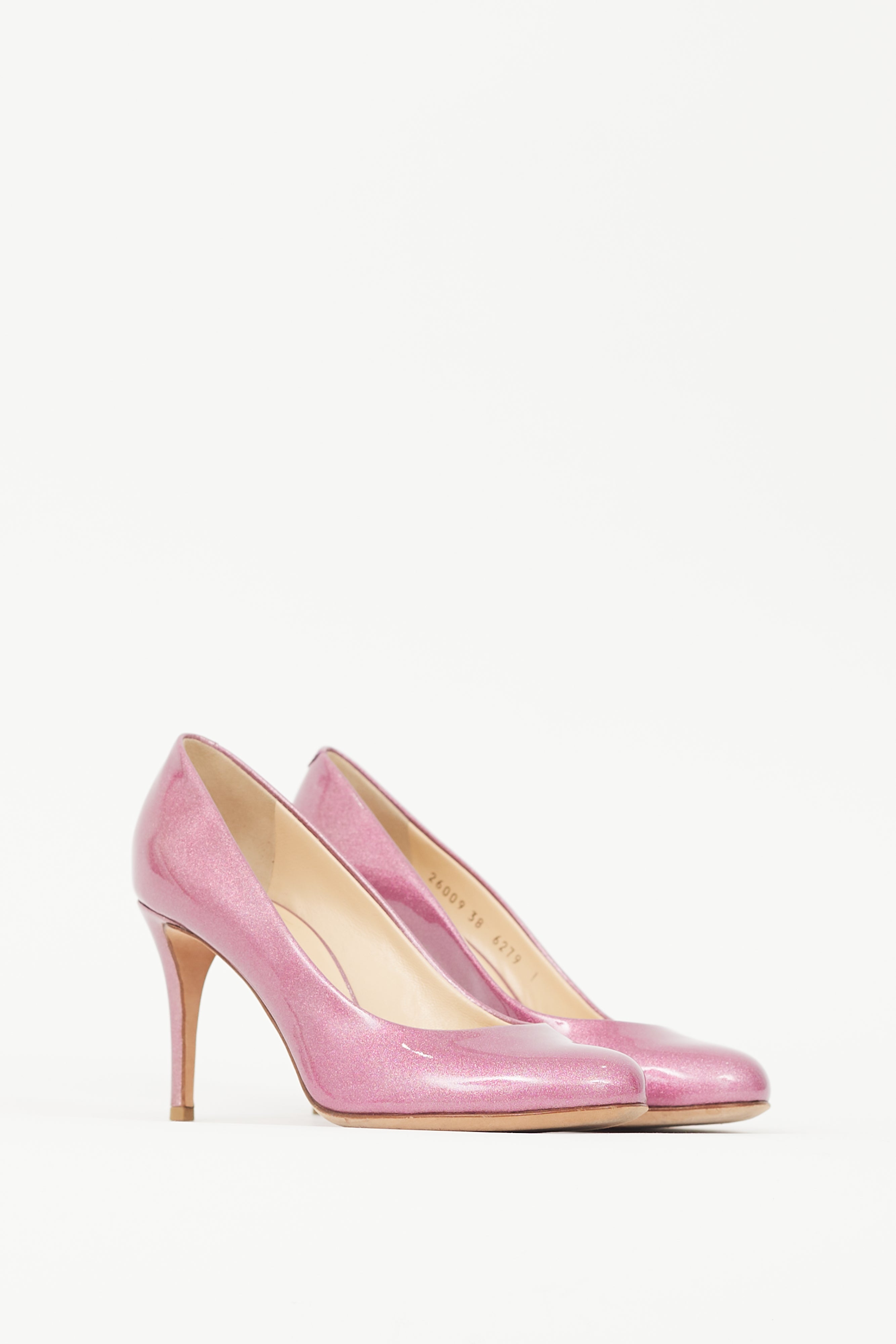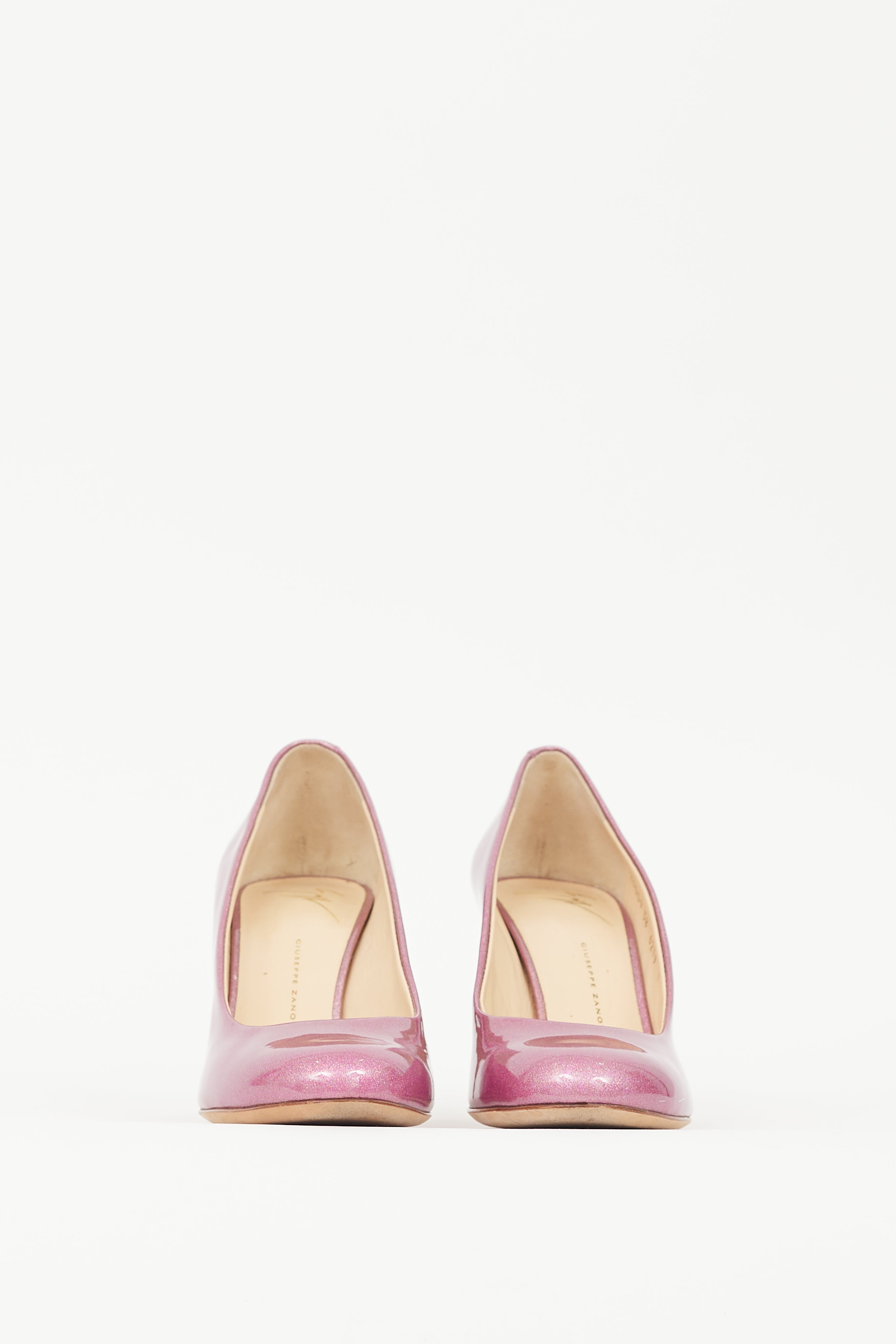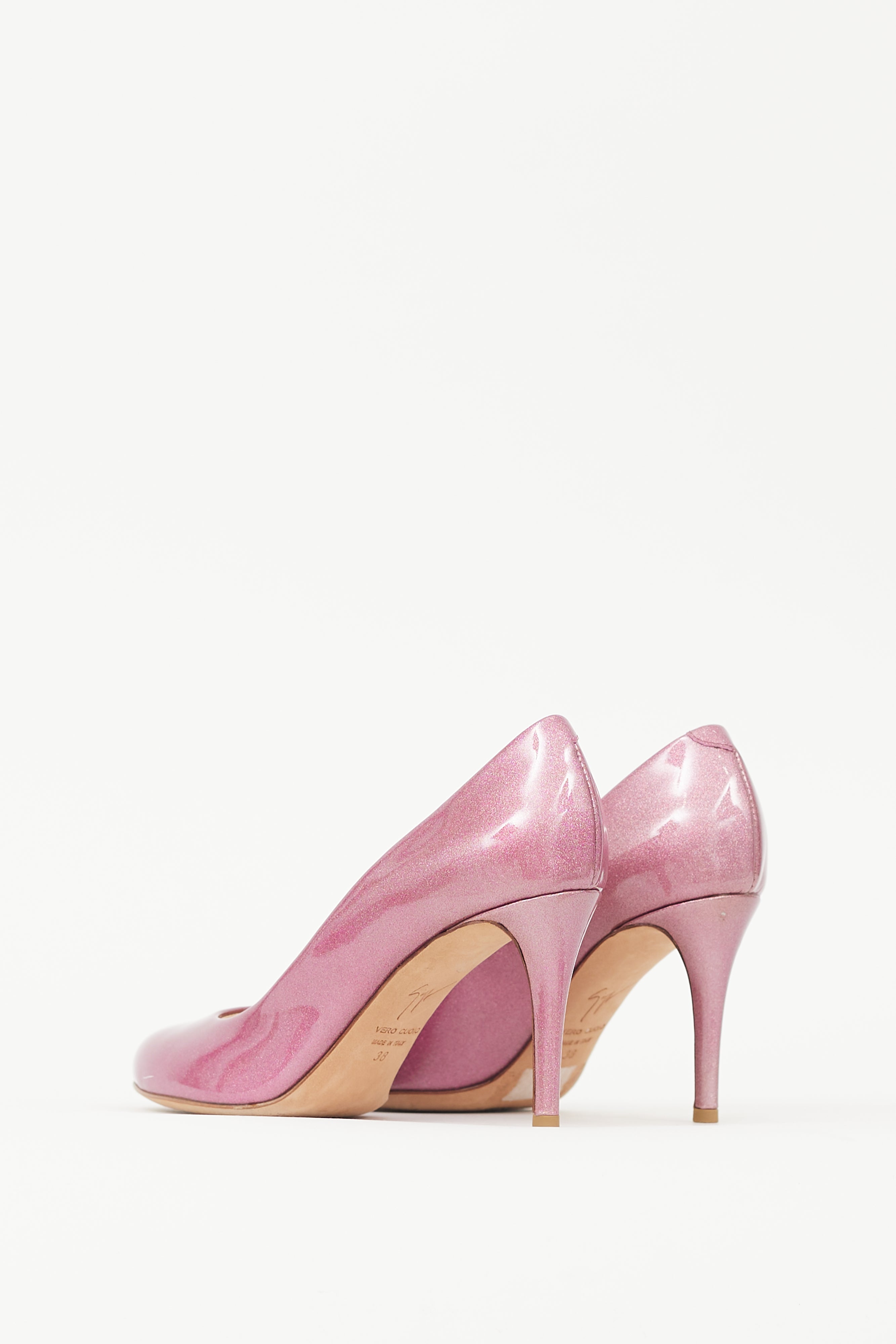 Pre-owned Giuseppe Zanotti pink patent leather glitter heels featuring a round toe, wrapped stiletto heel, and slip on entry.