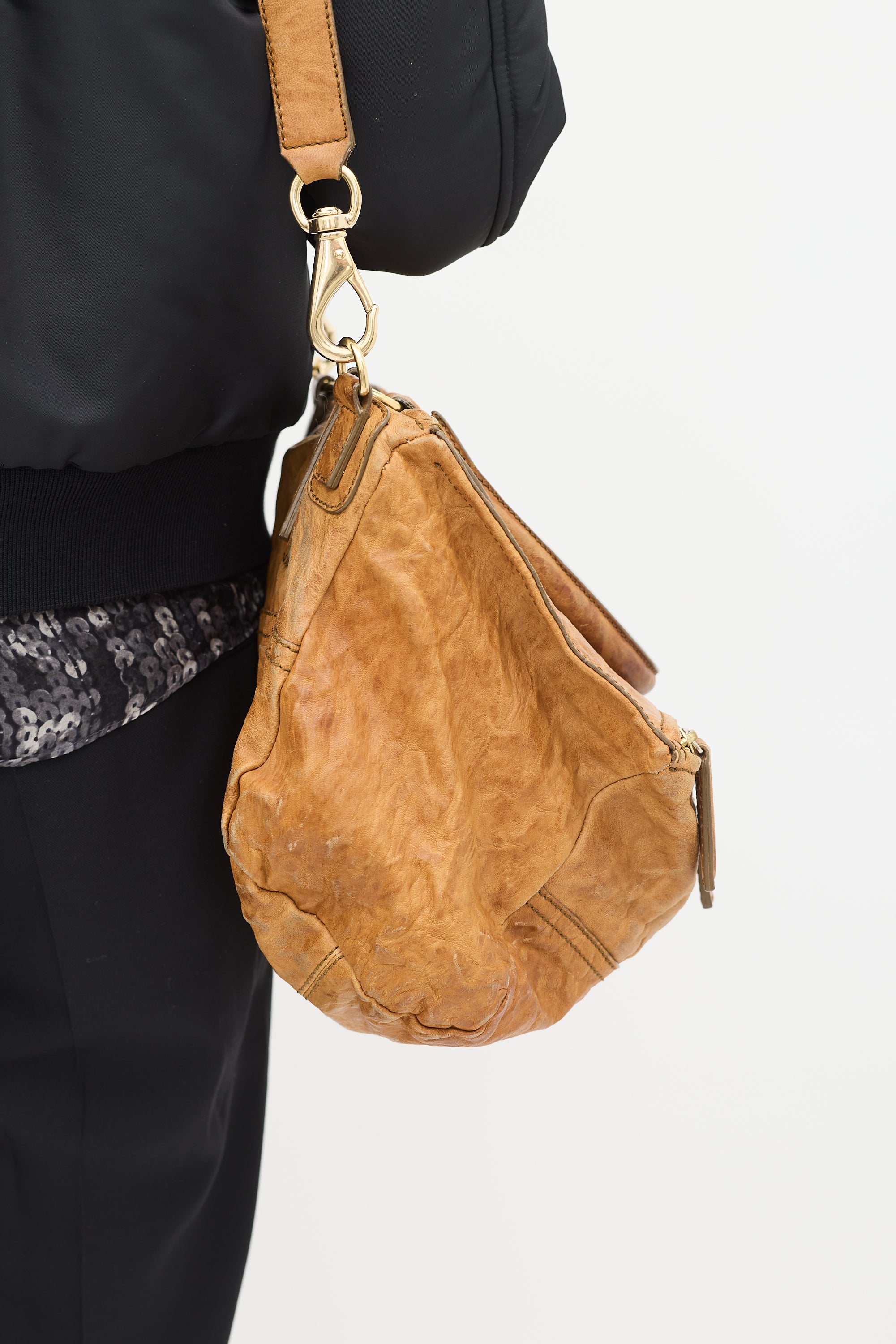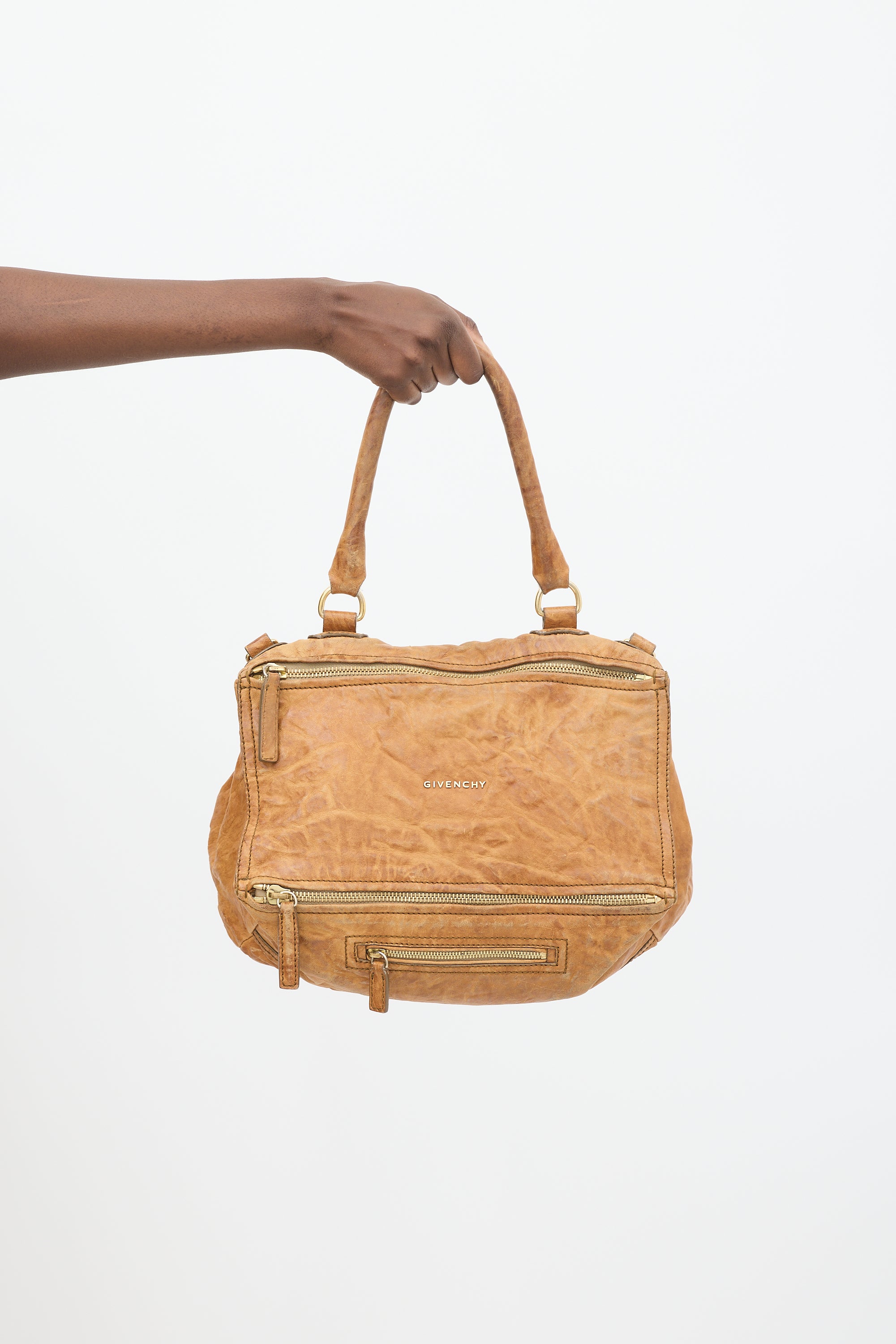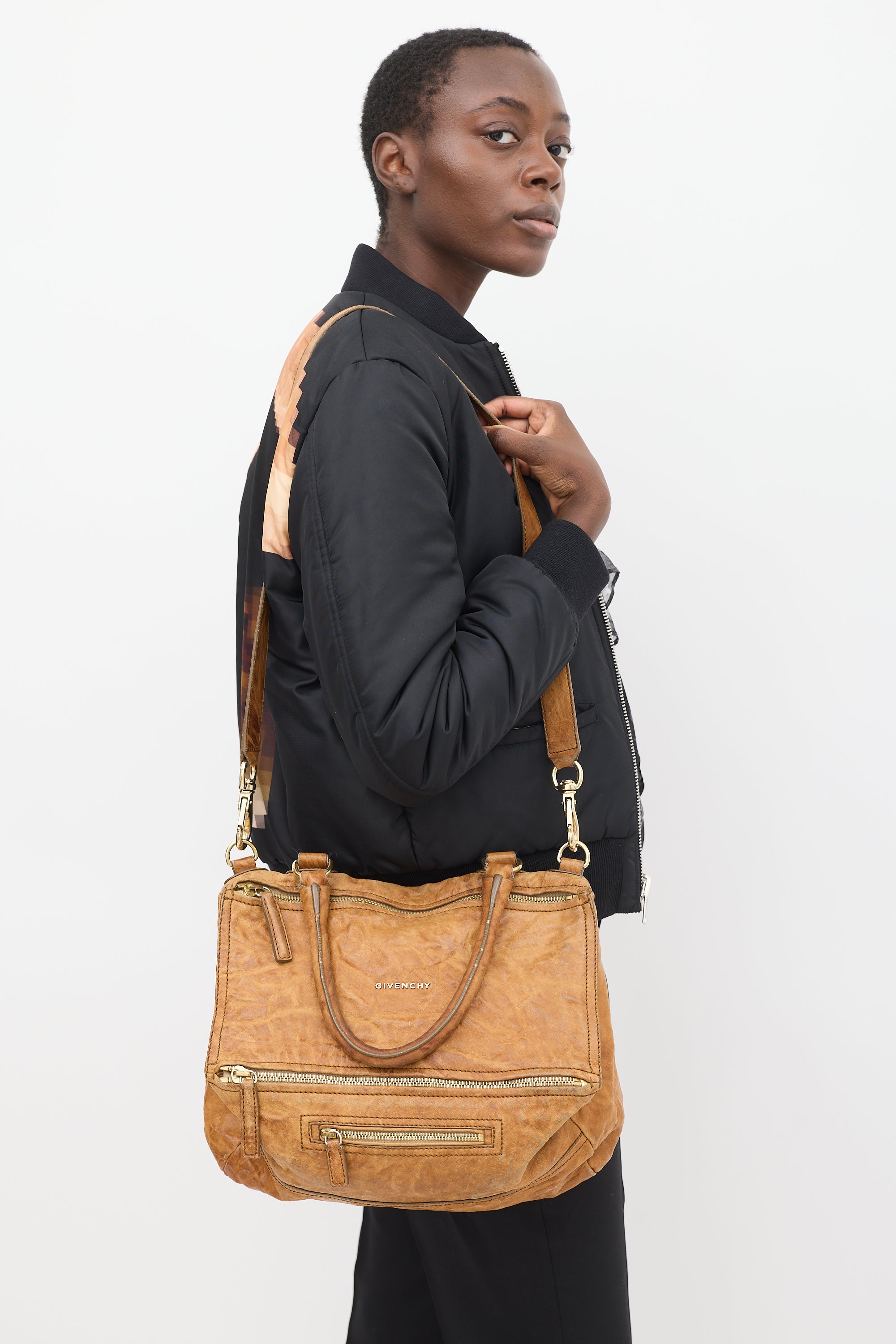Pre-owned Givenchy brown crinkled leather Pandora crossbody bag featuring tonal stitching, gold tone hardware, front logo hardware, one flap pocket and one exterior zip compartment at bottom front, single rolled top handle, detachable shoulder strap, top zip closure, and one lined main compartment with one zip pocket and two slip pockets. Comes with original dust bag.