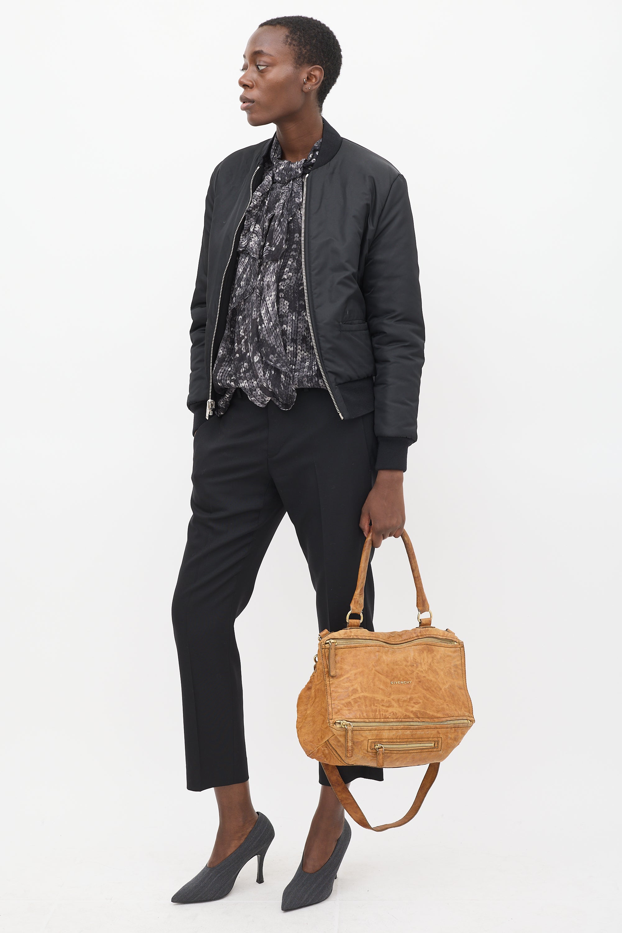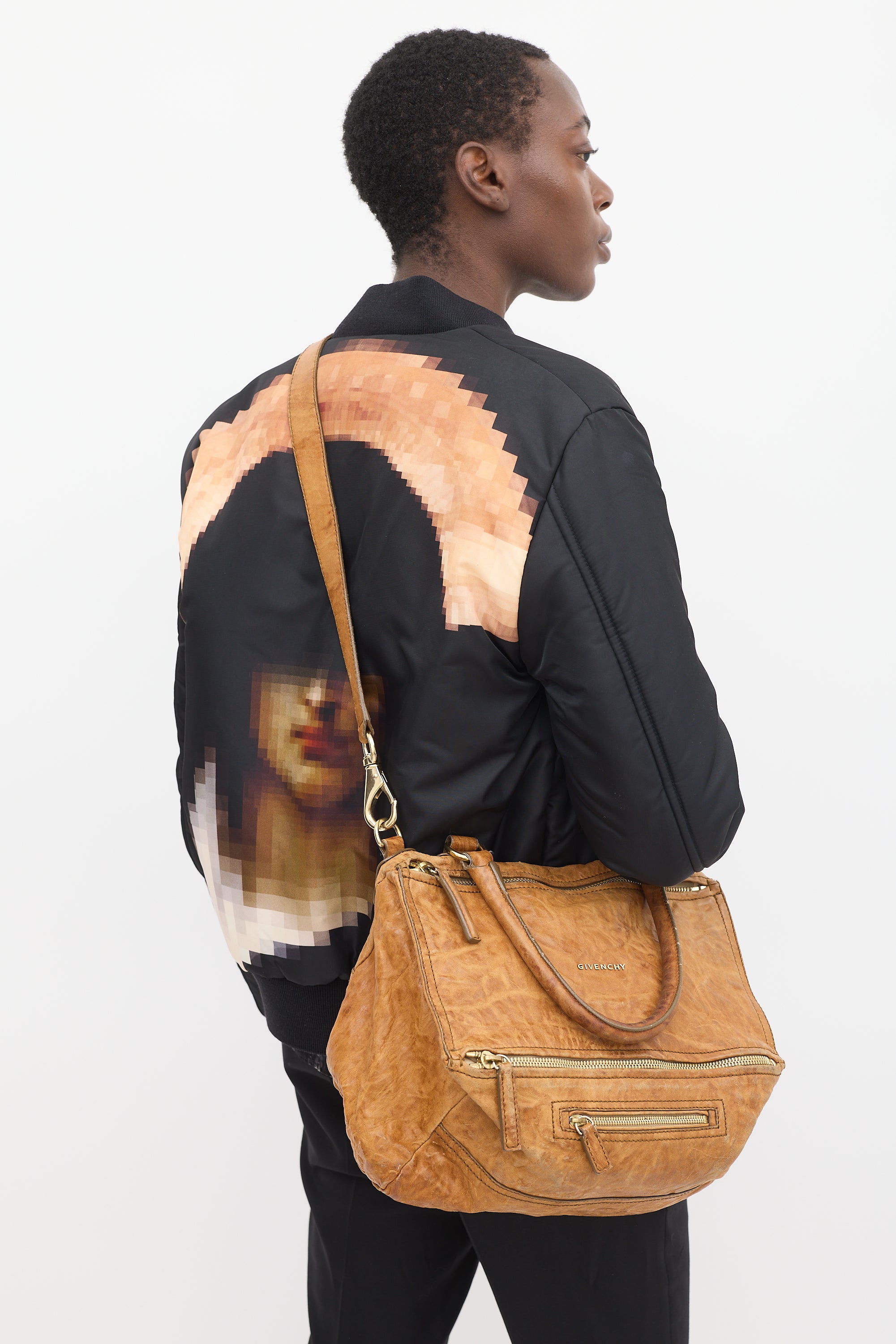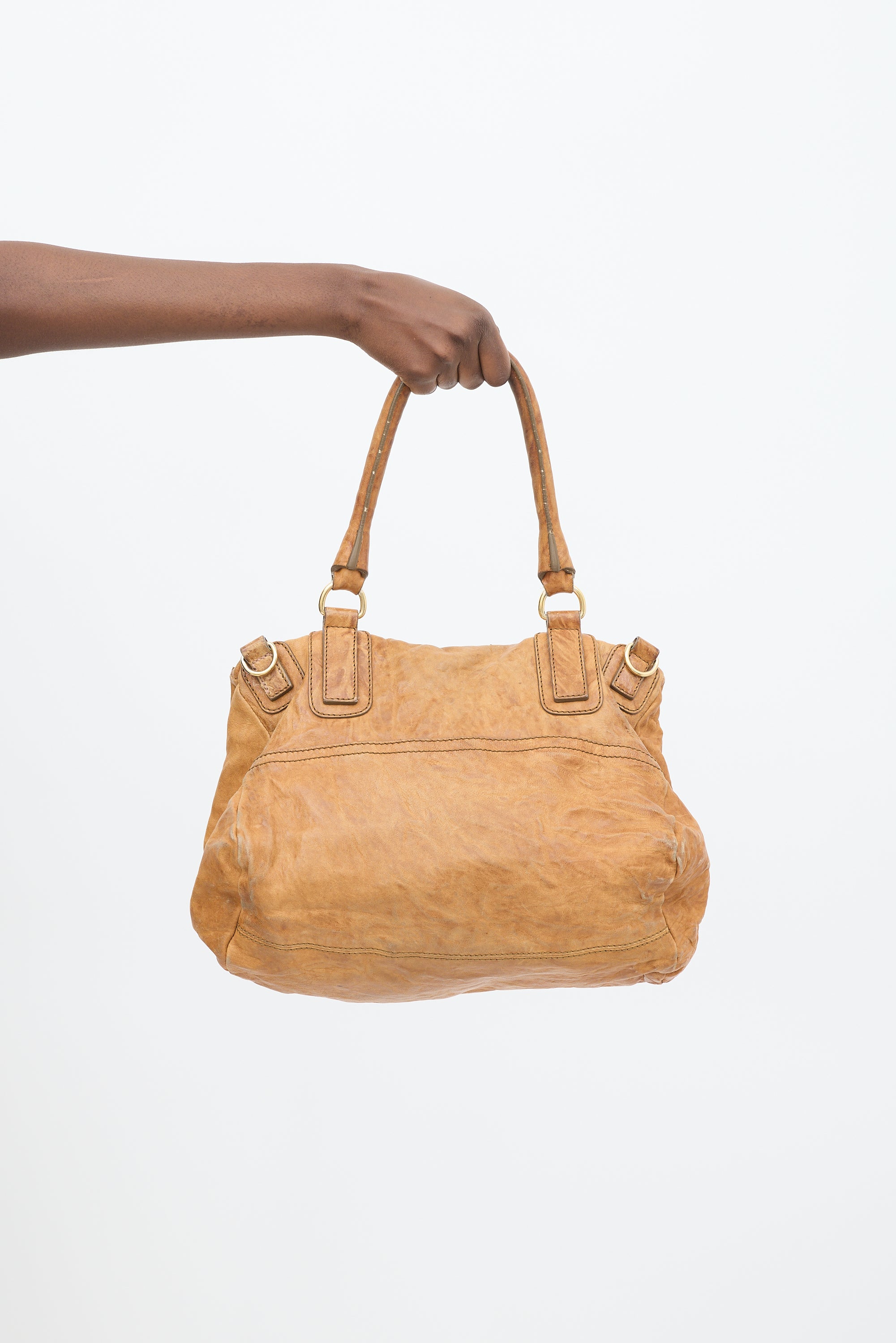 Pre-owned Givenchy brown crinkled leather Pandora crossbody bag featuring tonal stitching, gold tone hardware, front logo hardware, one flap pocket and one exterior zip compartment at bottom front, single rolled top handle, detachable shoulder strap, top zip closure, and one lined main compartment with one zip pocket and two slip pockets. Comes with original dust bag.