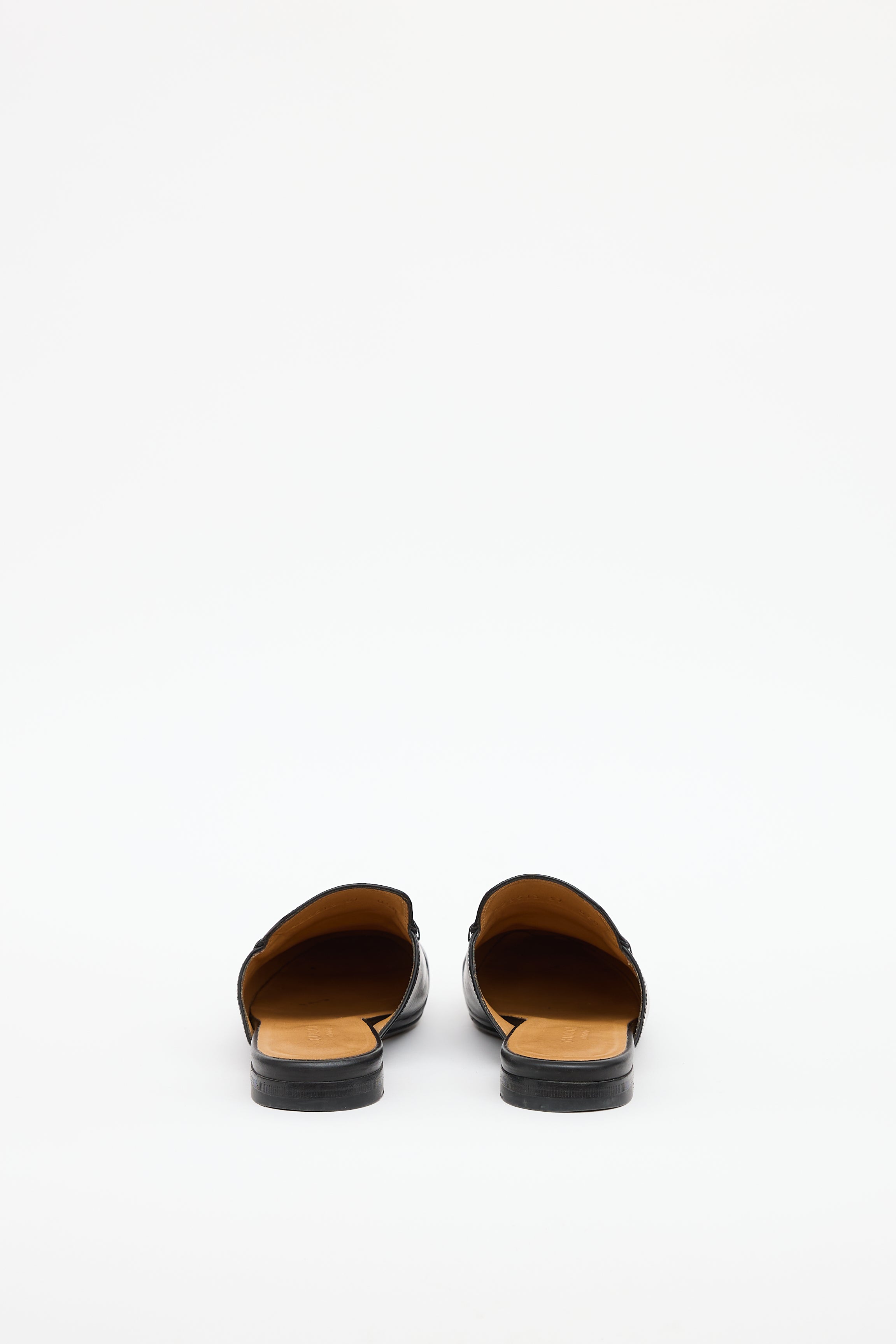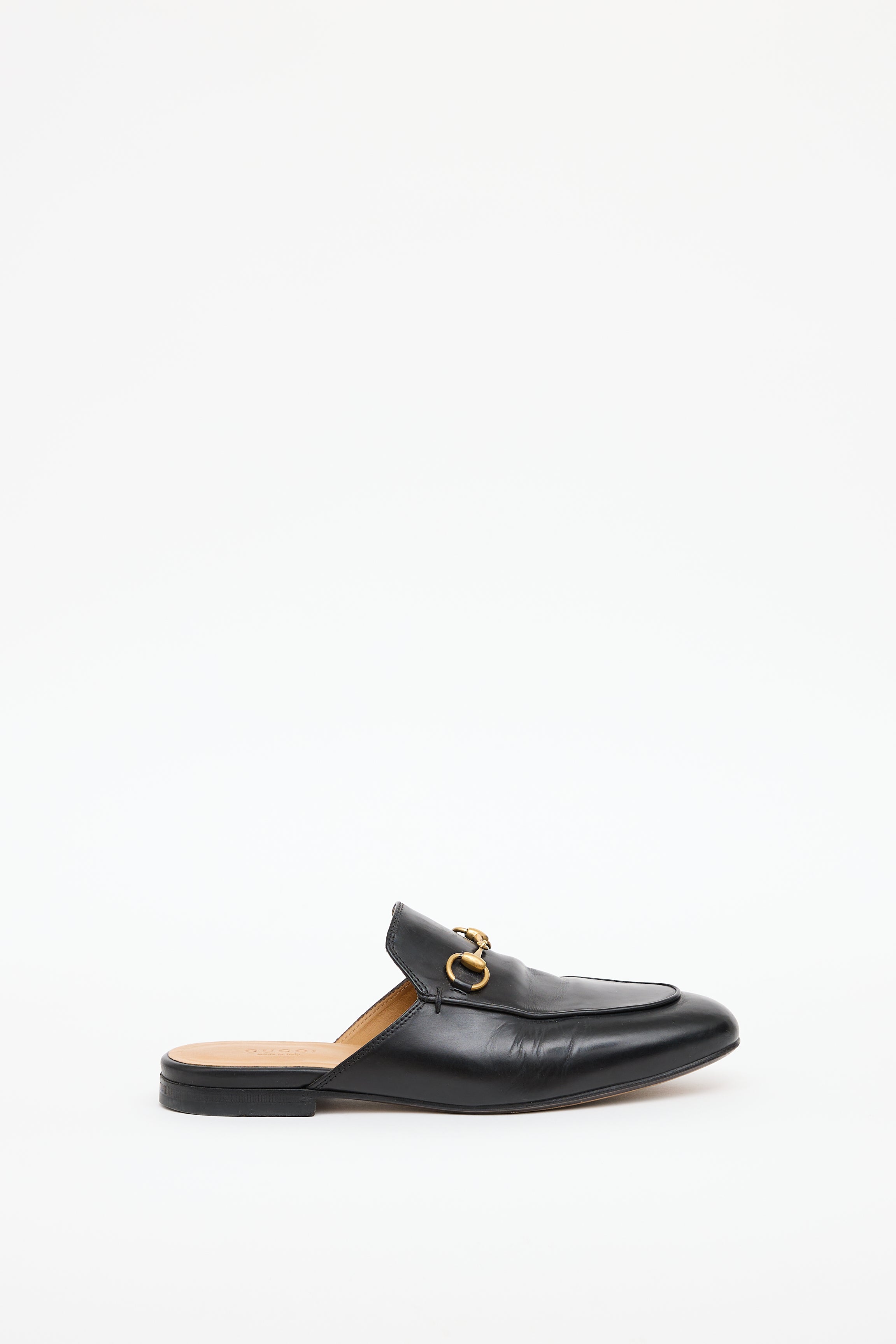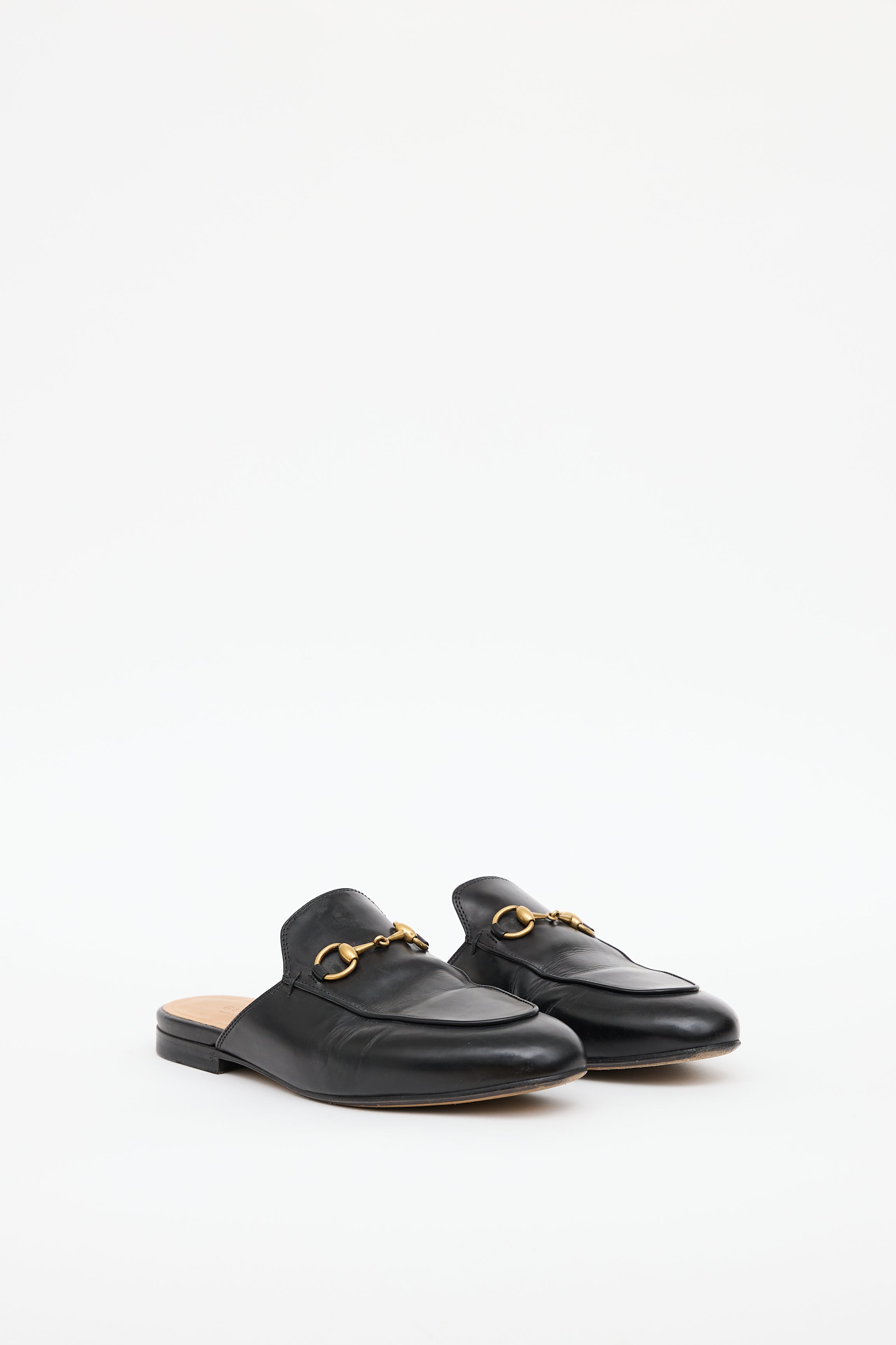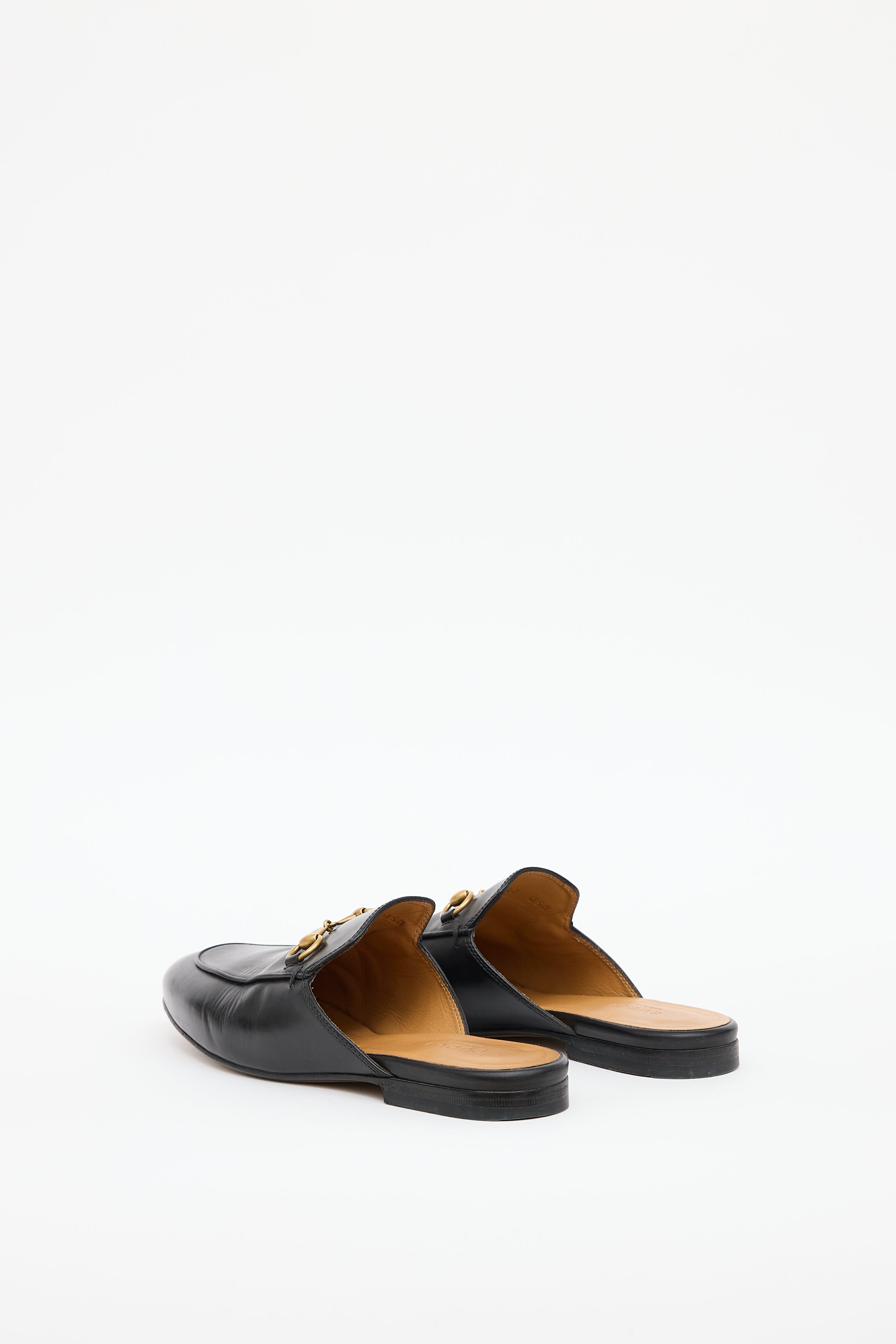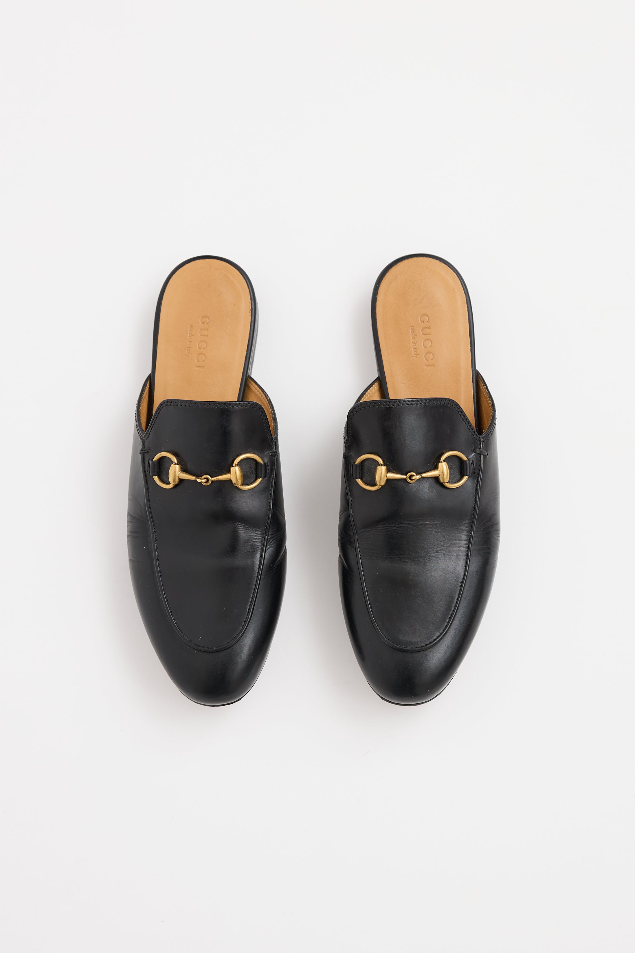 Pre-owned Gucci black leather Princetown mules featuring round toe, horsebit hardware on toe box, gold tone hardware and covered block heel.