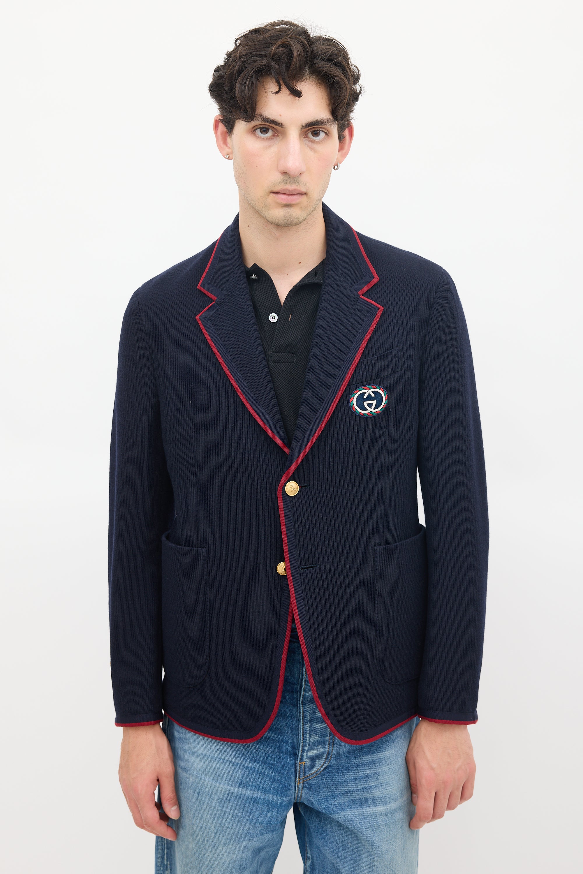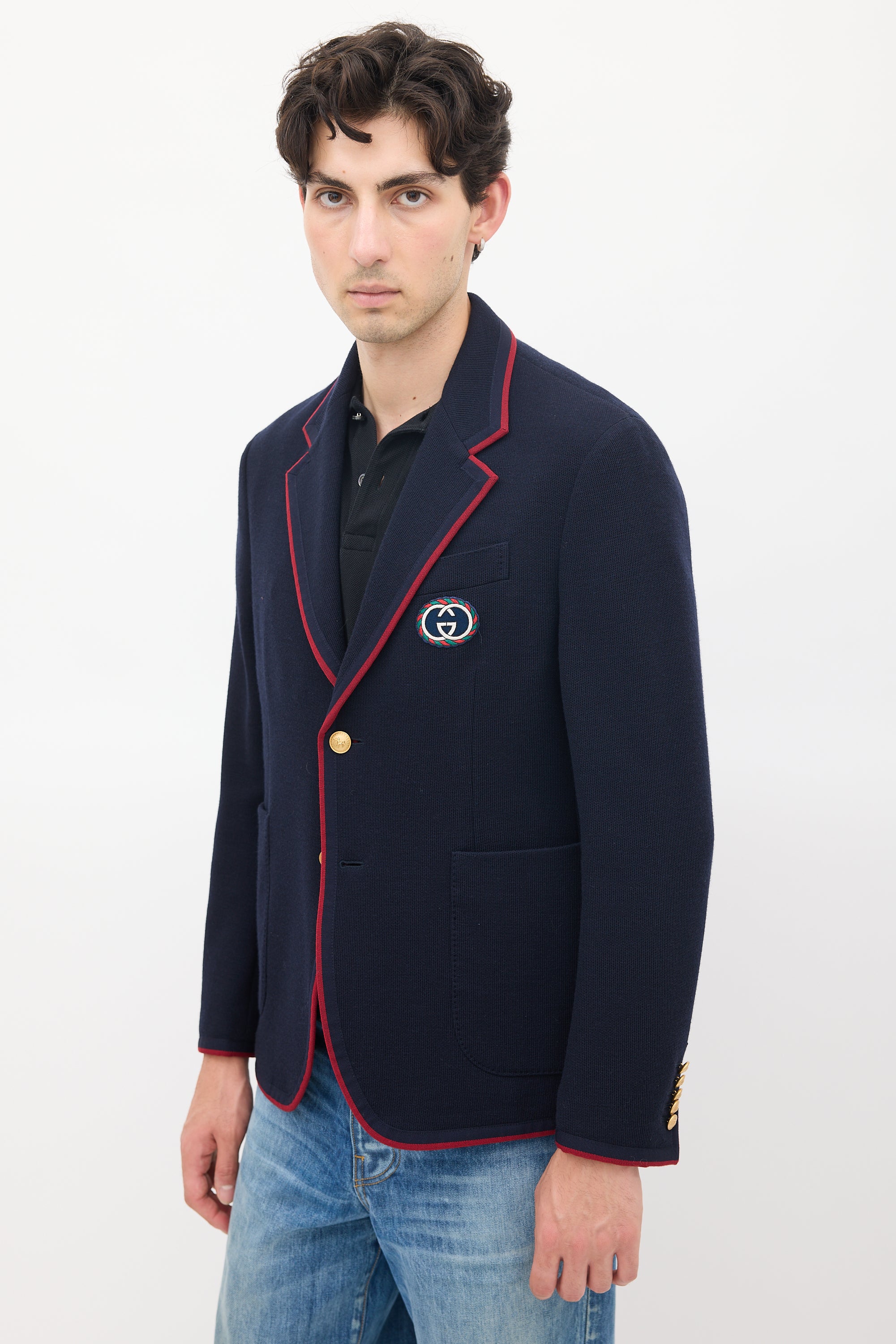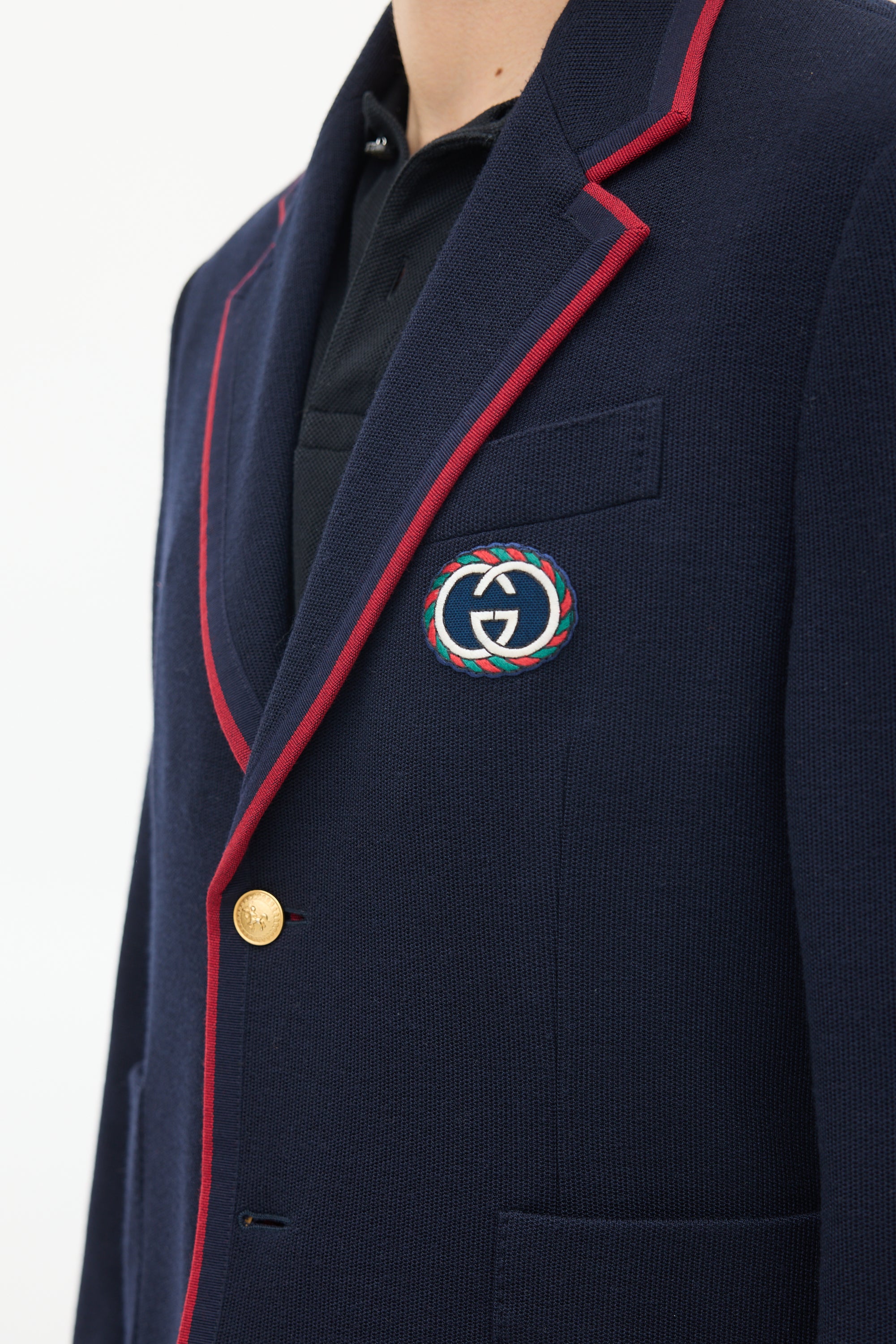 Pre-owned Gucci navy wool and cotton blend blazer featuring a notched collar, gold tone button up front, slip pocket at left chest, two patch pockets at front hip, multicolour braid motif interlocking GG patch logo at left chest, back vent, padded shoulders, long sleeves with buttoned cuffs, and navy and red grosgrain trim throughout. Lined.