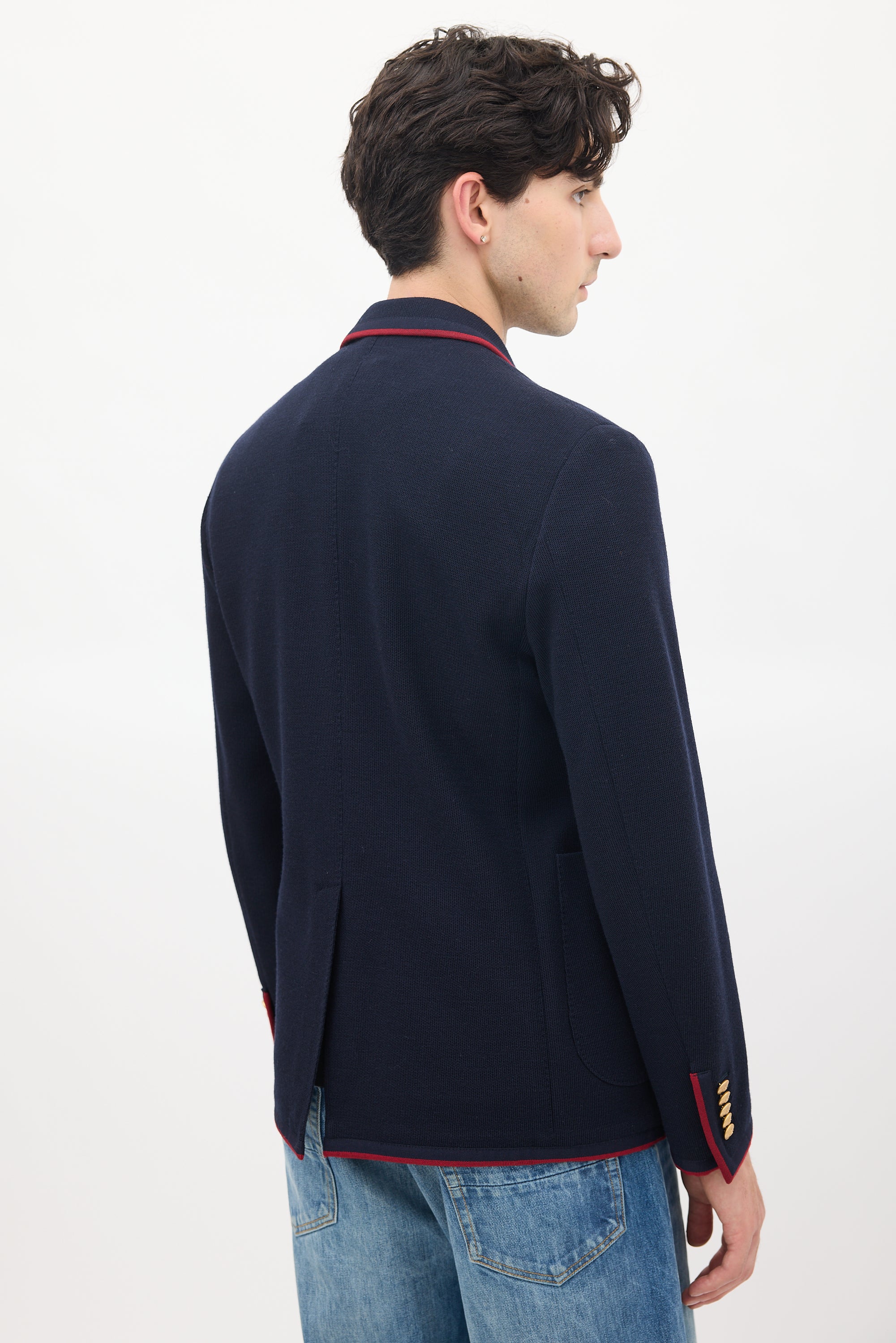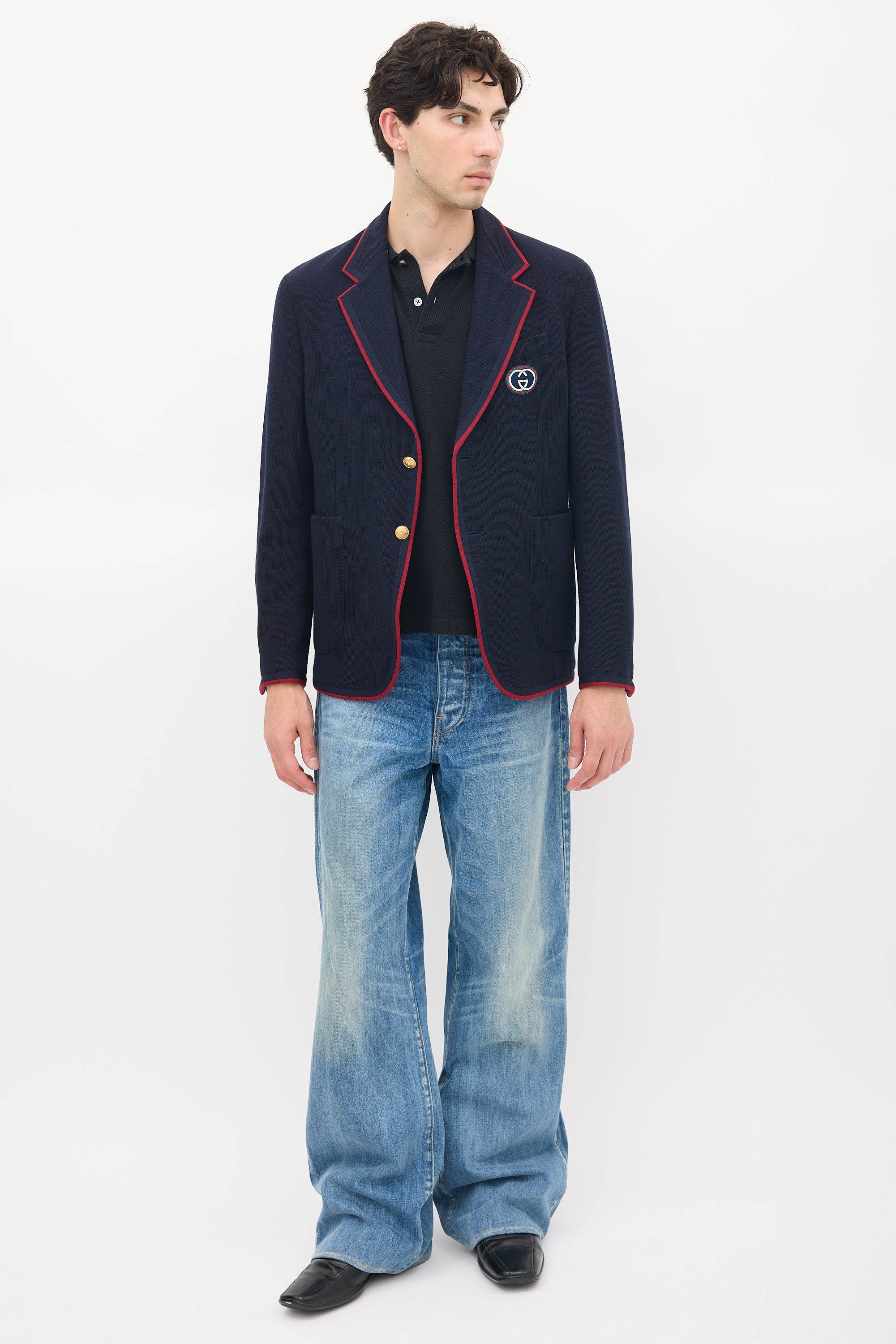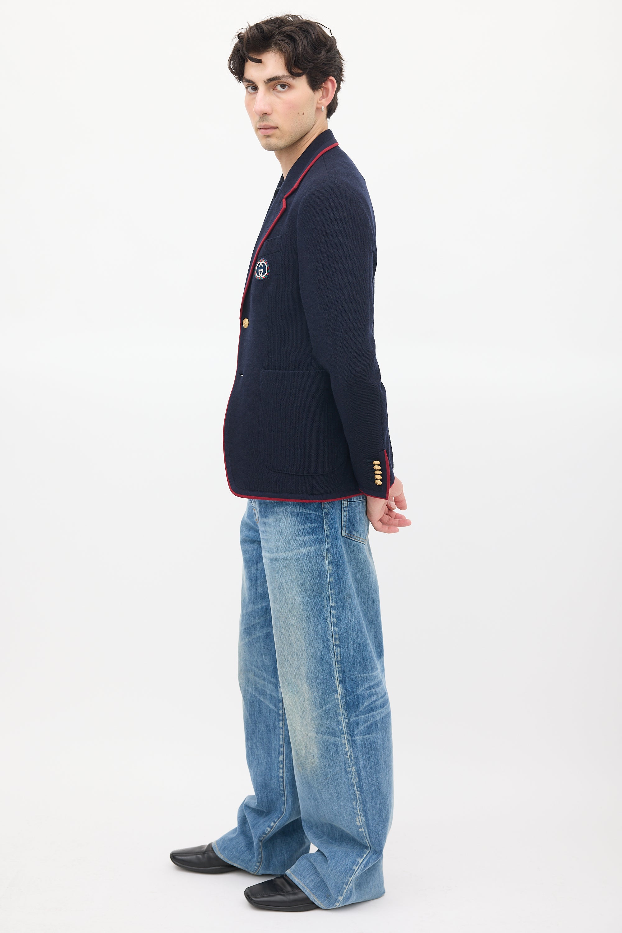 Pre-owned Gucci navy wool and cotton blend blazer featuring a notched collar, gold tone button up front, slip pocket at left chest, two patch pockets at front hip, multicolour braid motif interlocking GG patch logo at left chest, back vent, padded shoulders, long sleeves with buttoned cuffs, and navy and red grosgrain trim throughout. Lined.