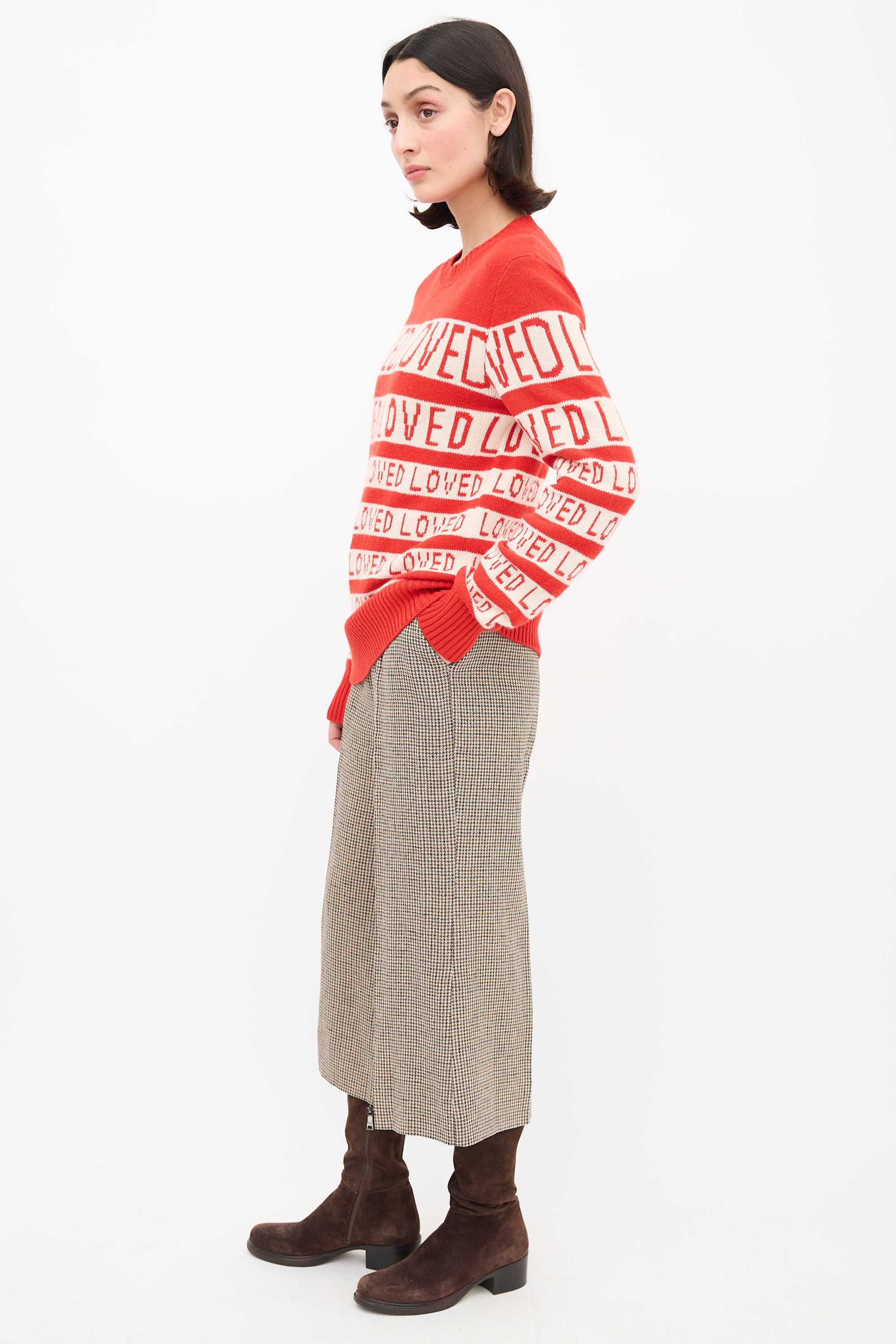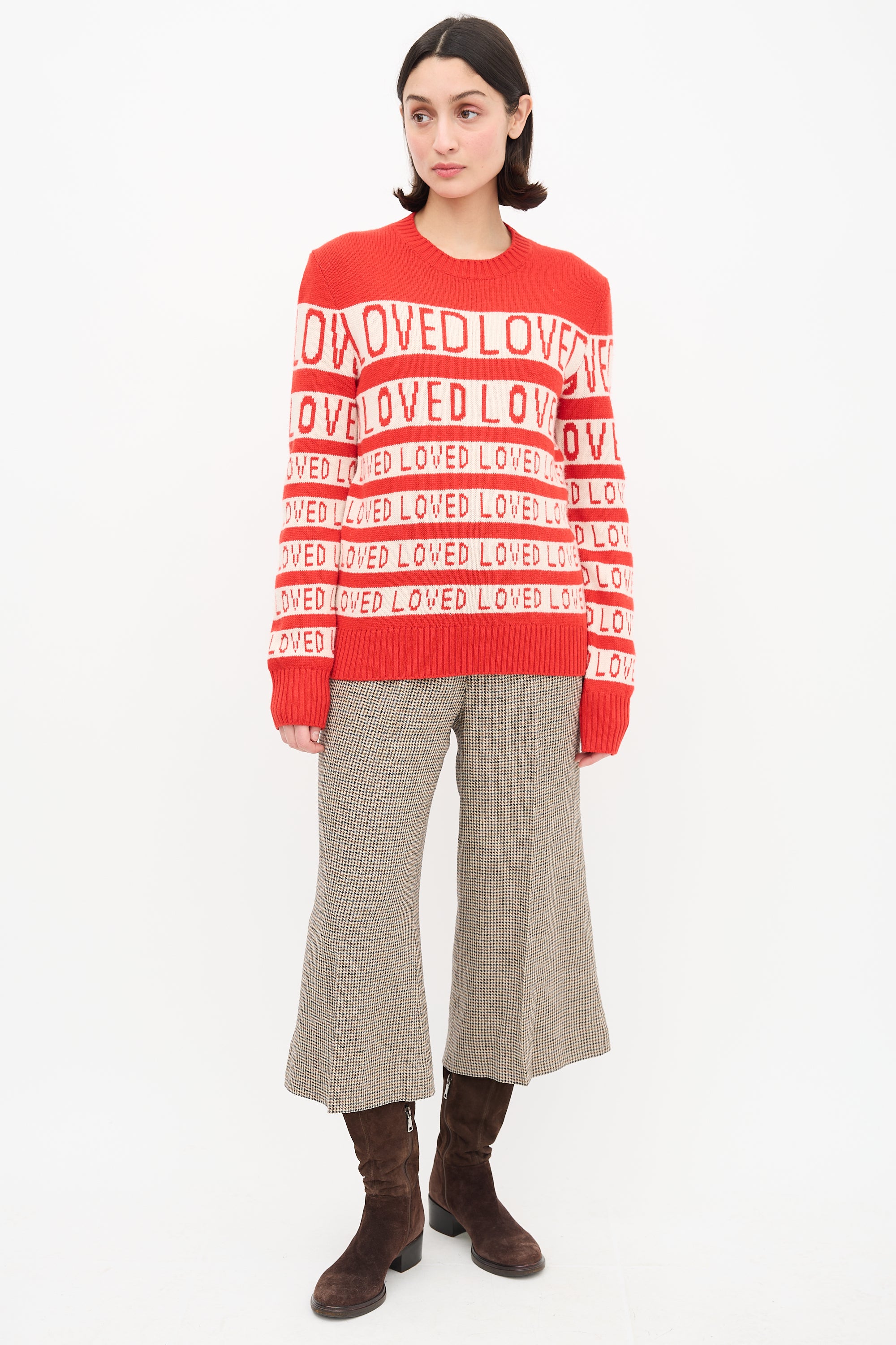 Pre-owned Gucci red and white Love Jacquard sweater featuring ribbed crew neckline, striped Love intarsia throughout, and ribbed cuffs and hem.