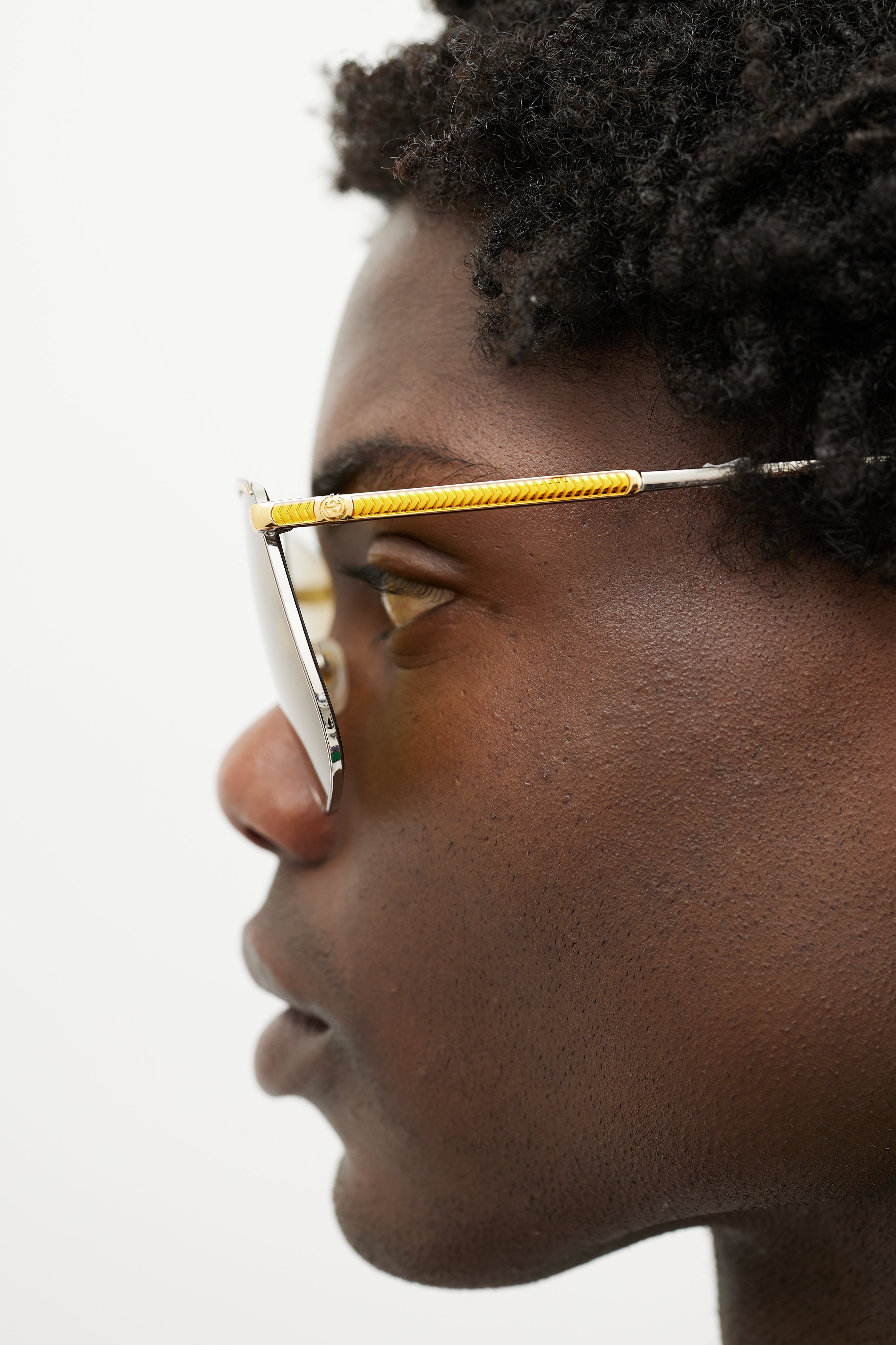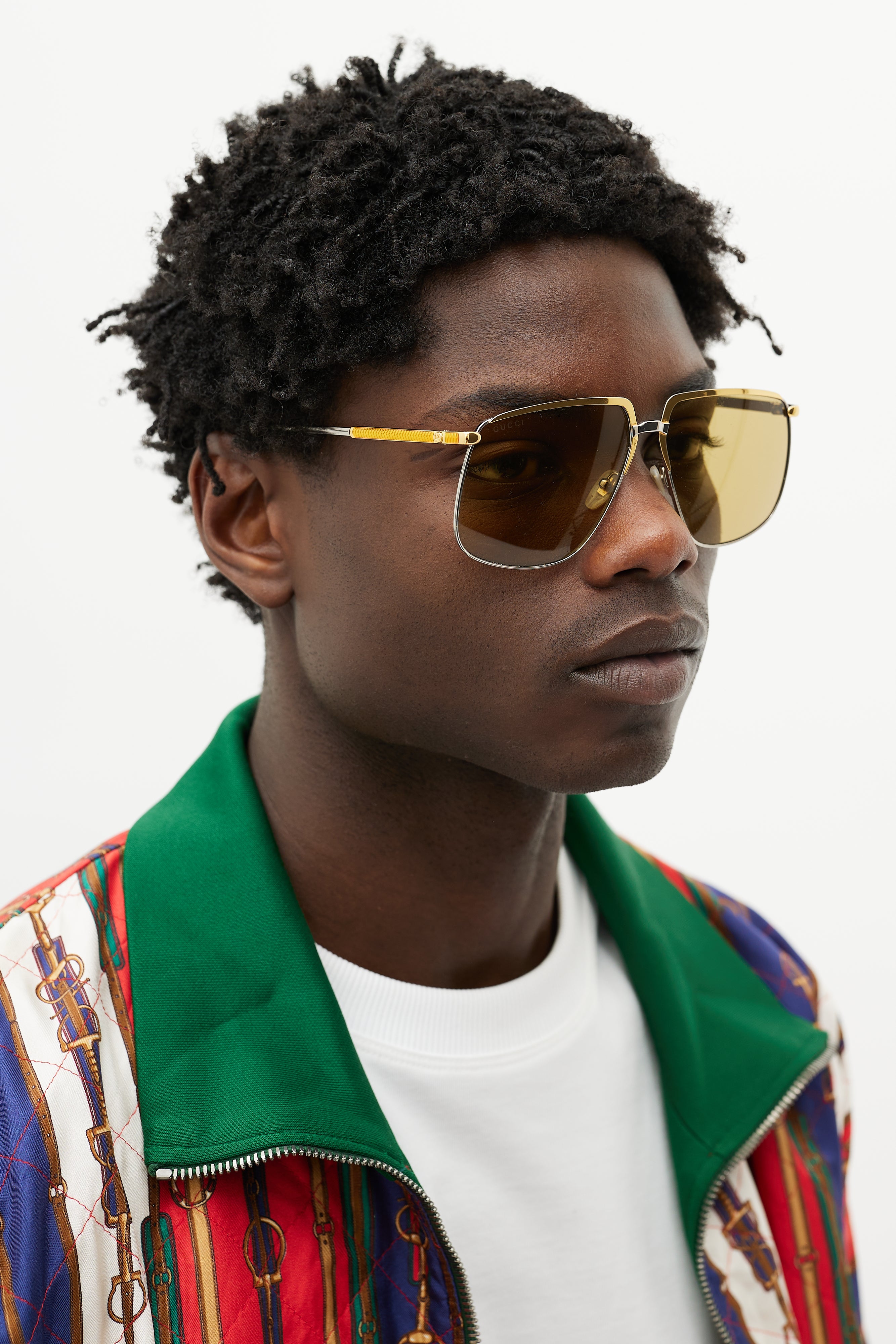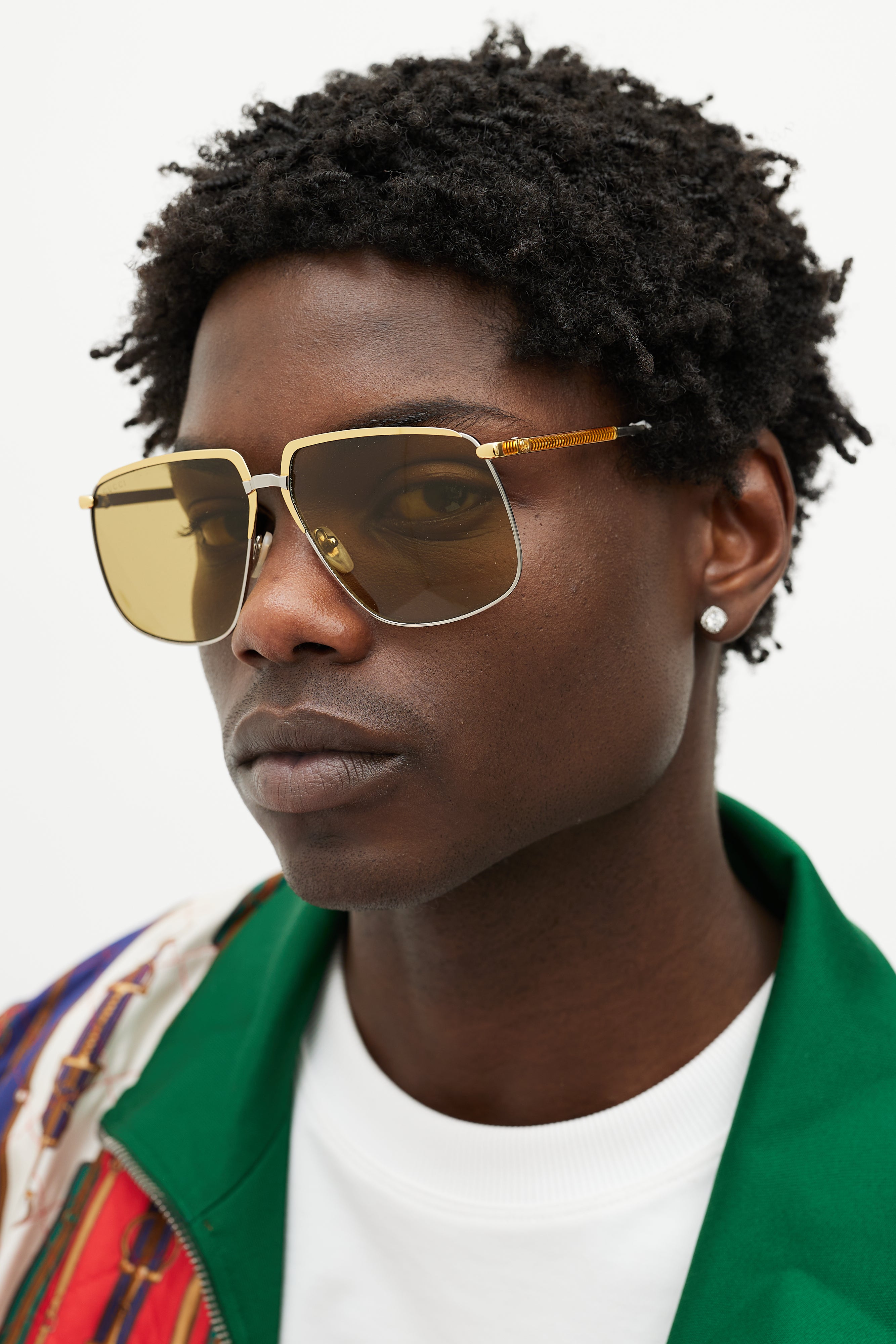 Pre-owned Gucci GG0365S aviator sunglasses featuring a gold tone frame, nose pads, tinted lenses, silver tone arms, and GG logo hardware at temple.