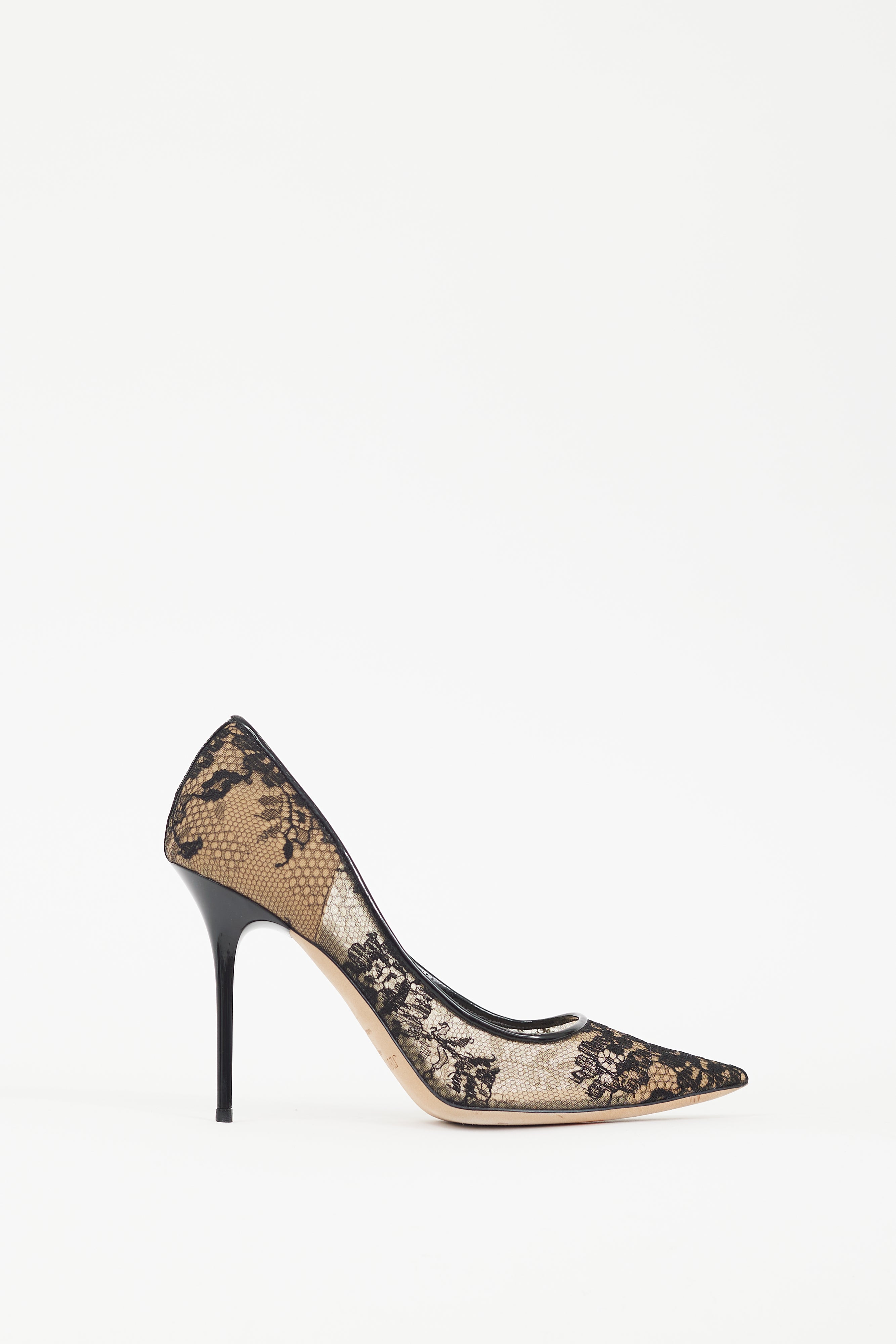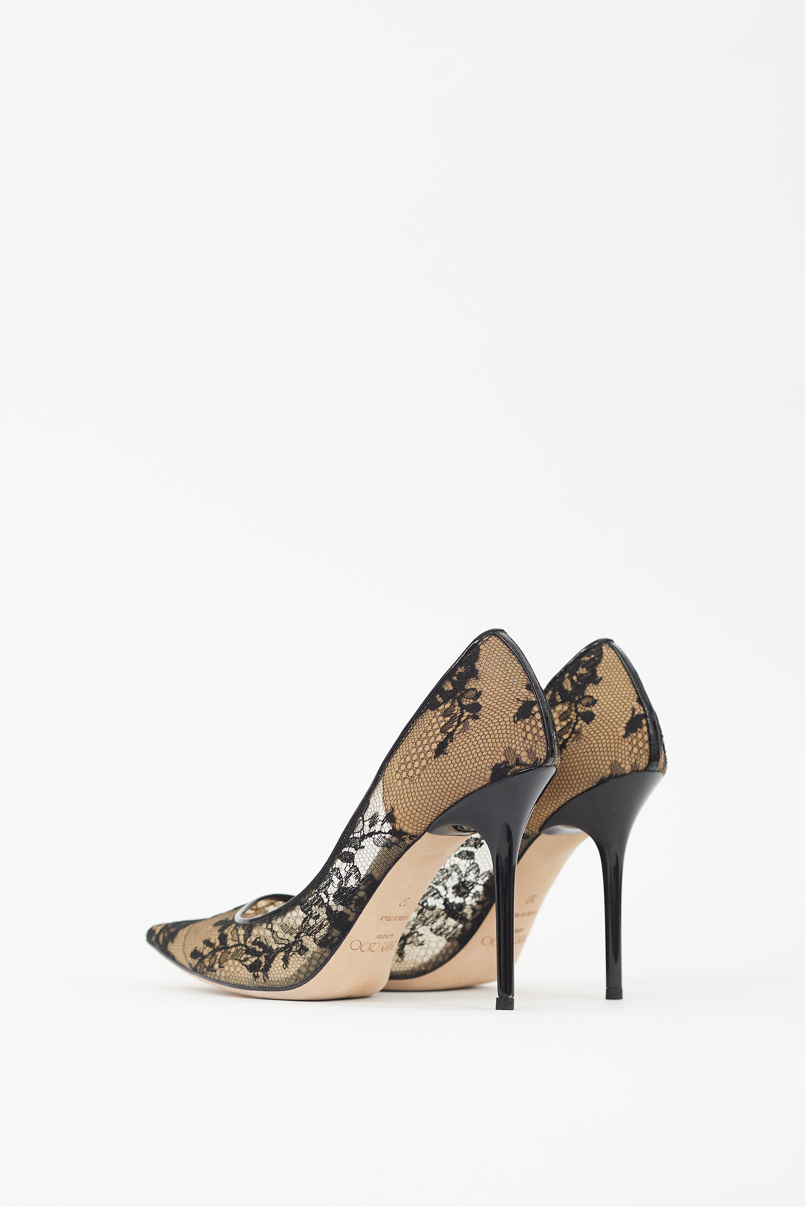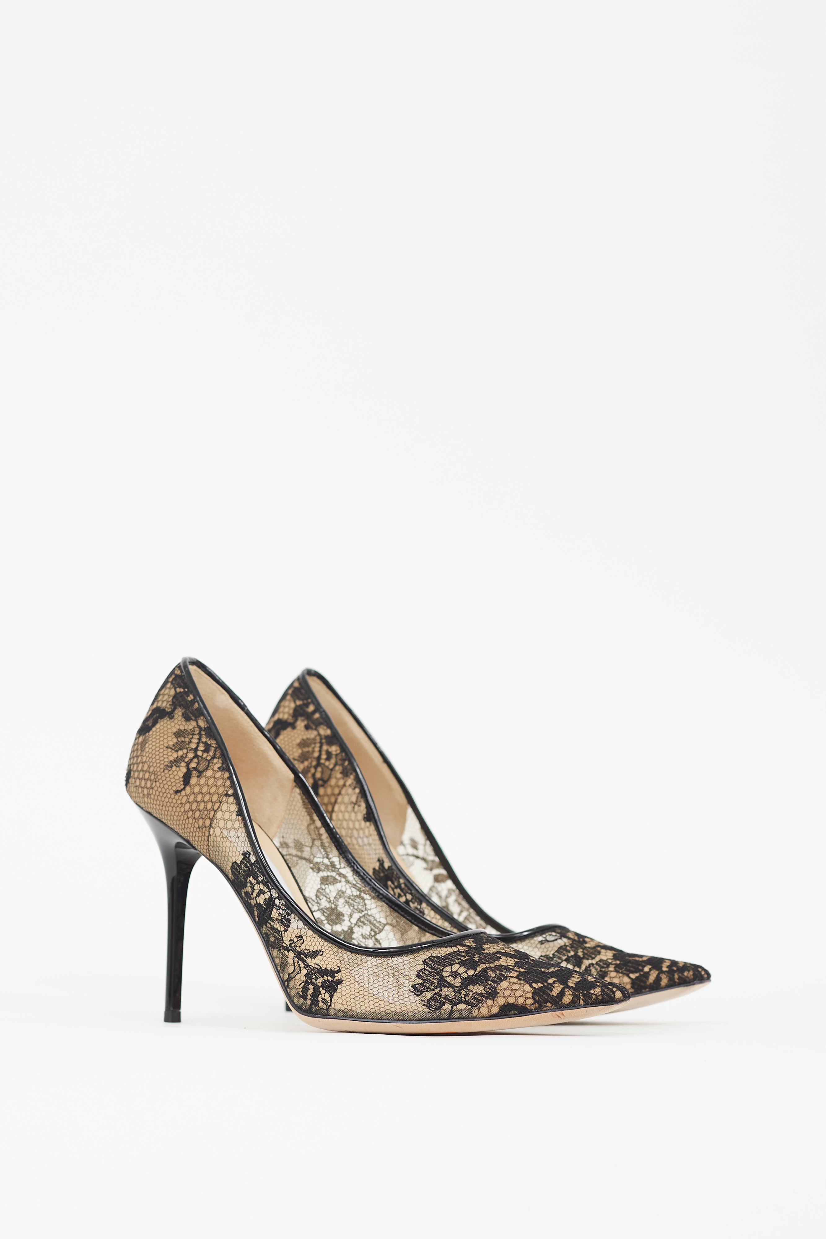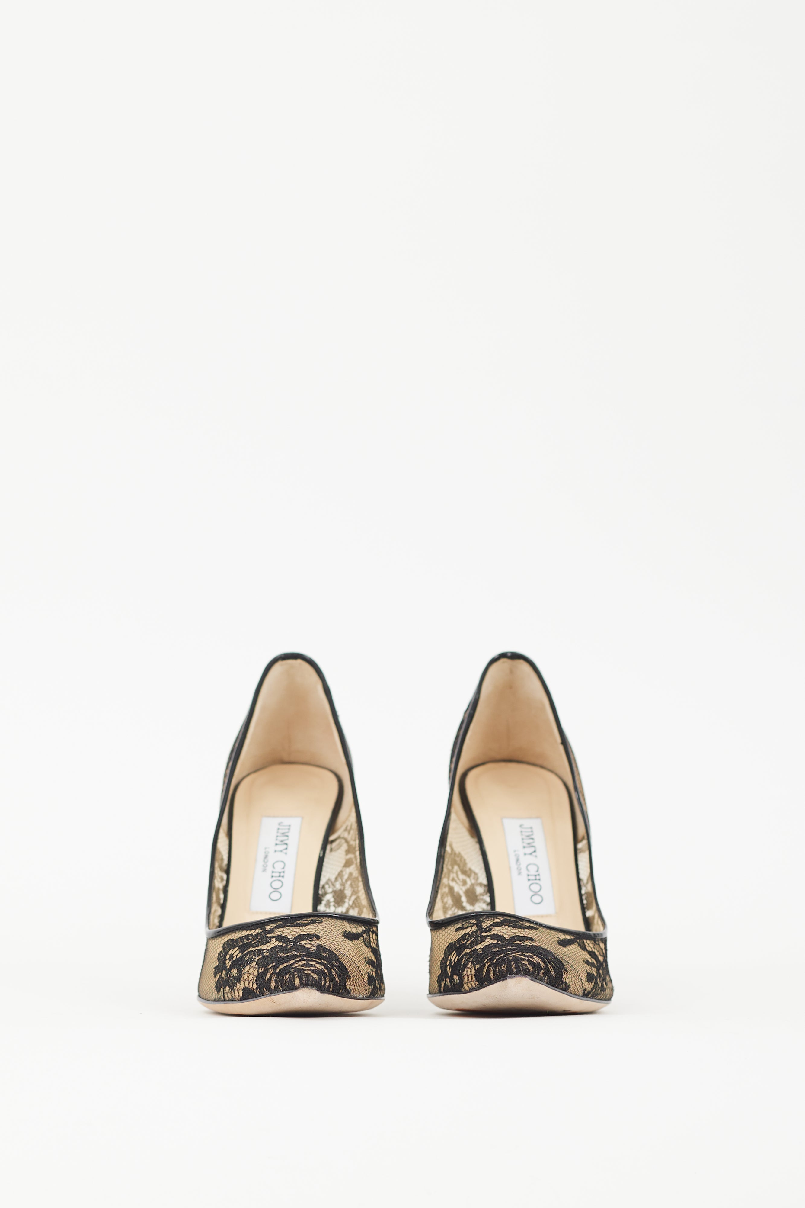 Pre-owned Jimmy Choo beige Agnes heels featuring a black lace overlay, pointed toe, wrapped stiletto heel, and slip on entry. Comes with original dust bag.