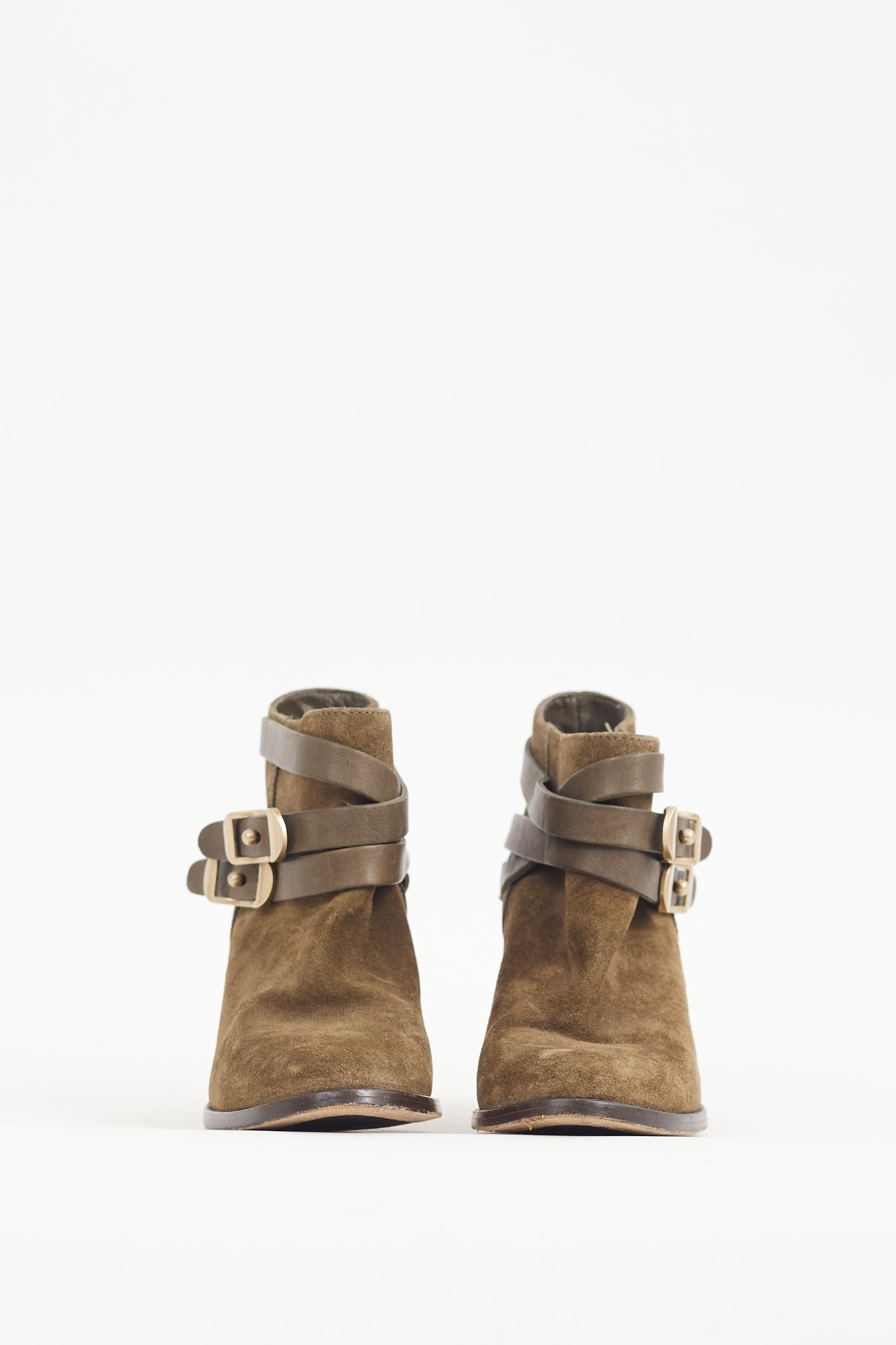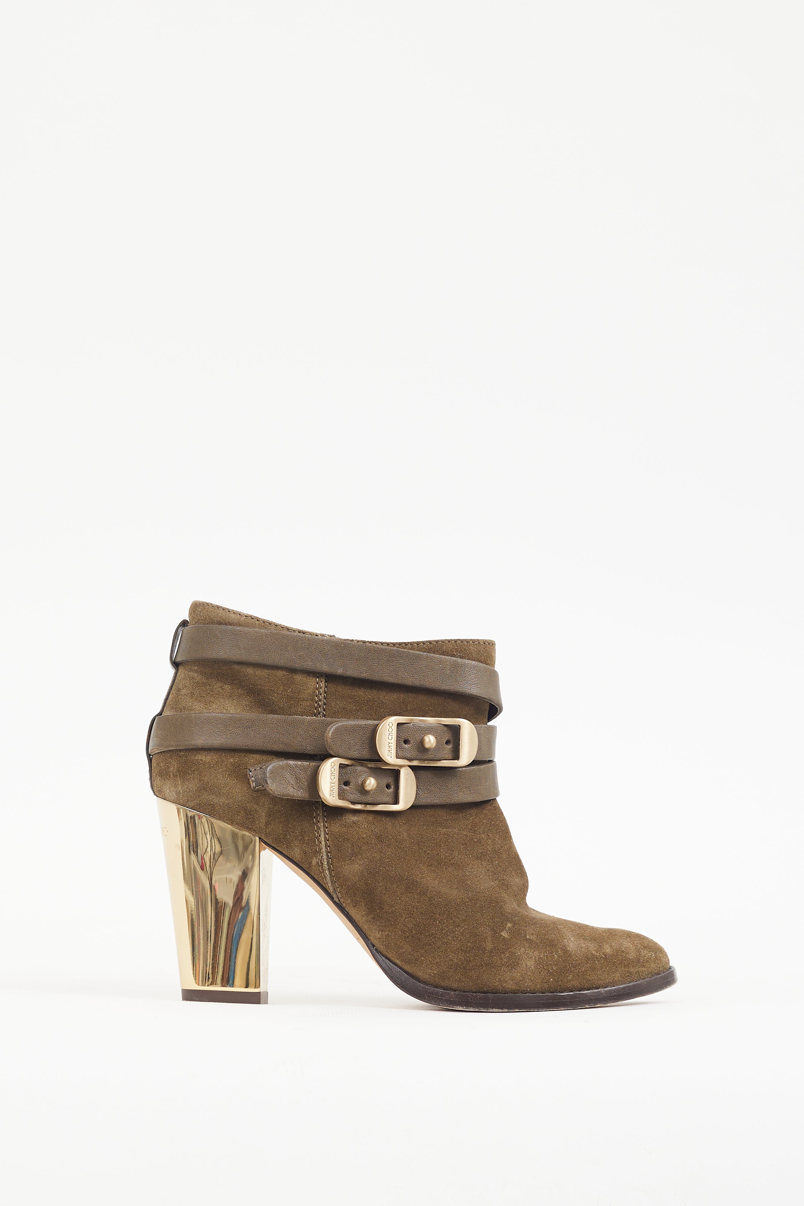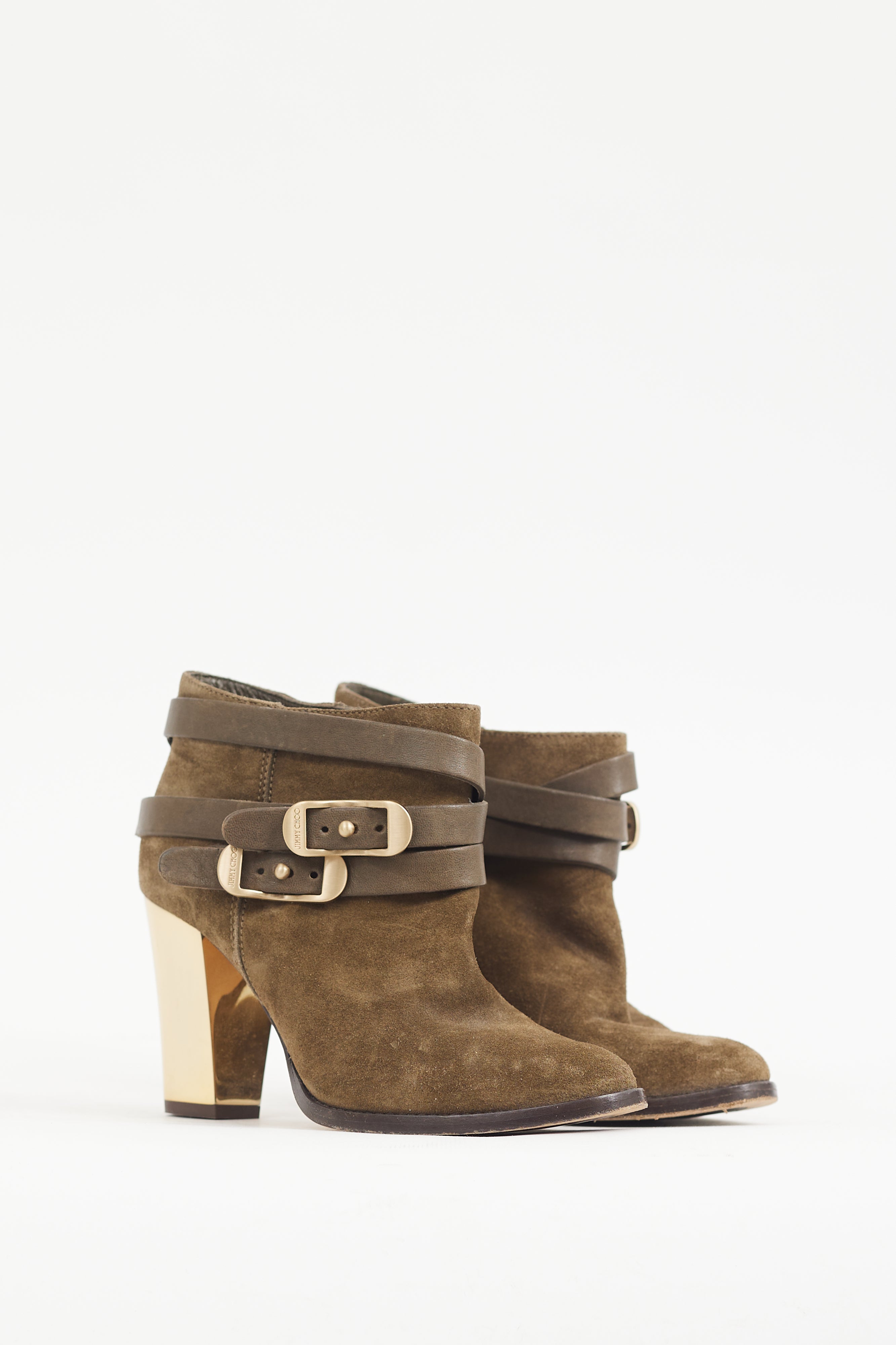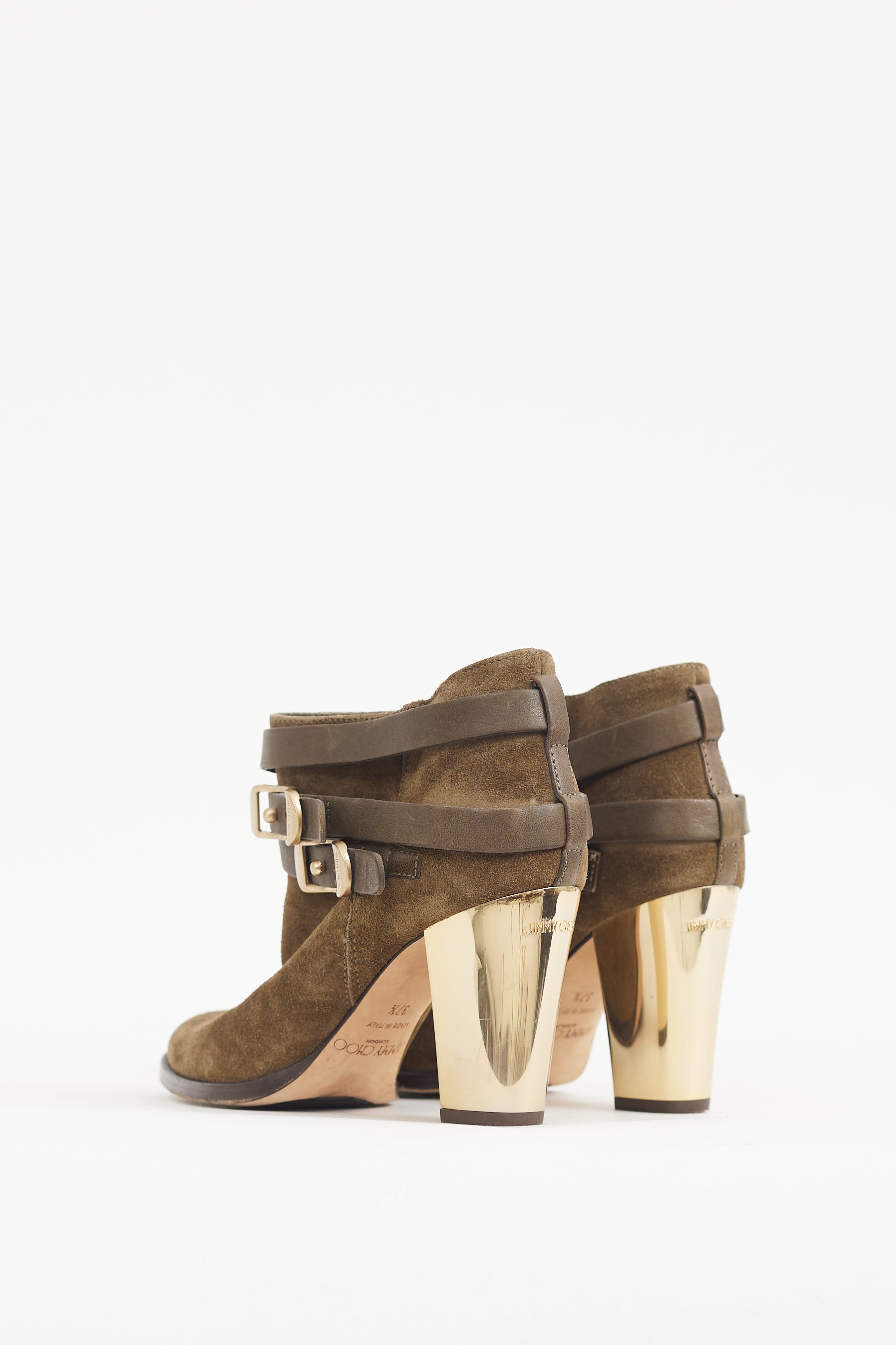 Pre-owned Jimmy Choo khaki brown boots featuring an almond toe, suede upper, slip on entry, wrapped around leather straps at shaft with gold tone buckles, and a gold tone metal covered block heel with engraved logo.