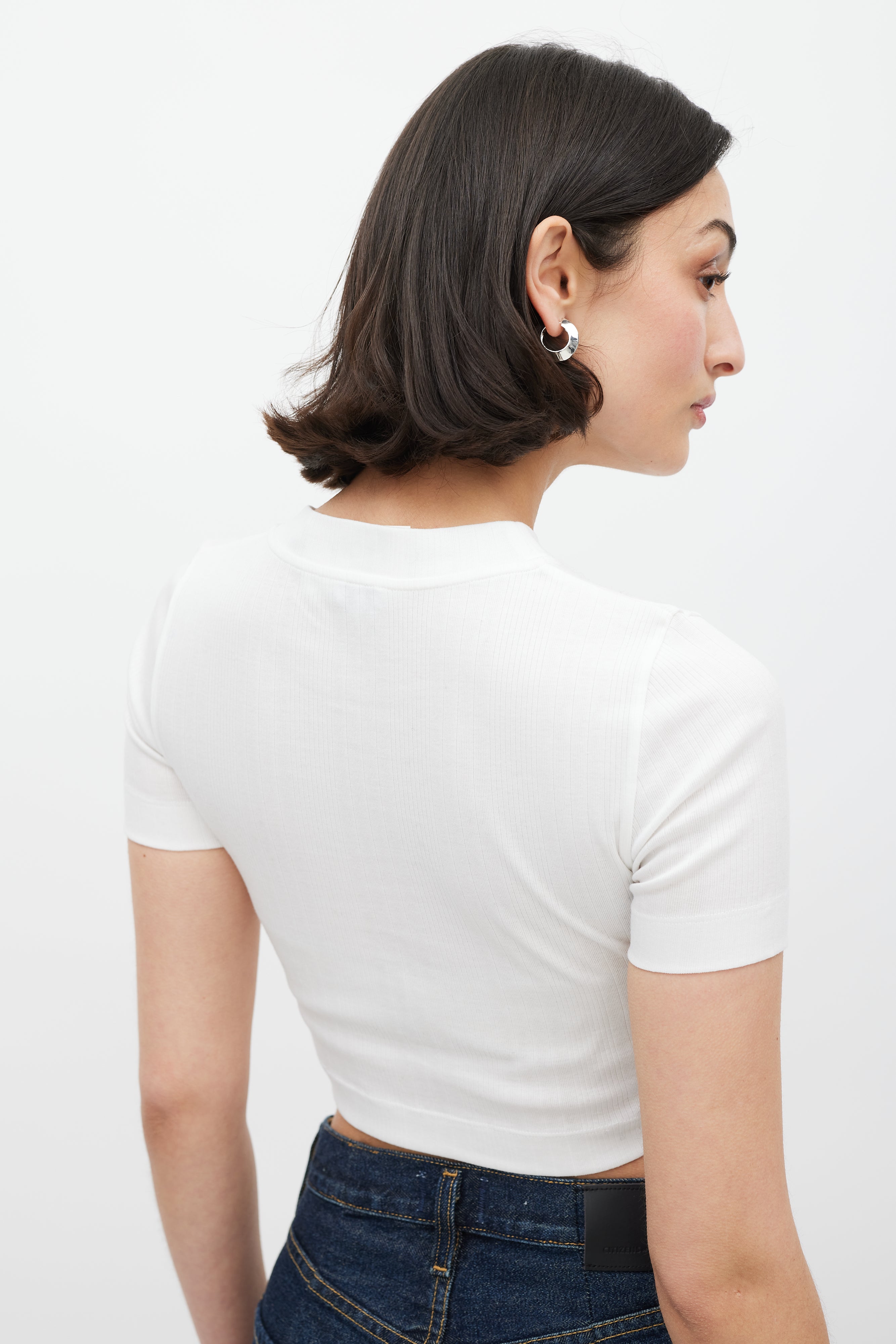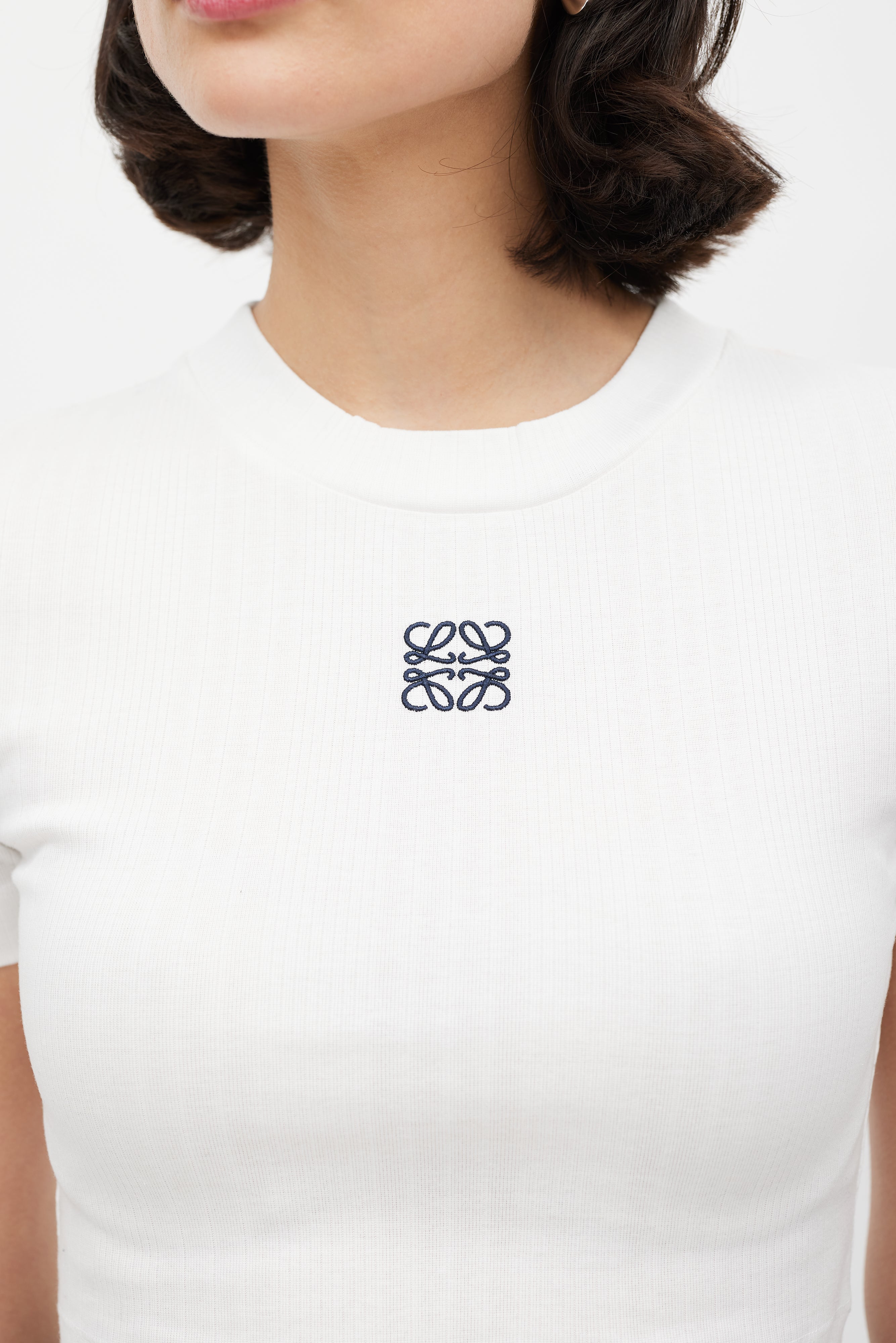 Pre-owned Loewe white top featuring a black embroidered logo at front, mock neck collar, short sleeves, ribbed detailing, and cropped fit.