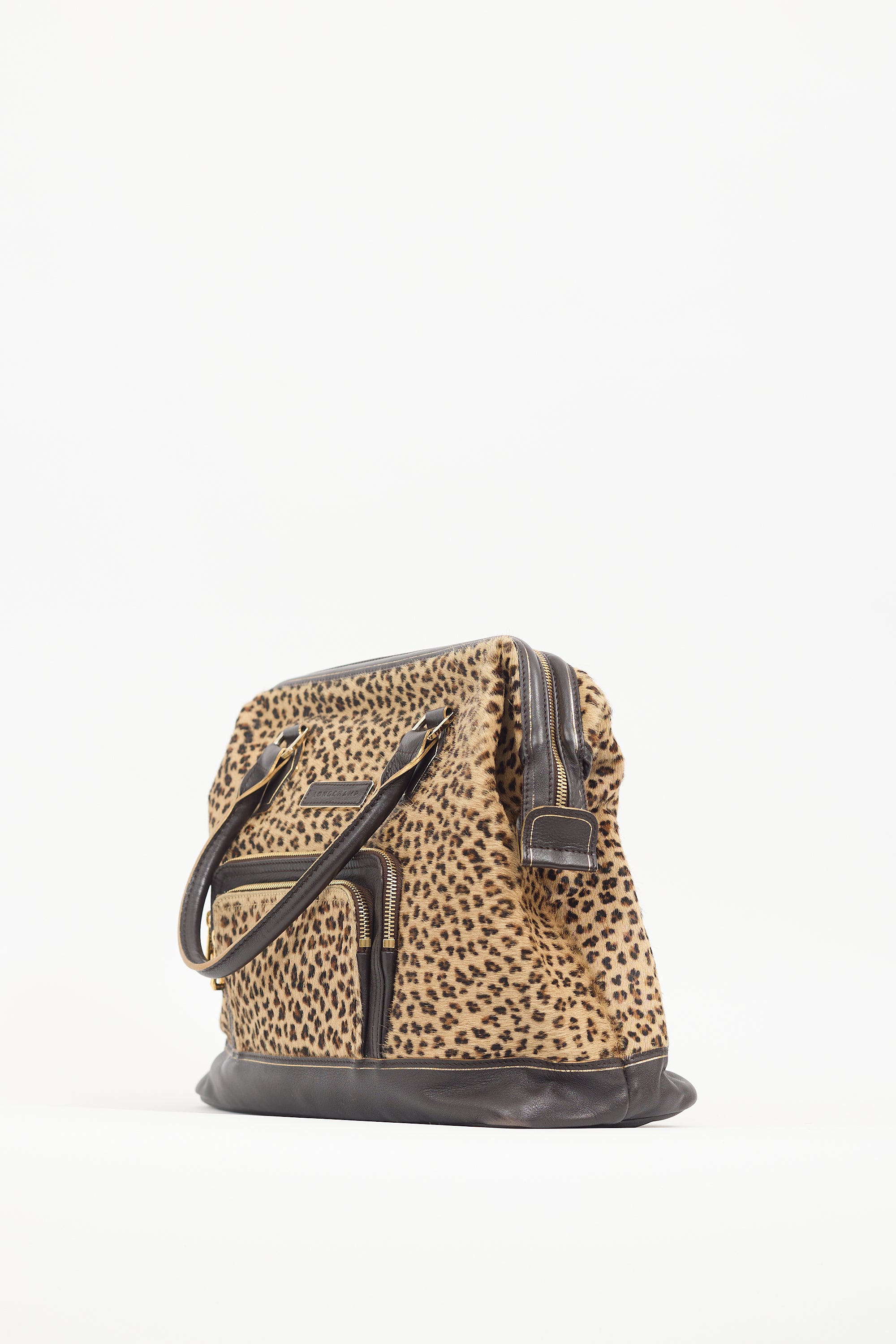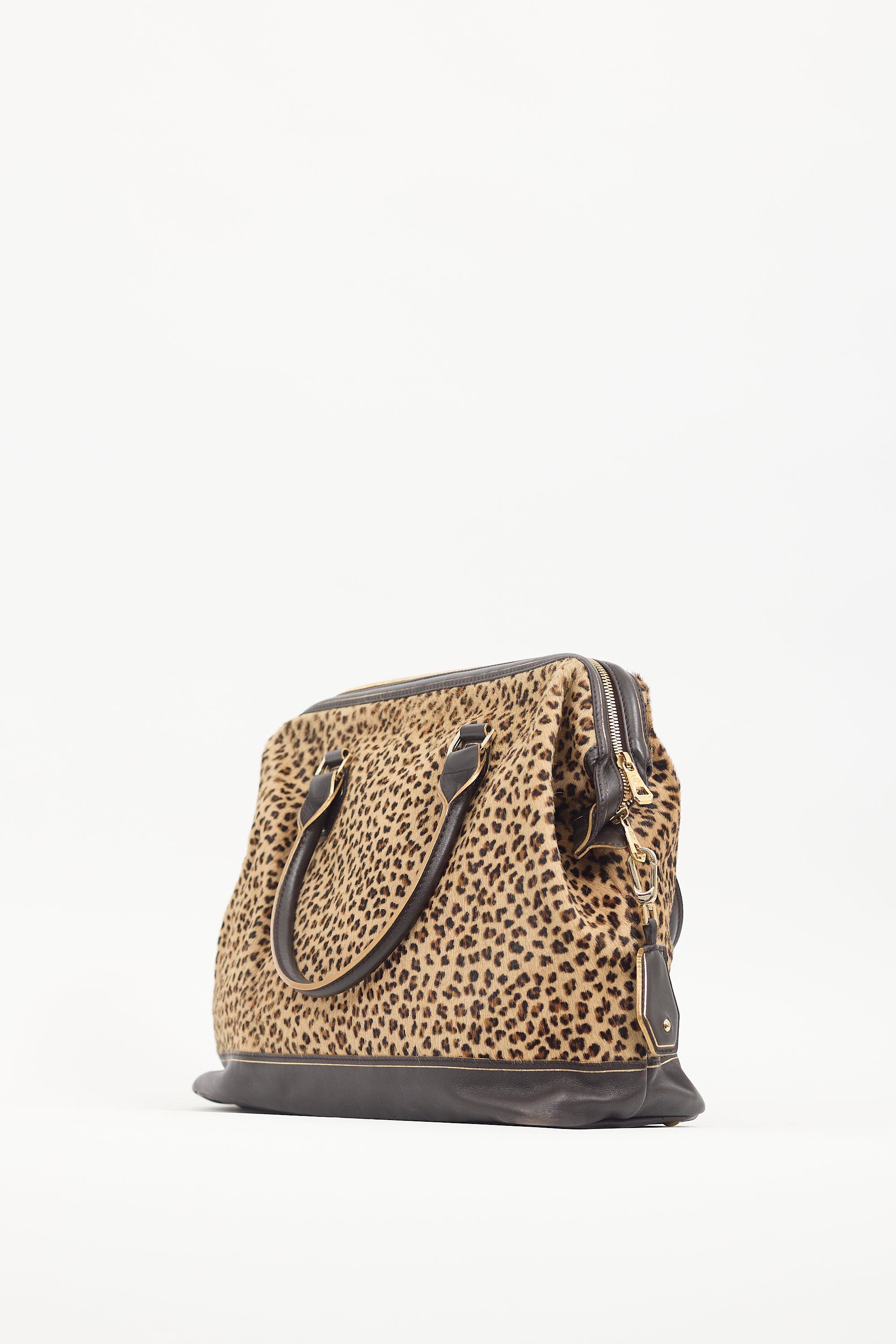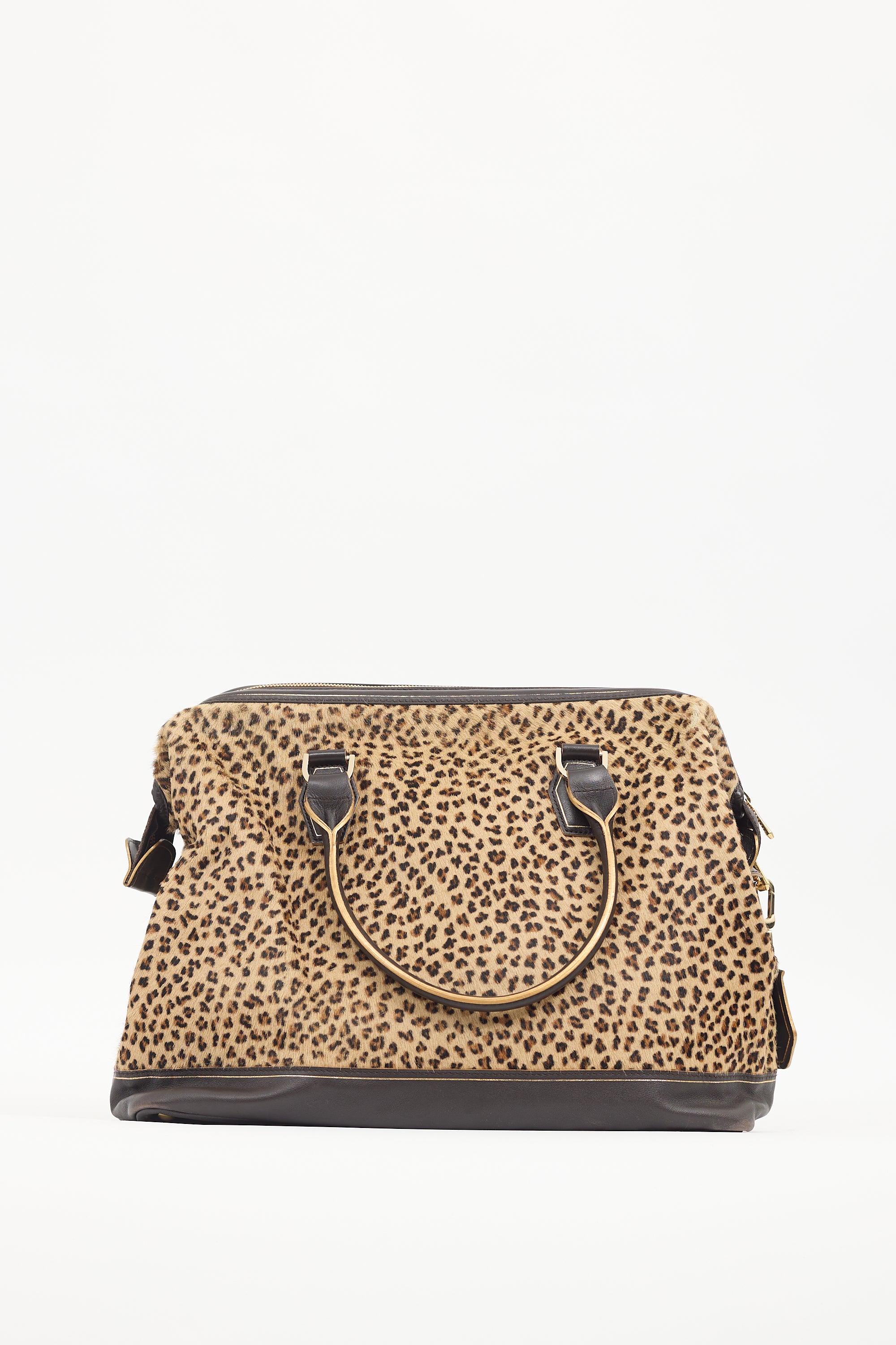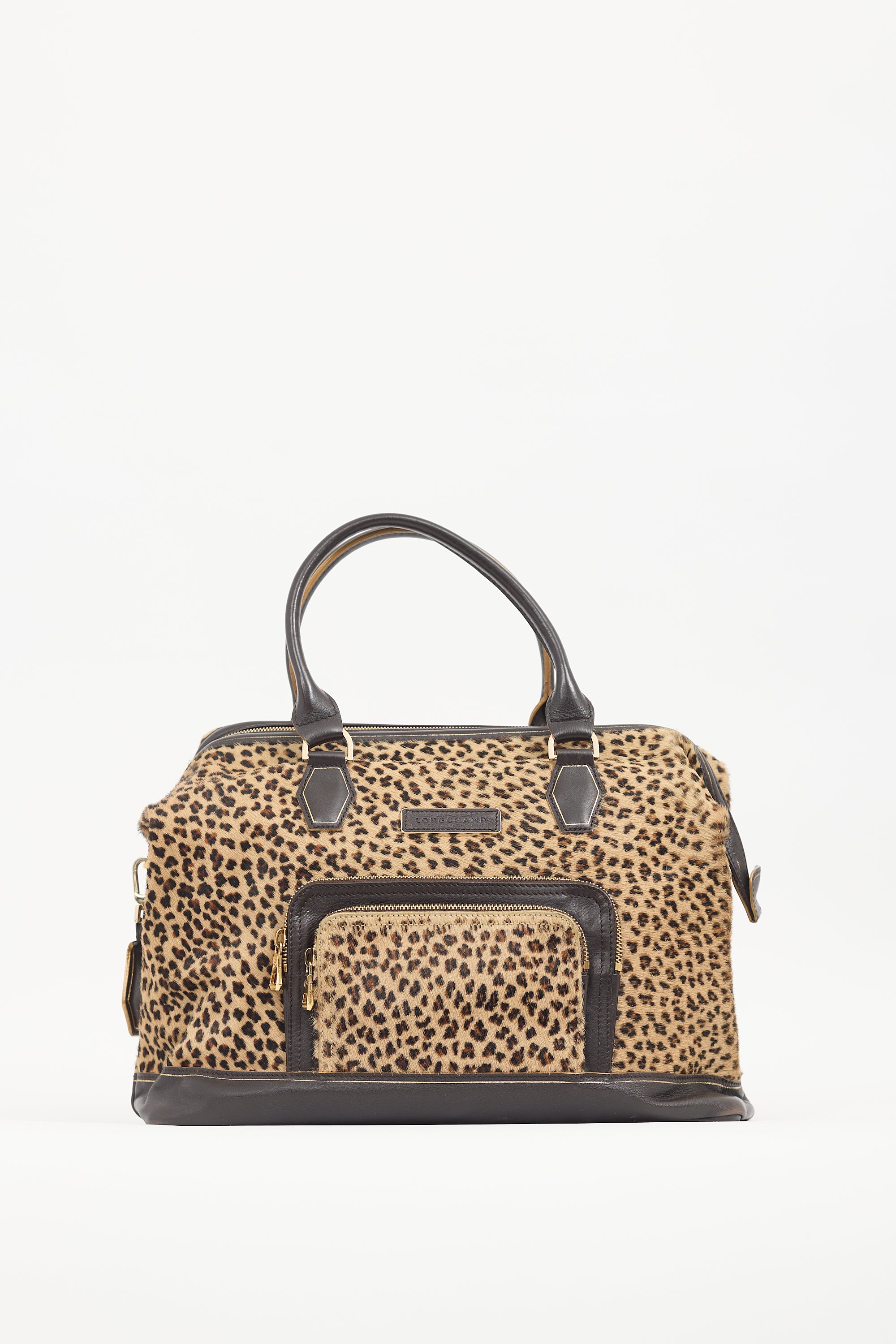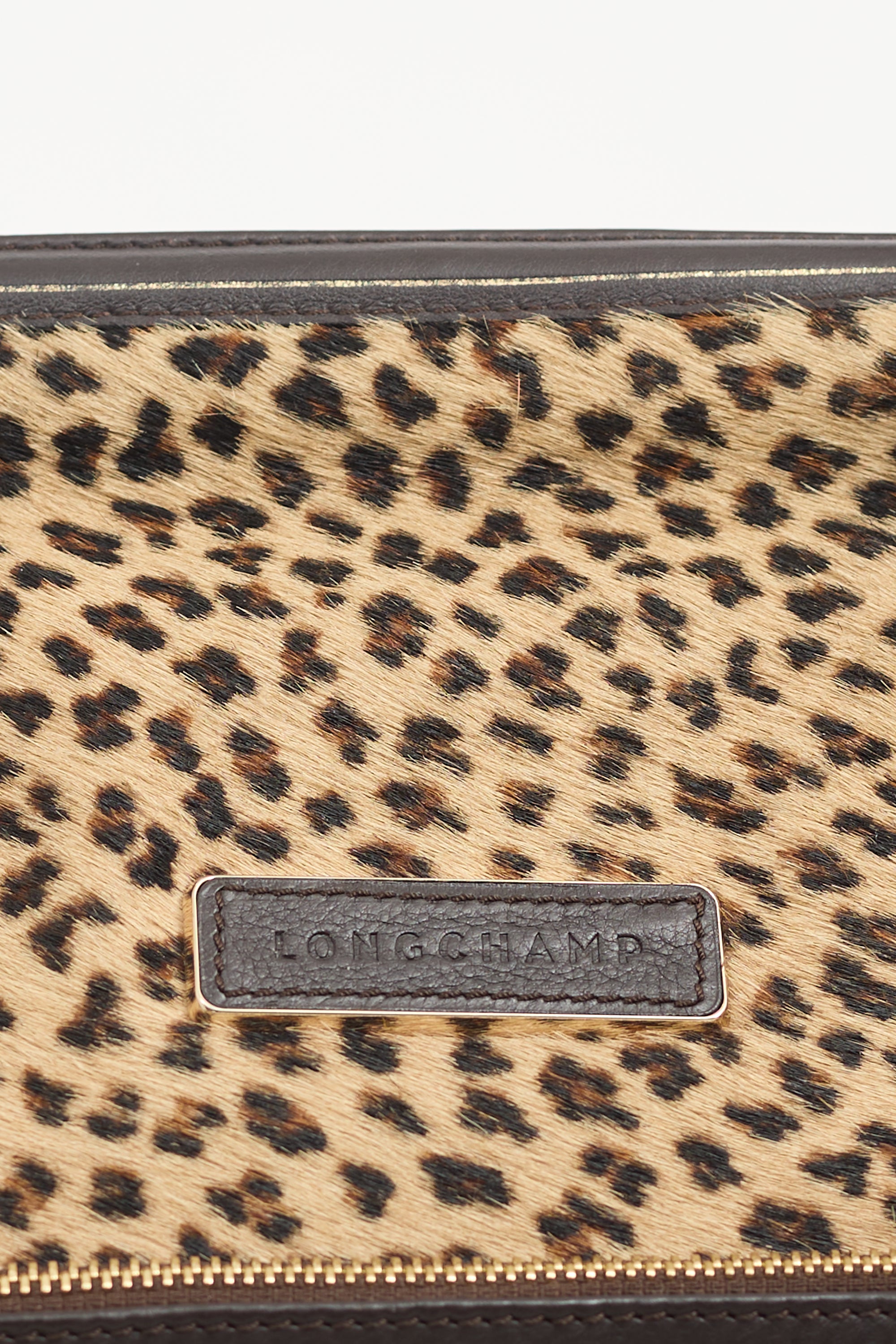 Pre-owned Longchamp brown Legende Frame bag featuring leopard printed pony hair exterior, frame top with zip closure, logo hardware at front, two zip pockets at front, leather trim, metal protective feet, two rolled top handles, lined main compartment, and two zip pockets inside. Comes with original dust bag.