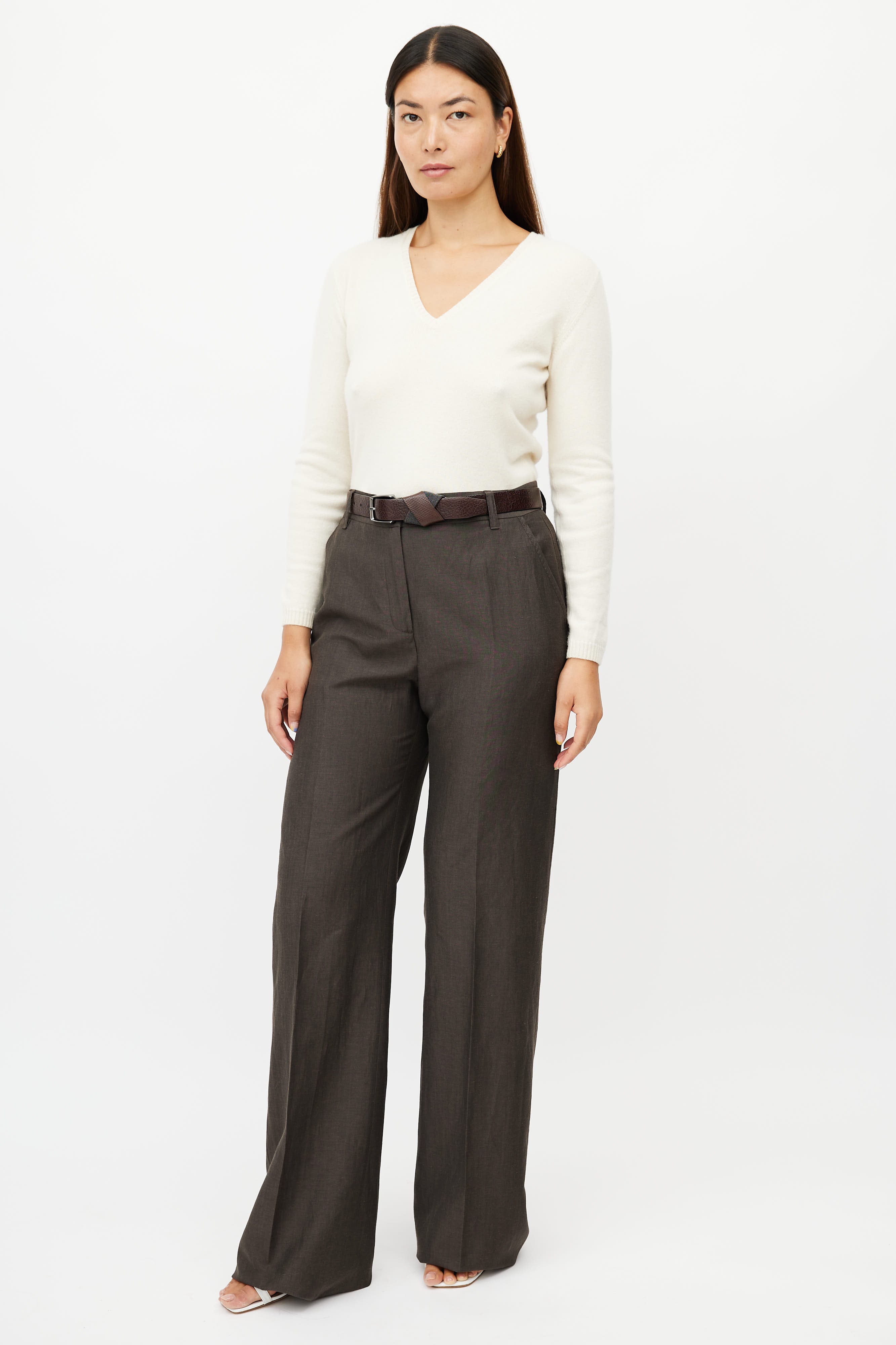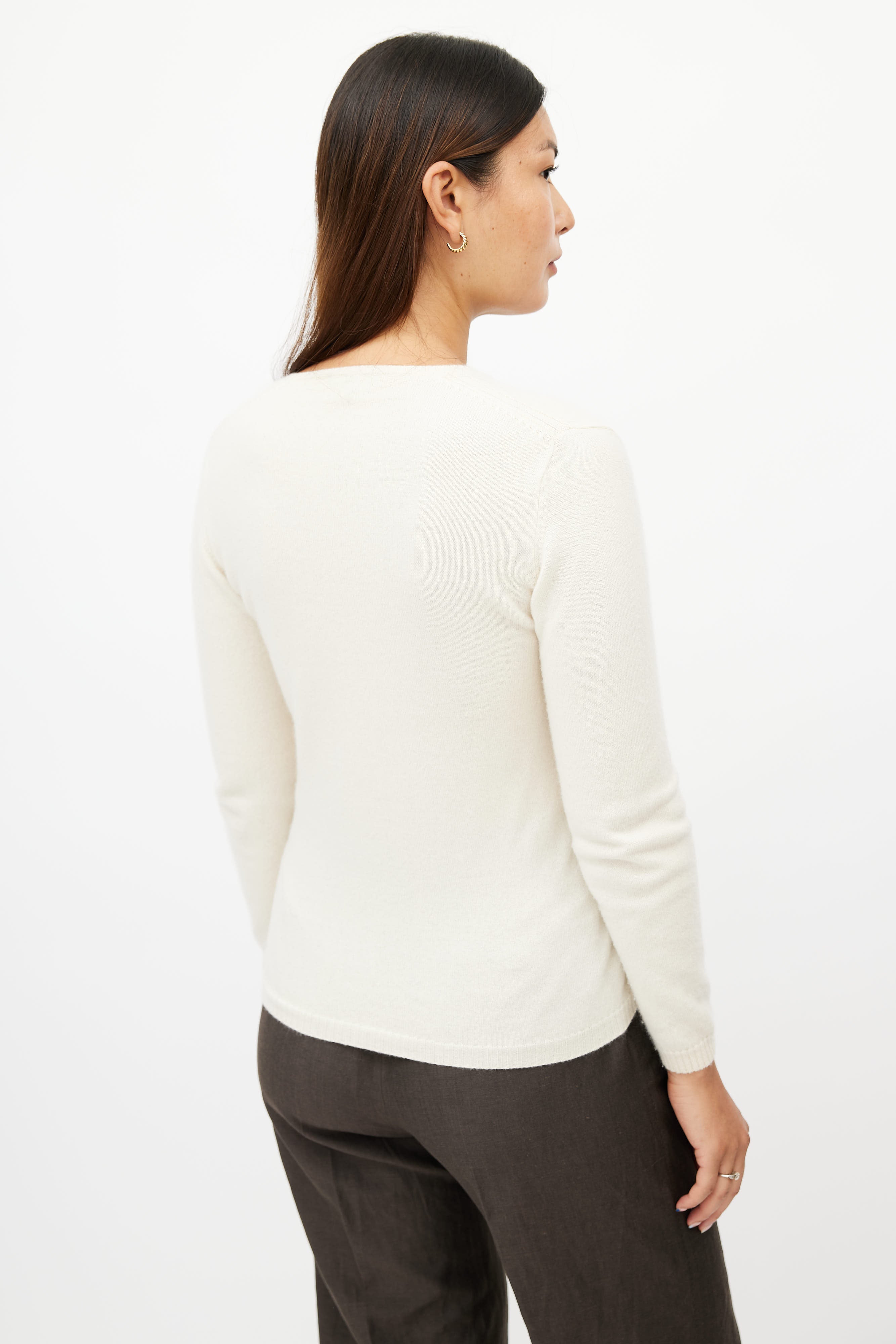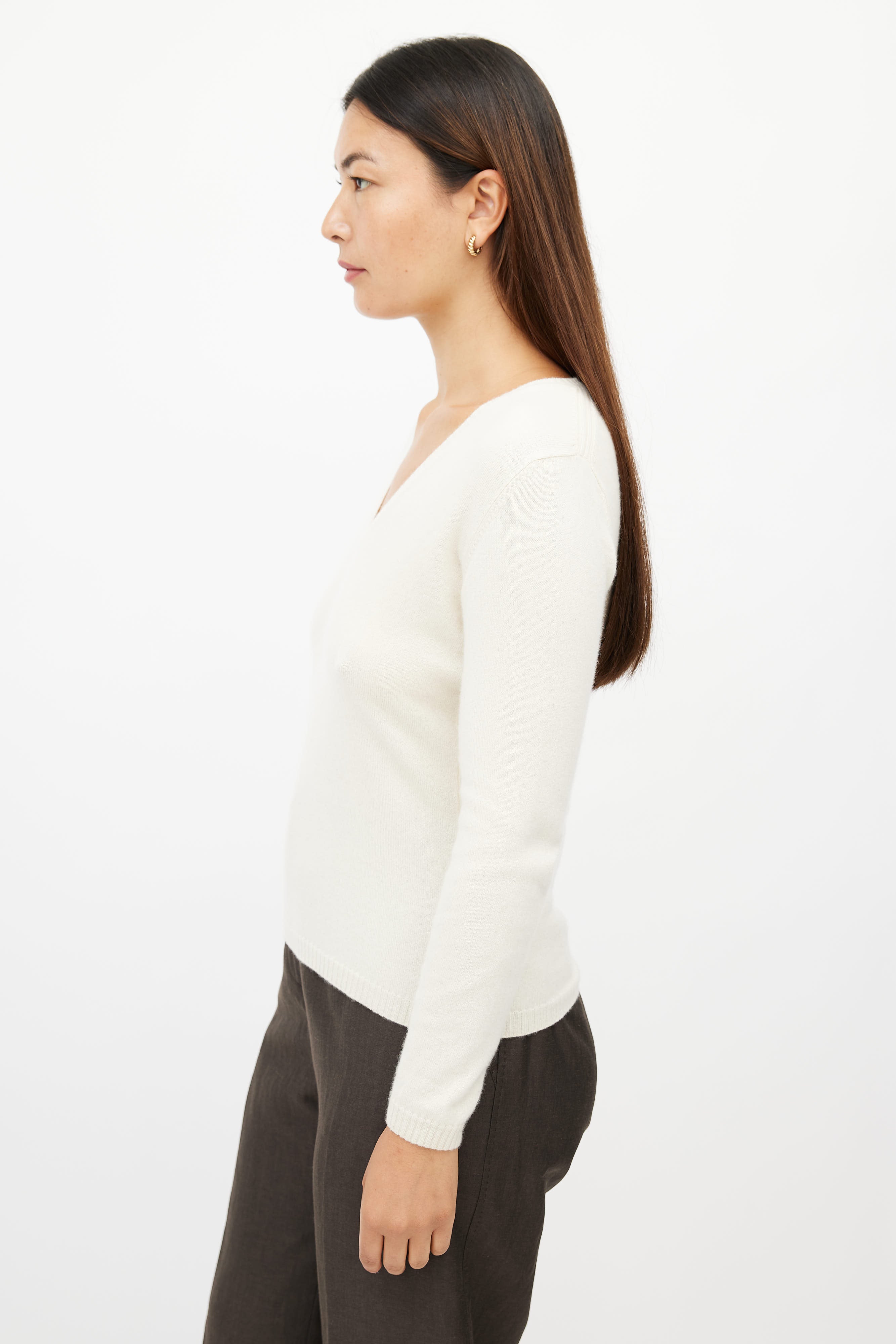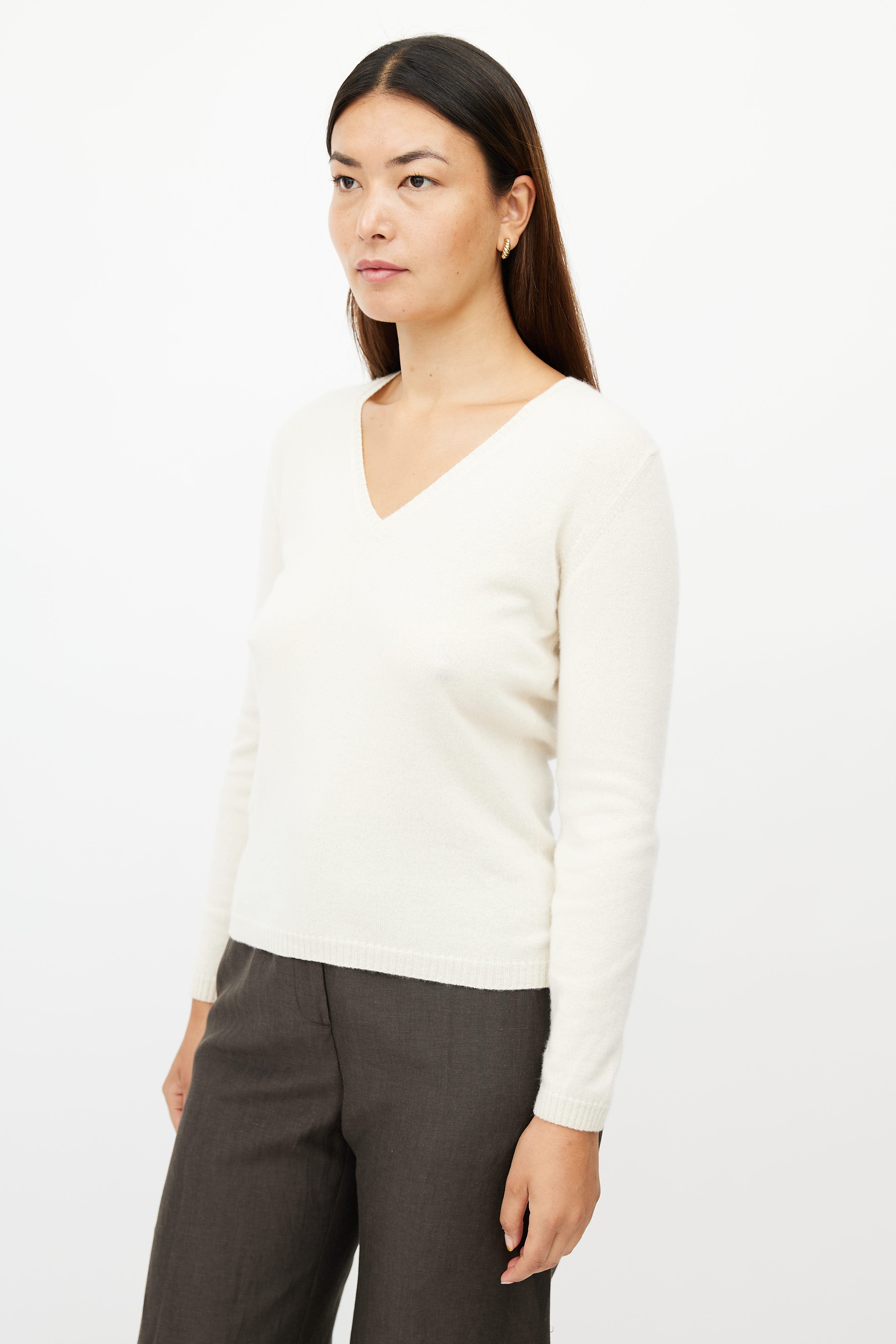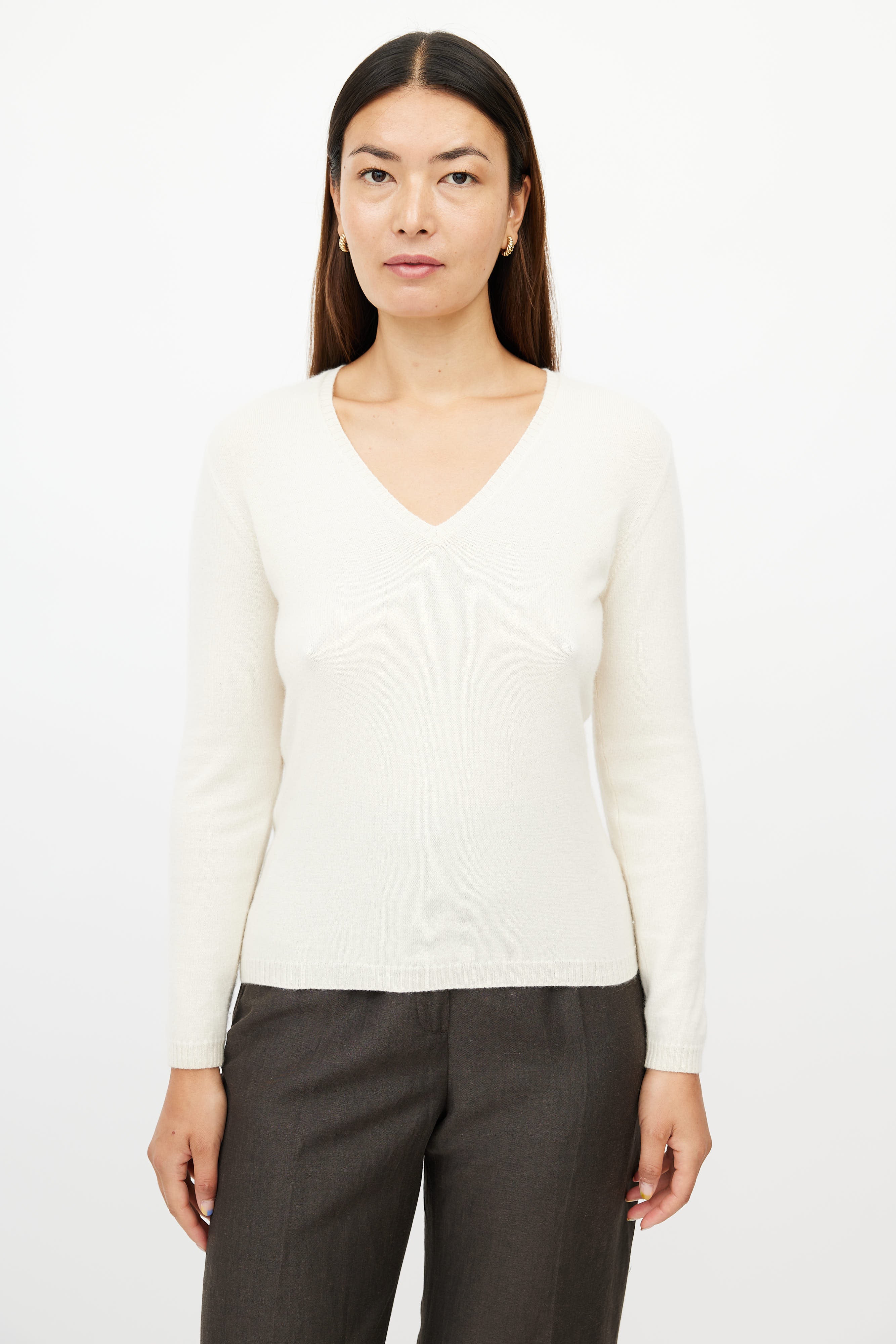 Pre-owned Loro Piana cream cashmere sweater featuring V-neckline, long sleeves, and ribbed hem.