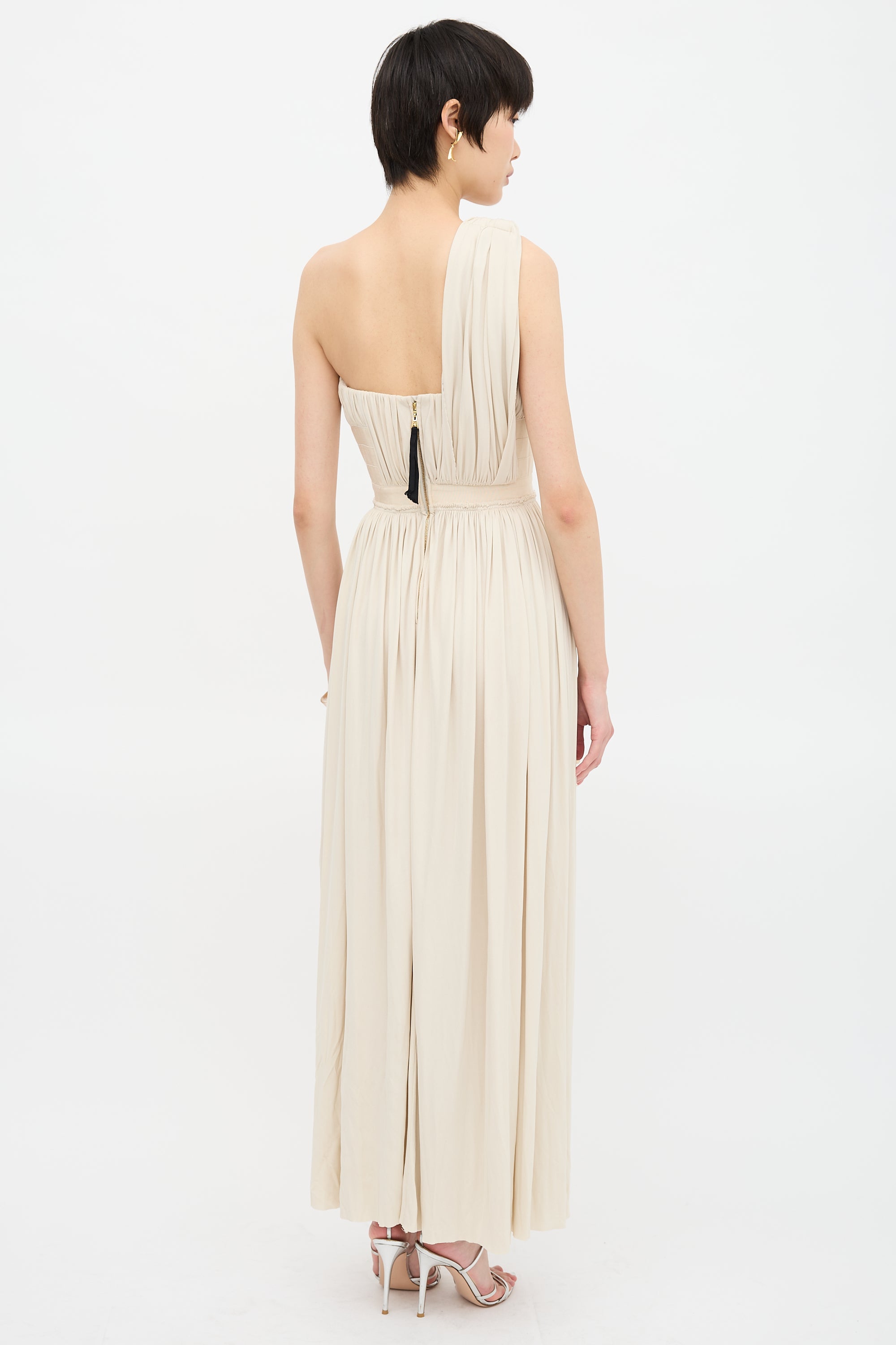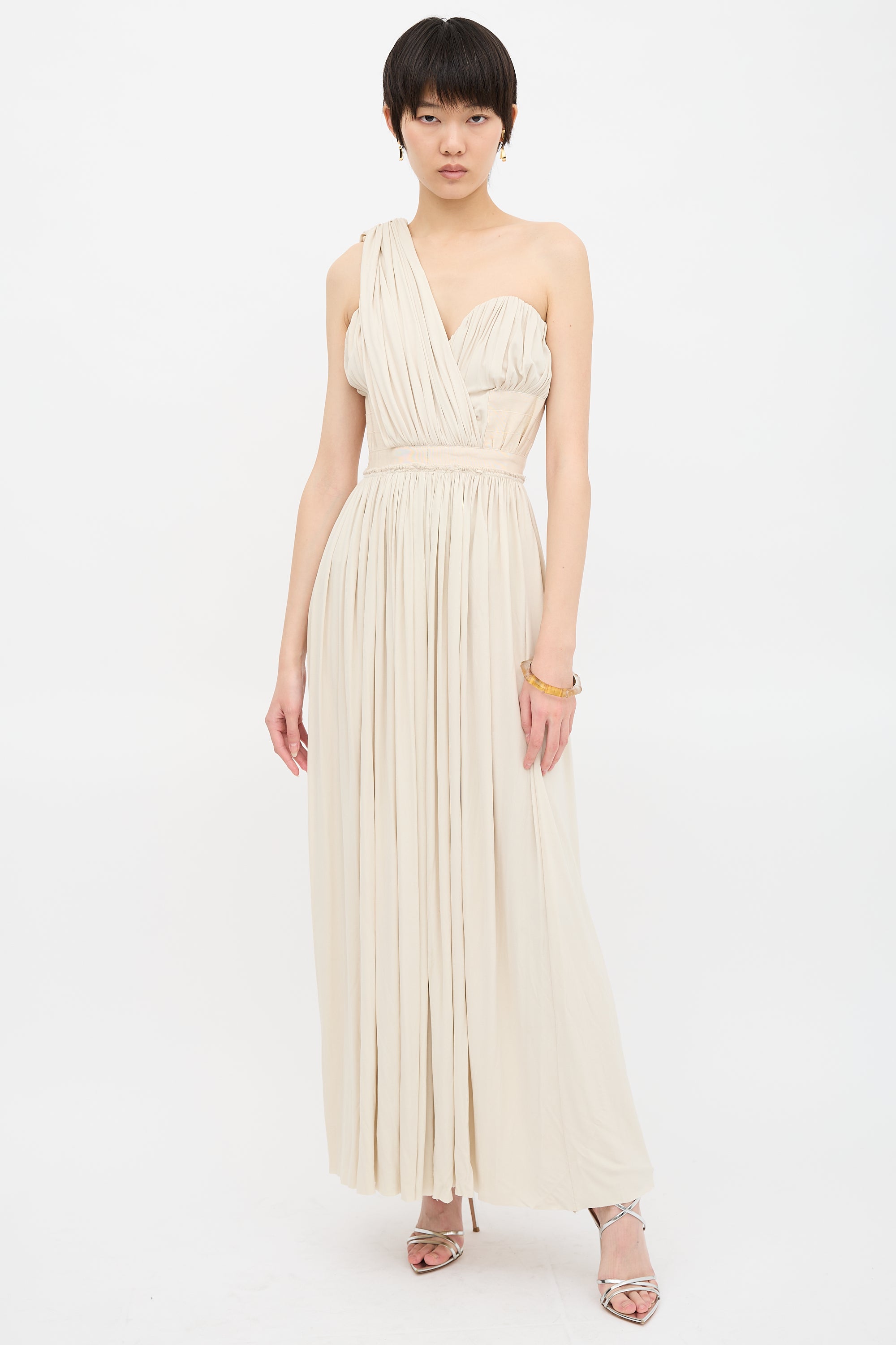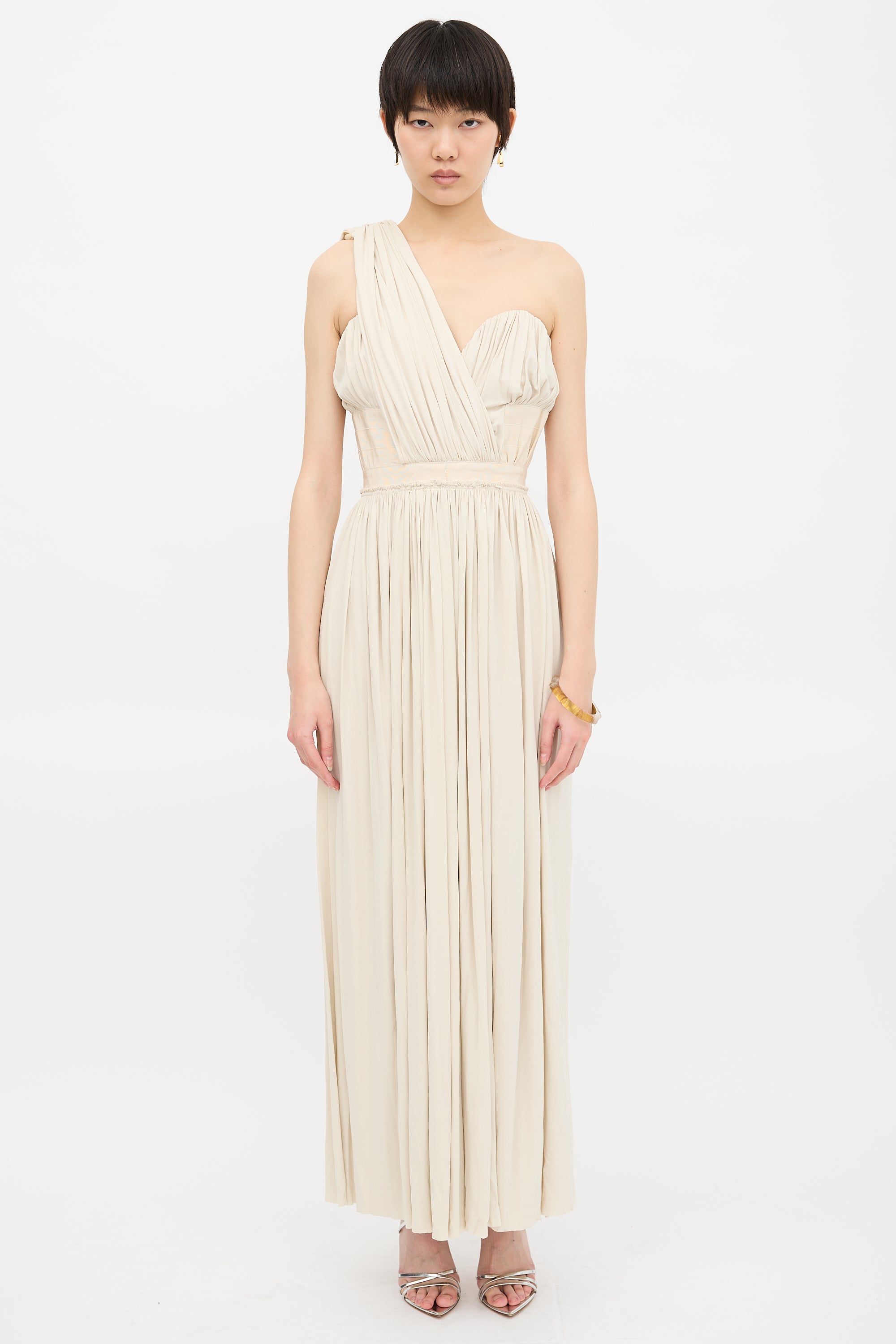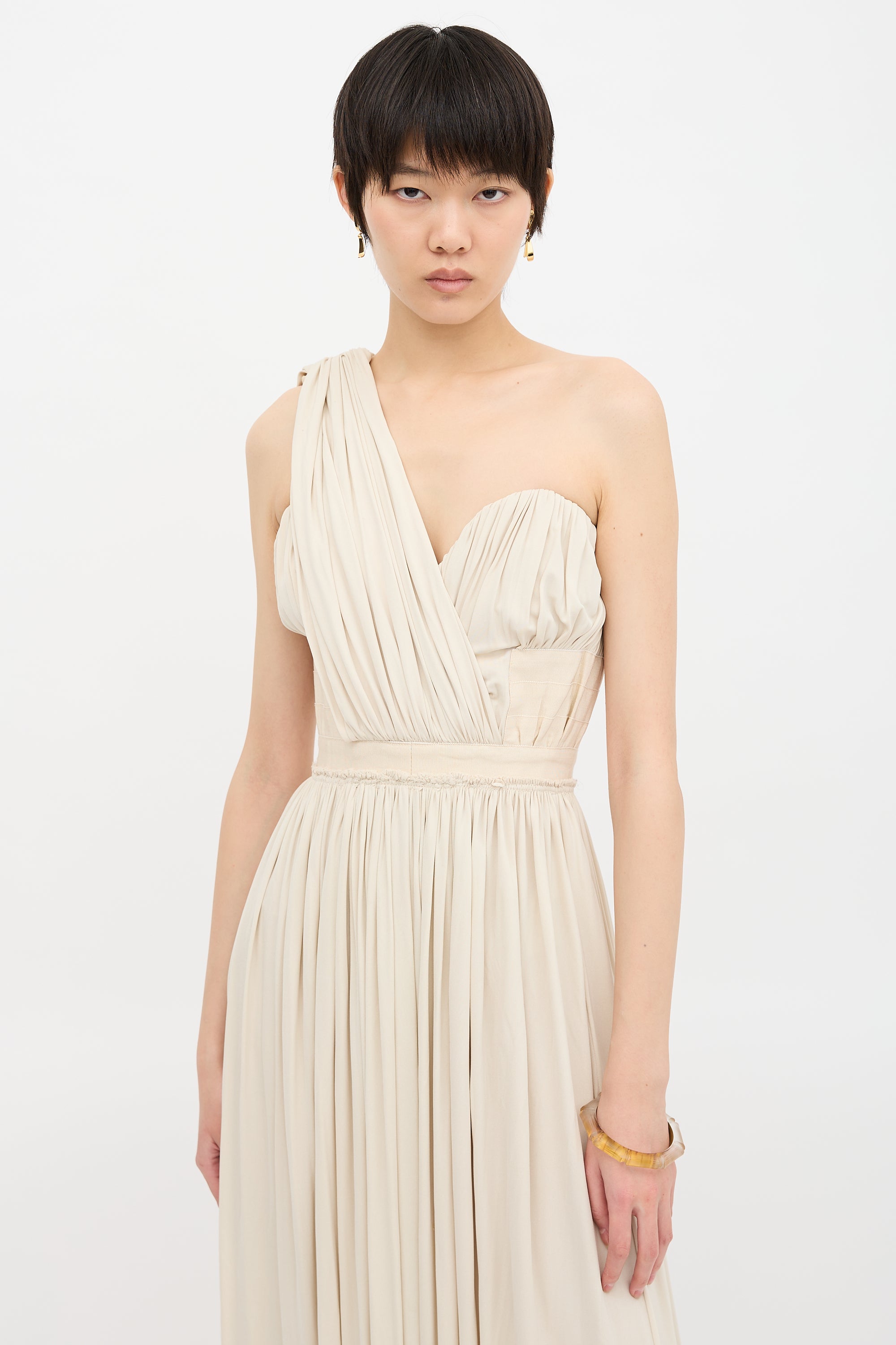 Pre-owned Louis Vuitton beige gown featuring sweetheart neckline, one shoulder drape design, tonal grosgrain waistband, gathered waist, raw hem, back zip closure, and interior top structure with boning.
