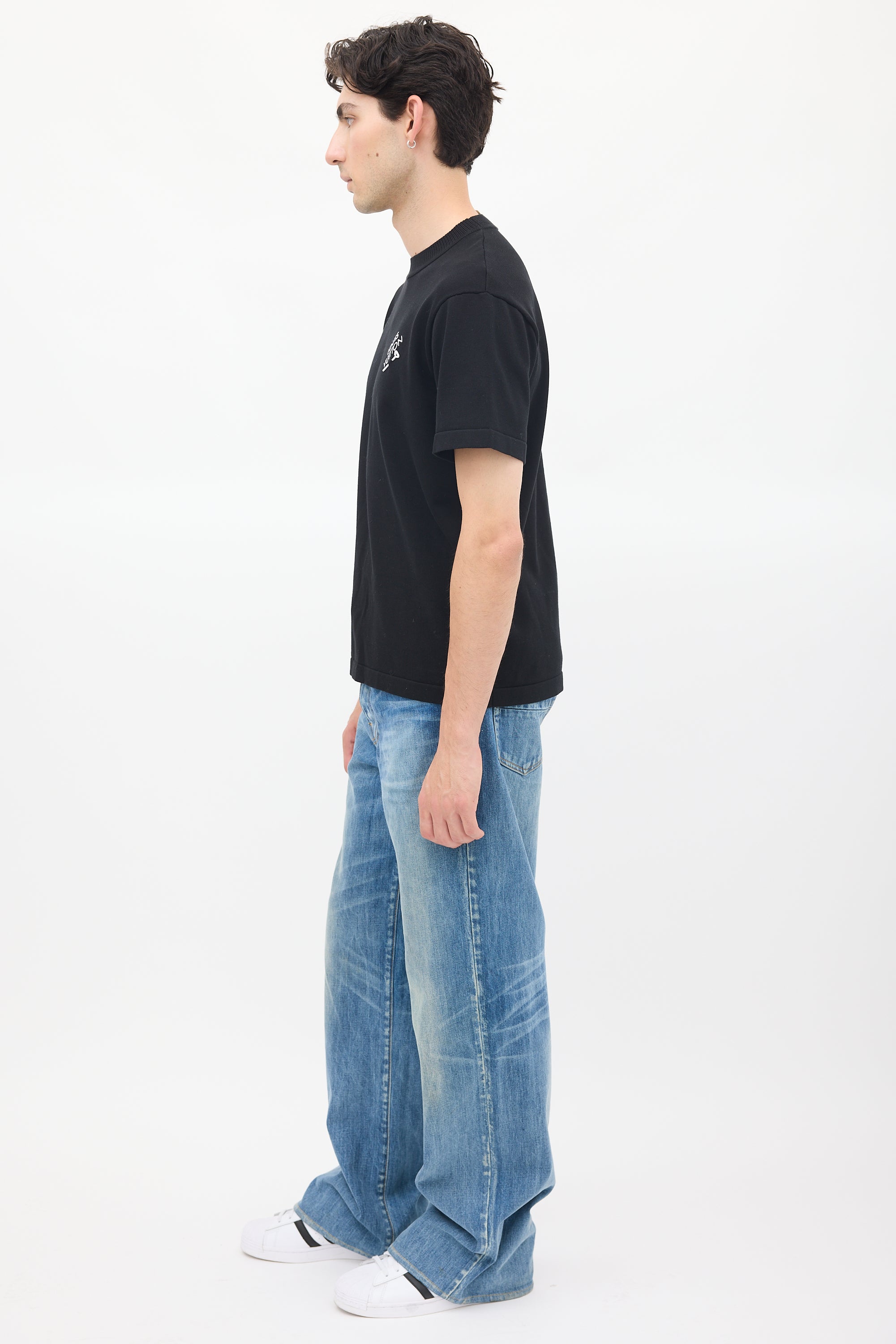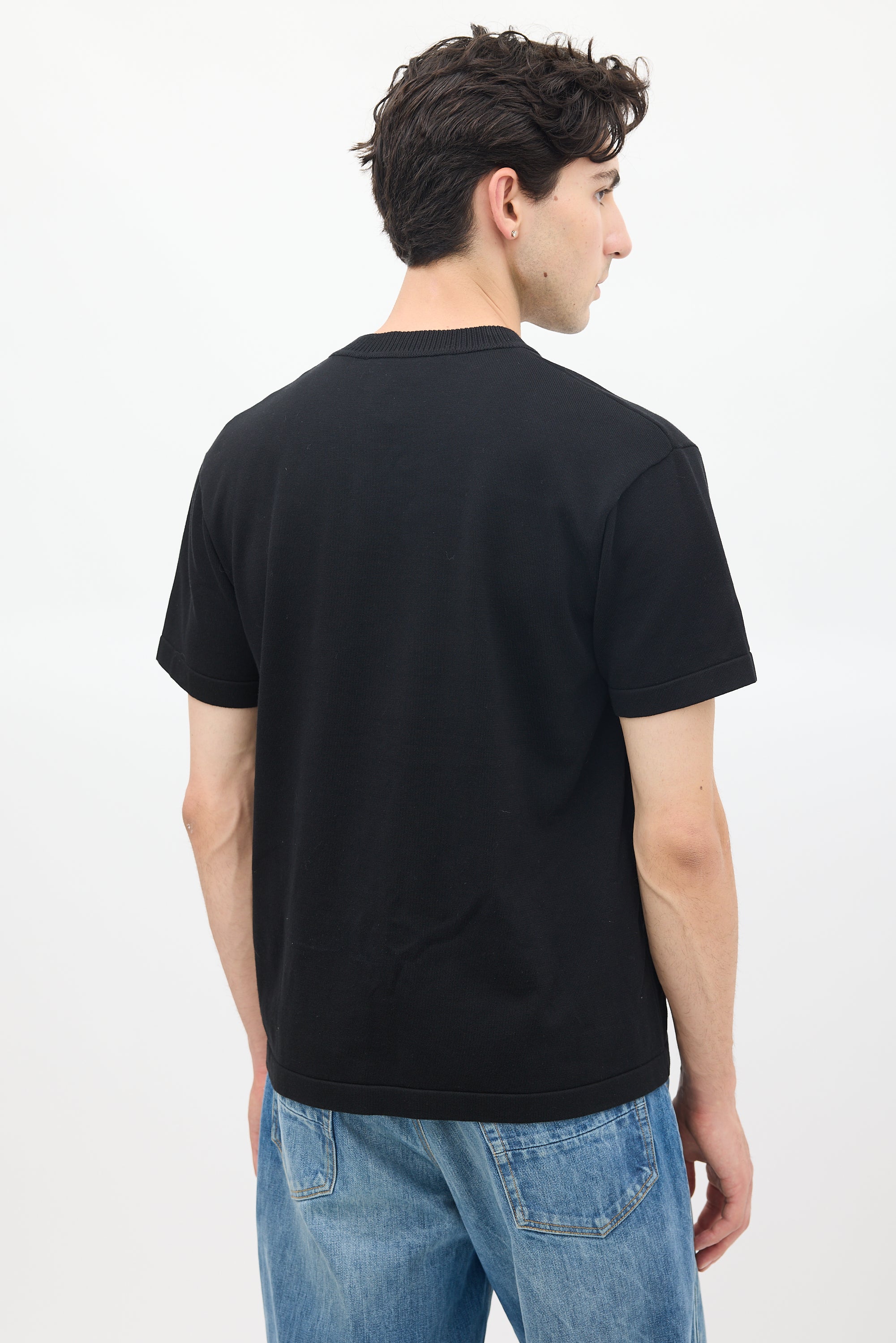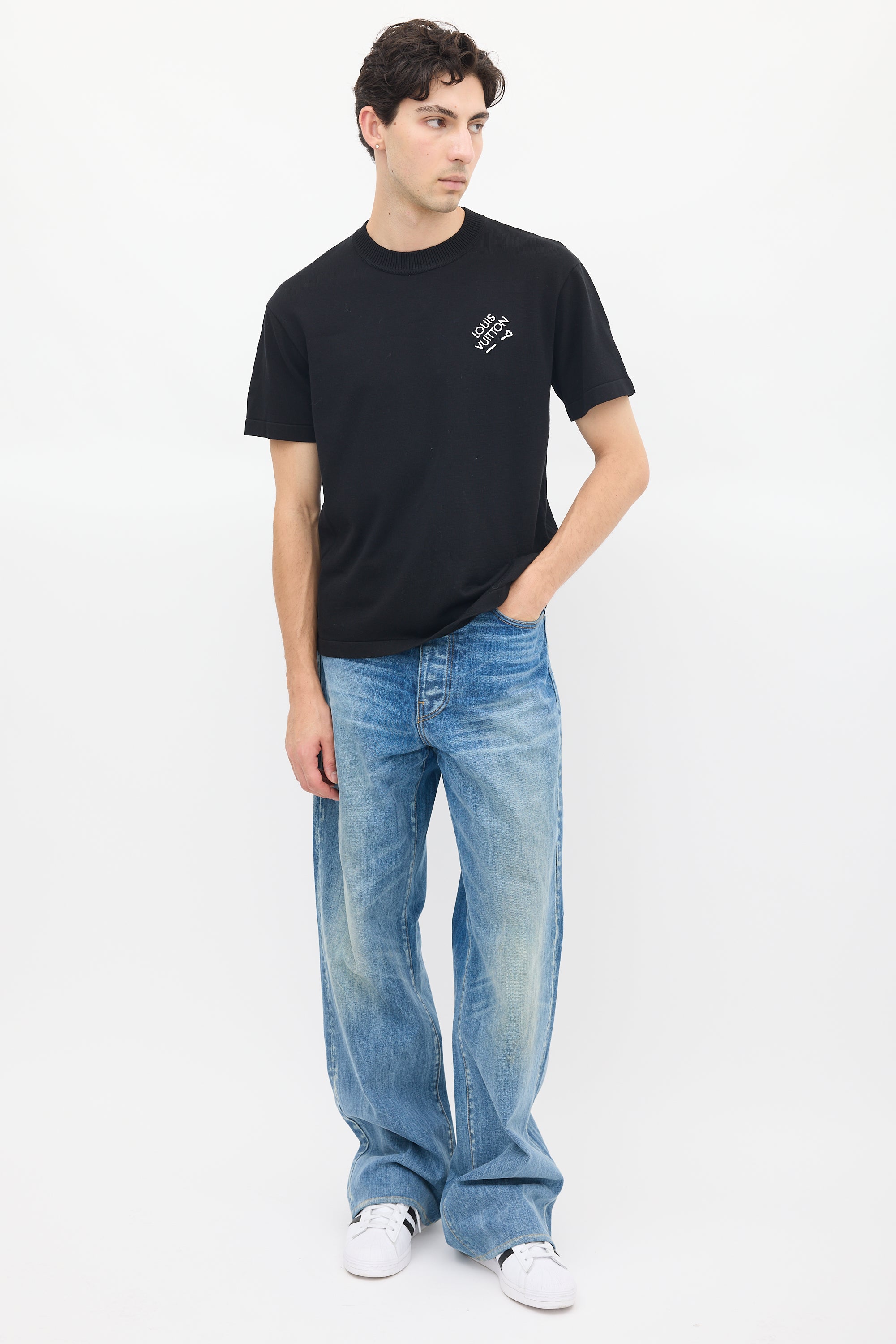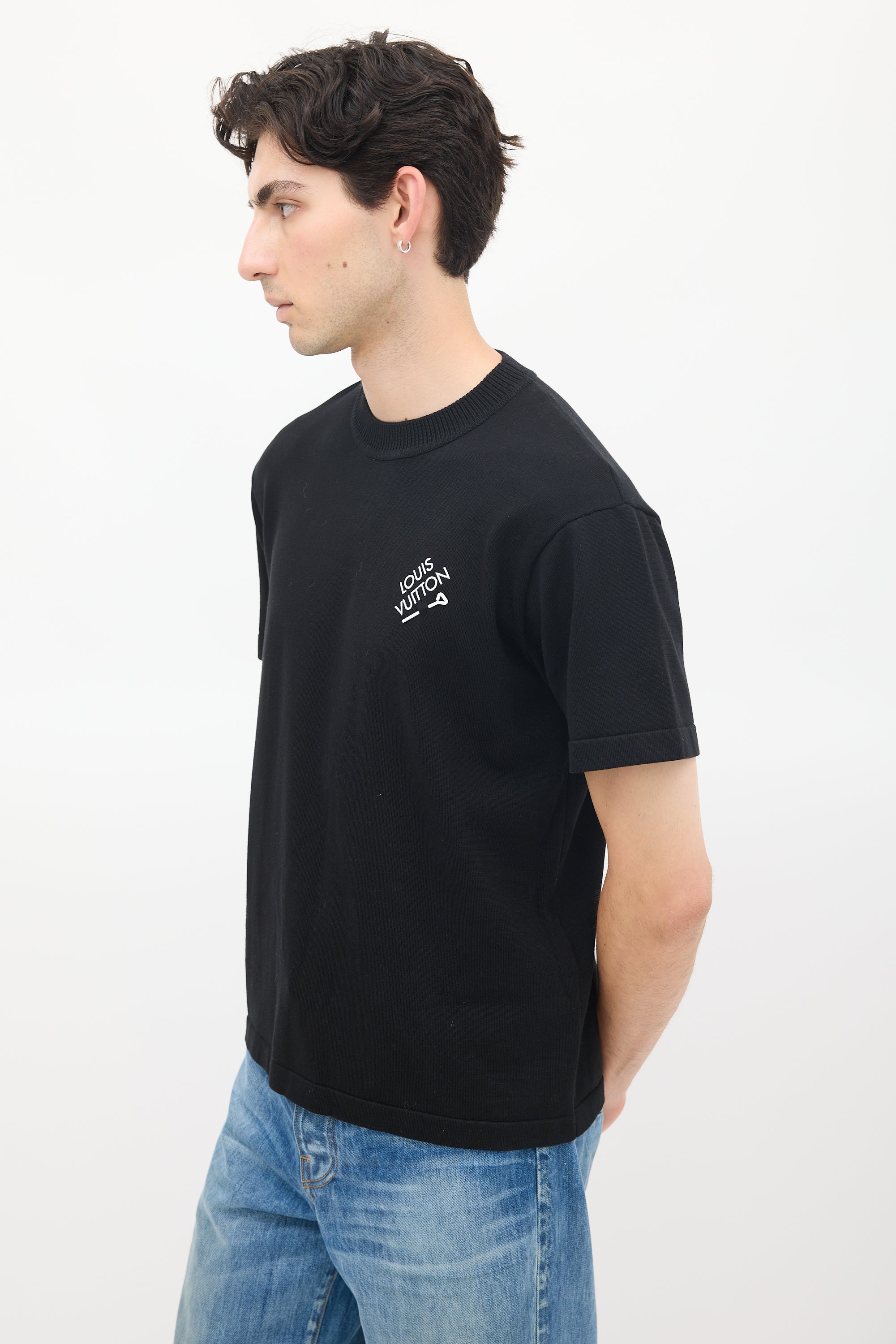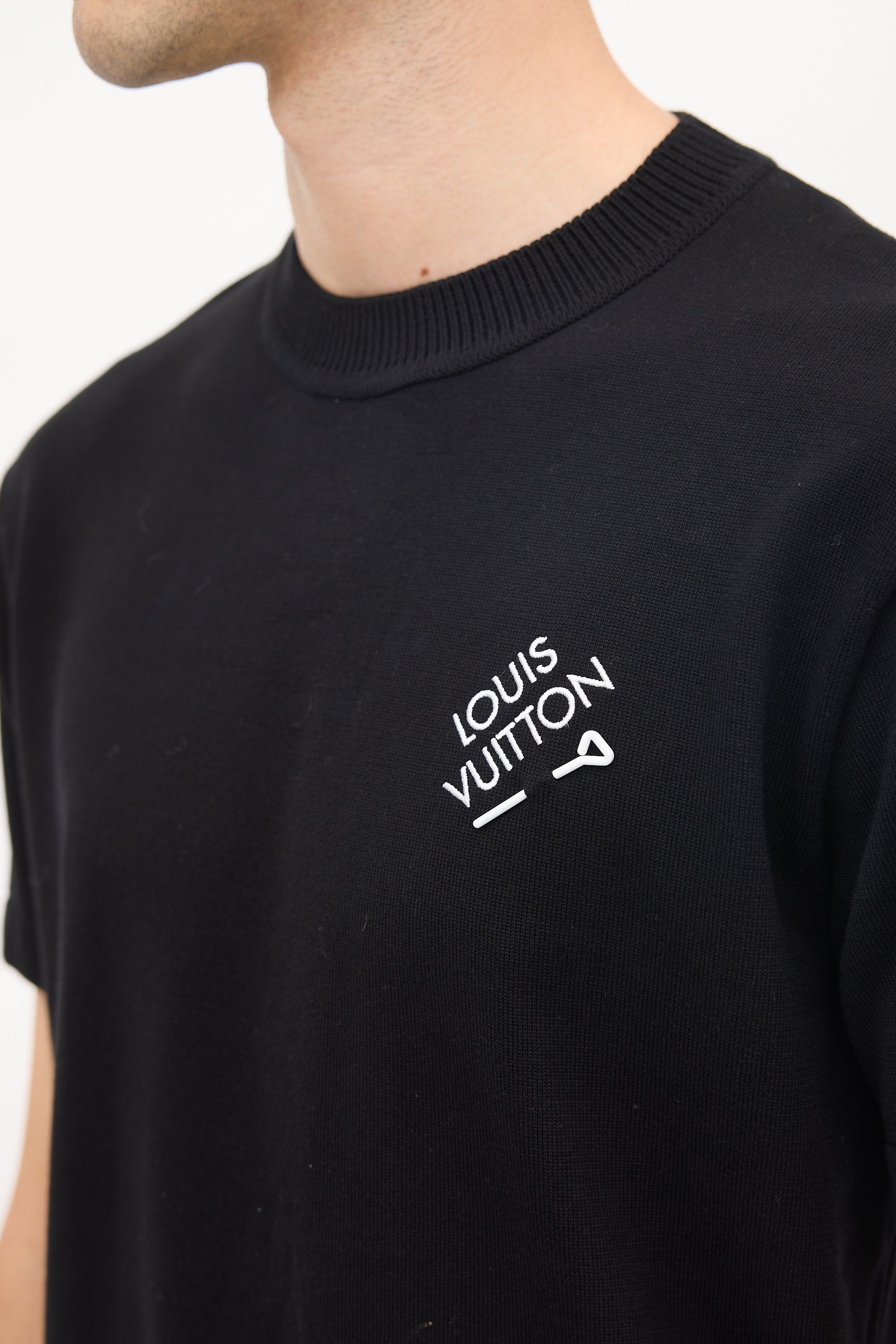 Pre-owned Louis Vuitton black knit T-shirt featuring a ribbed round neckline, white embroidered logo with staple pin embellishment at left chest, even hem, and short sleeves.