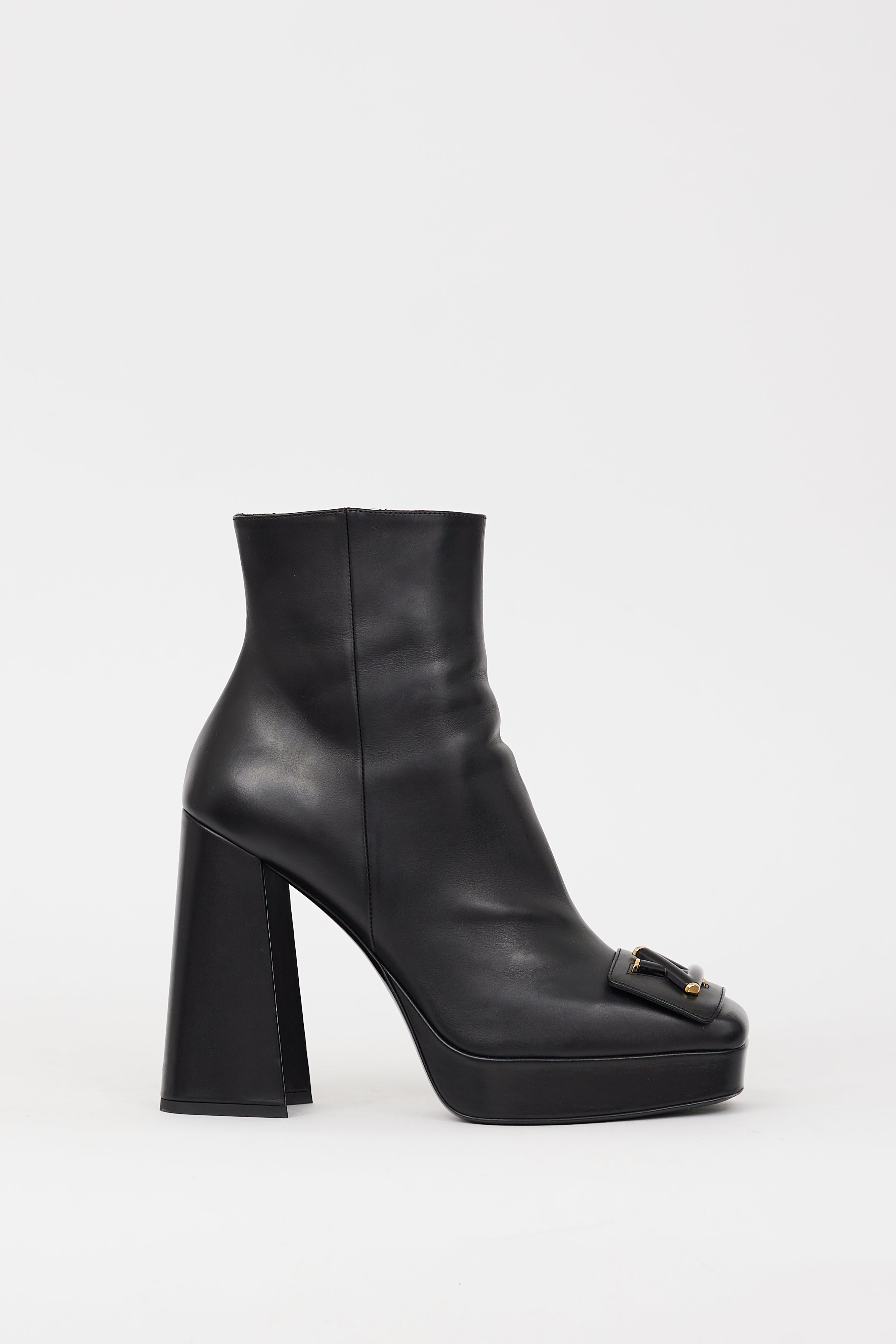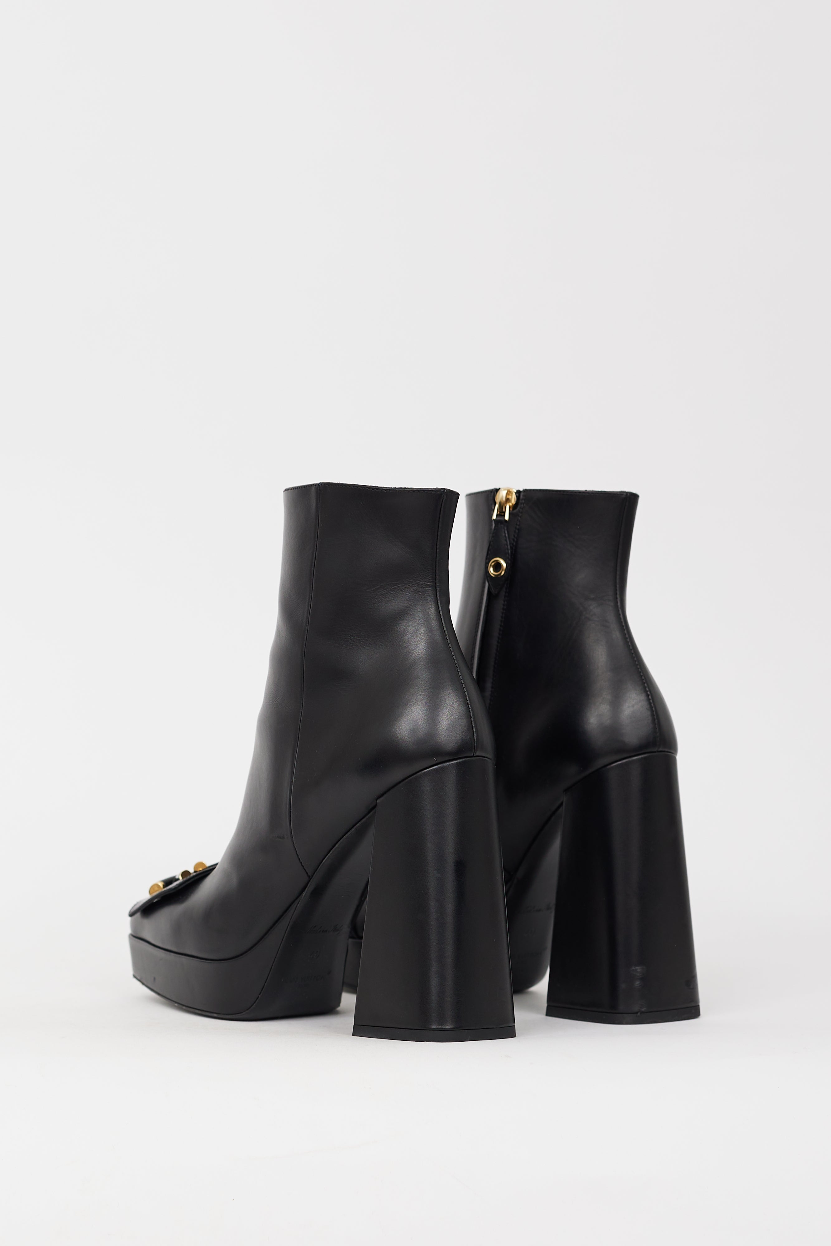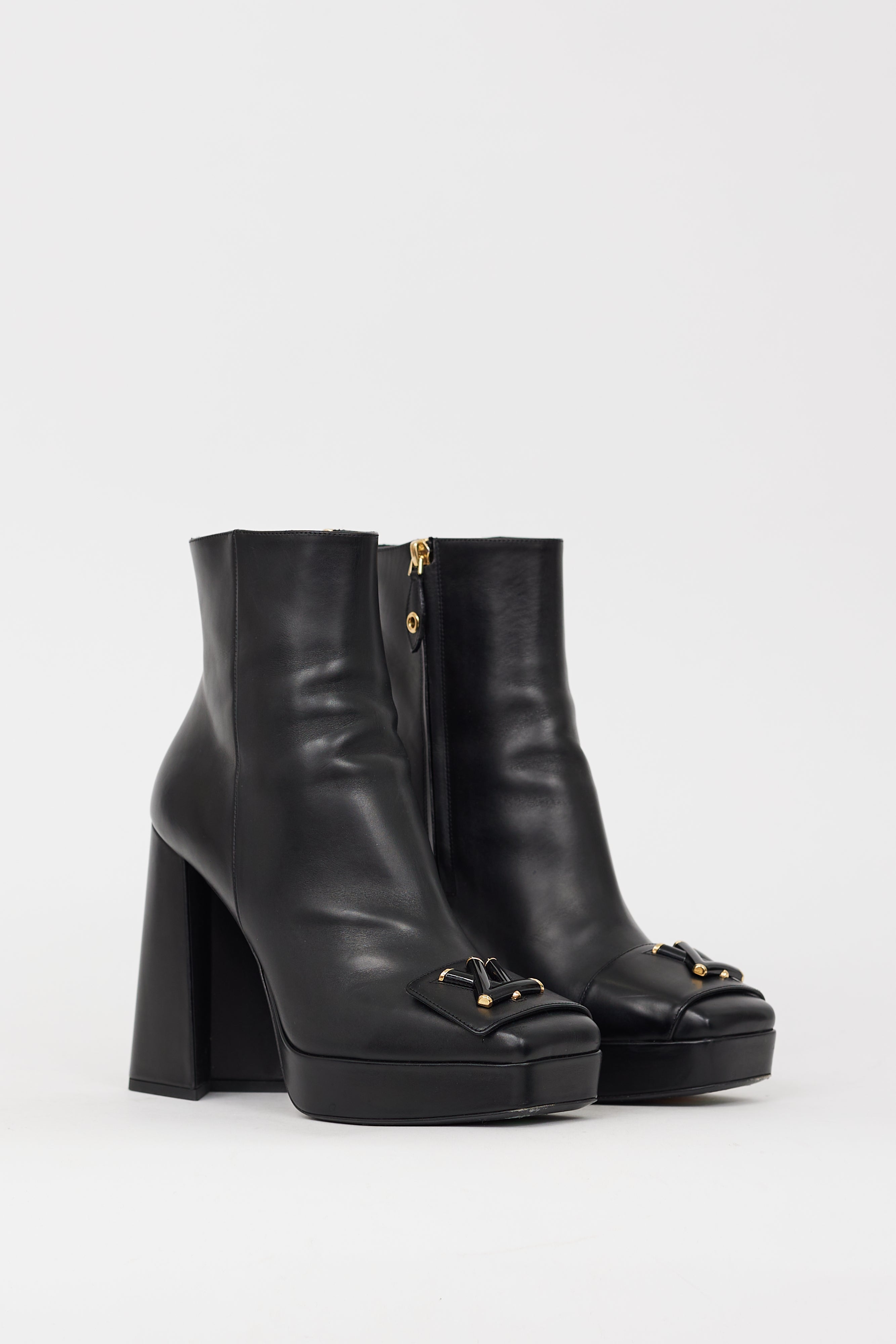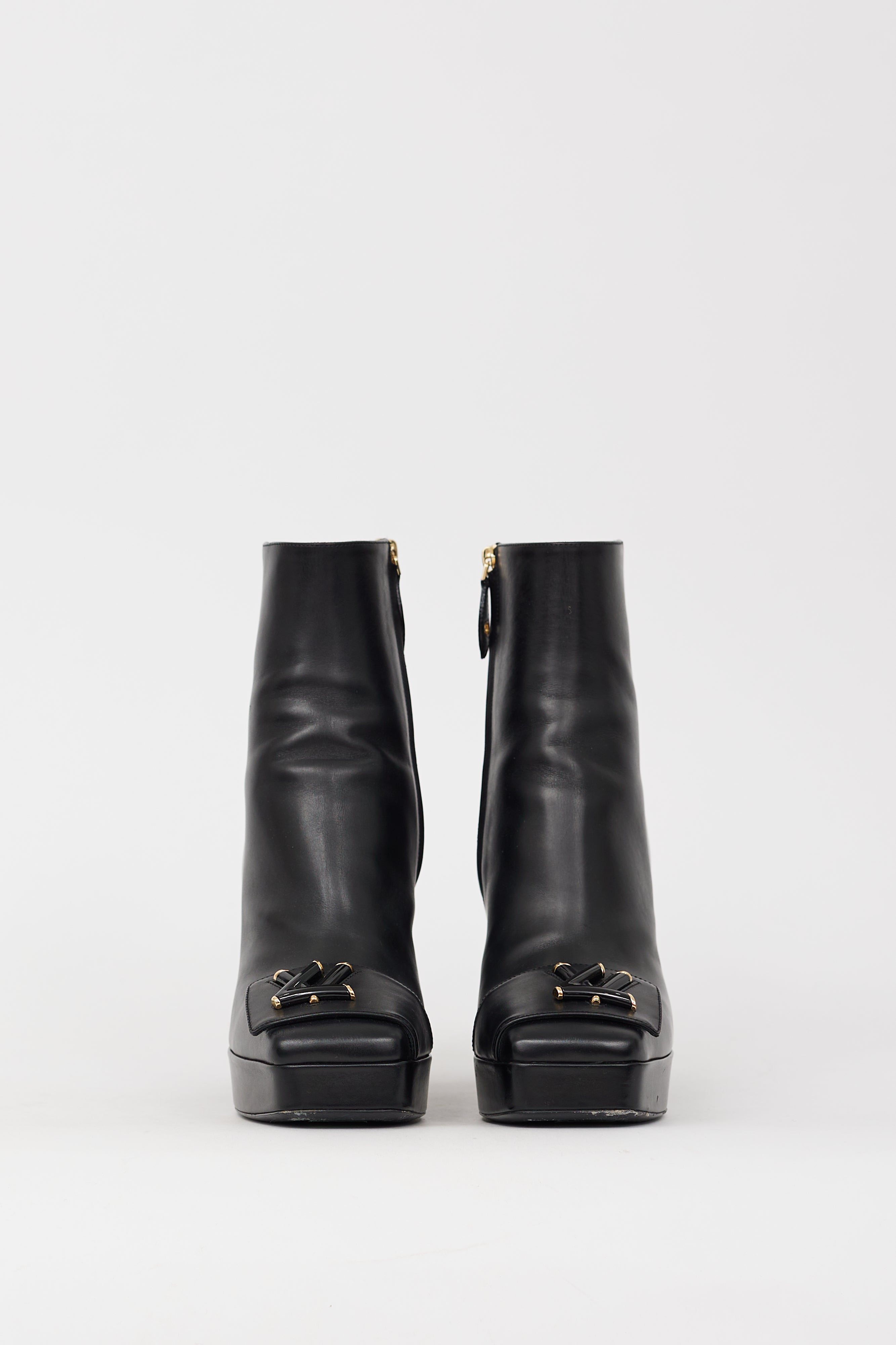 Pre-owned Louis Vuitton black leather Shake platform boots featuring square toe, black and gold LV logo hardware at toe strap, zip closure at inner side, slanted block heel, and platform toe box. Comes with original dust bag.
