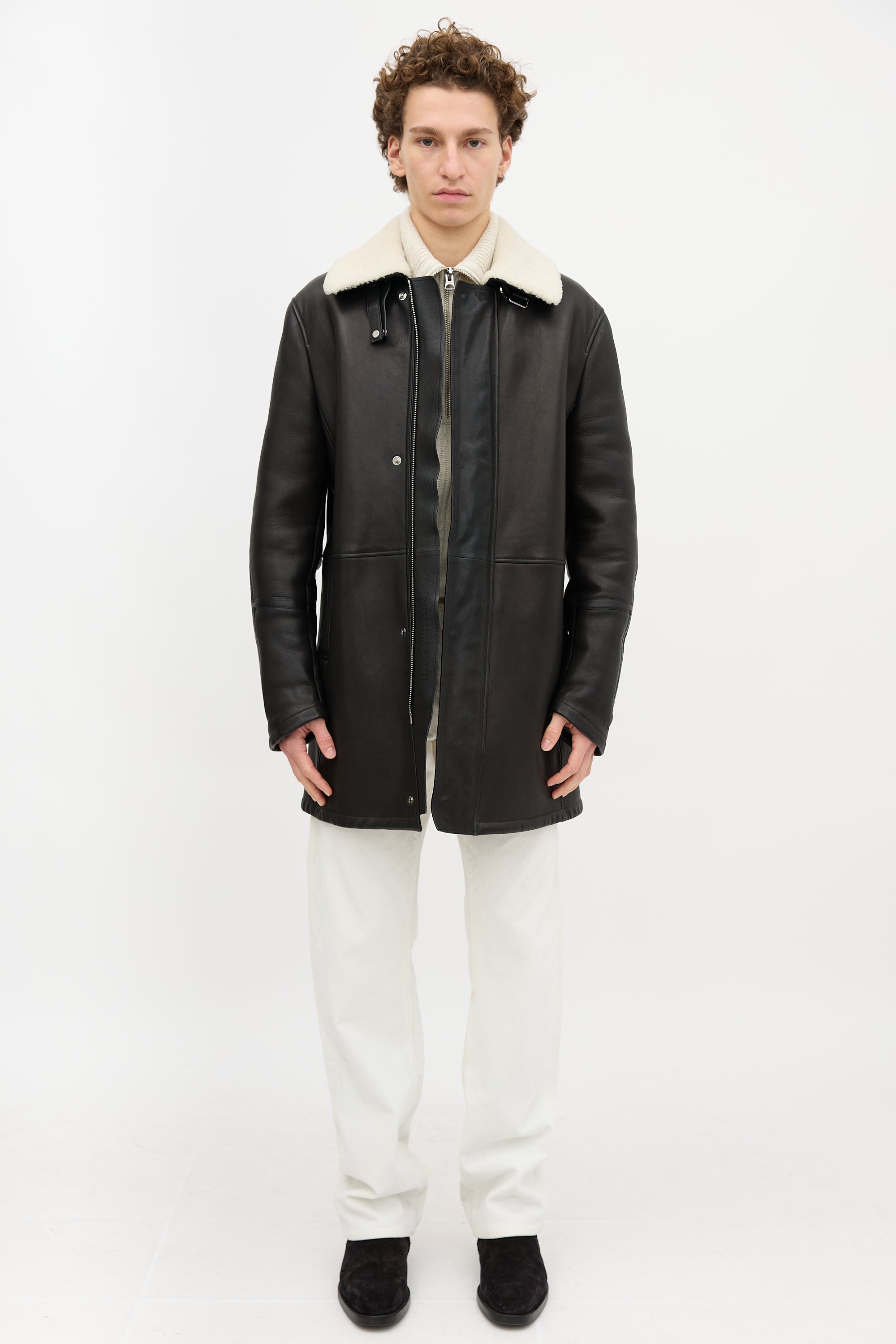 Pre-owned Louis Vuitton black leather jacket featuring a cream shearling point collar with strap fastening, concealed zip front with snap button placket and perforated logo at interior, shearling interior, two welt pockets at front, and padded elbow. Lined.