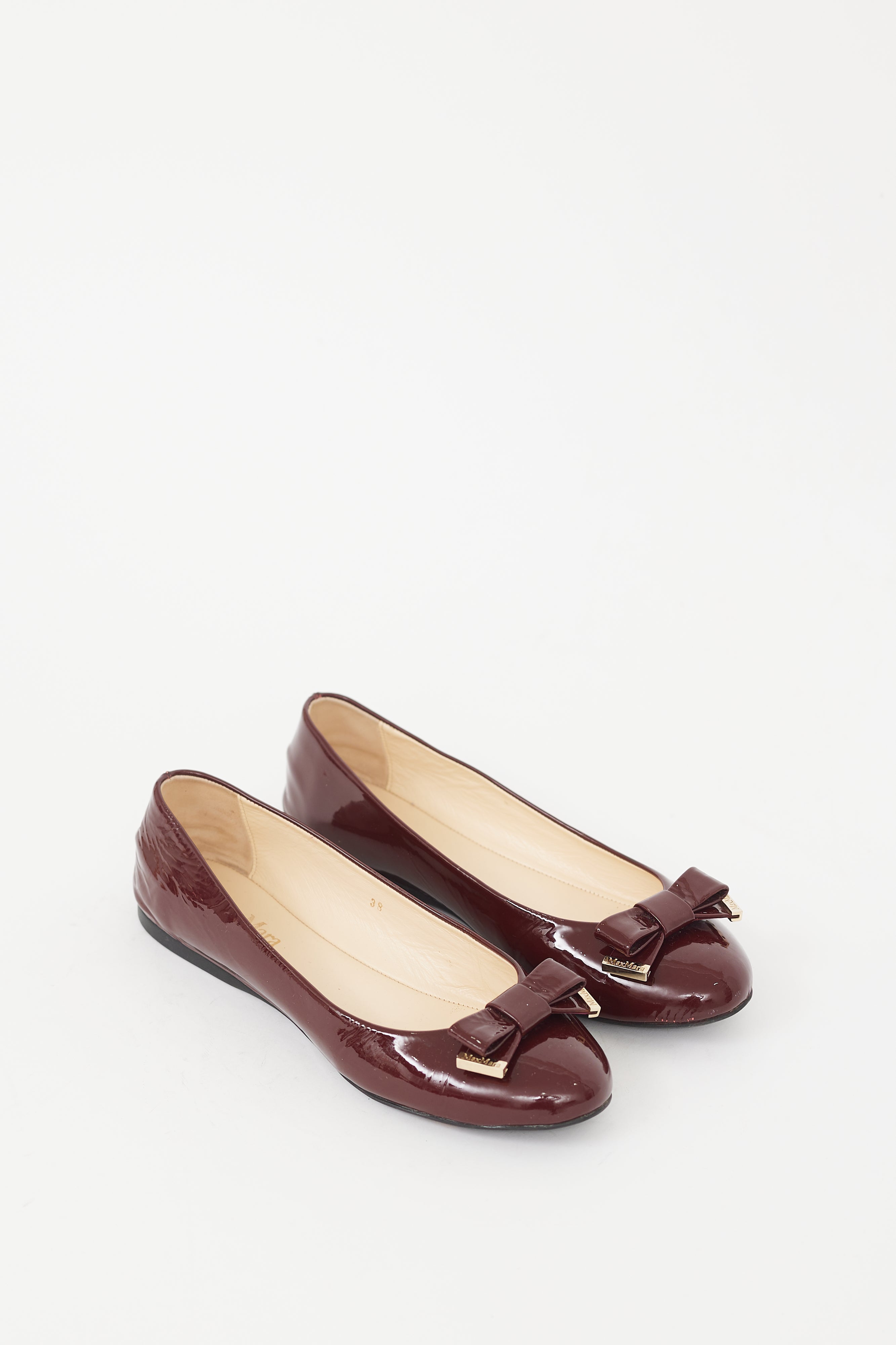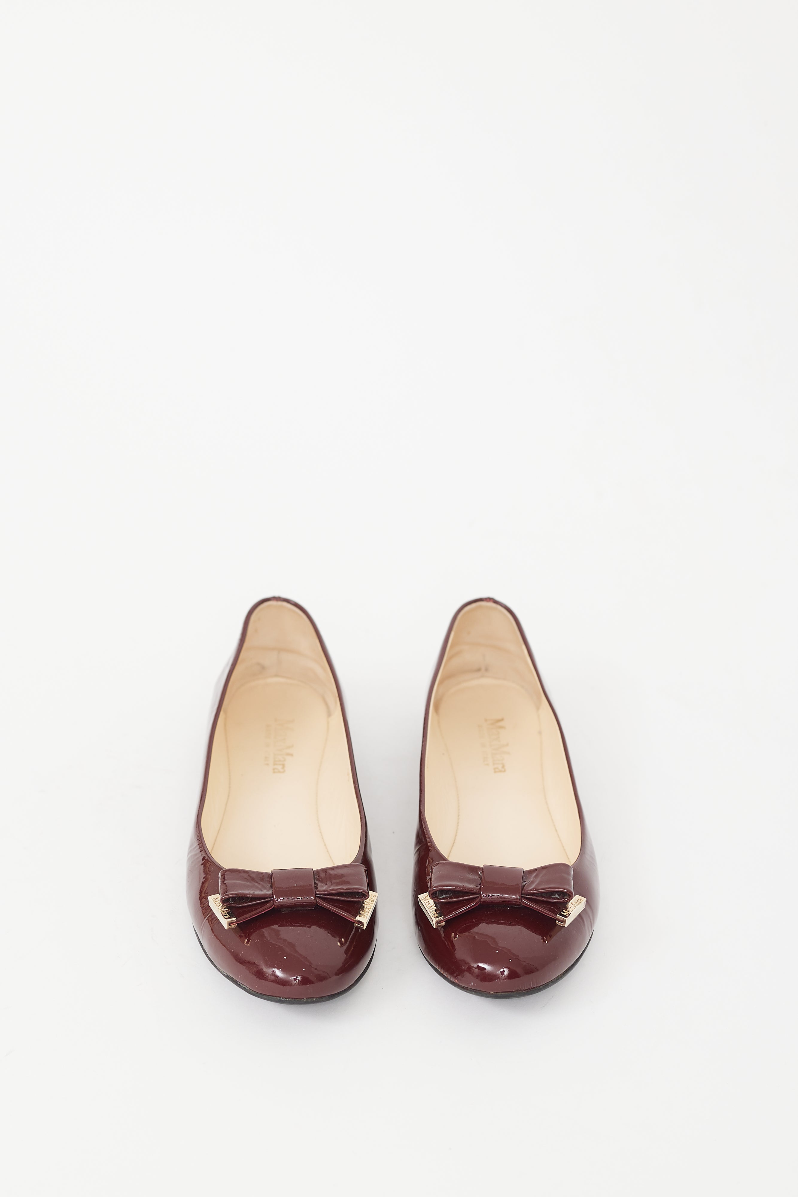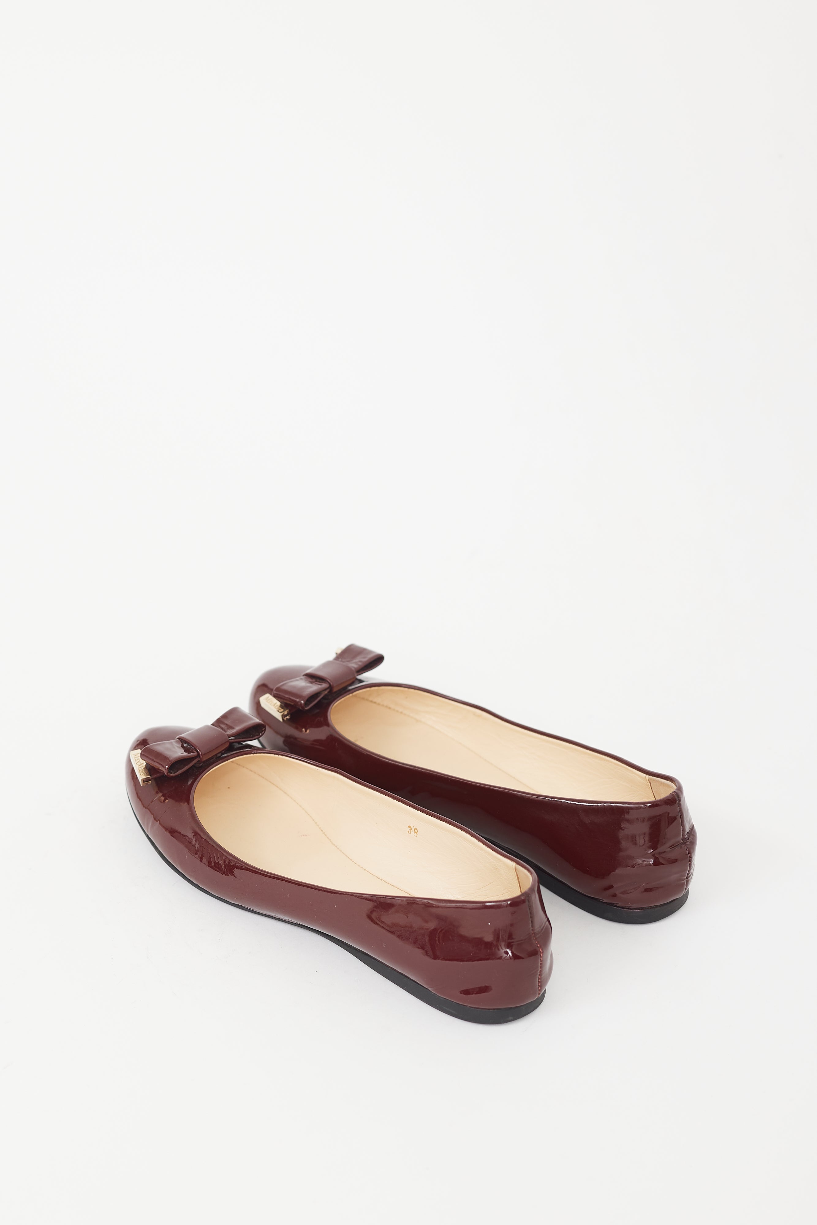 Pre-owned Max Mara patent leather burgundy ballet flats featuring tonal bow on toe with gold tone hardware, leather insole and slip on entry.