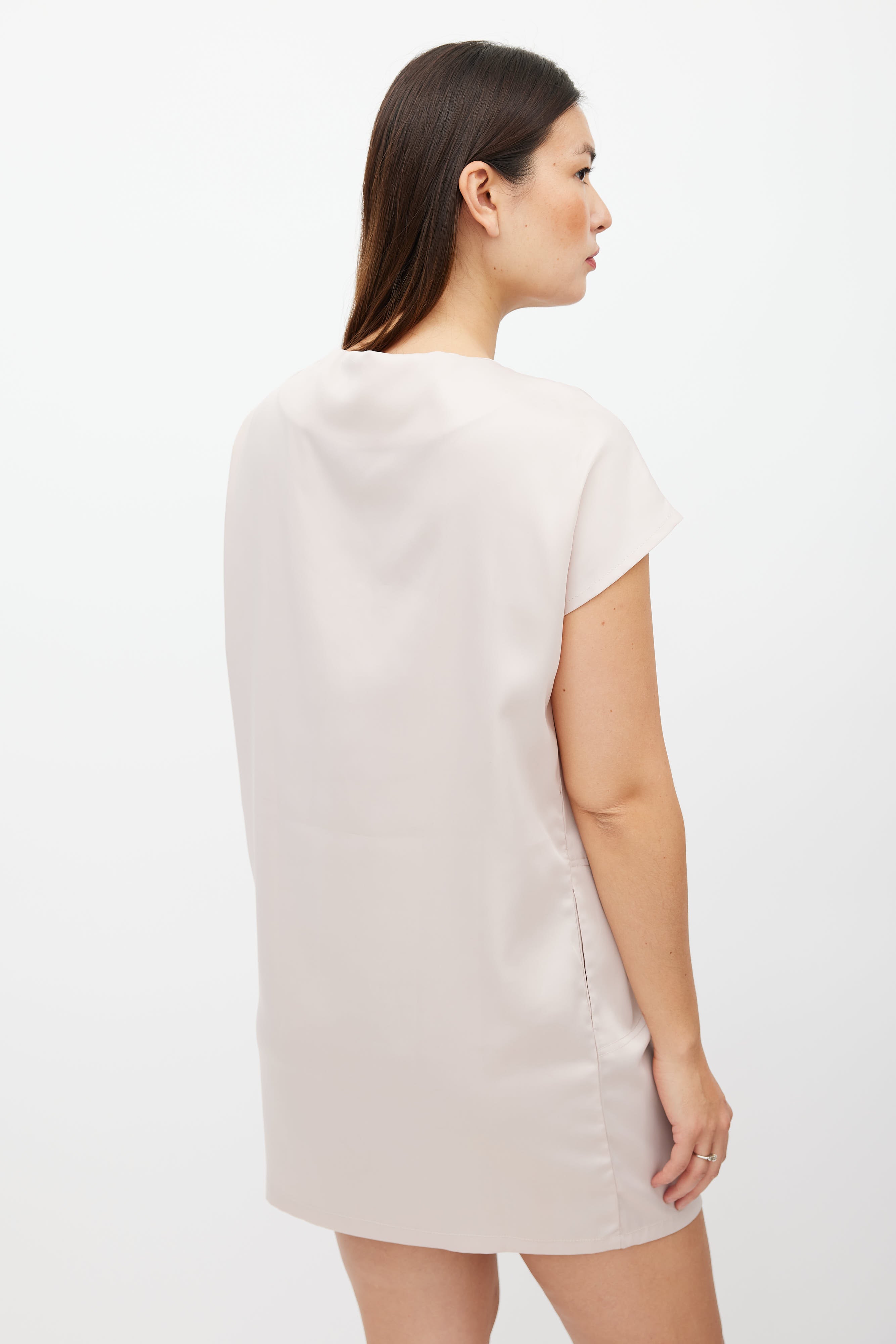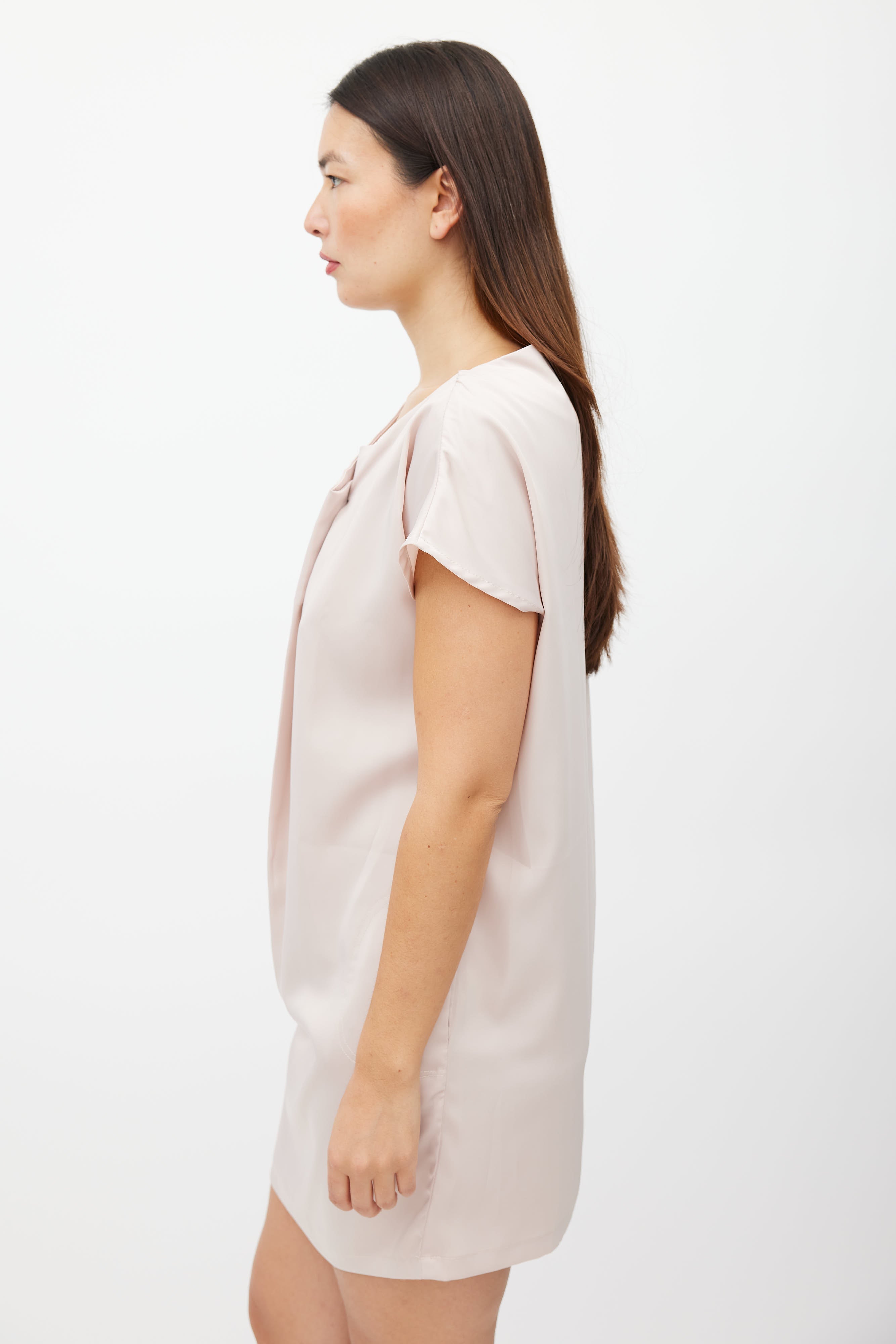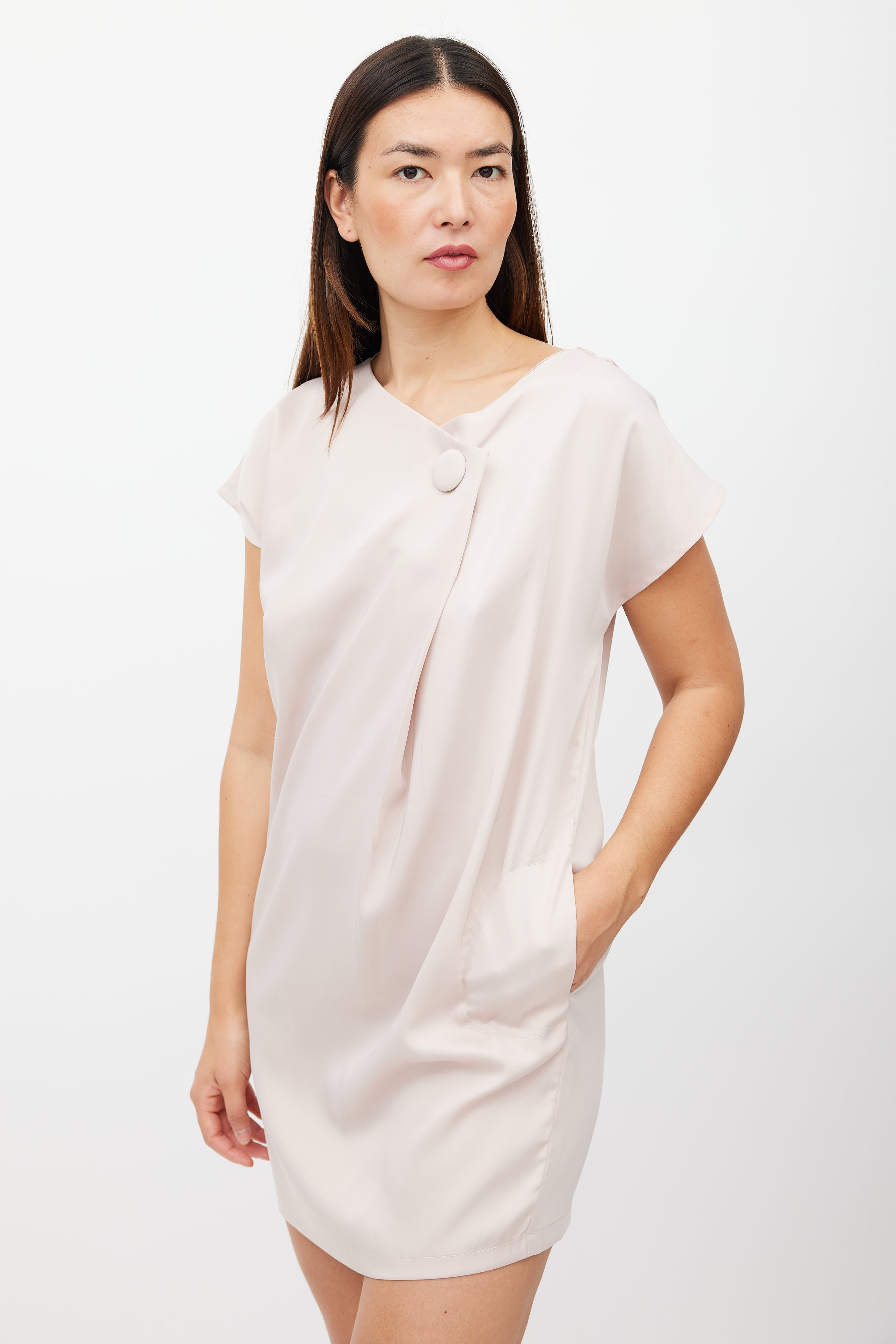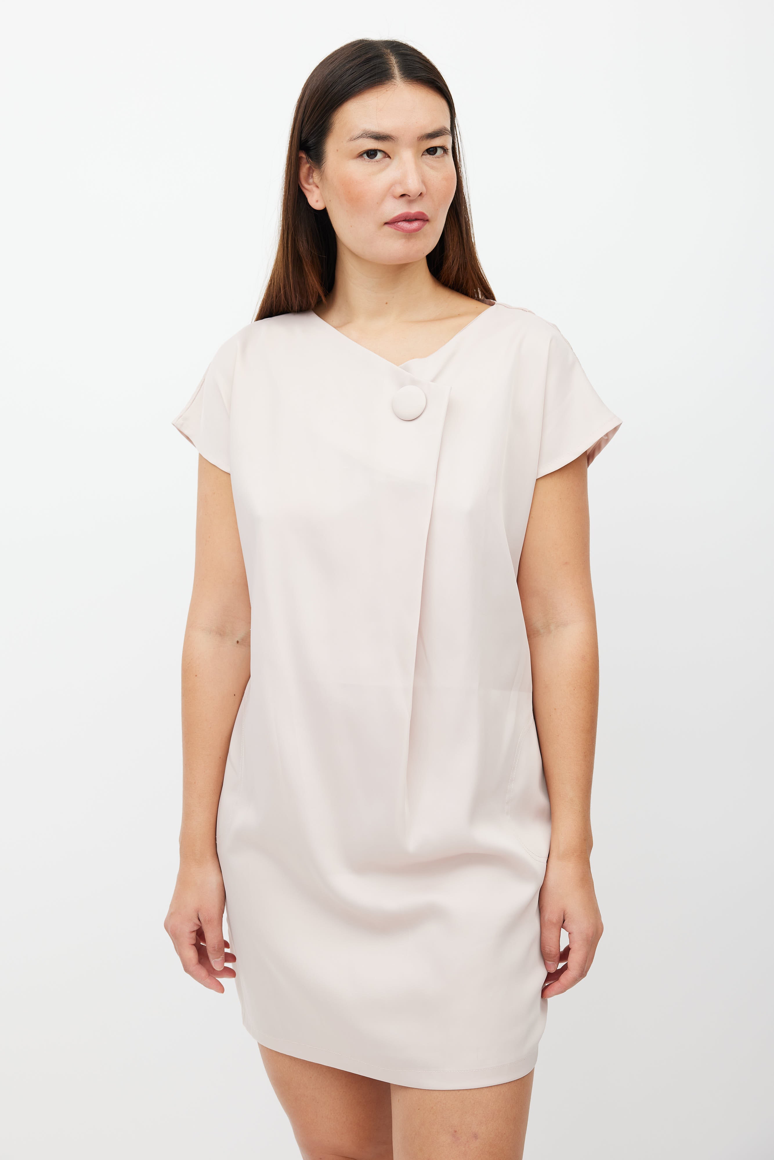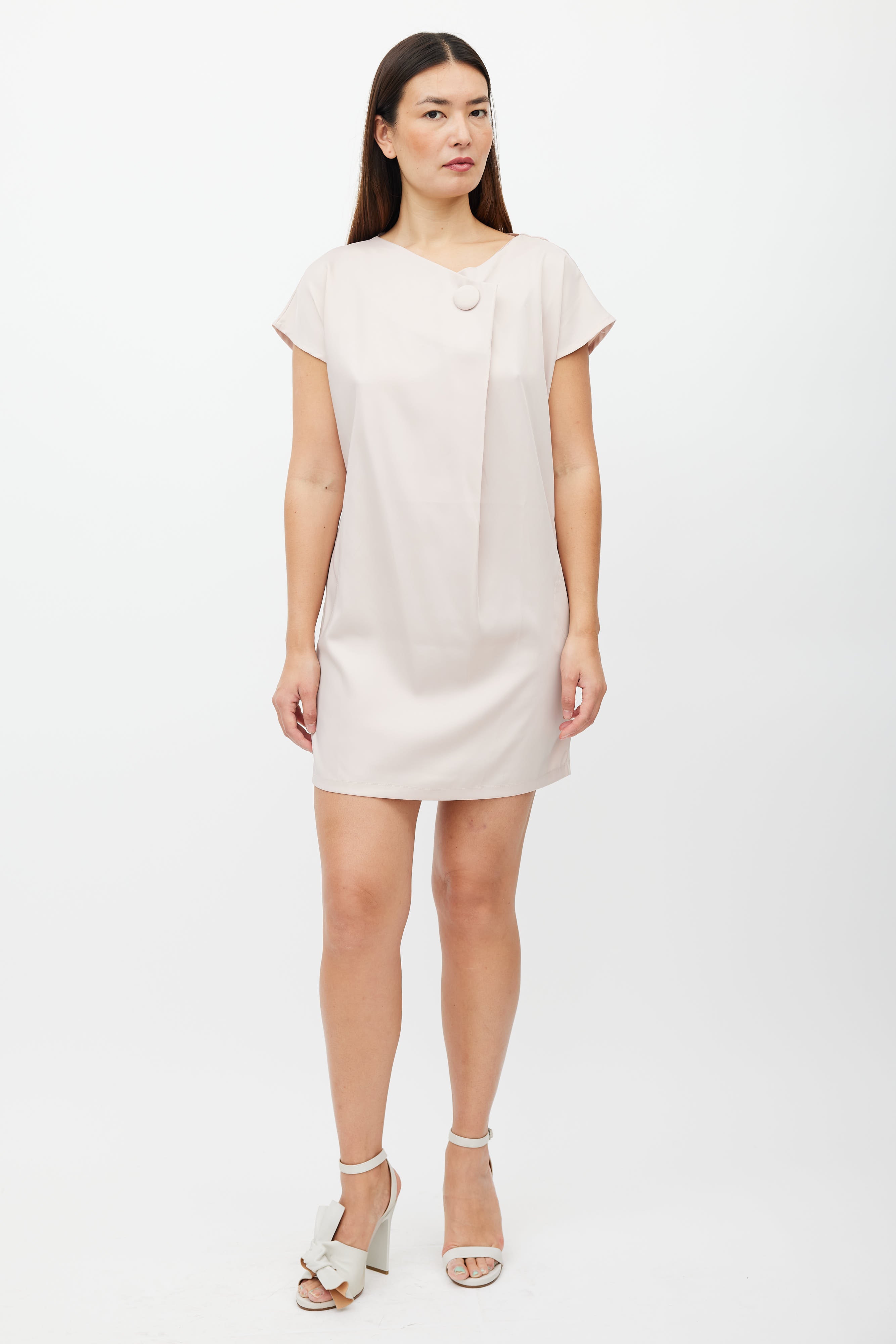 Pre-owned Max Mara pink dress featuring a V-neckline, cap sleeves, two slip pockets at hip, and asymmetrical button detail at neck.