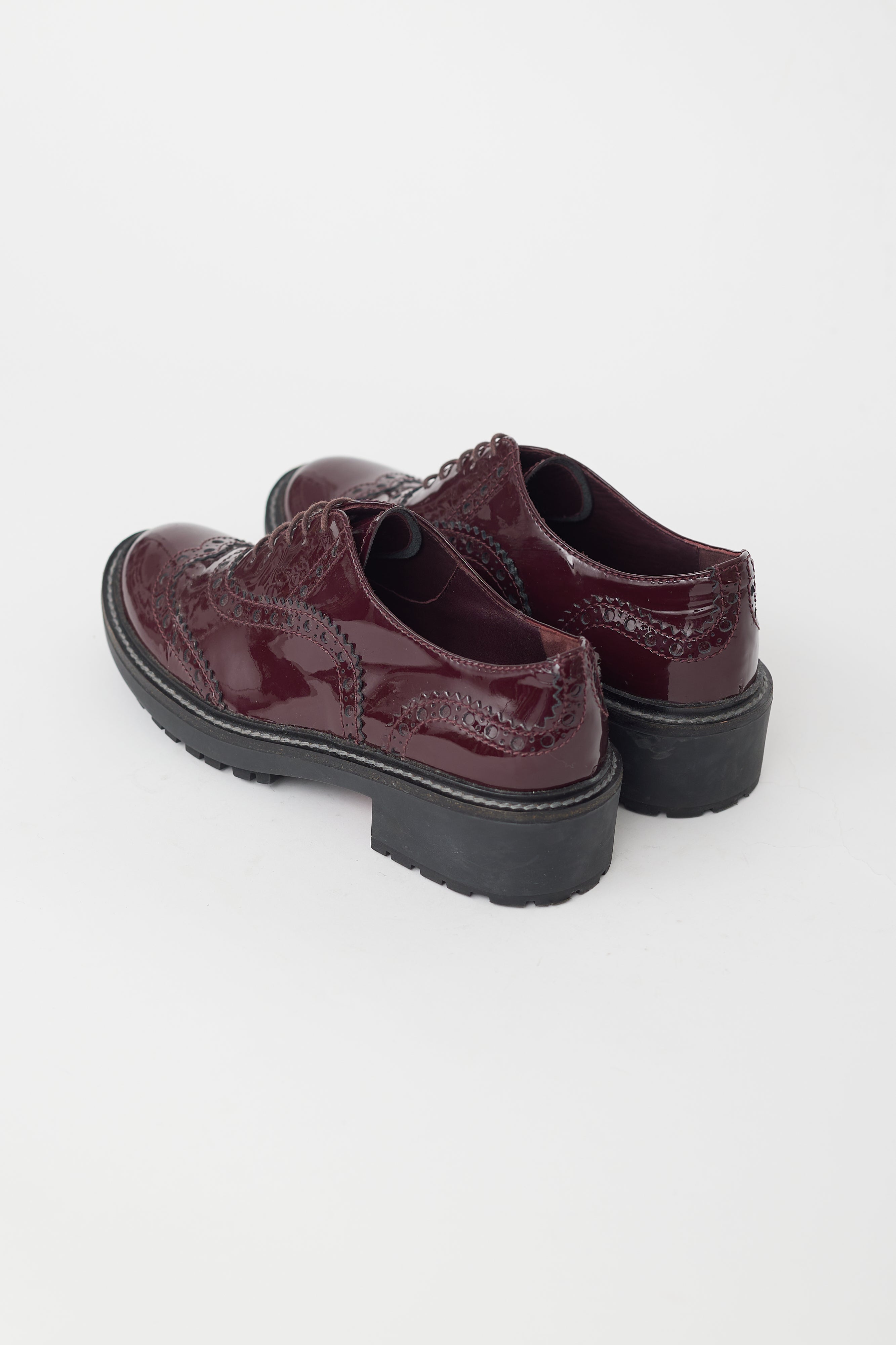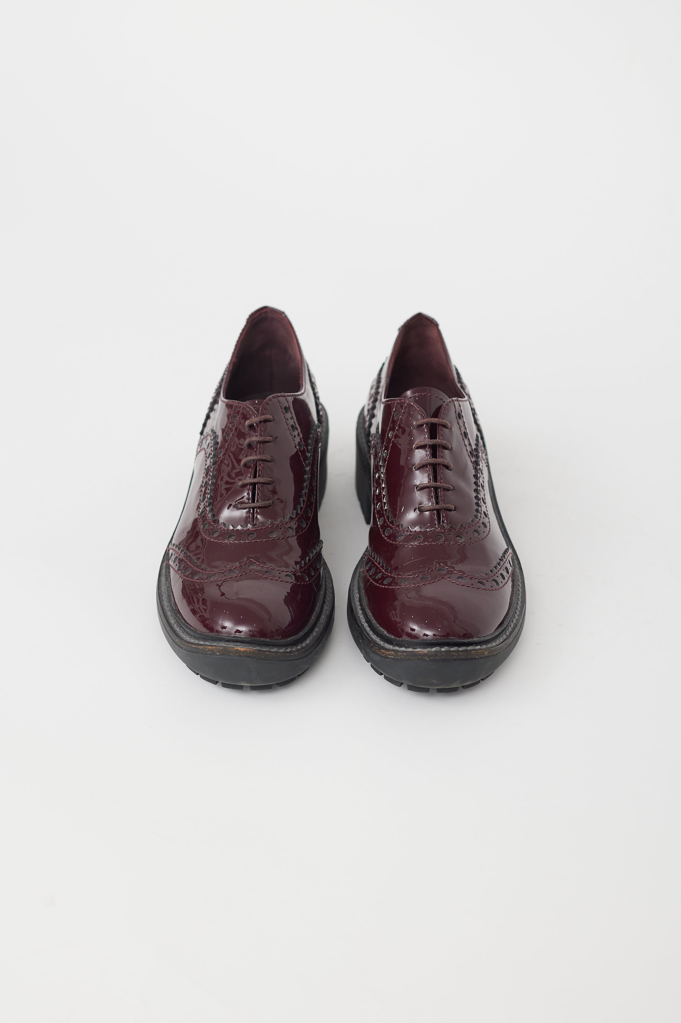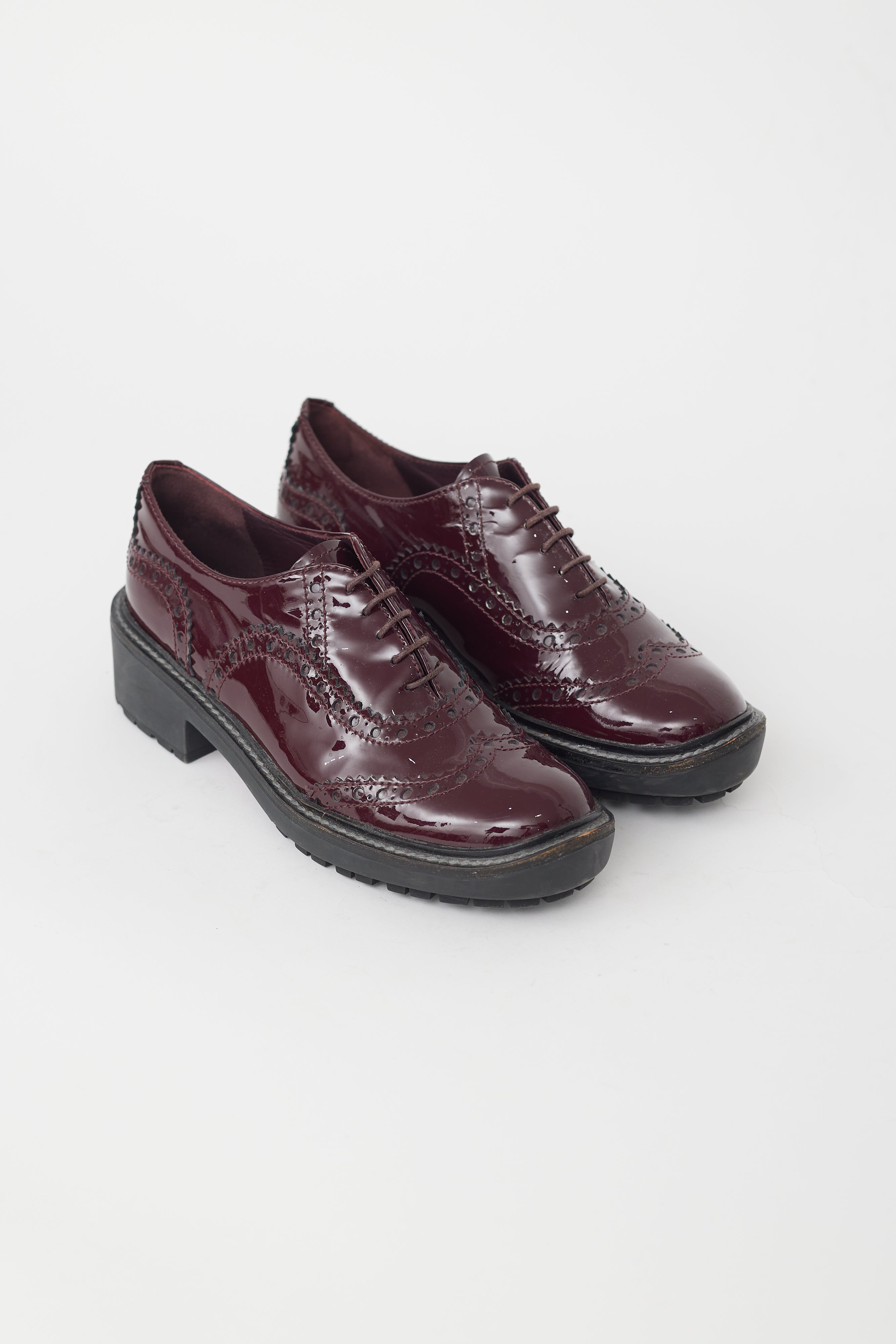 Pre-owned Miu Miu brogue featuring burgundy patent leather uppers, black low rubber stacked heel, lace up front, a rounded toe, and brogue styling.