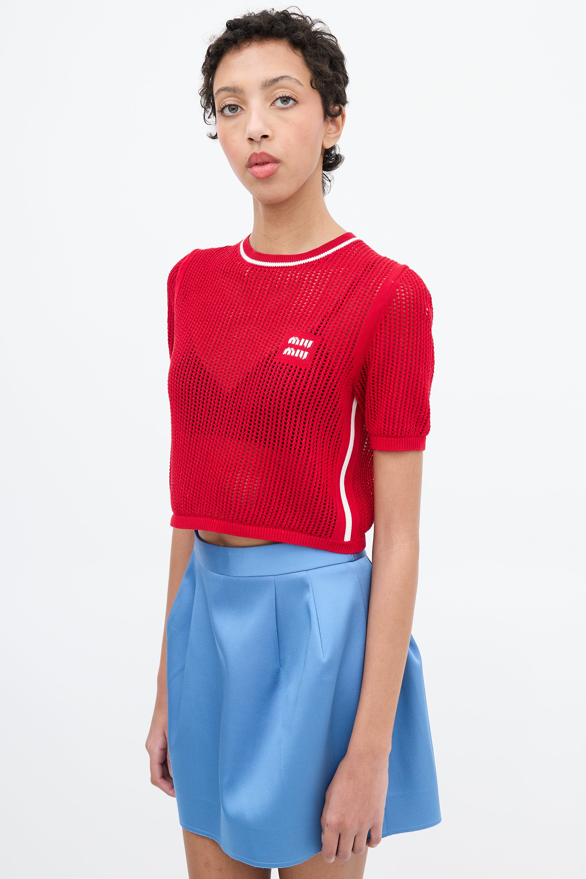 Pre-owned Miu Miu red knit mesh crop top featuring a round neckline, white stripes at neck and sides, white intarsia logo at left chest, and ribbed collar, hem, and cuffs.