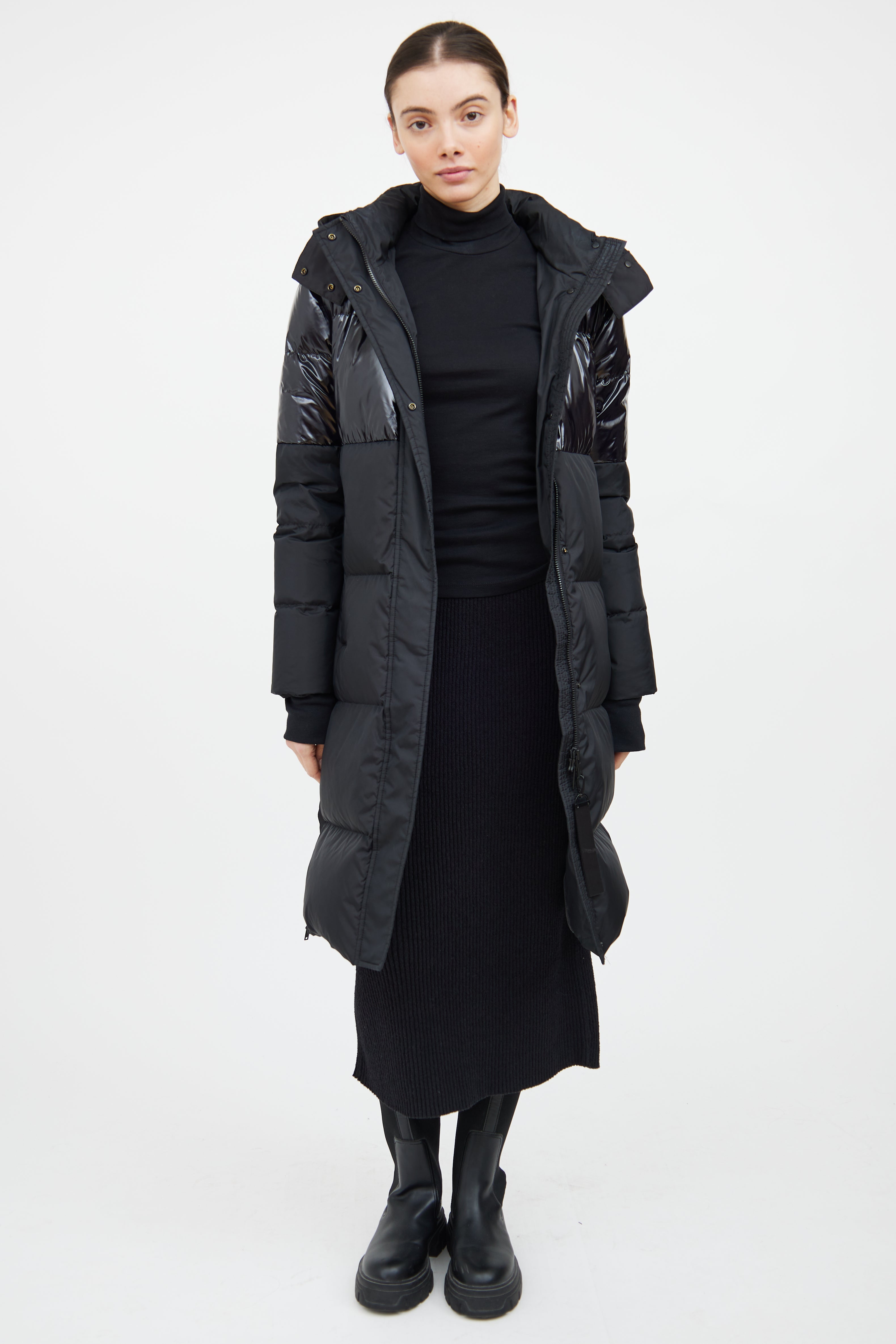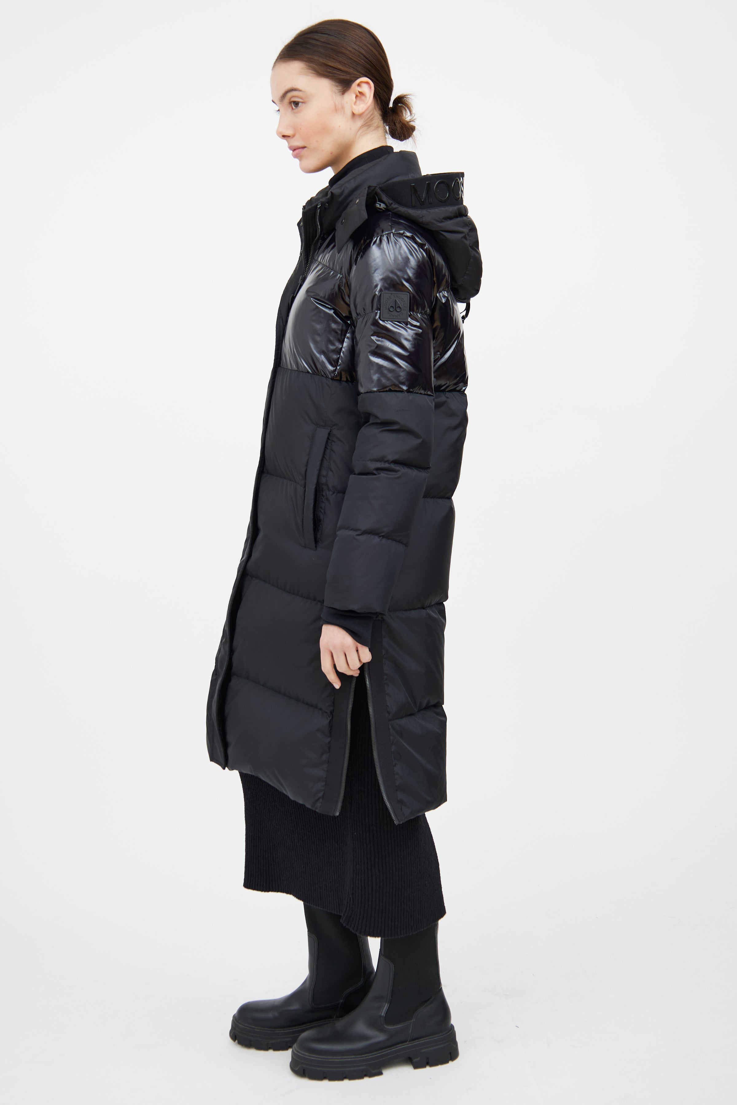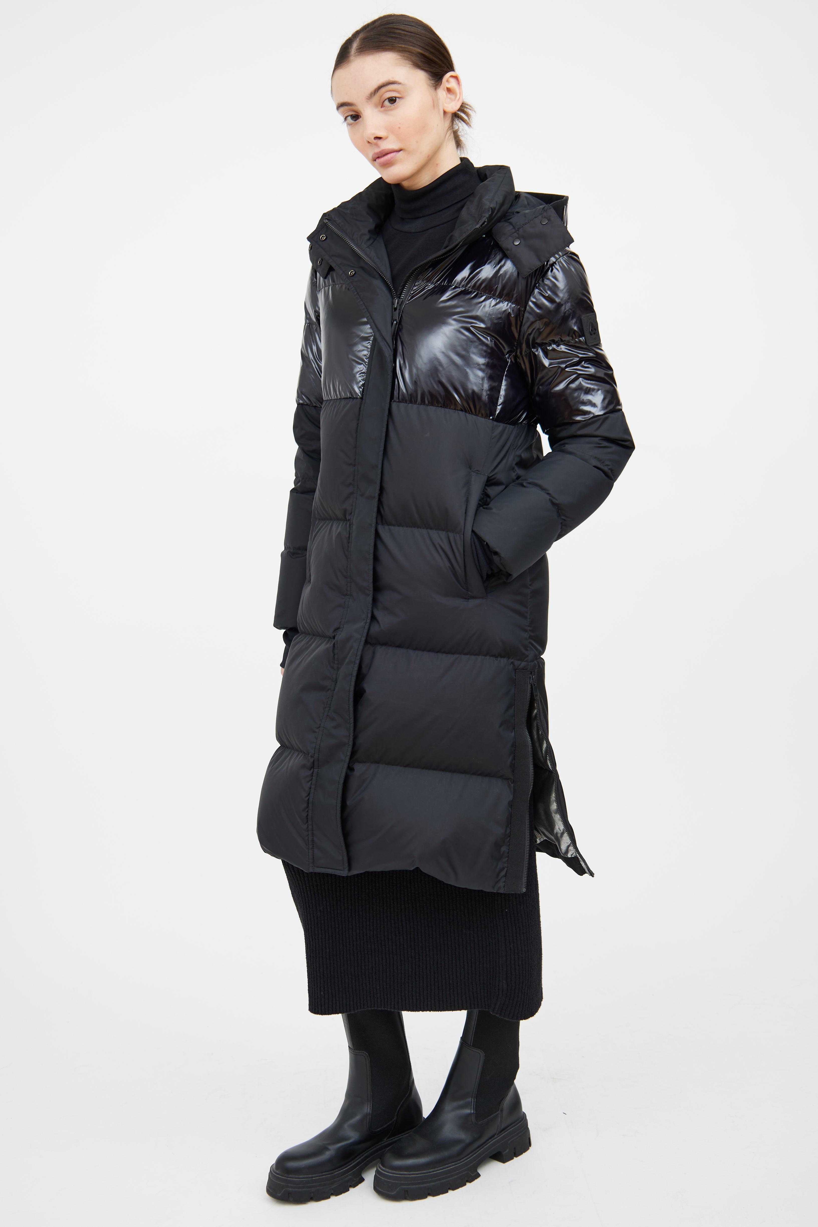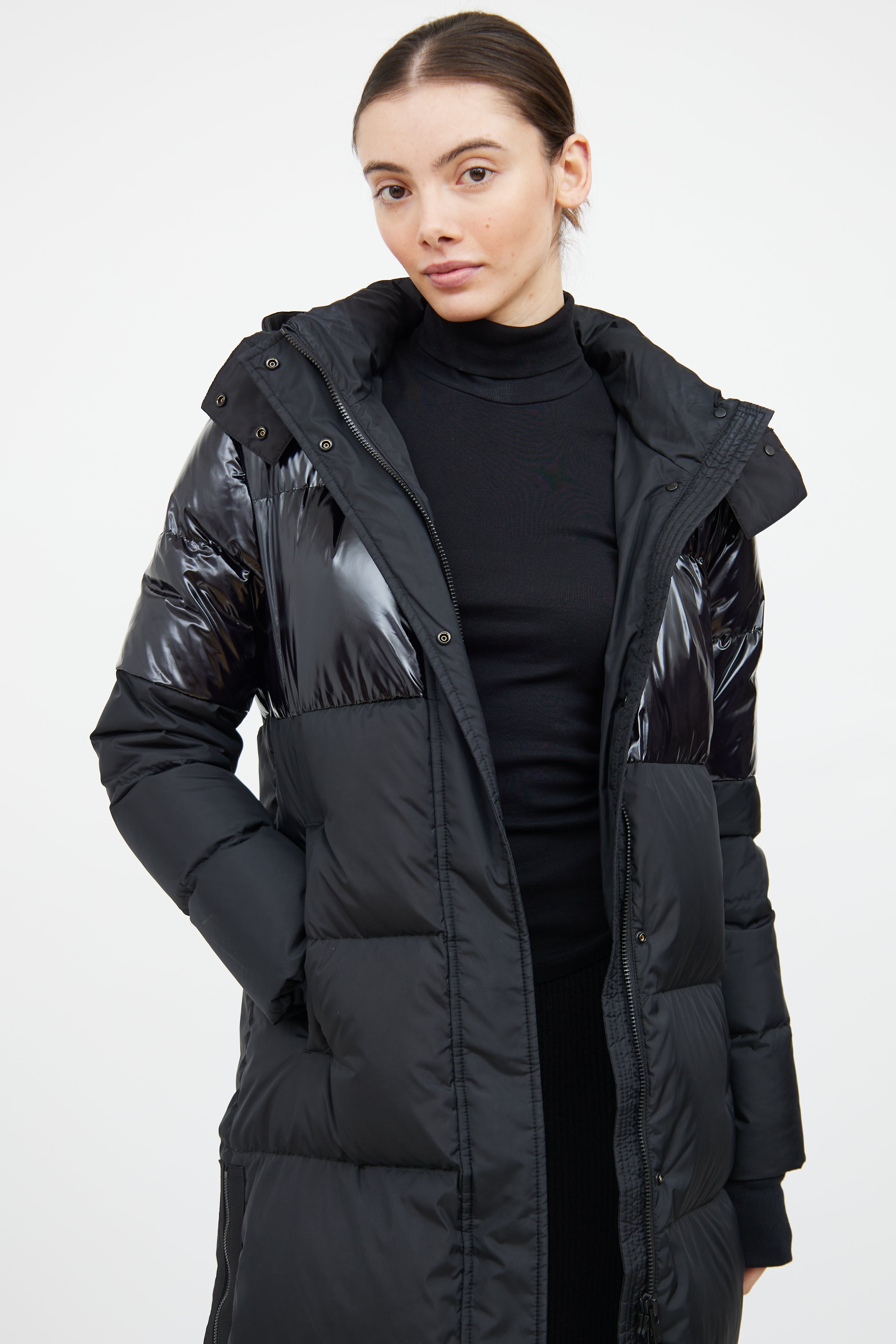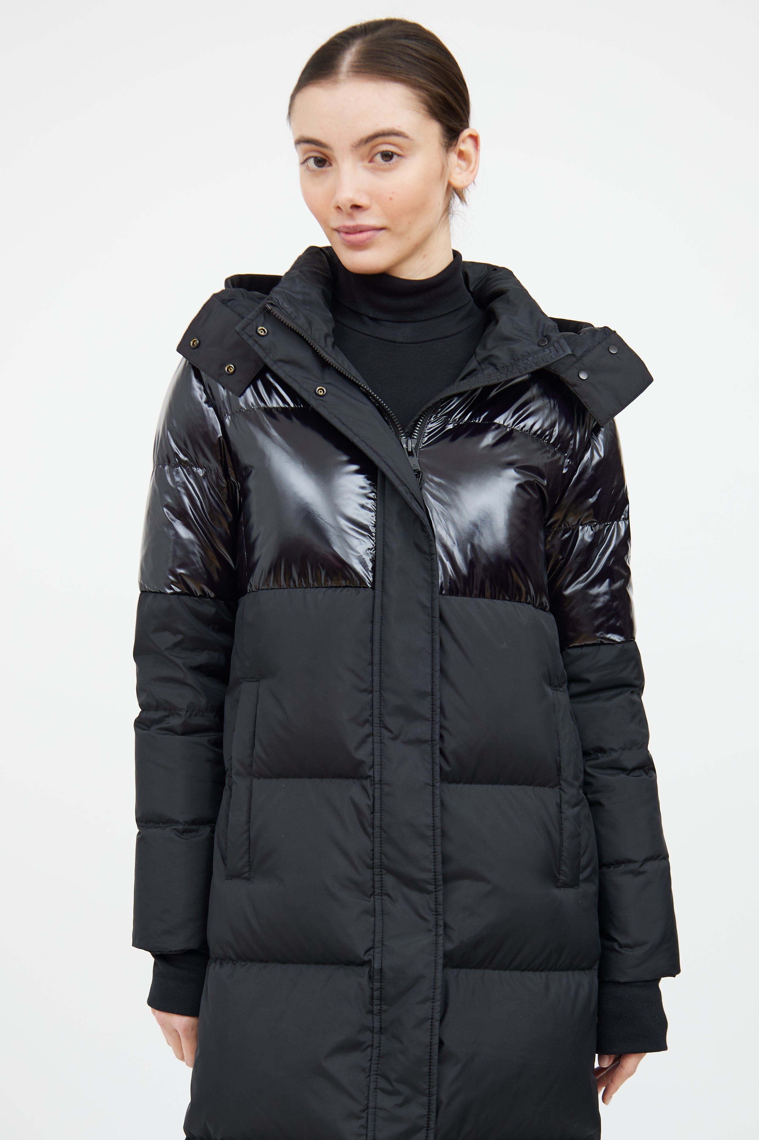 Pre-owned Moose Knuckles black Powerpuff down coat featuring a removable drawstring hood, mock neck collar, long sleeves with ribbed cuffs, two slip pockets at hip, zip detail at hem, and zip front with snap closure. Lined.