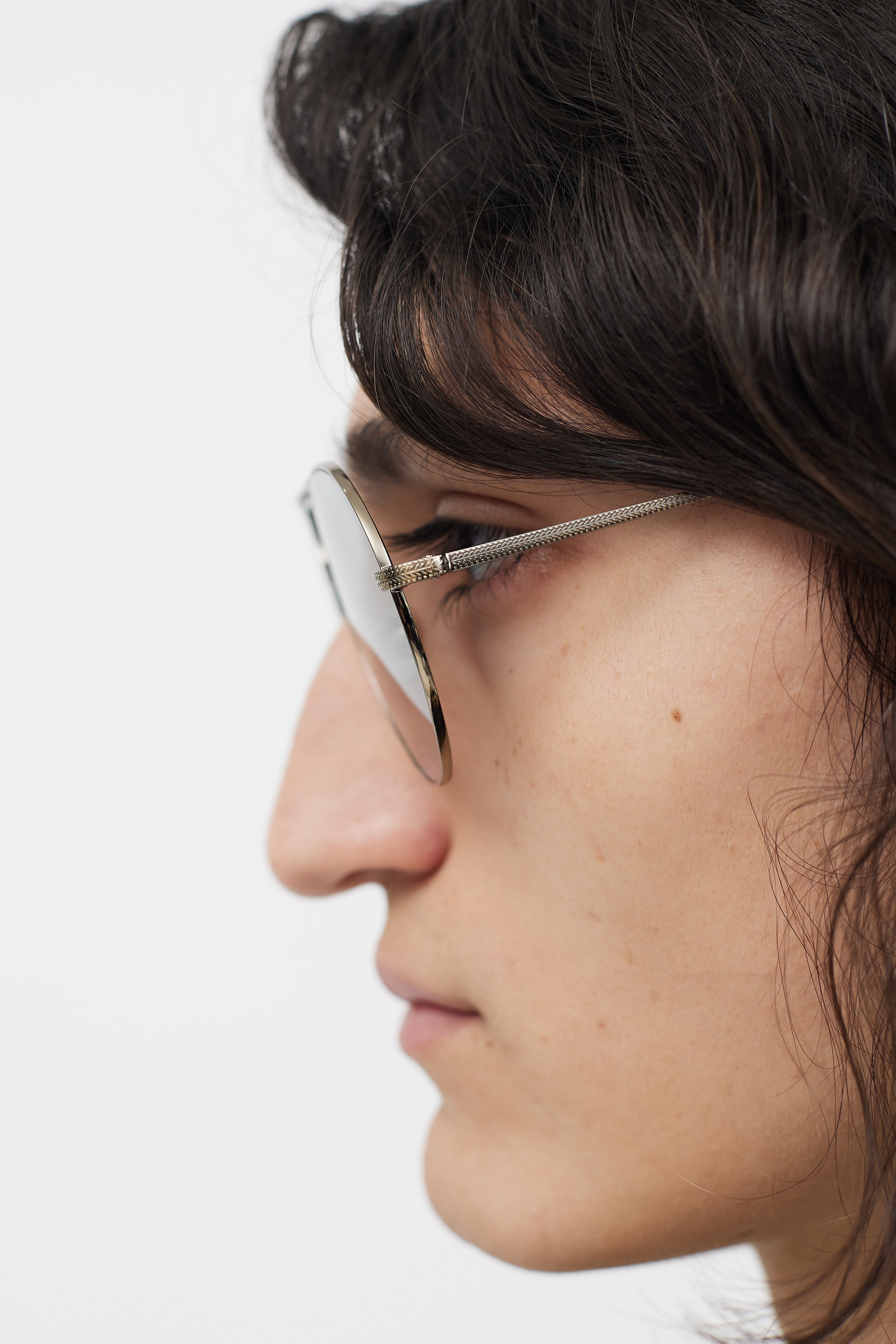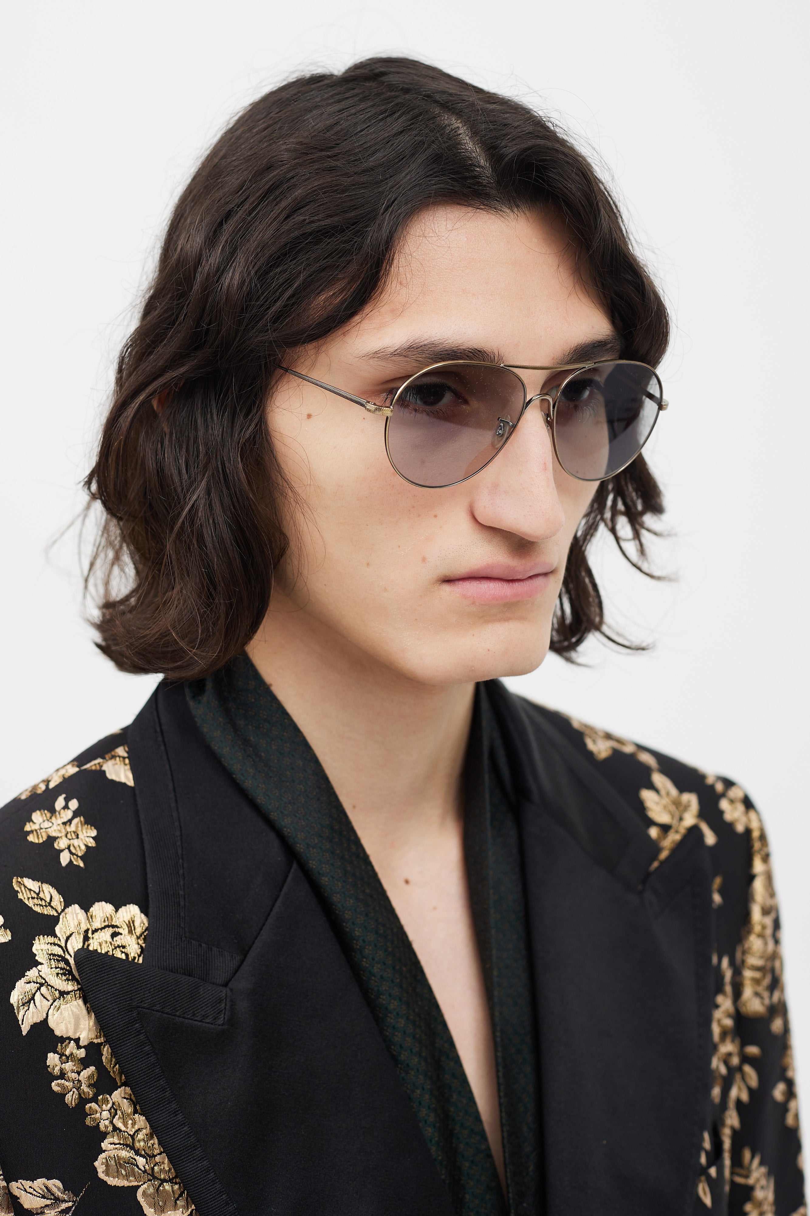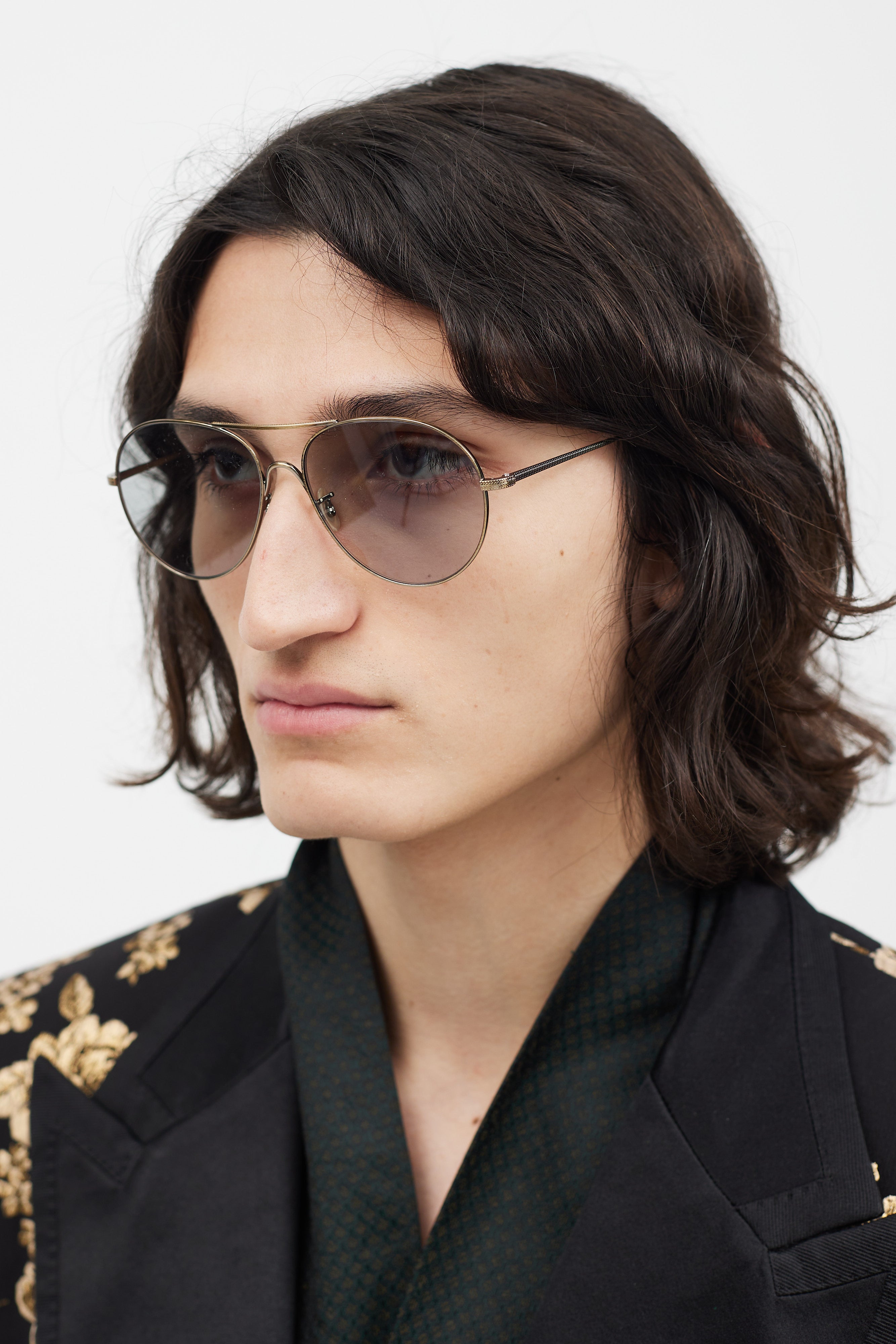 Pre-owned Oliver Peoples gold OV1218S aviator sunglasses featuring a wire frame, tinted lenses, nose pads, double brow bar, and textured arms. Comes with original case.