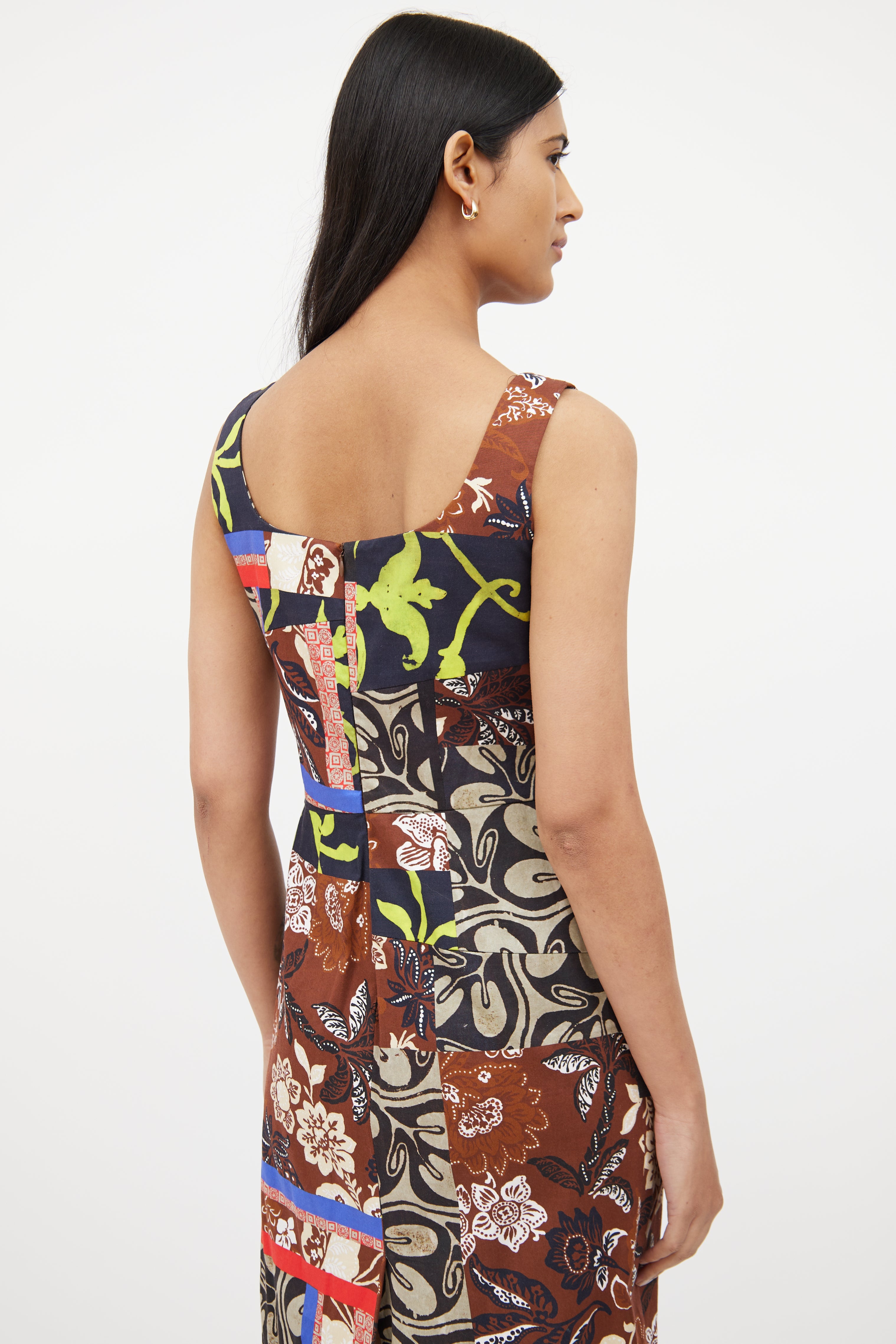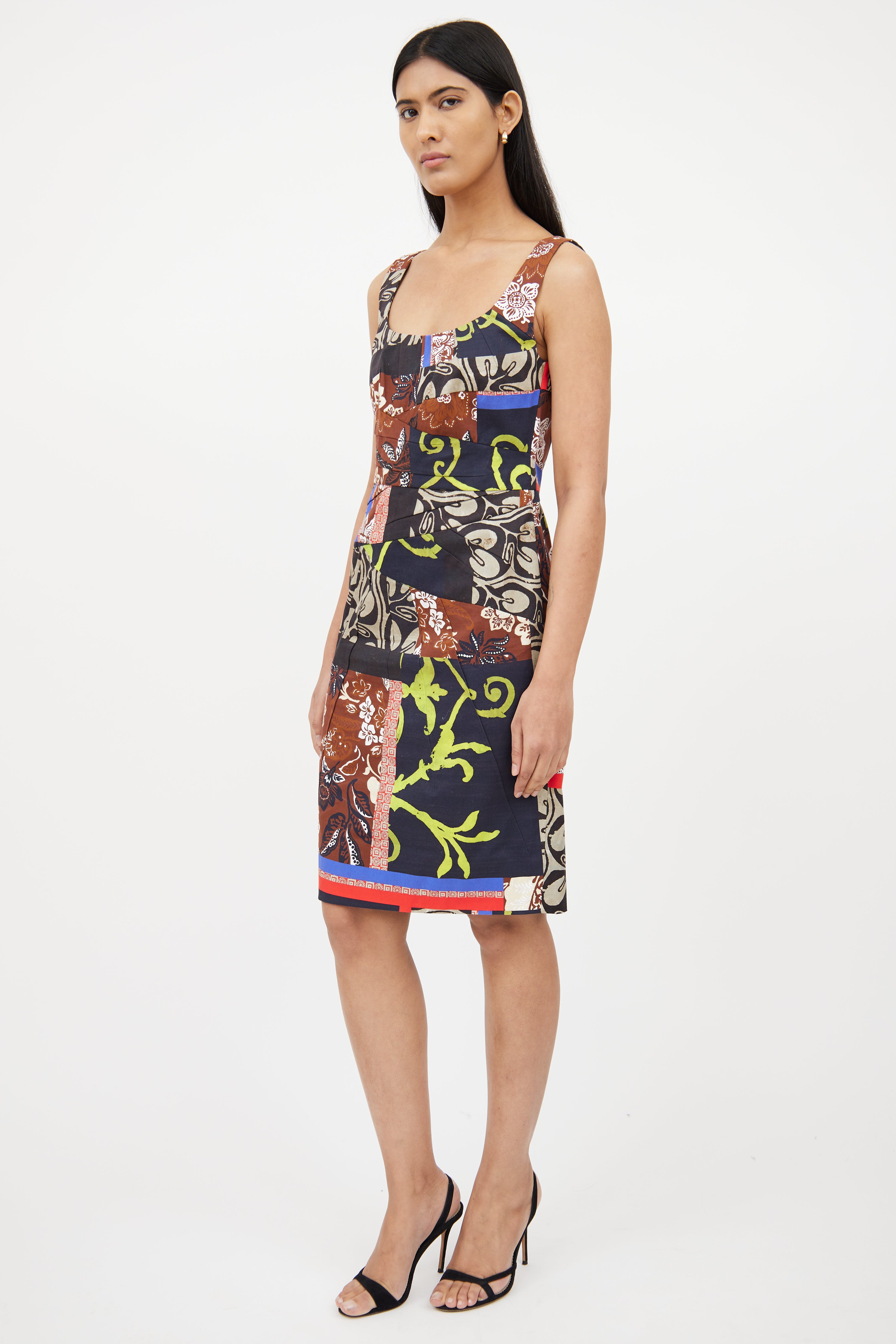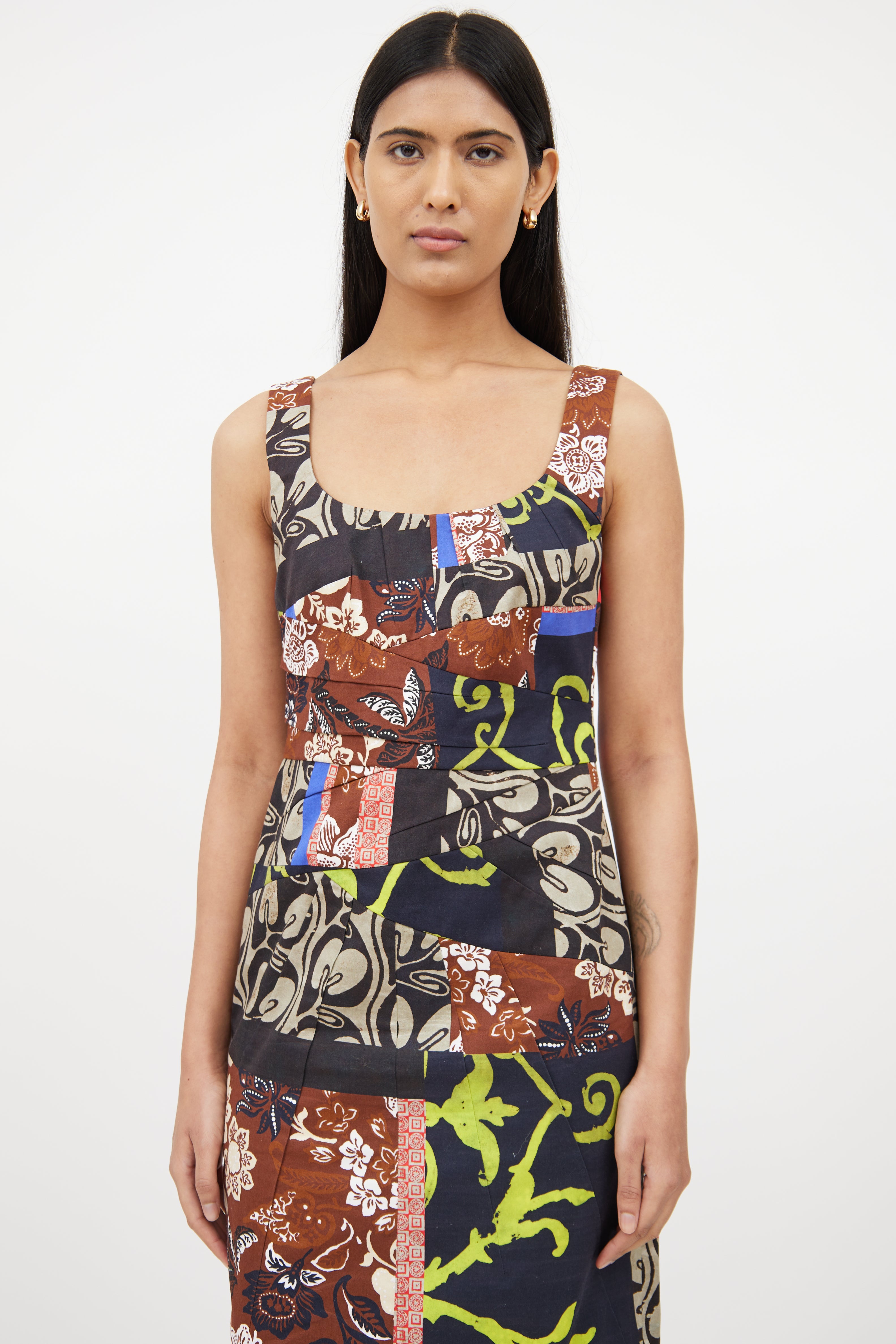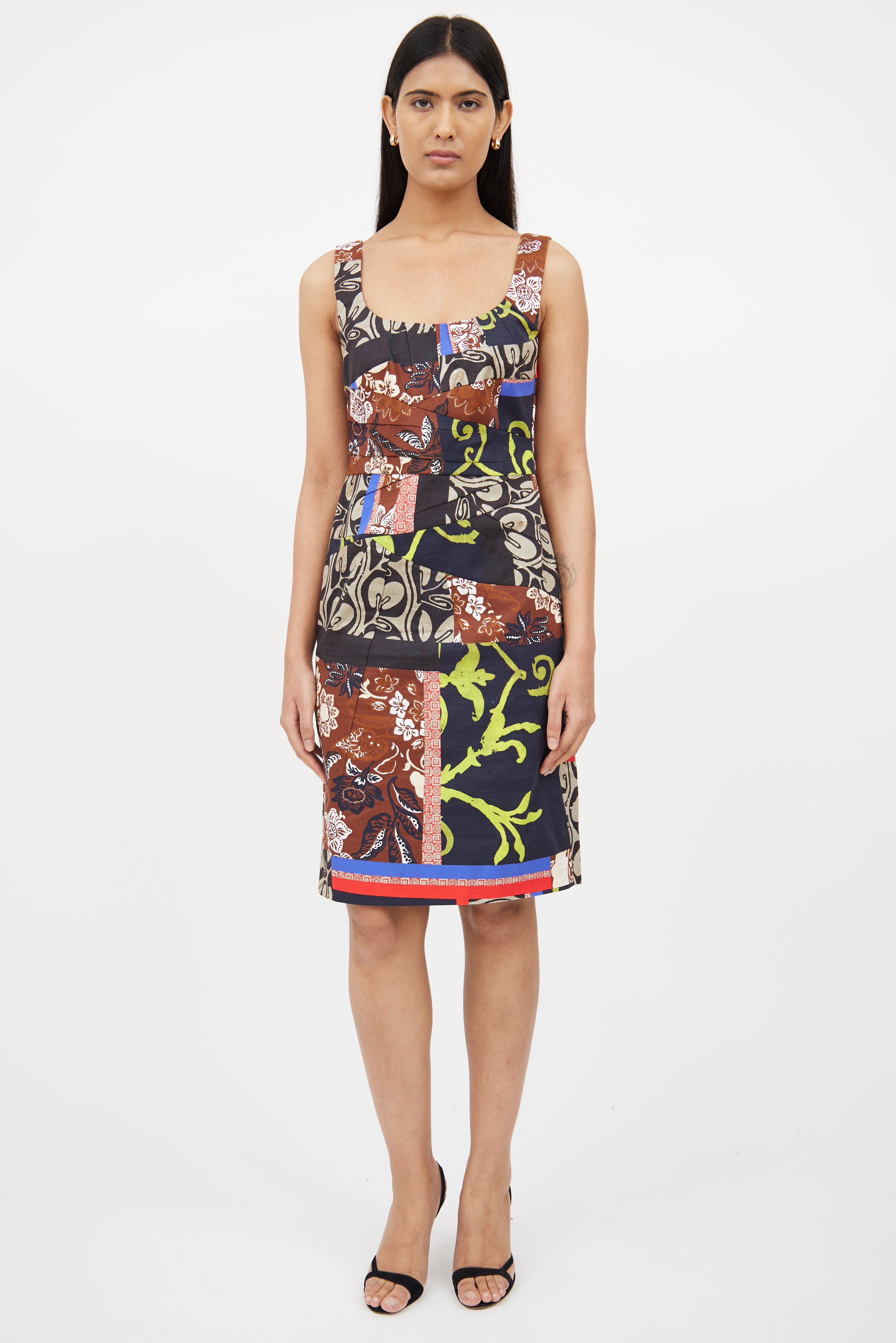 Pre-owned Oscar de la Renta midlength dress featuring round neckline, sleeveless styling, concealed back zip closure, pleating details, vent at back and multicoloured patchwork throughout. Fully lined.