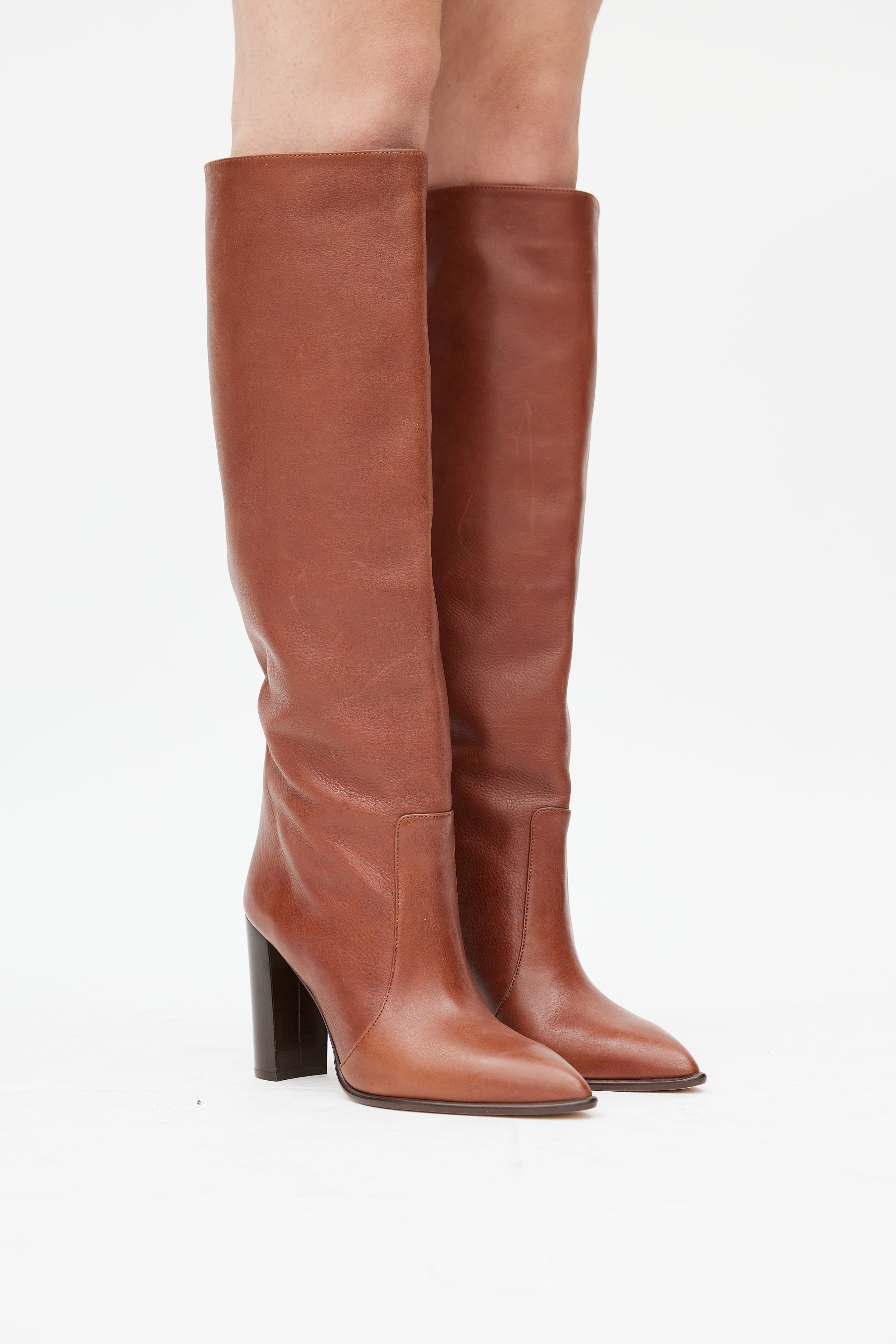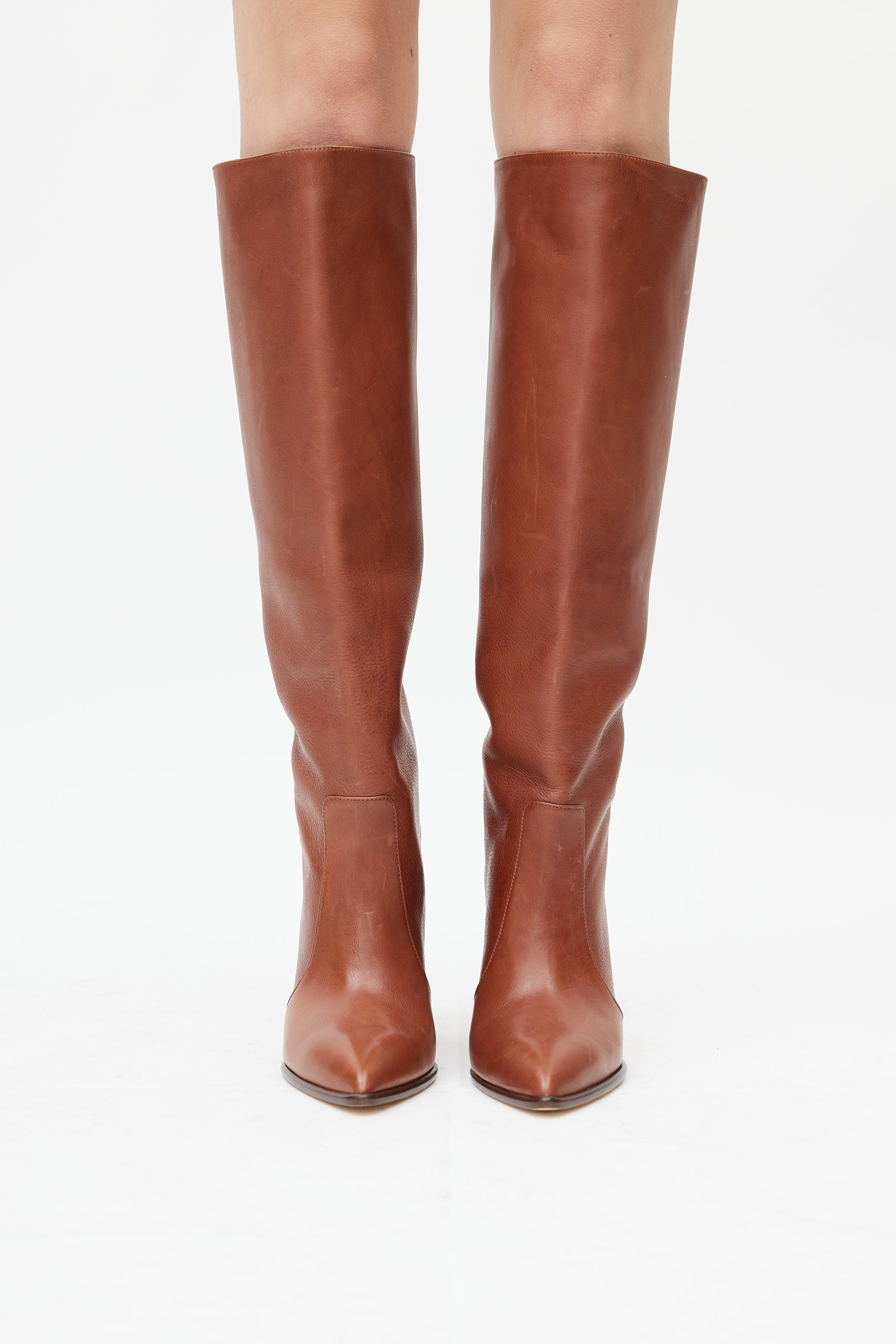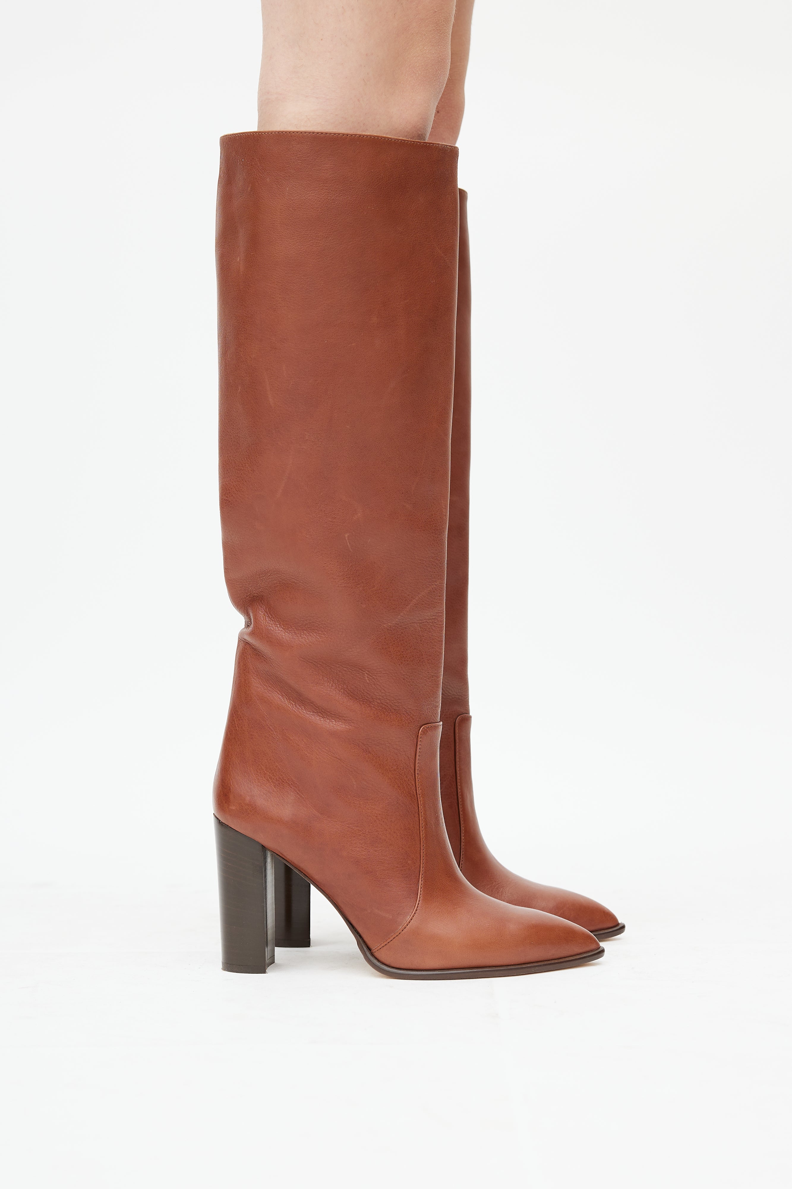 Pre-owned Paris Texas brown boots featuring pointed toe, slip on entry, knee high shaft, and stacked block heel.