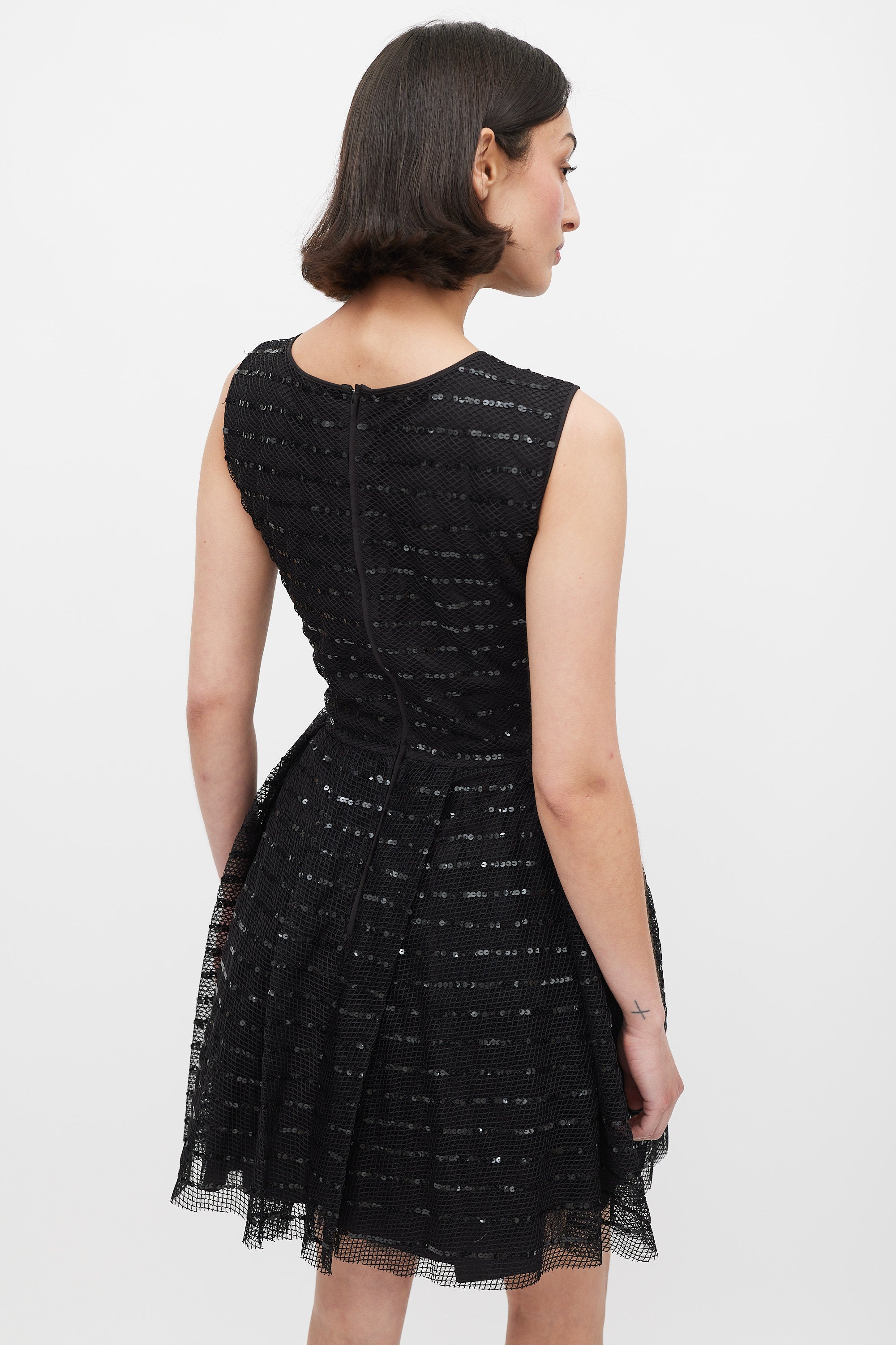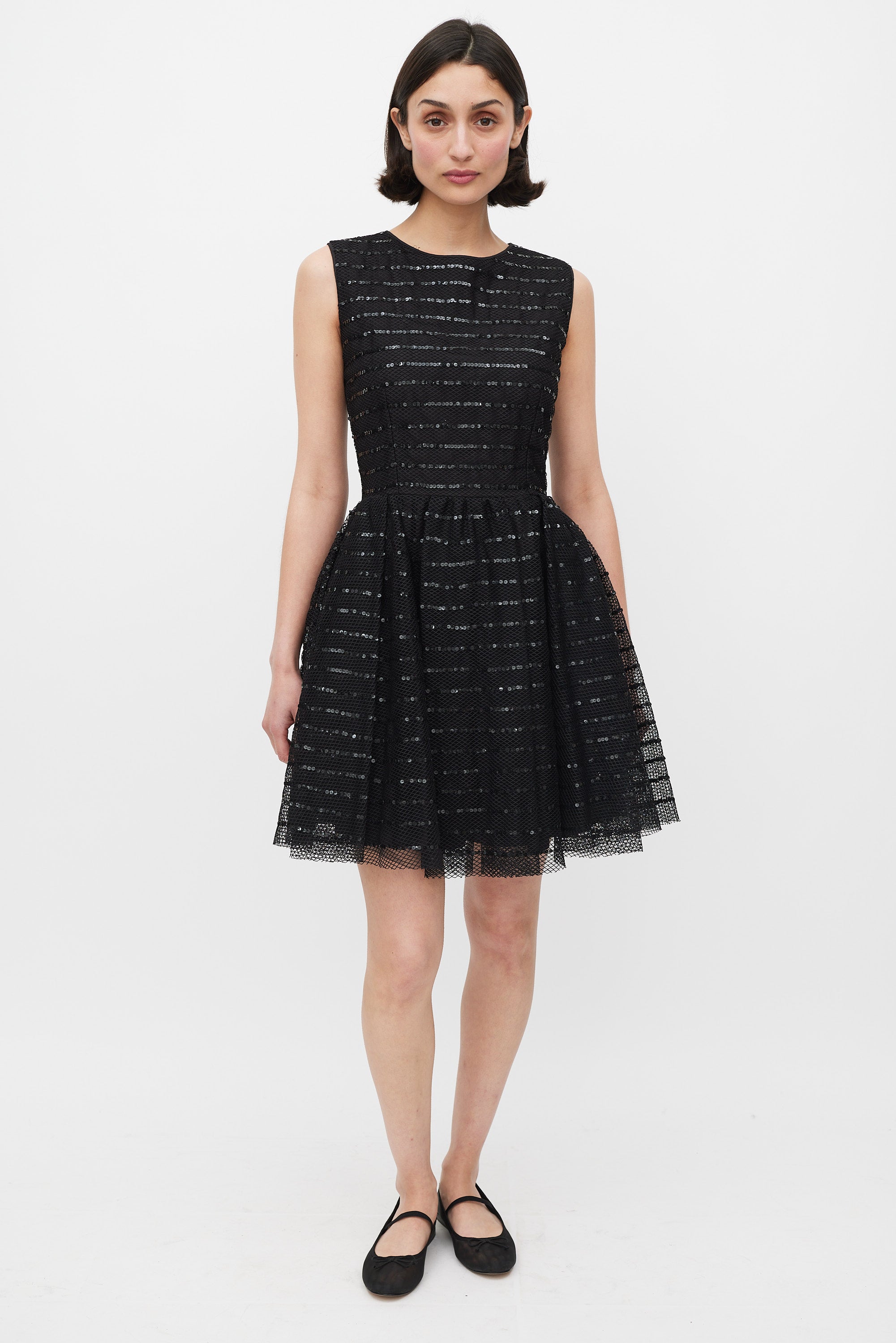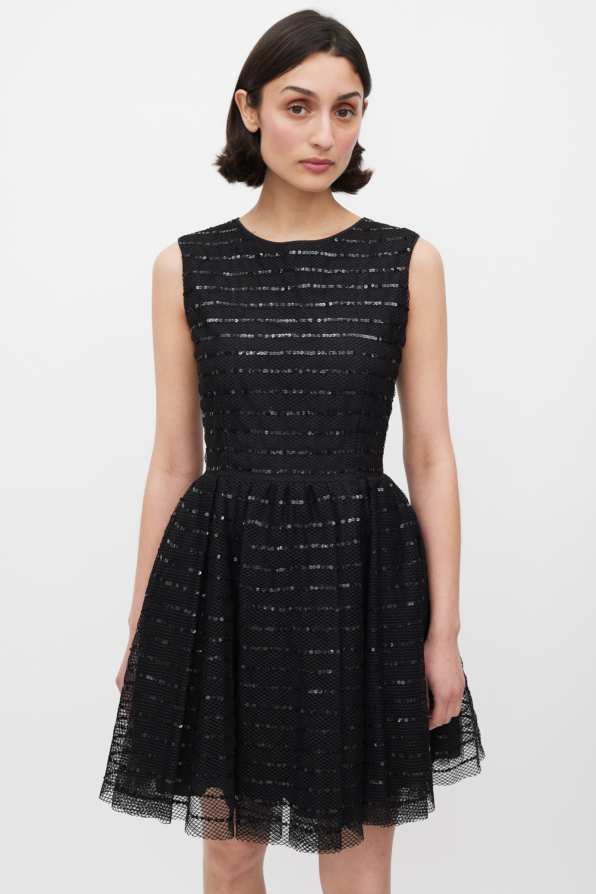 Pre-owned Red Valentino black mesh sleeveless mini dress featuring a round neckline, sequinned stripes throughout, gathered A-Line skirt, back zip, and underlayer with tulle trim. Lined.