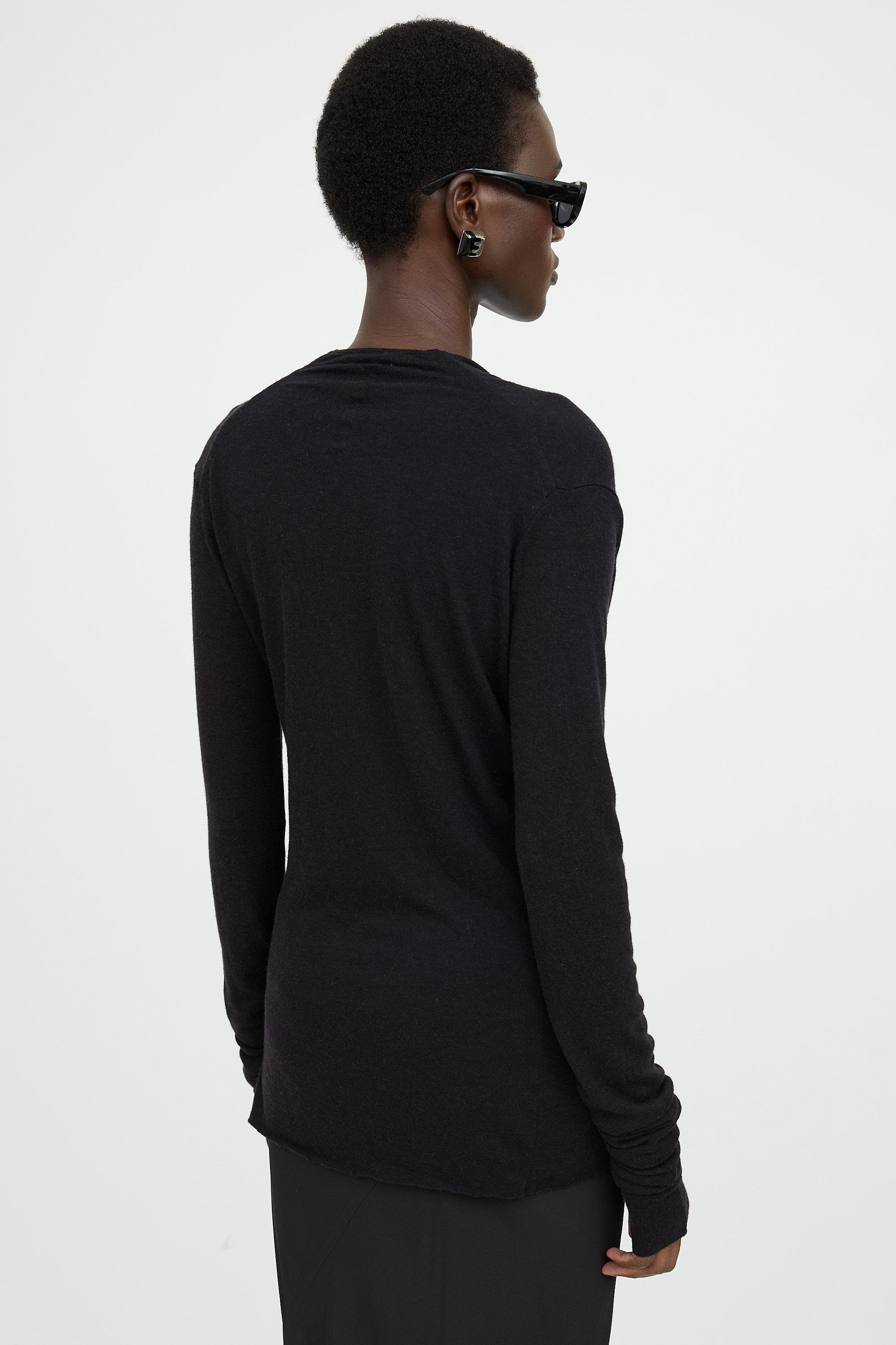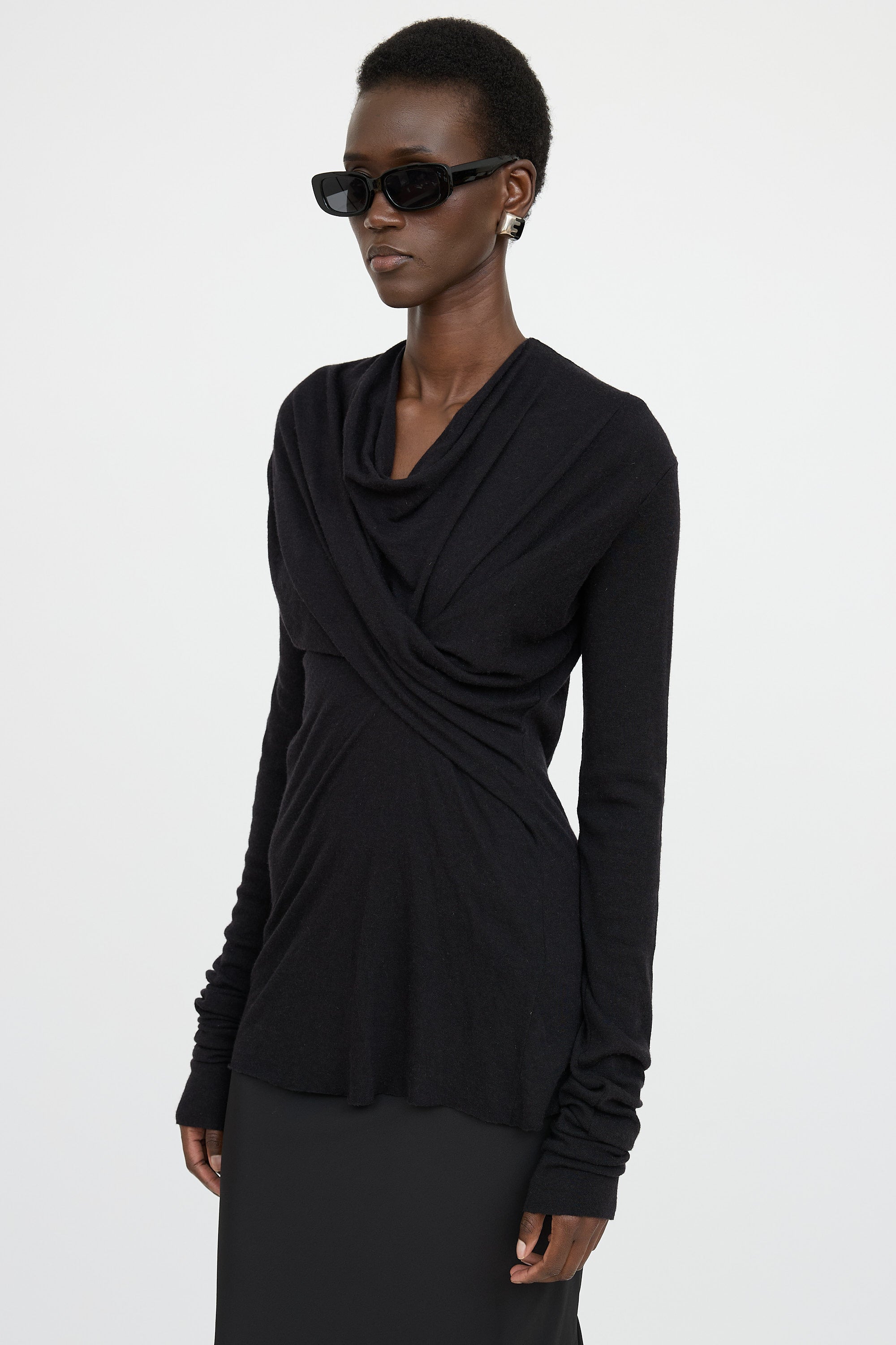Pre-owned Rick Owens black Lilies top featuring cowl neckline, draped at chest, wrapped at waist, and exaggerated long sleeves.
