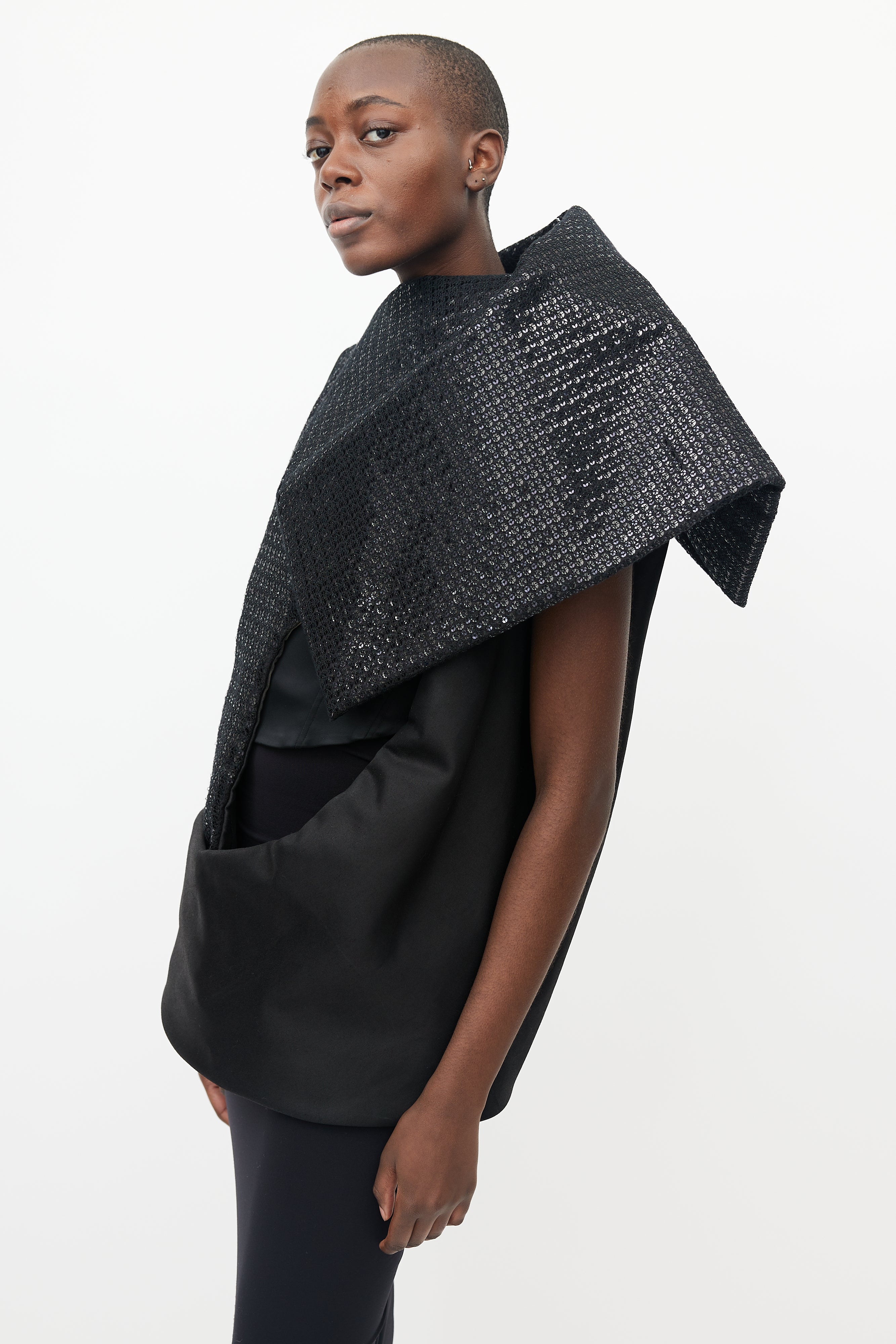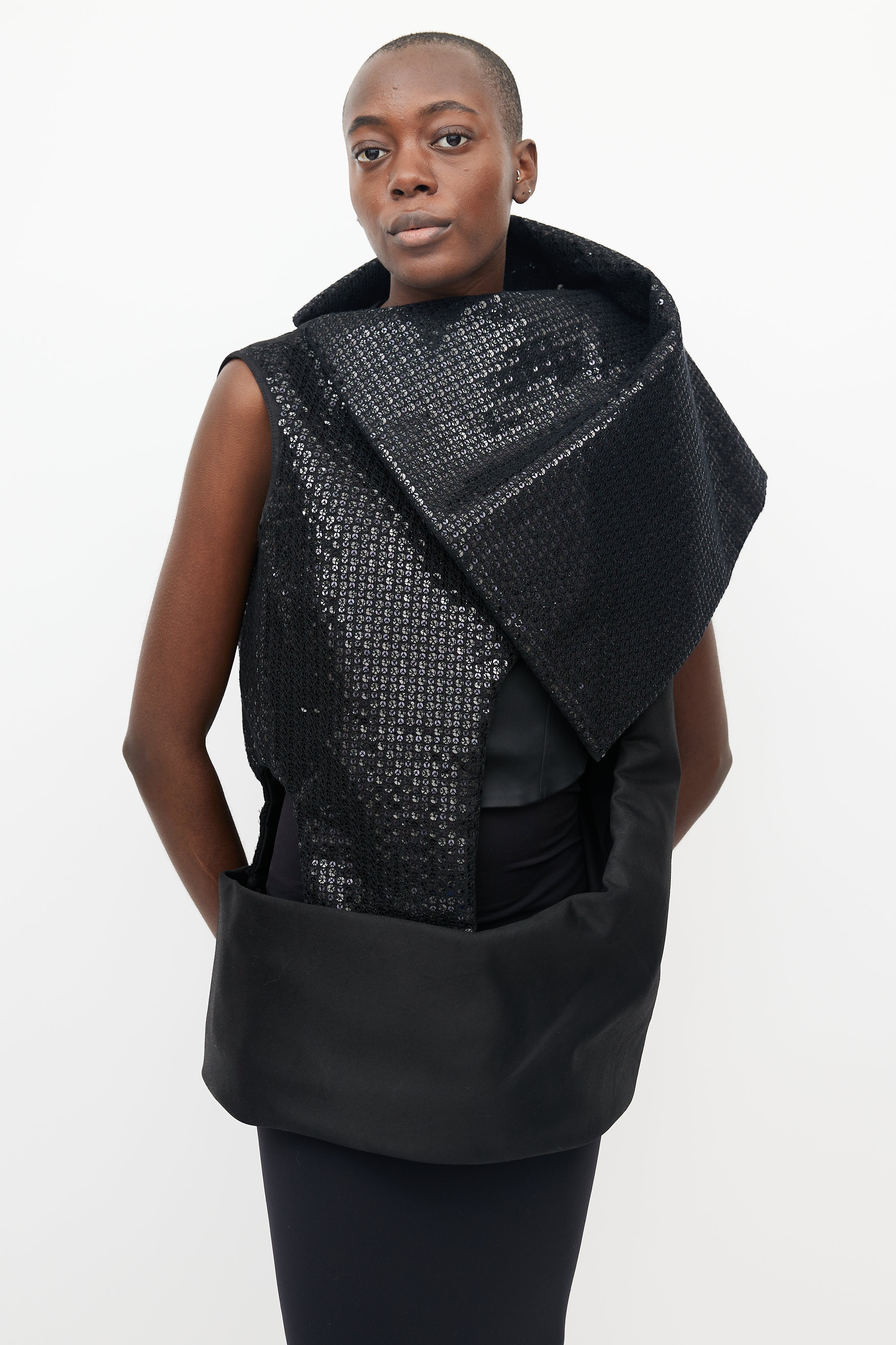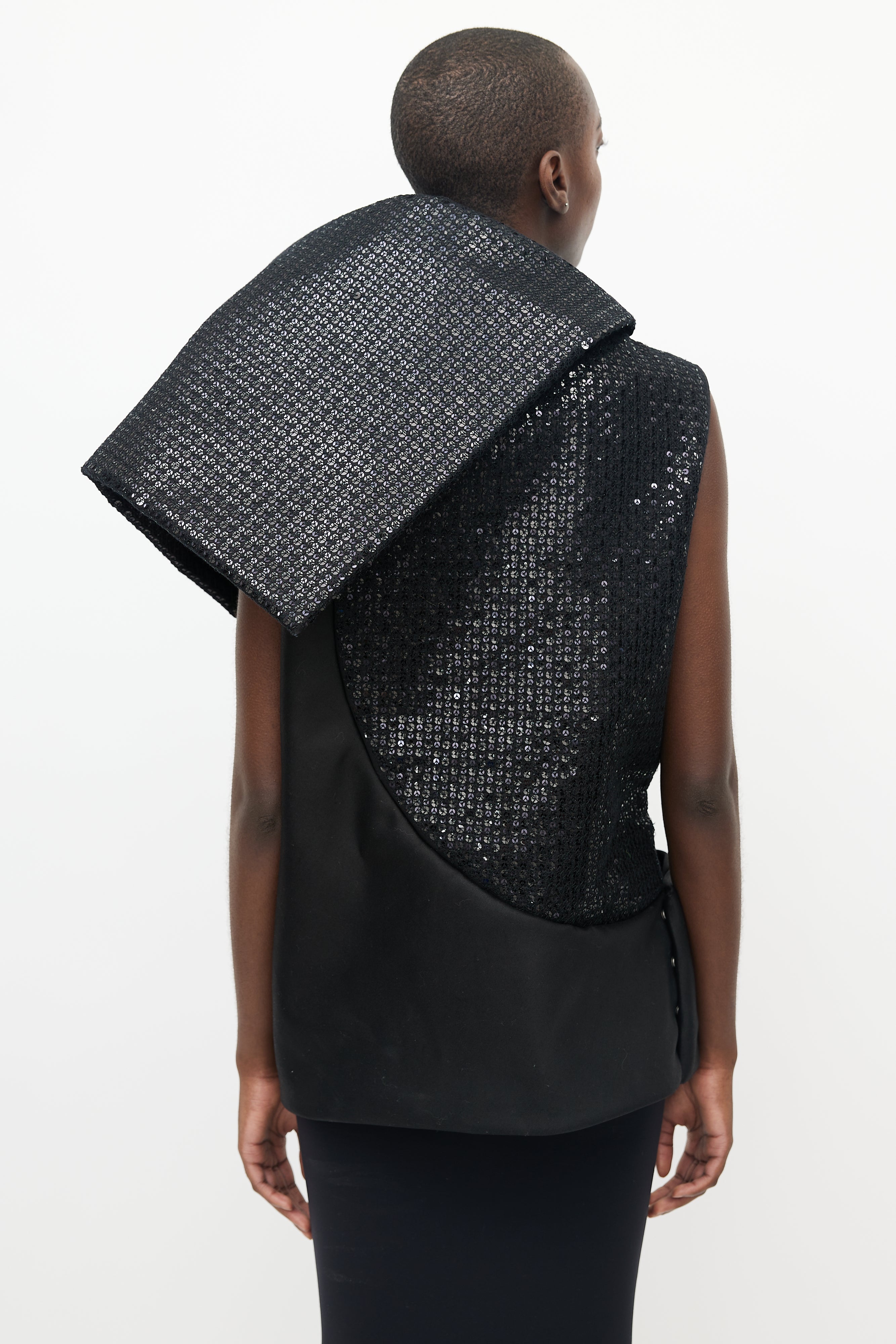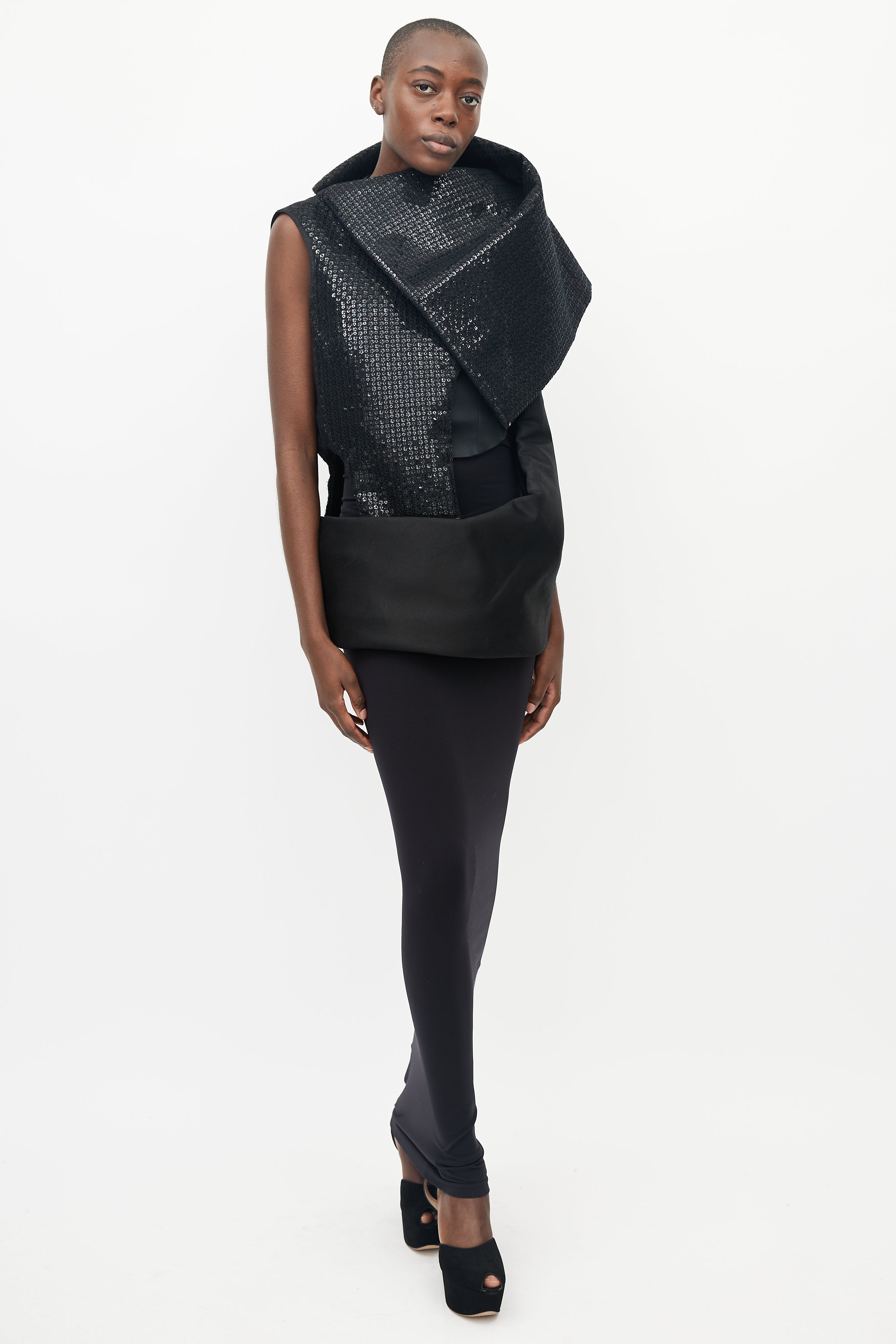Pre-owned Rick Owens Spring/Summer 2018 black asymmetrical top featuring tonal sequin detailing throughout, bateau neckline, gathered structural flap at shoulder, cut out at waist, and snap button closure at side. Lined. Styled with skirt. Clipped to fit model.