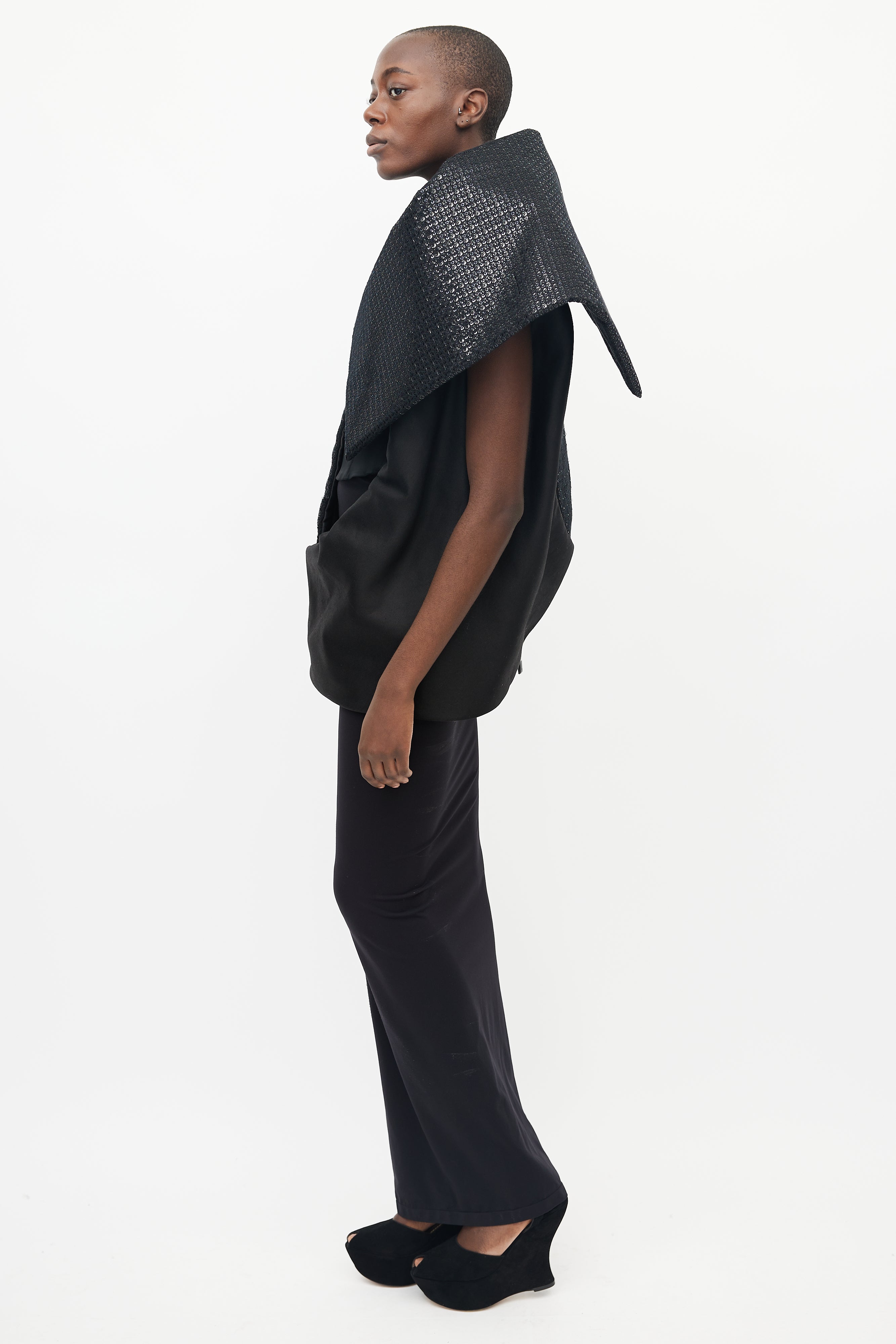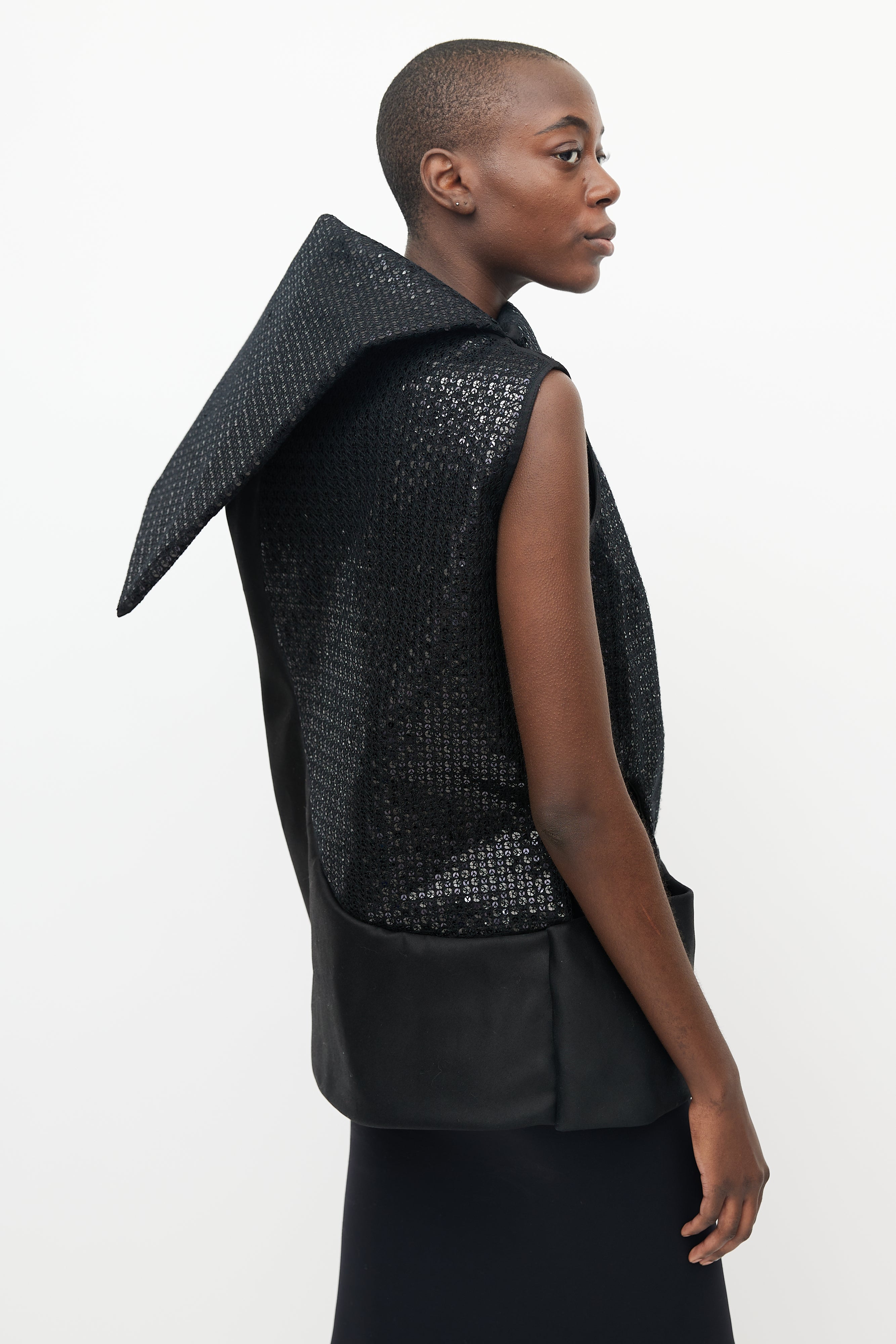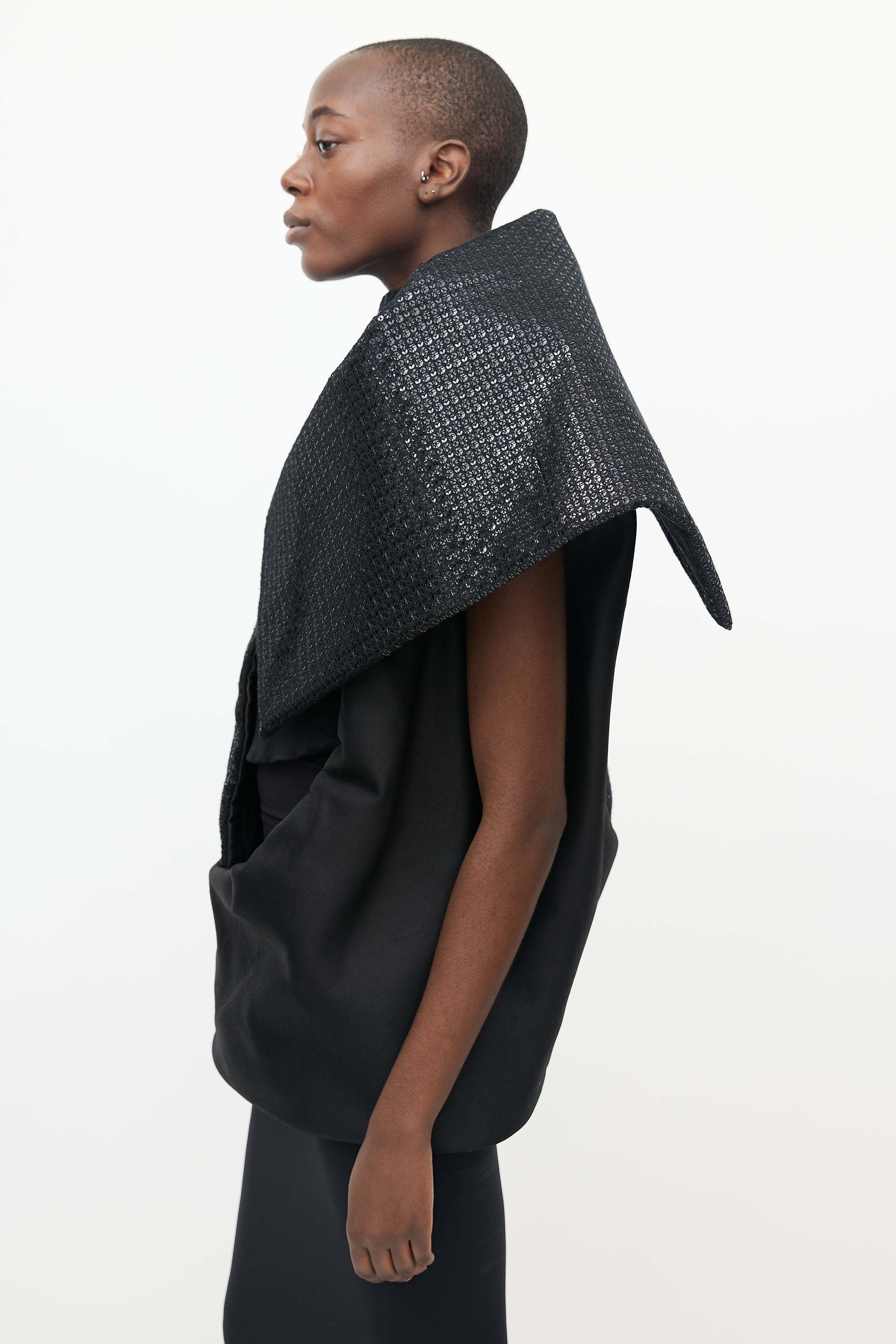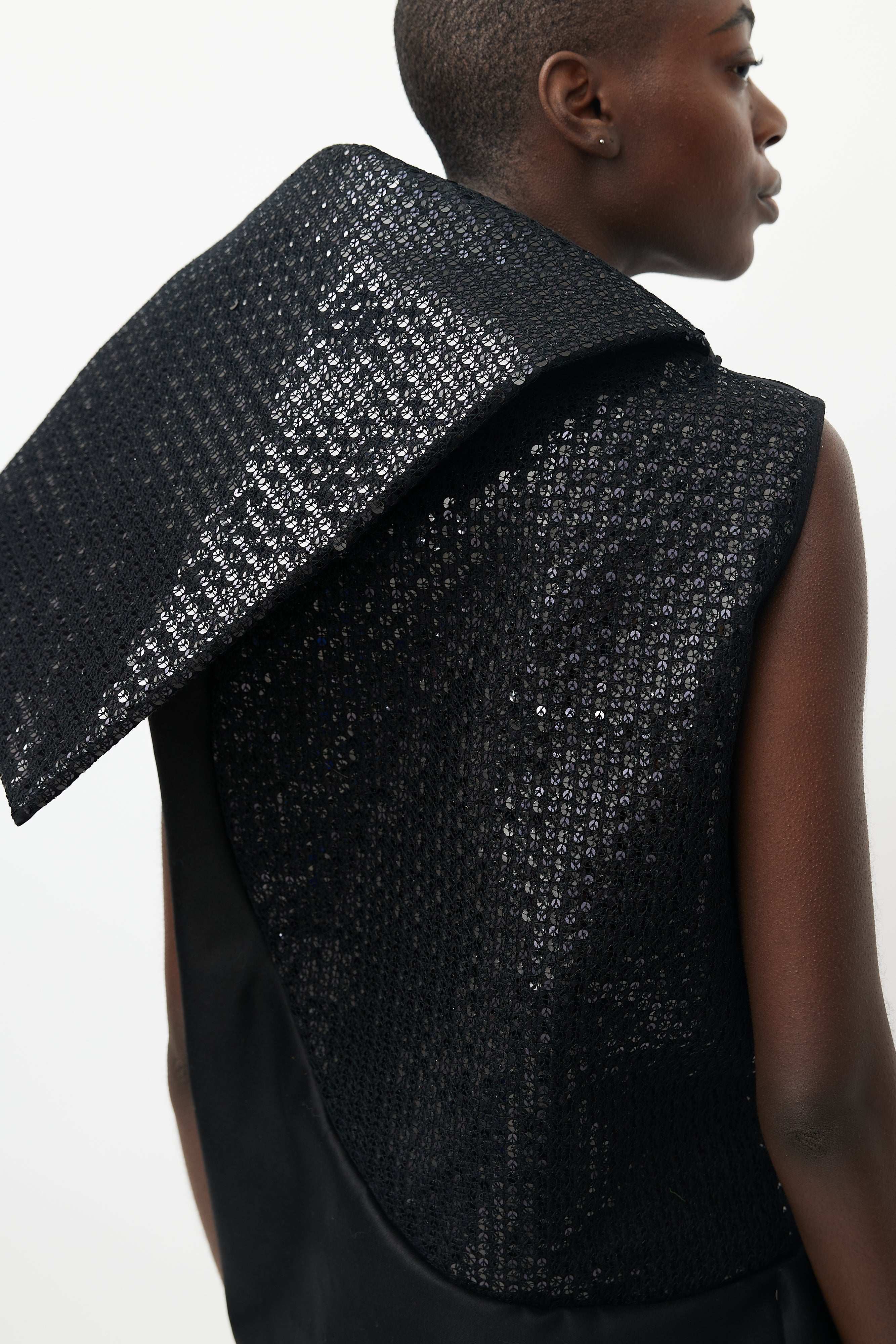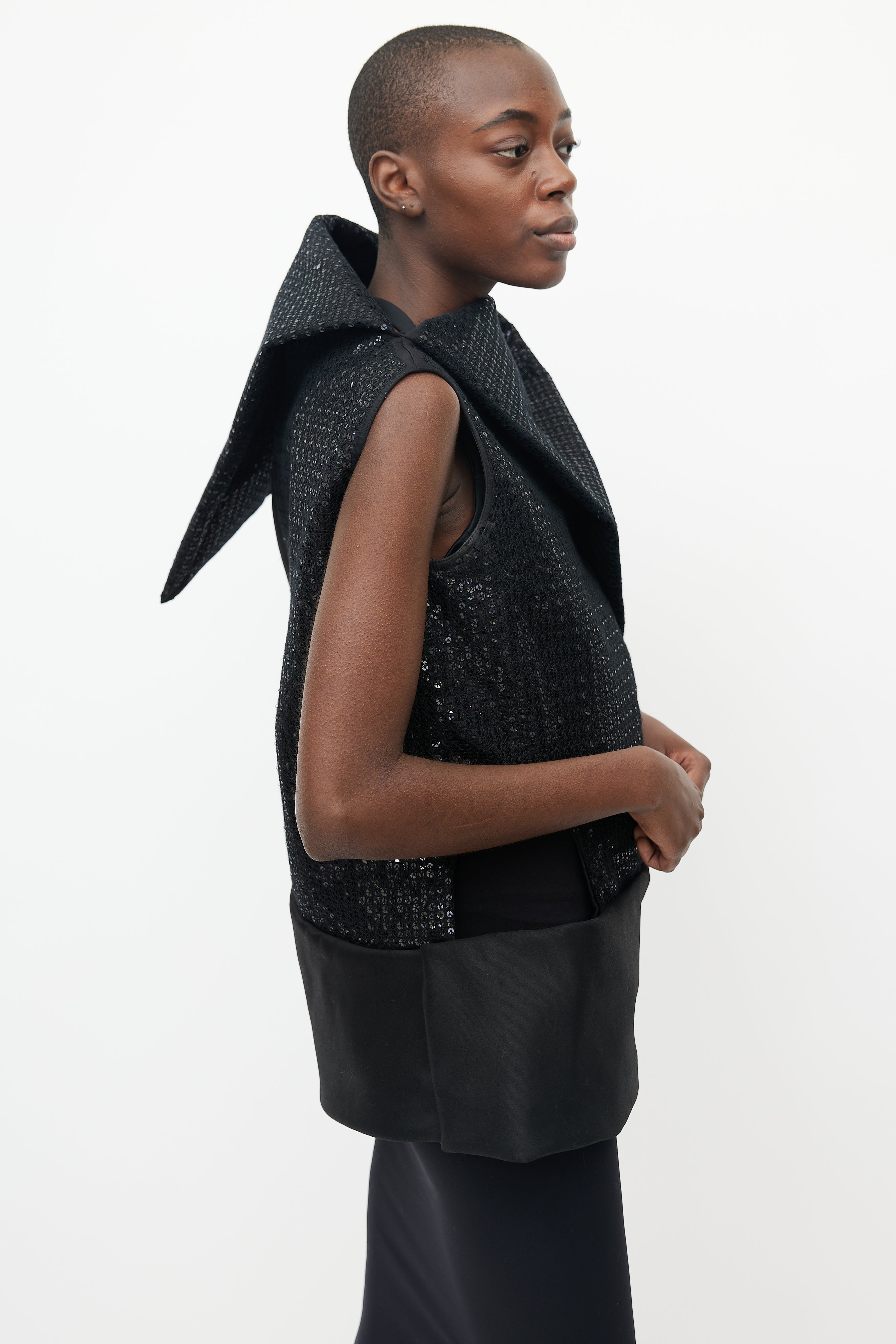 Pre-owned Rick Owens Spring/Summer 2018 black asymmetrical top featuring tonal sequin detailing throughout, bateau neckline, gathered structural flap at shoulder, cut out at waist, and snap button closure at side. Lined. Styled with skirt. Clipped to fit model.
