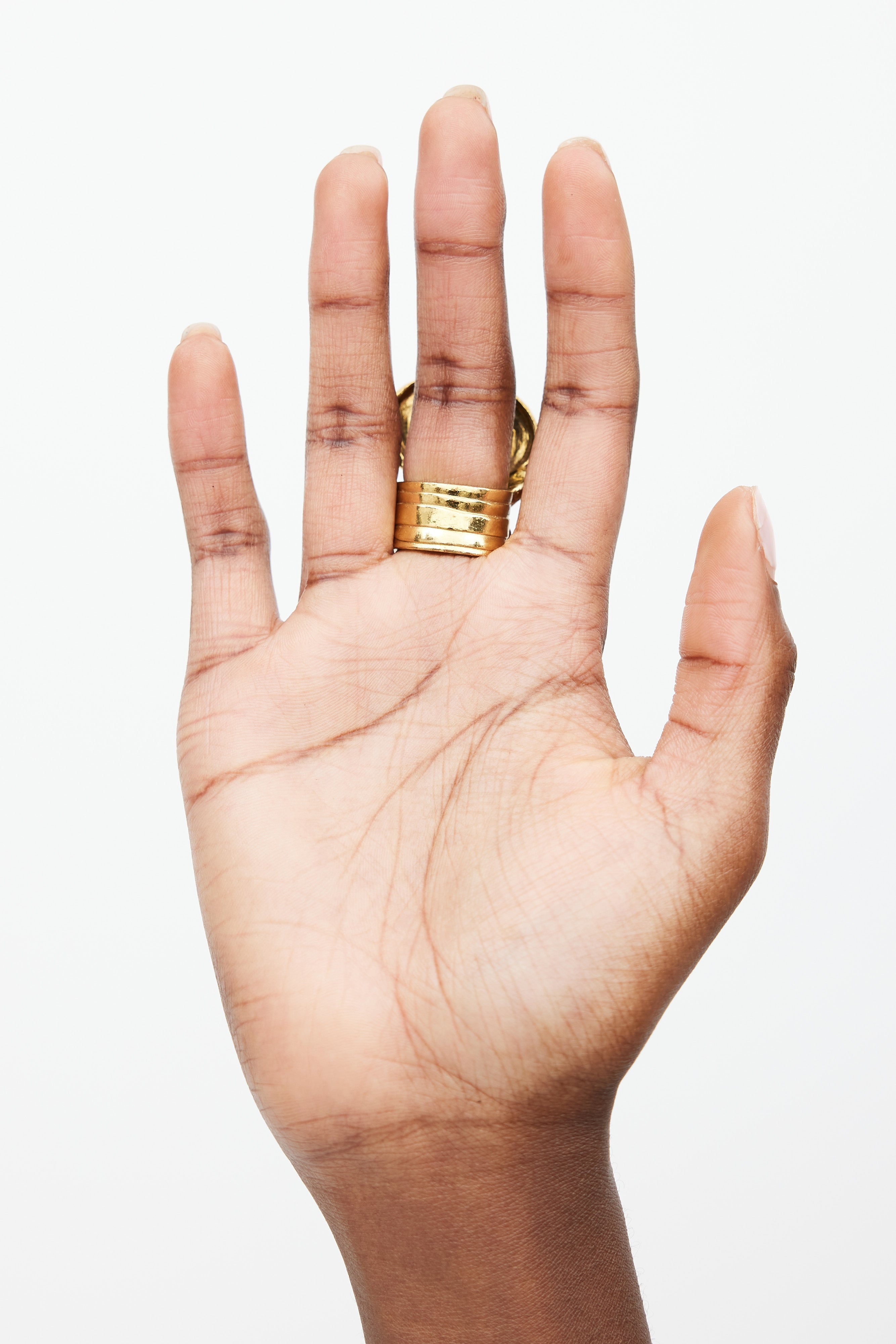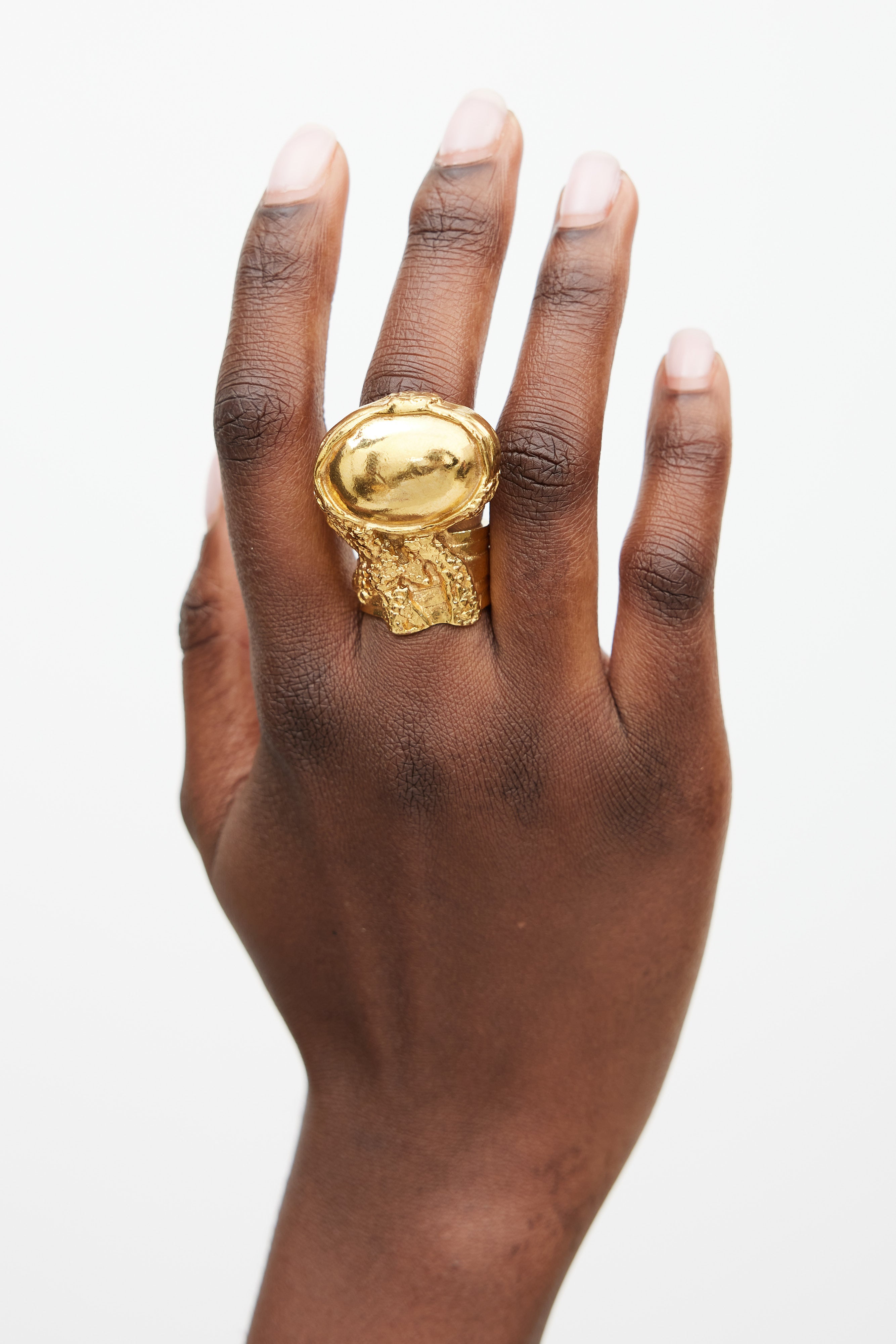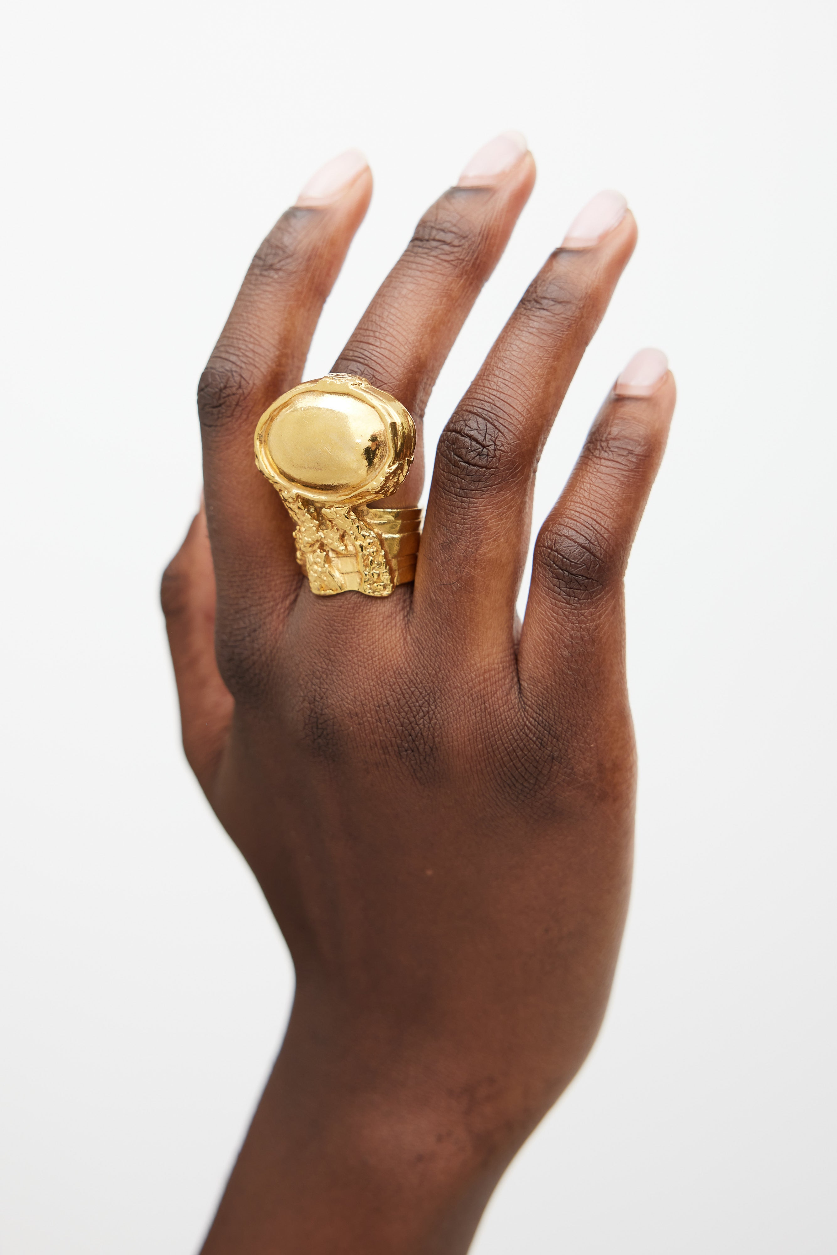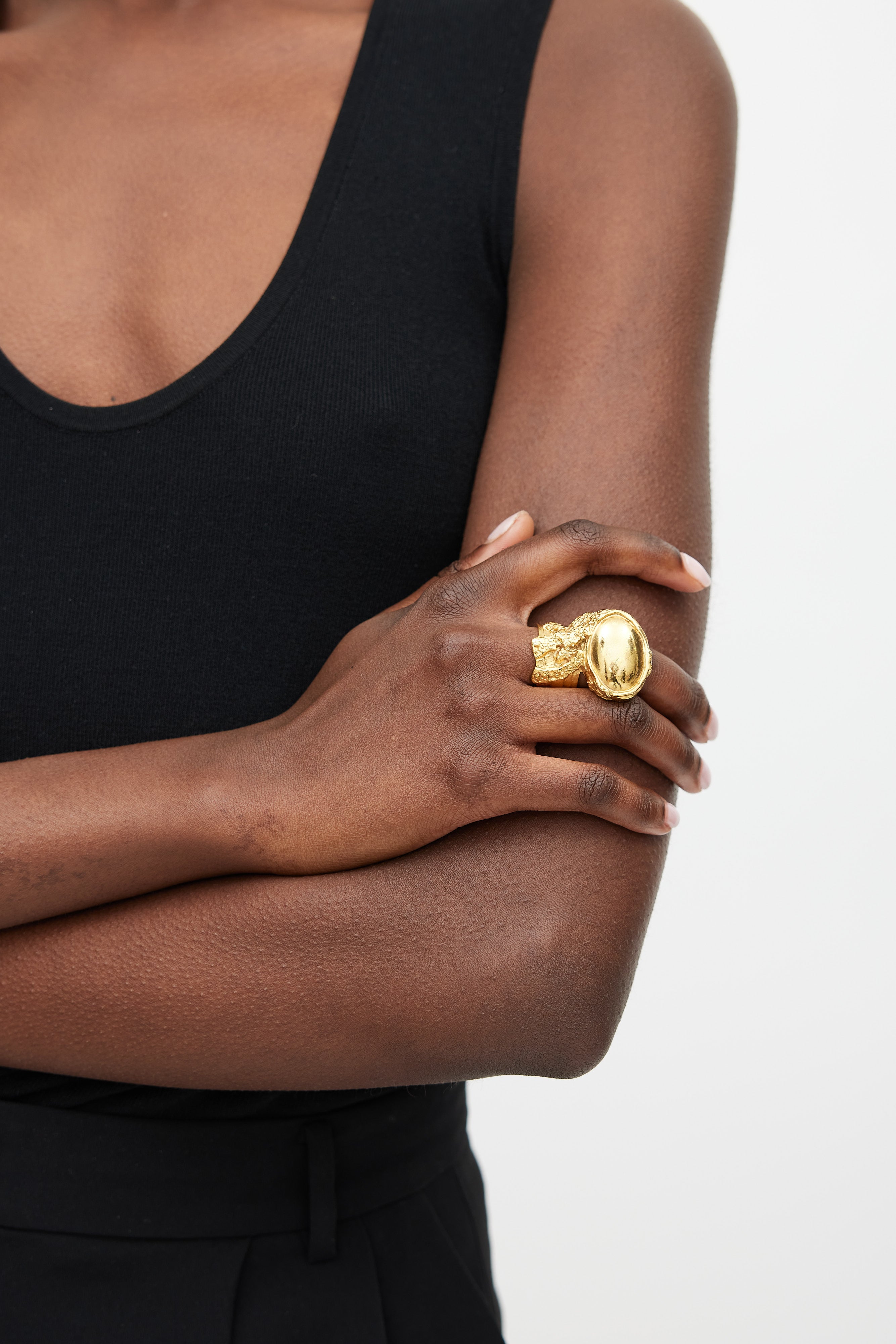 Pre-owned Saint Laurent gold Arty ring featuring an oval tonal detail, engraved logo at interior, and textured band. Comes with box.