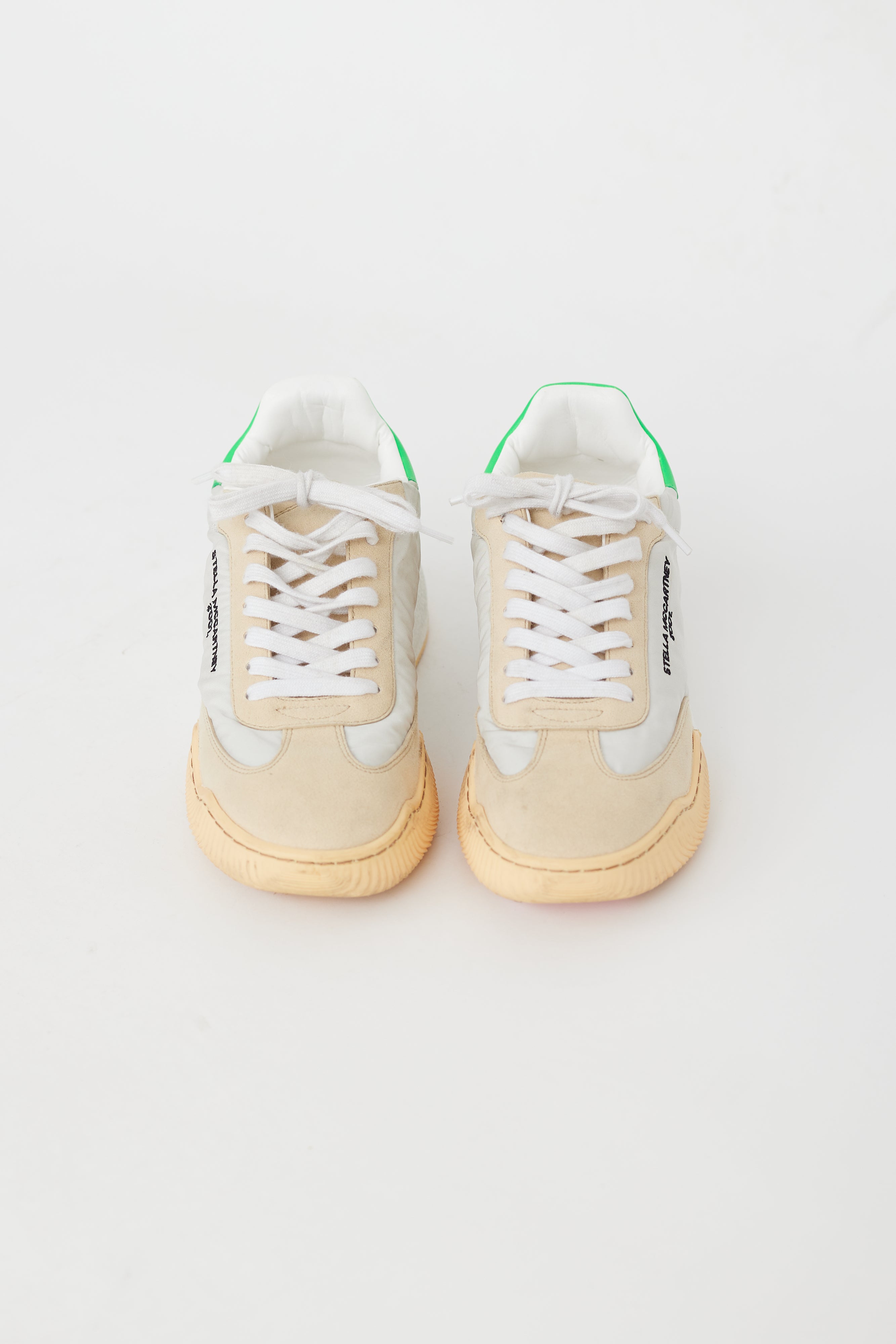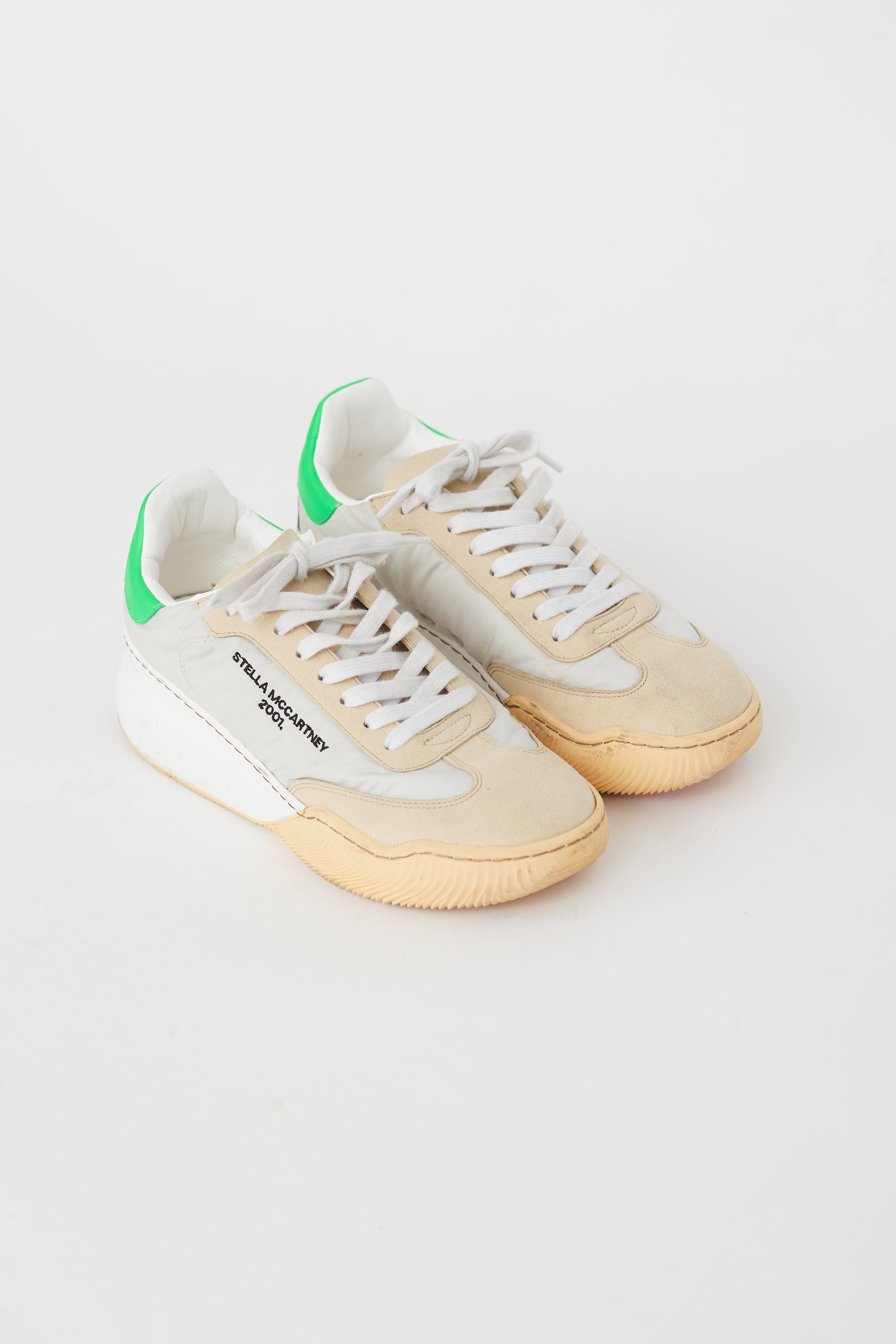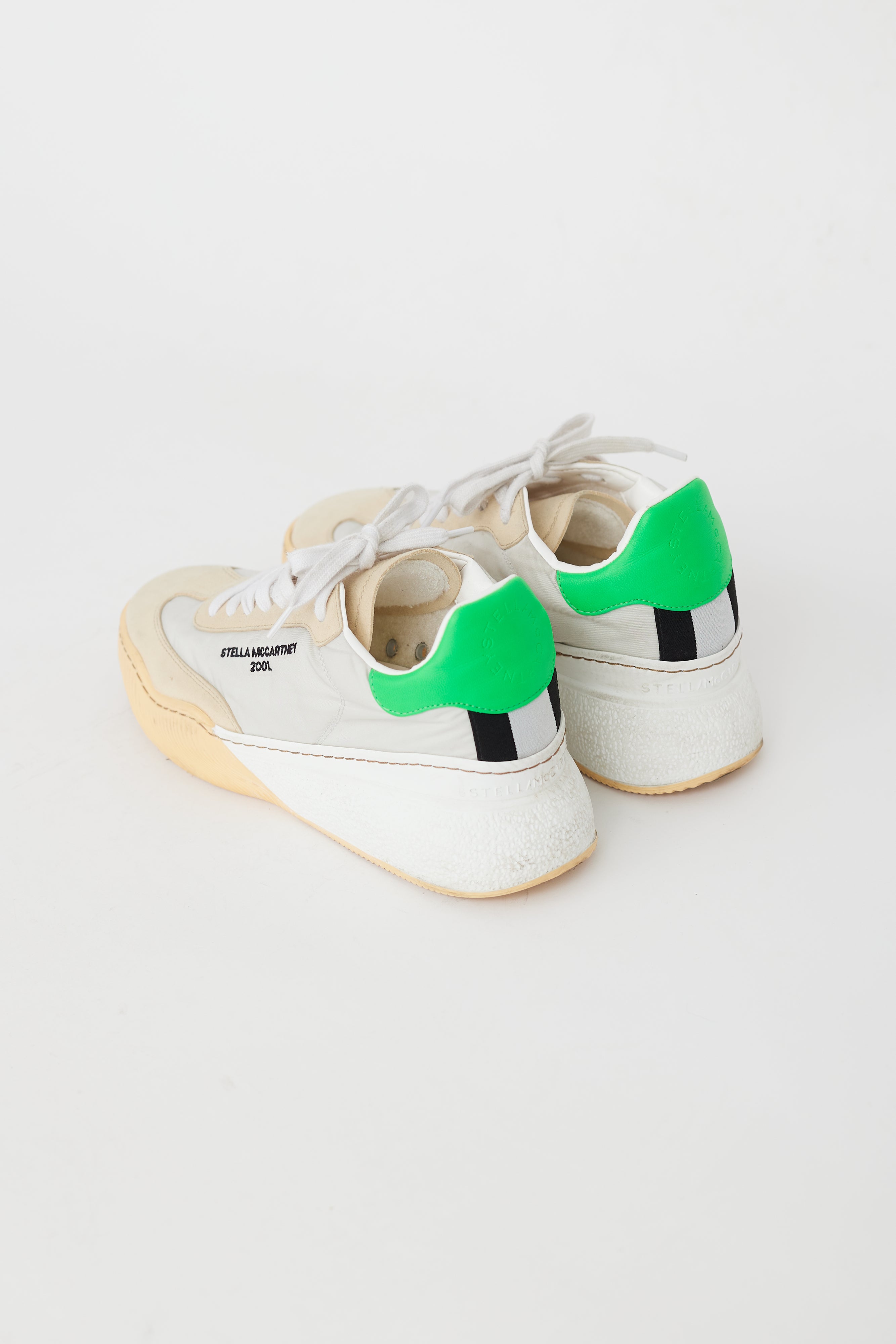 Pre-owned Stella McCartney grey and multicolour Loop sneakers featuring rounded toe, yellow suede trim at toe, lace up front, grey nylon upper, black embroidered logo at side, neon green heel counter, and yellow and white rubber outsole. Comes with original dust bag.