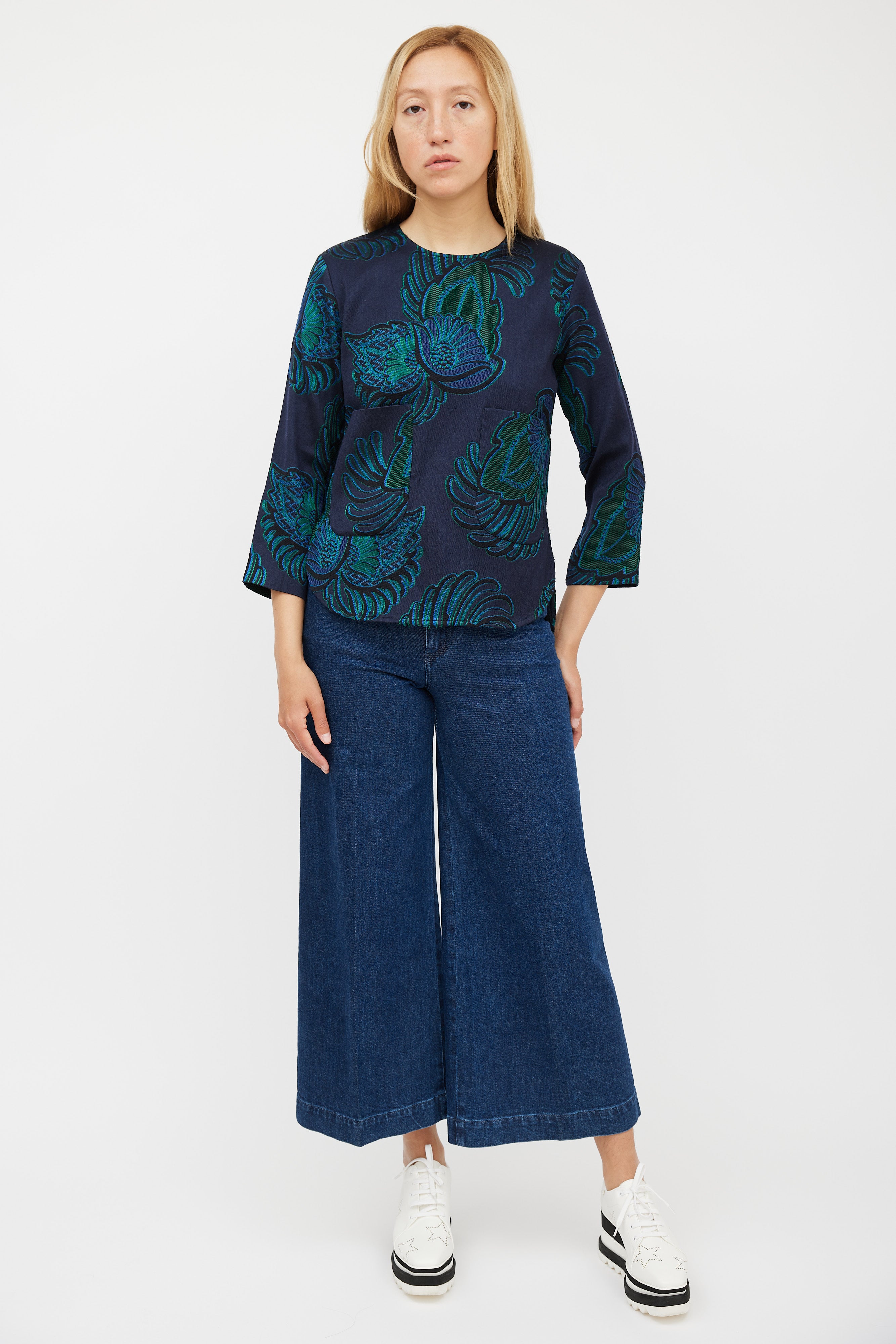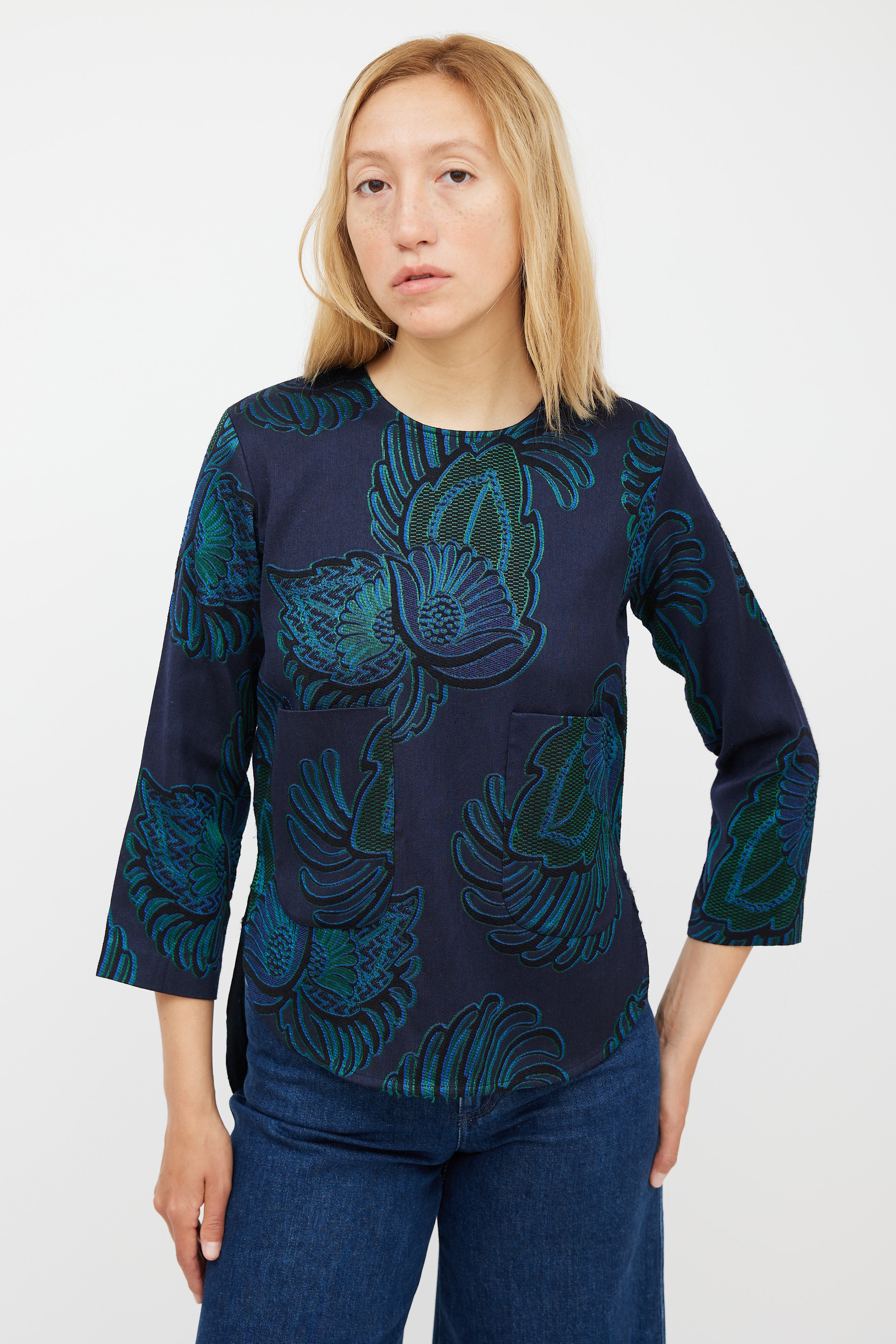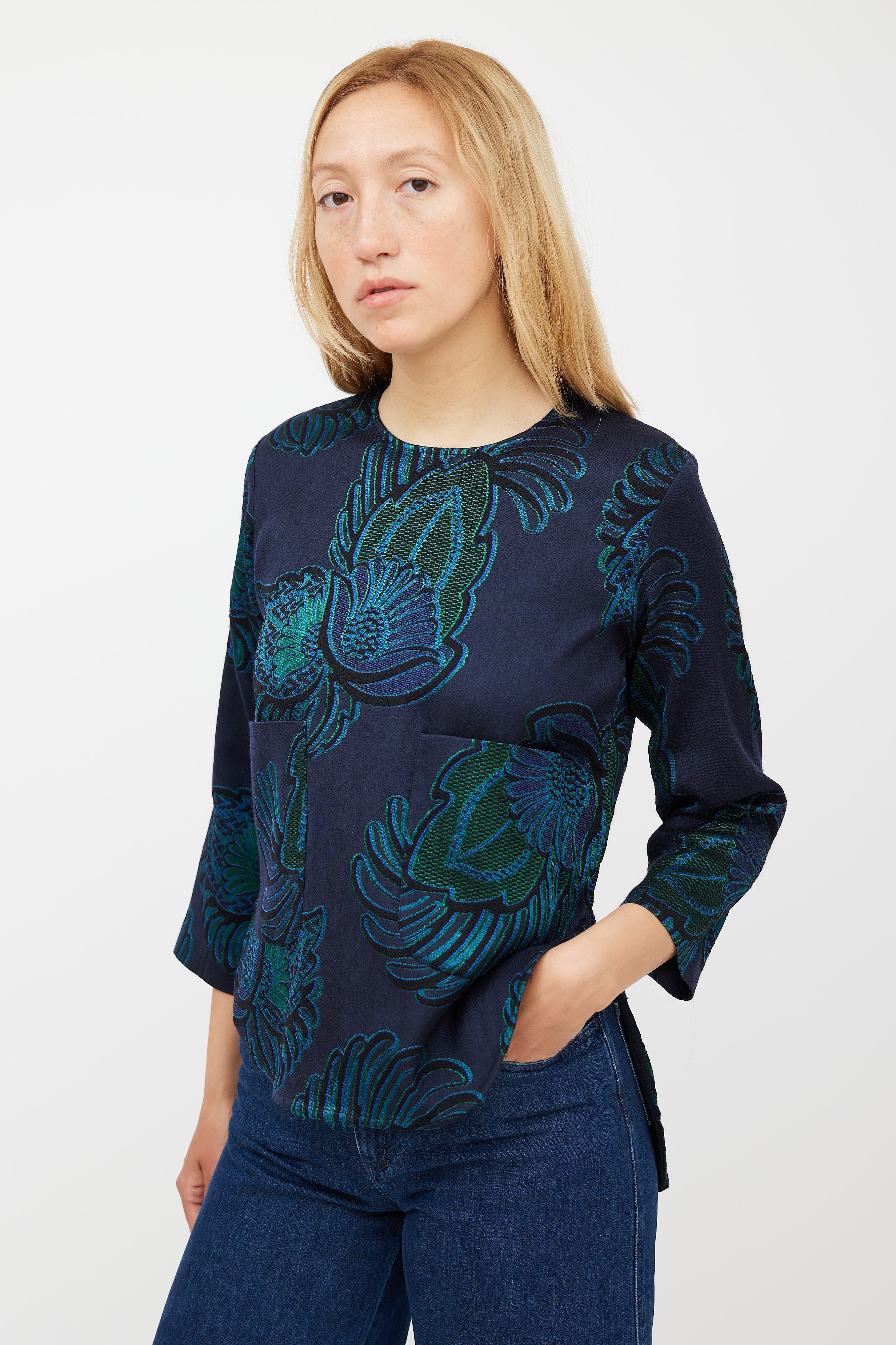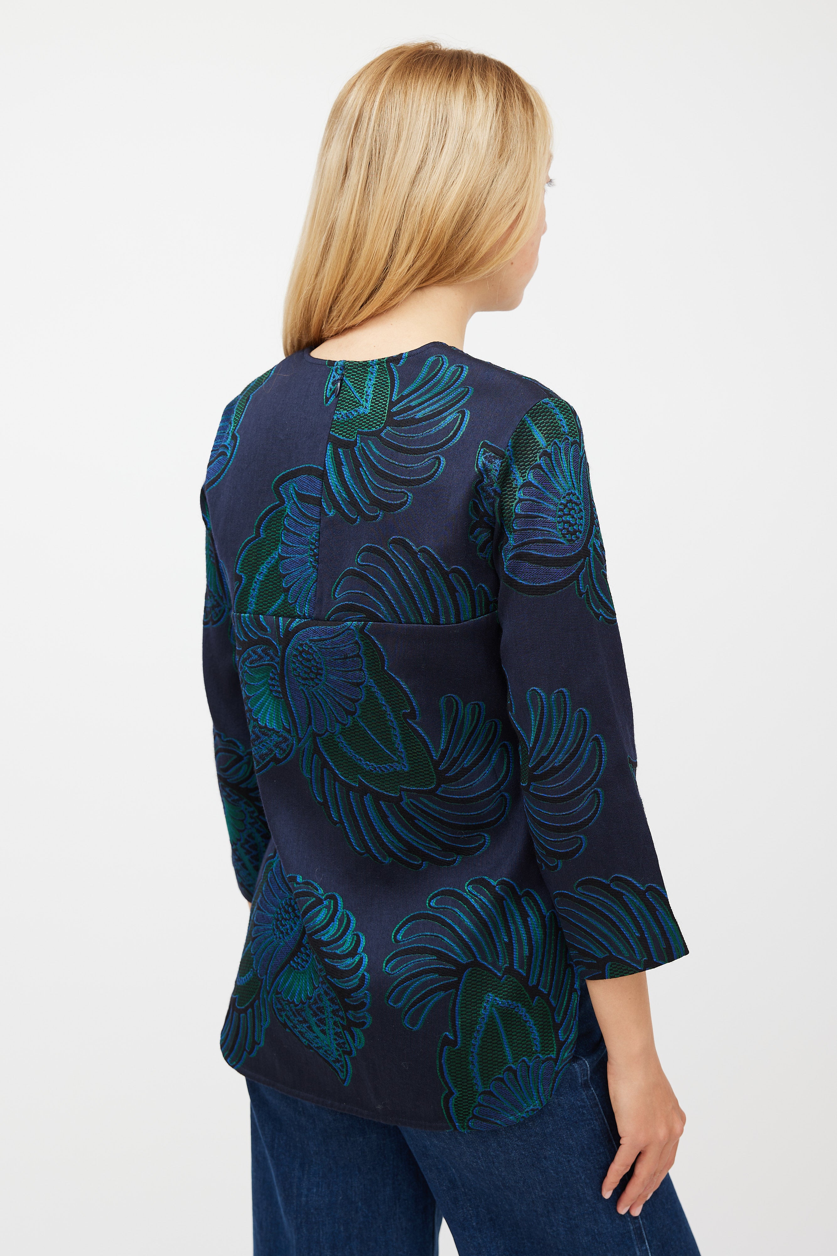 Pre-owned Stella McCartney navy wool top featuring a green paisley jacquard pattern throughout, round neckline, long sleeves, two patch pockets at front, and zip at back with hook and eye closure.