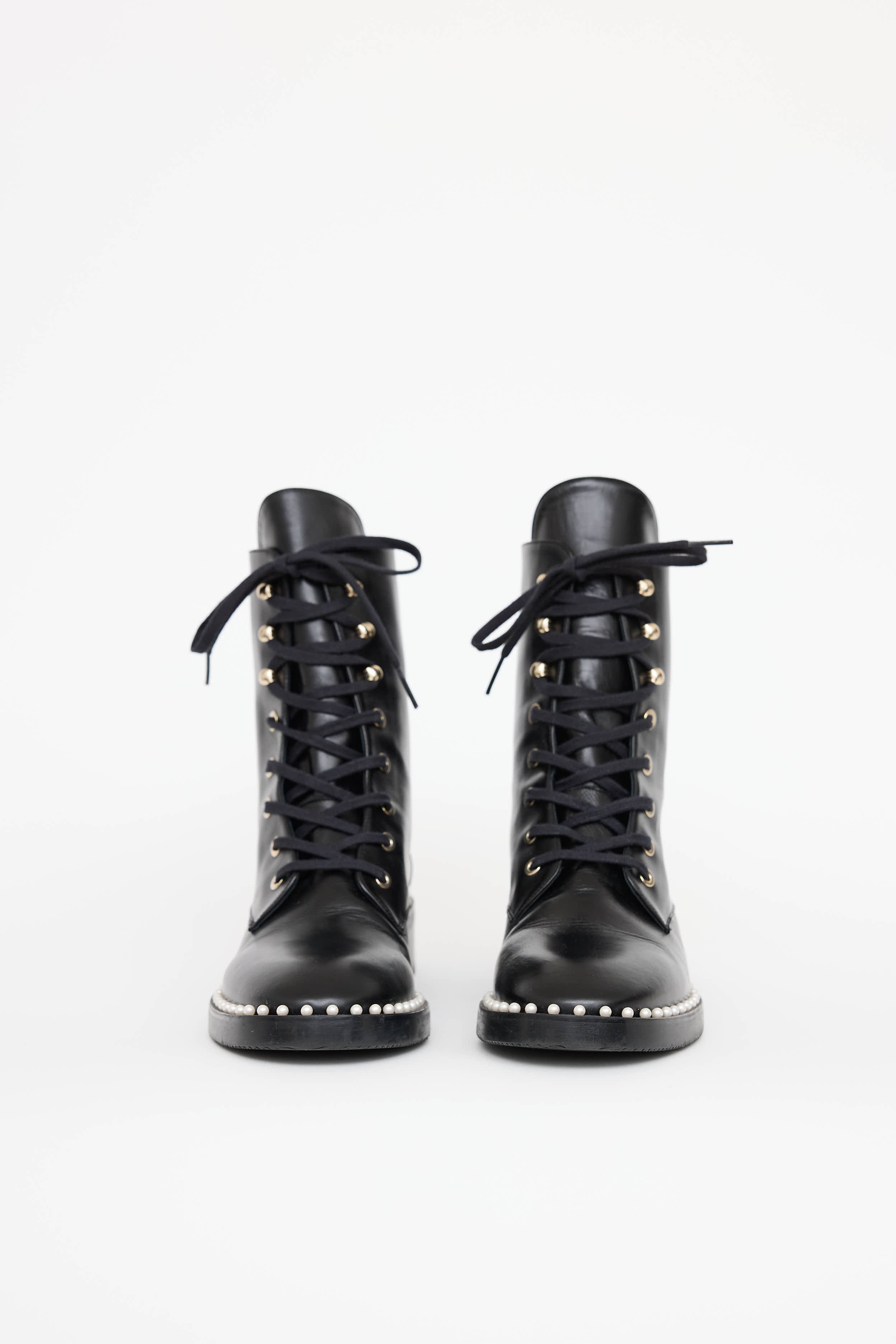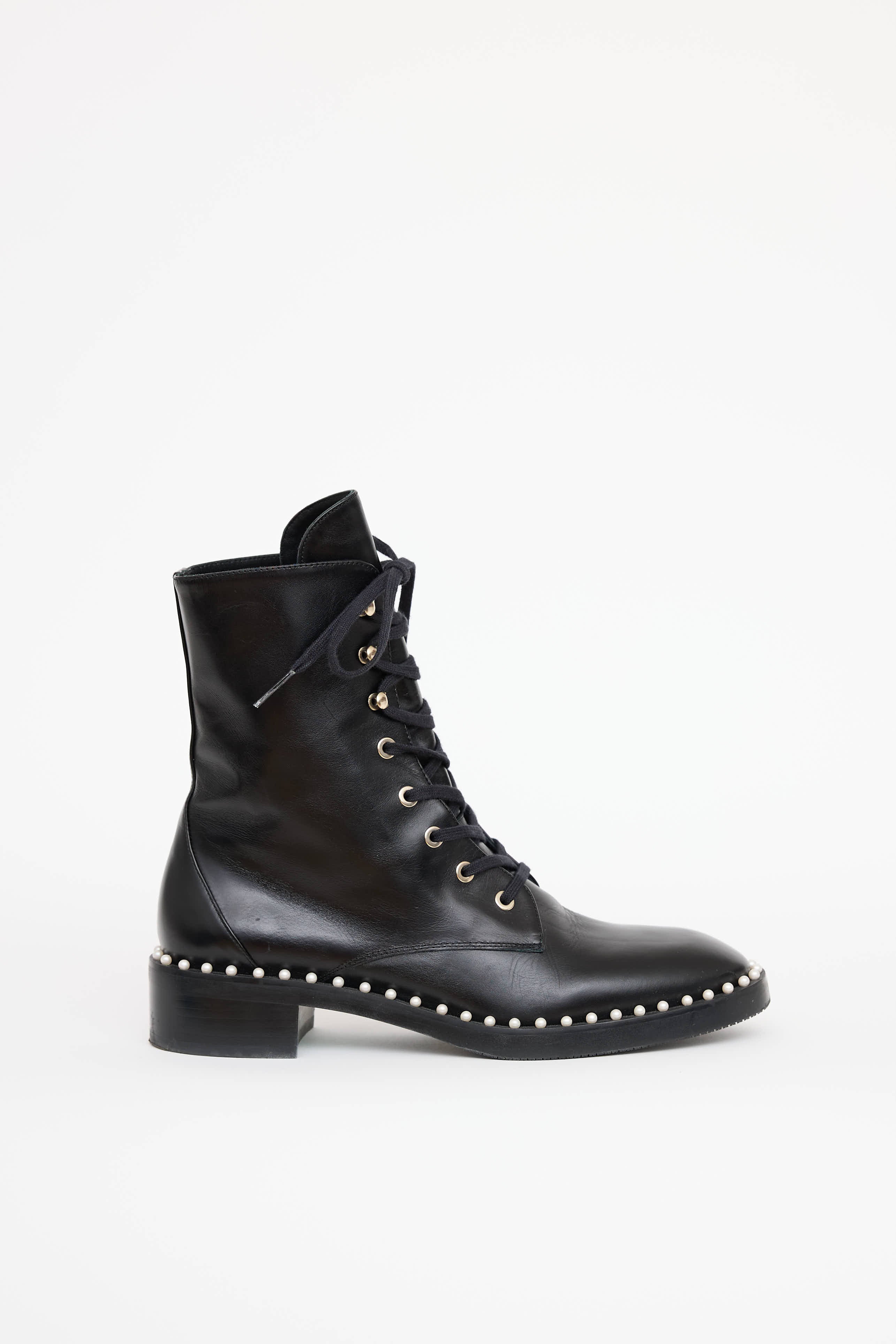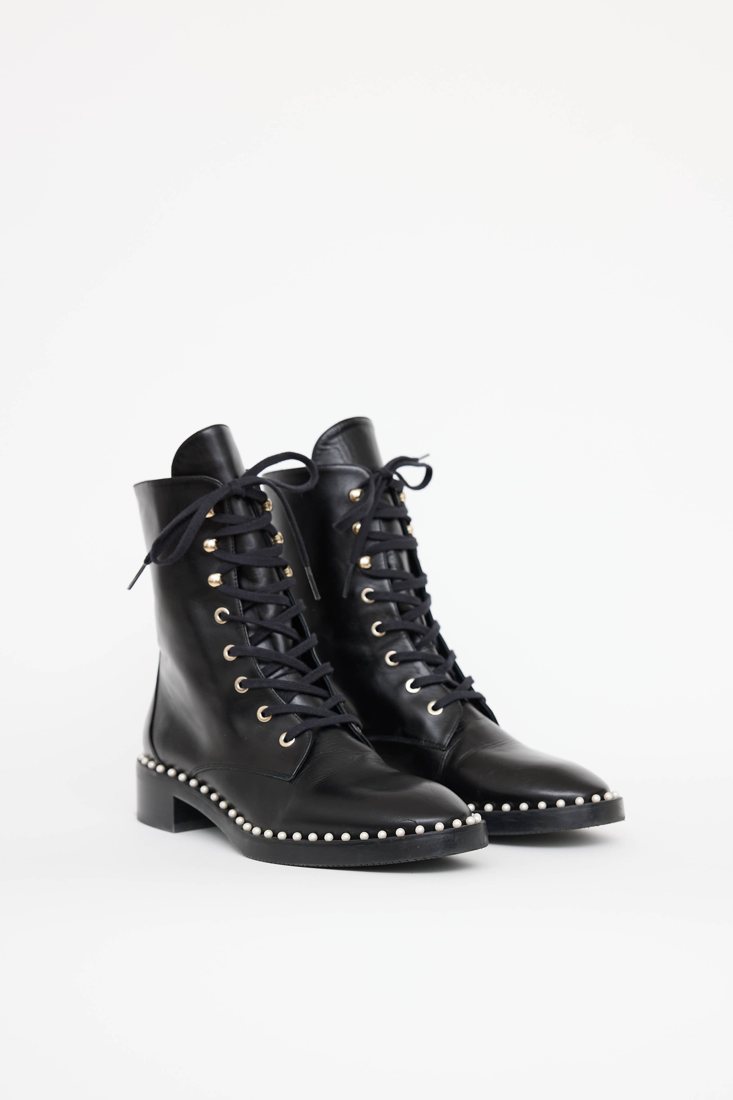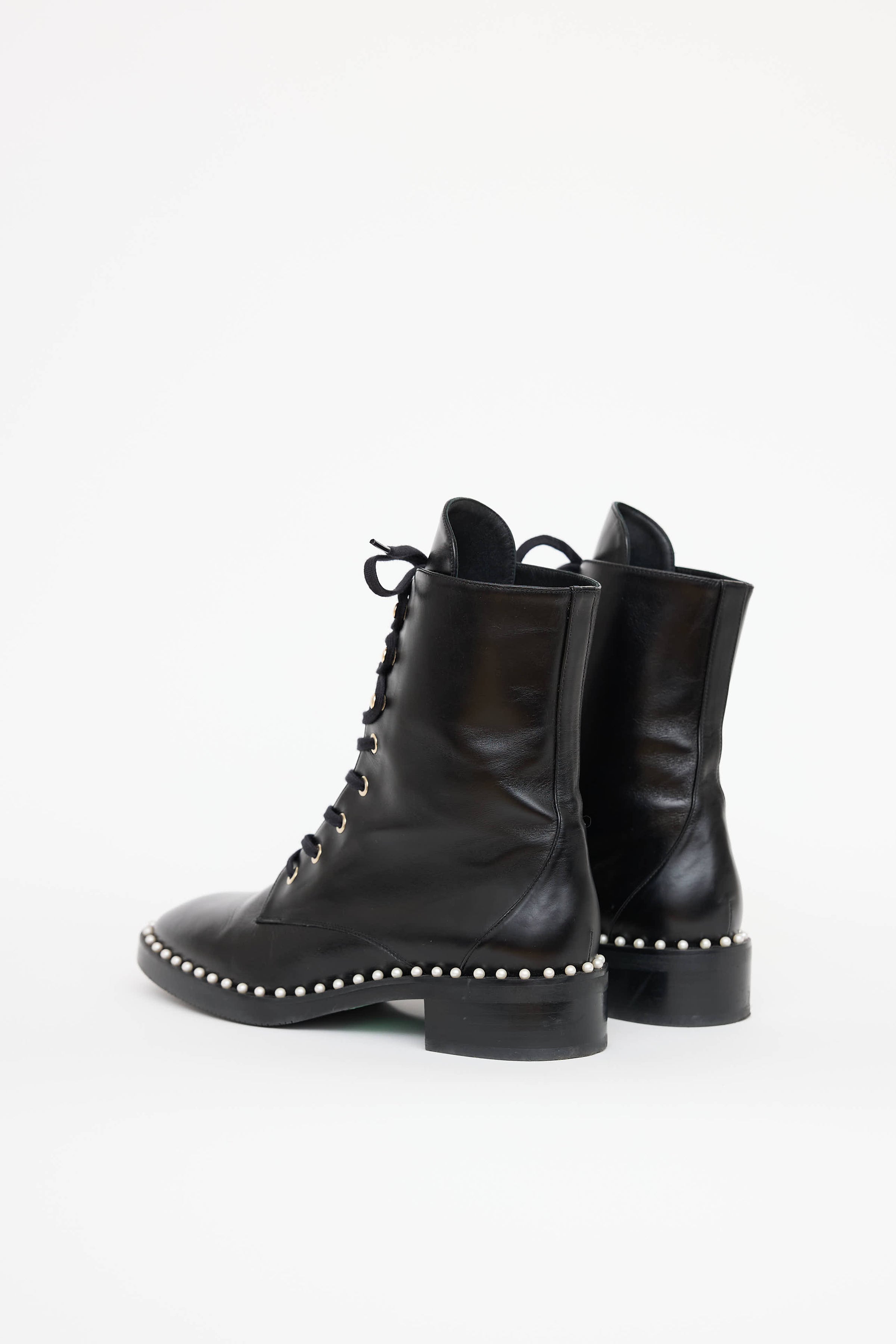 Pre-owned Stuart Weitzman black leather Sondra Pearl boot featuring round toe, lace up vamp, pearl embellishments at midsole, and stacked heel.
